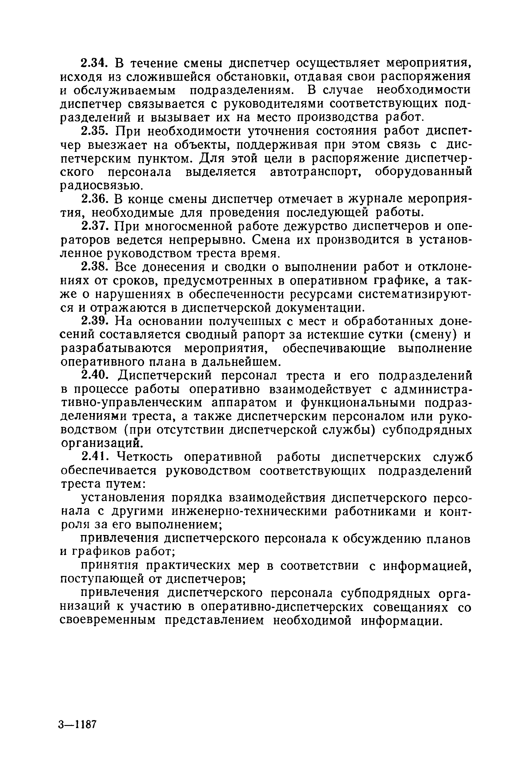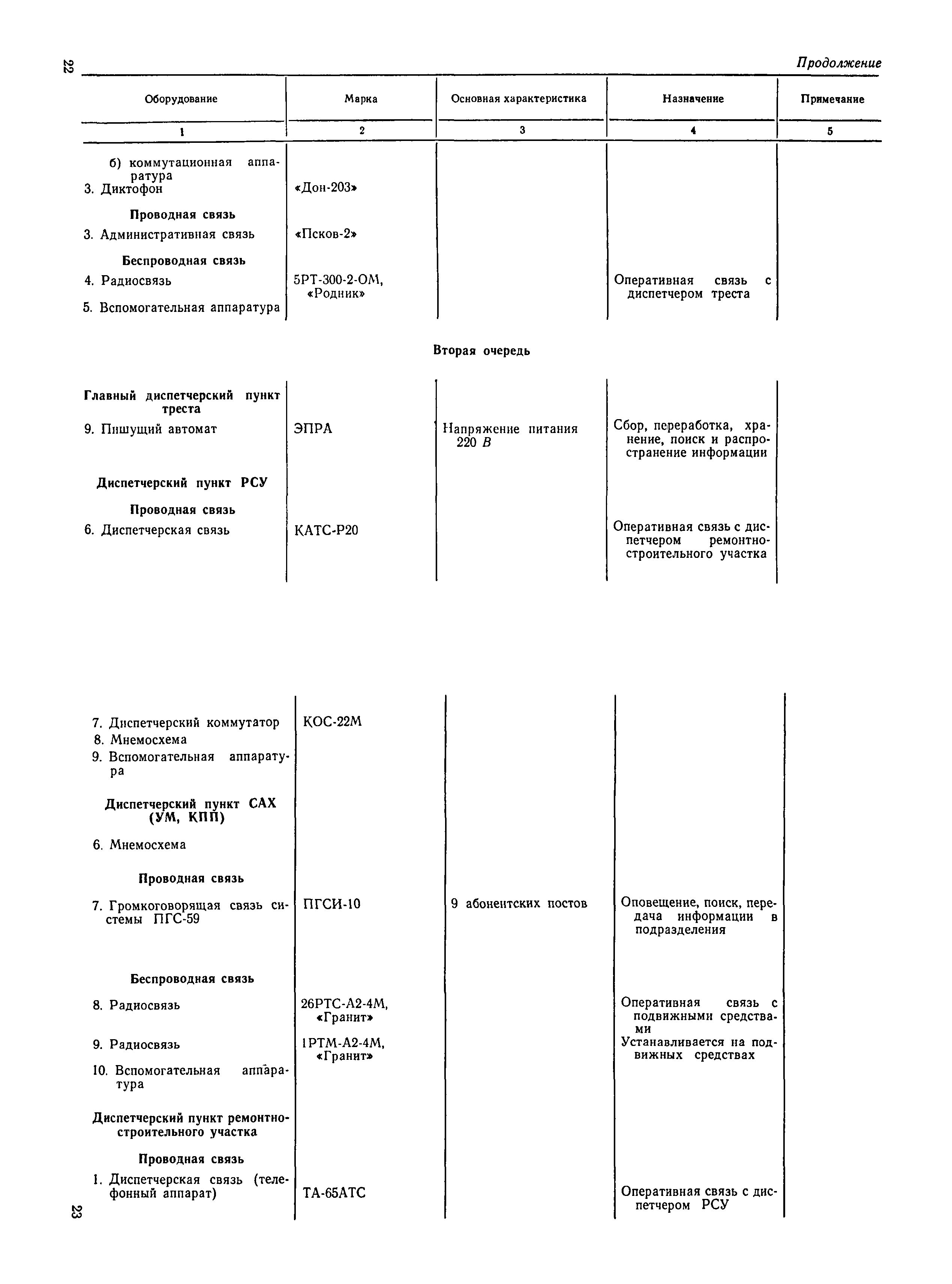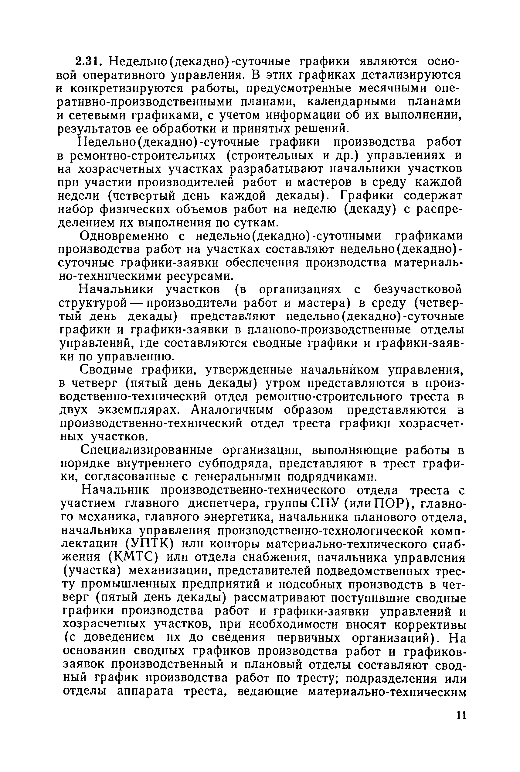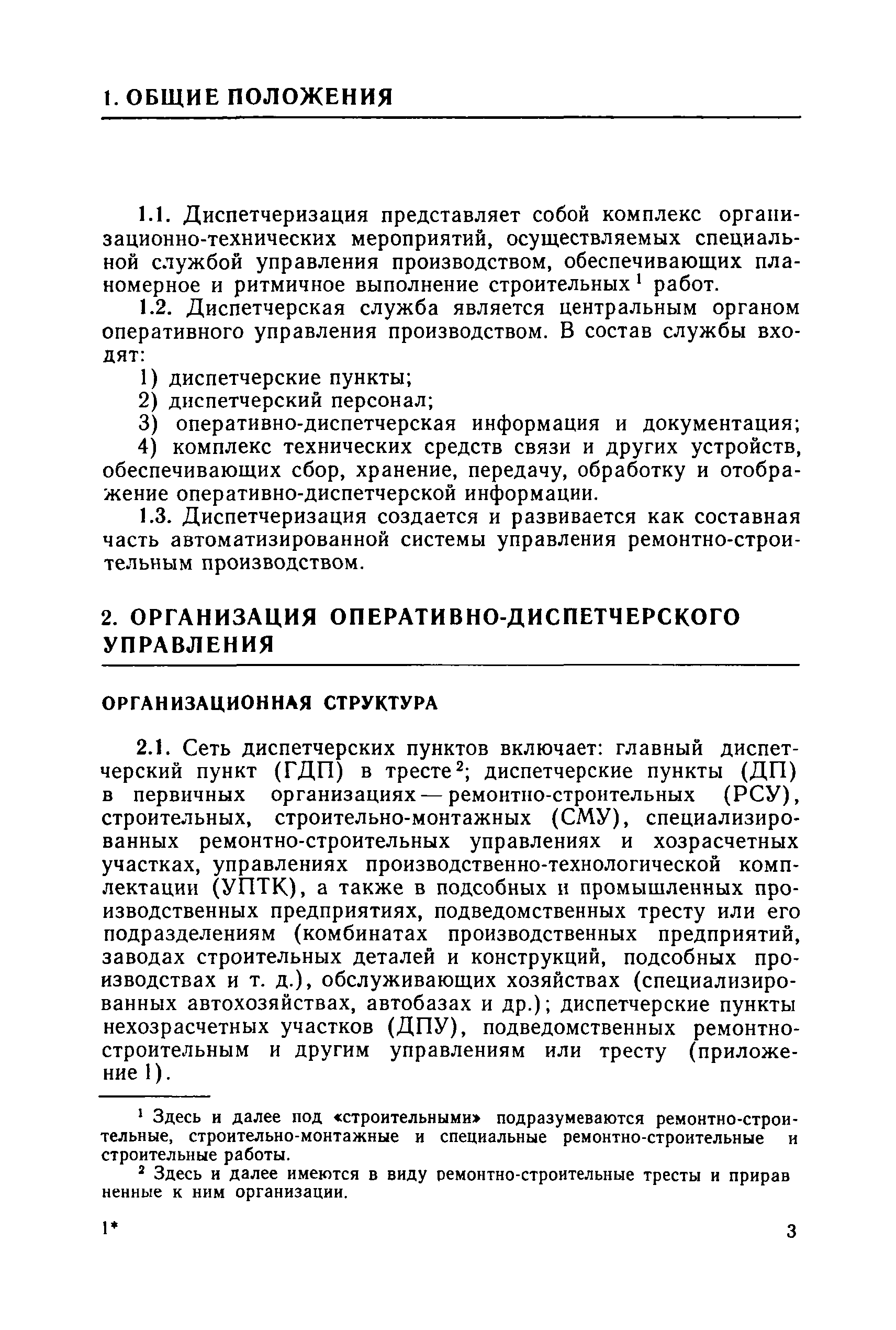 | Оглавление: | 1. Общие положения 2. Организация оперативно-диспетчерского управления Организационная структура Диспетчерская информация и документация Организация работы диспетчерского персонала 3. Организация диспетчерской связи Общие положения Оборудование диспетчерских пунктов Приложение 1. Схема организации оперативно-диспетчерского управления в ремонтно-строительном тресте (примерная) Приложение 2. Состав диспетчерского персонала треста и его подразделений (примерный) Приложение 3. Недельно (декадно) - суточный график производства работ (примерный) Приложение 4. Недельно (декадно) - суточный график автотранспортных грузоперевозок Приложение 5. Недельно (декадно) - суточный график (примерный) работы строительных машин Приложение 6. Недельно (декадно) - суточный график-заявка обеспечения производства материально-техническими ресурсами (примерный) Приложение 7. Выписка из месячного плана-графика технического обслуживания и ремонта строительных машин Приложение 8. Наряд на поставку строительных машин Приложение 9. Наряд-заказ на выполнение работ Приложение 10. Ведомость наличия и технического состояния автотранспорта Приложение 11. Товарно-транспортная накладная Приложение 12. Сведения о выходе автомашин на линию и выполнении заявок автотранспортом Приложение 13. Журнал диспетчера треста Приложение 14. Журнал состояния диспетчерской связи Приложение 15. Рекомендации по выбору каналов связи и вспомогательного оборудования Приложение 16. Организация работы с автоматом ЭПРА Приложение 17. Общие требования к помещениям диспетчерских пунктов Приложение 18. План размещения оборудования передвижного диспетчерского пункта (примерный) |