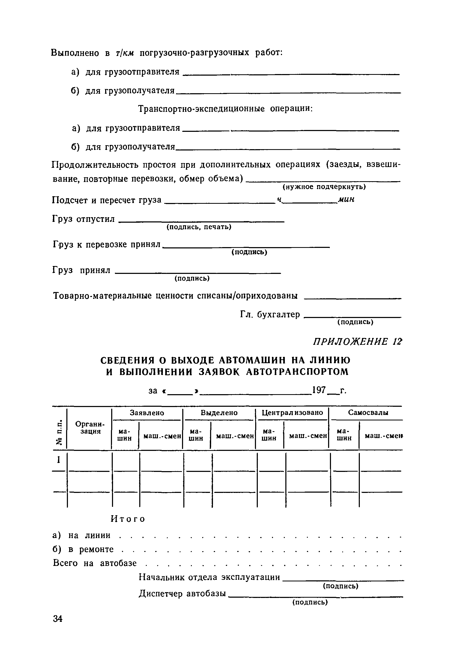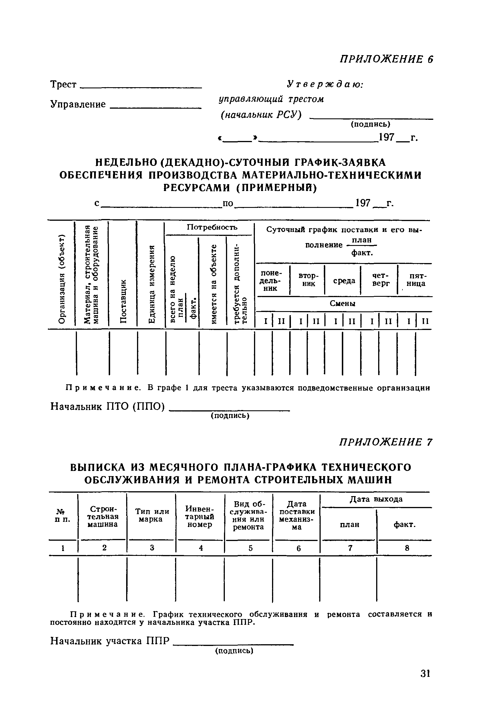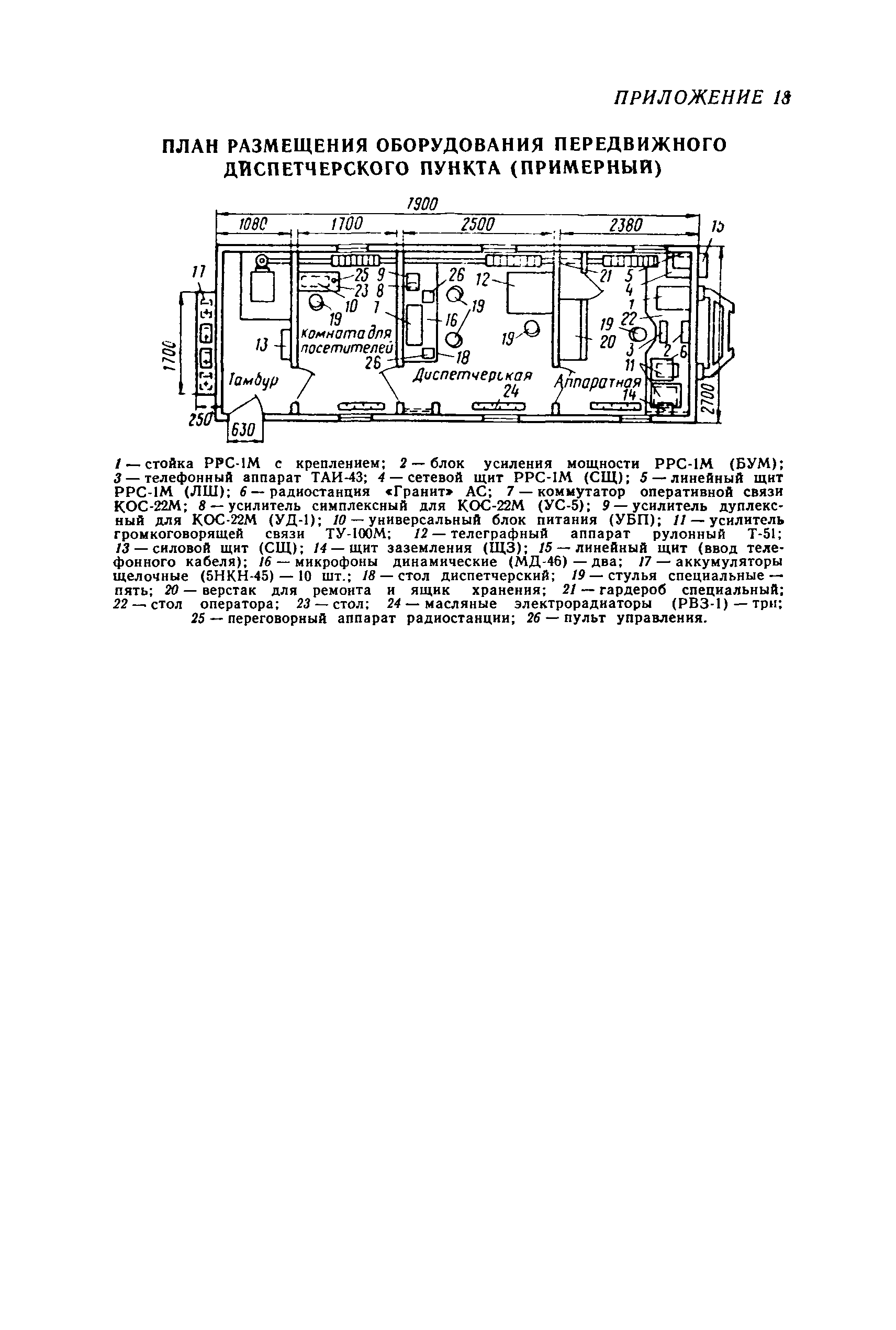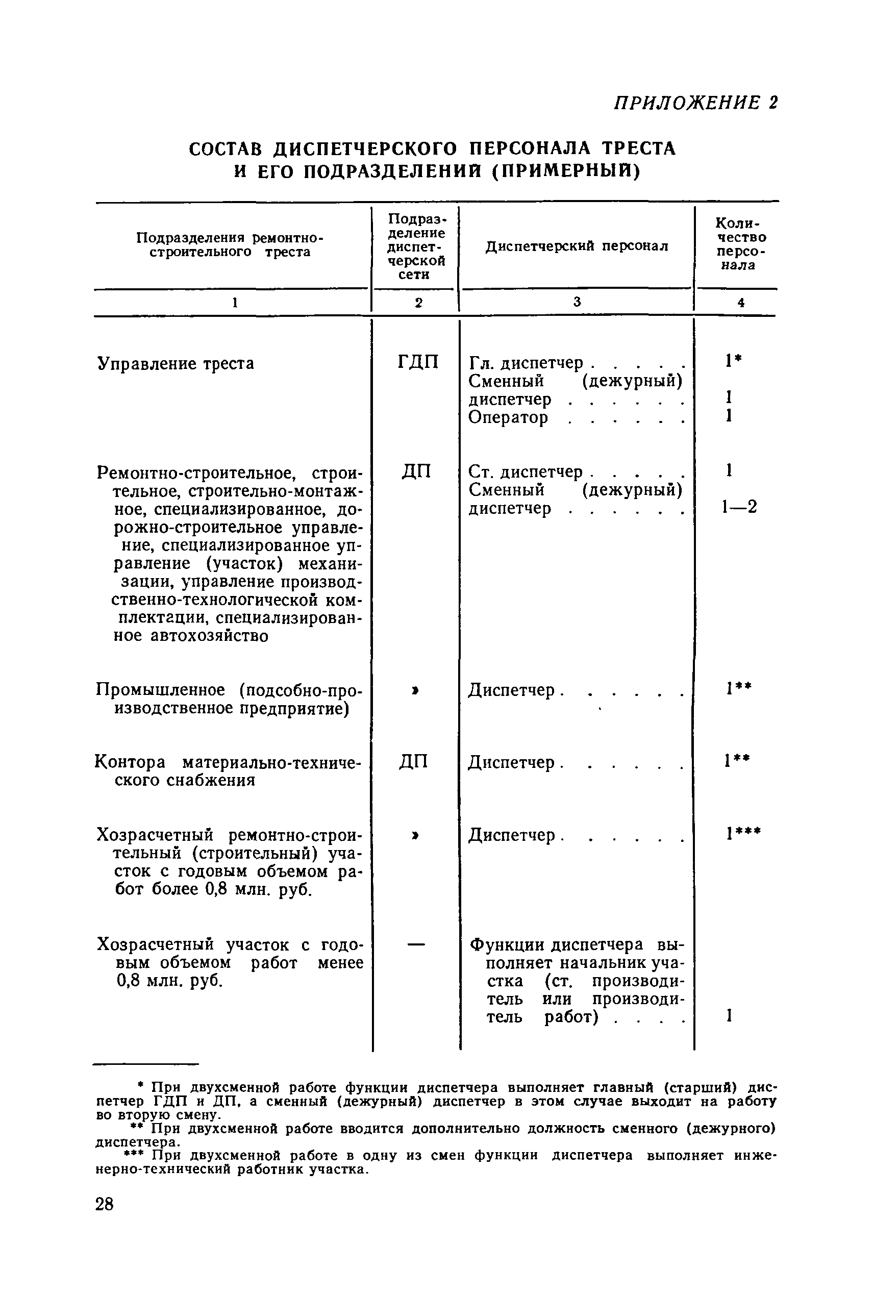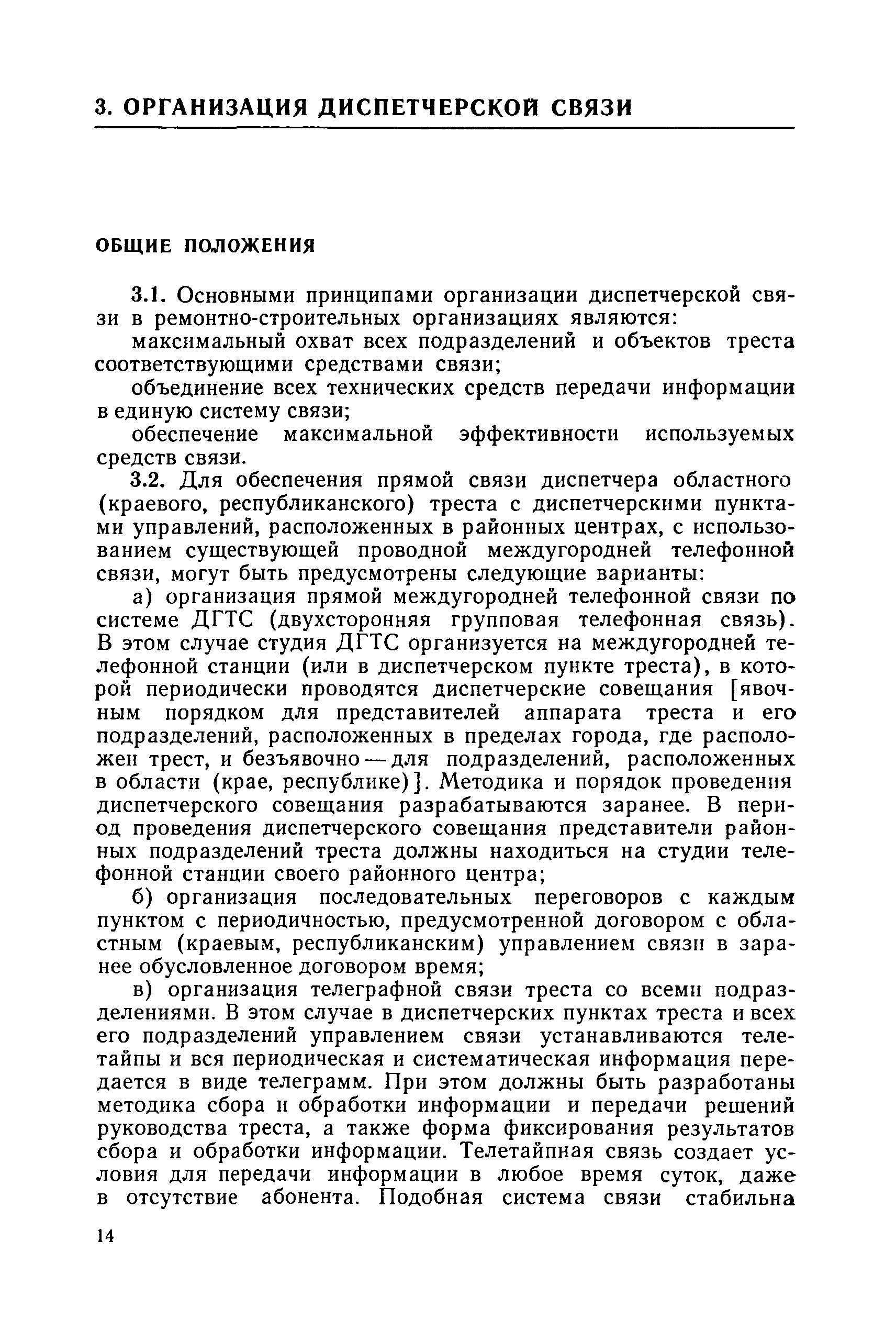 | Оглавление: | 1. Общие положения 2. Организация оперативно-диспетчерского управления Организационная структура Диспетчерская информация и документация Организация работы диспетчерского персонала 3. Организация диспетчерской связи Общие положения Оборудование диспетчерских пунктов Приложение 1. Схема организации оперативно-диспетчерского управления в ремонтно-строительном тресте (примерная) Приложение 2. Состав диспетчерского персонала треста и его подразделений (примерный) Приложение 3. Недельно (декадно) - суточный график производства работ (примерный) Приложение 4. Недельно (декадно) - суточный график автотранспортных грузоперевозок Приложение 5. Недельно (декадно) - суточный график (примерный) работы строительных машин Приложение 6. Недельно (декадно) - суточный график-заявка обеспечения производства материально-техническими ресурсами (примерный) Приложение 7. Выписка из месячного плана-графика технического обслуживания и ремонта строительных машин Приложение 8. Наряд на поставку строительных машин Приложение 9. Наряд-заказ на выполнение работ Приложение 10. Ведомость наличия и технического состояния автотранспорта Приложение 11. Товарно-транспортная накладная Приложение 12. Сведения о выходе автомашин на линию и выполнении заявок автотранспортом Приложение 13. Журнал диспетчера треста Приложение 14. Журнал состояния диспетчерской связи Приложение 15. Рекомендации по выбору каналов связи и вспомогательного оборудования Приложение 16. Организация работы с автоматом ЭПРА Приложение 17. Общие требования к помещениям диспетчерских пунктов Приложение 18. План размещения оборудования передвижного диспетчерского пункта (примерный) |