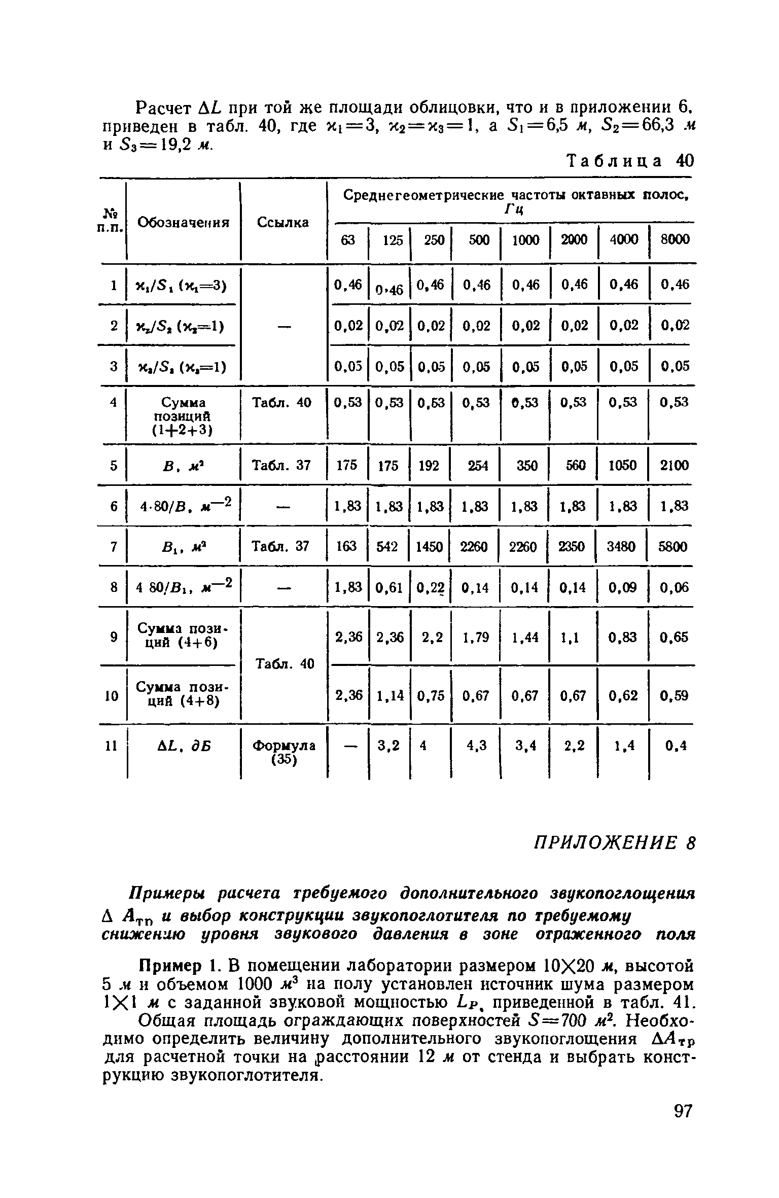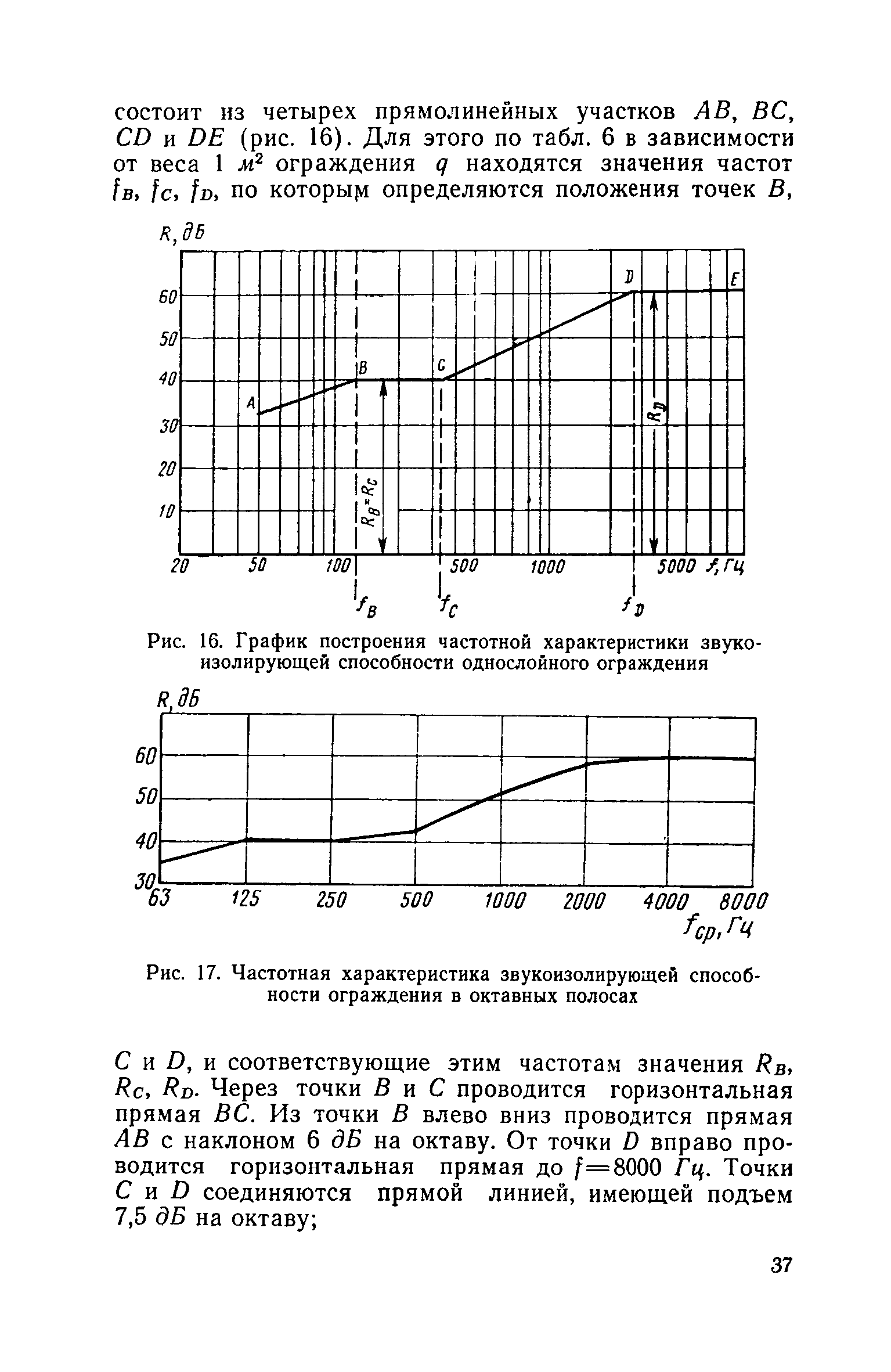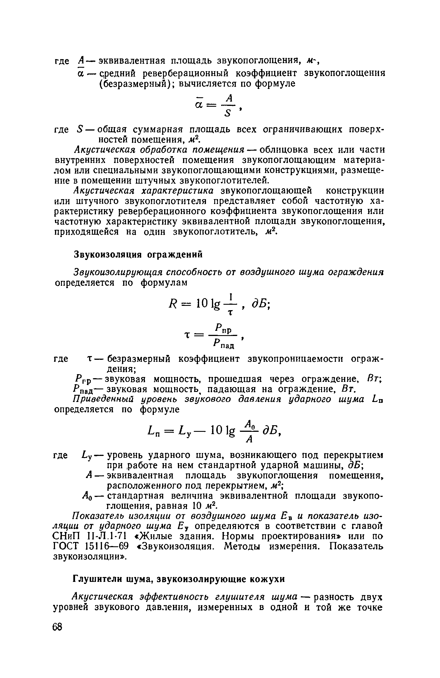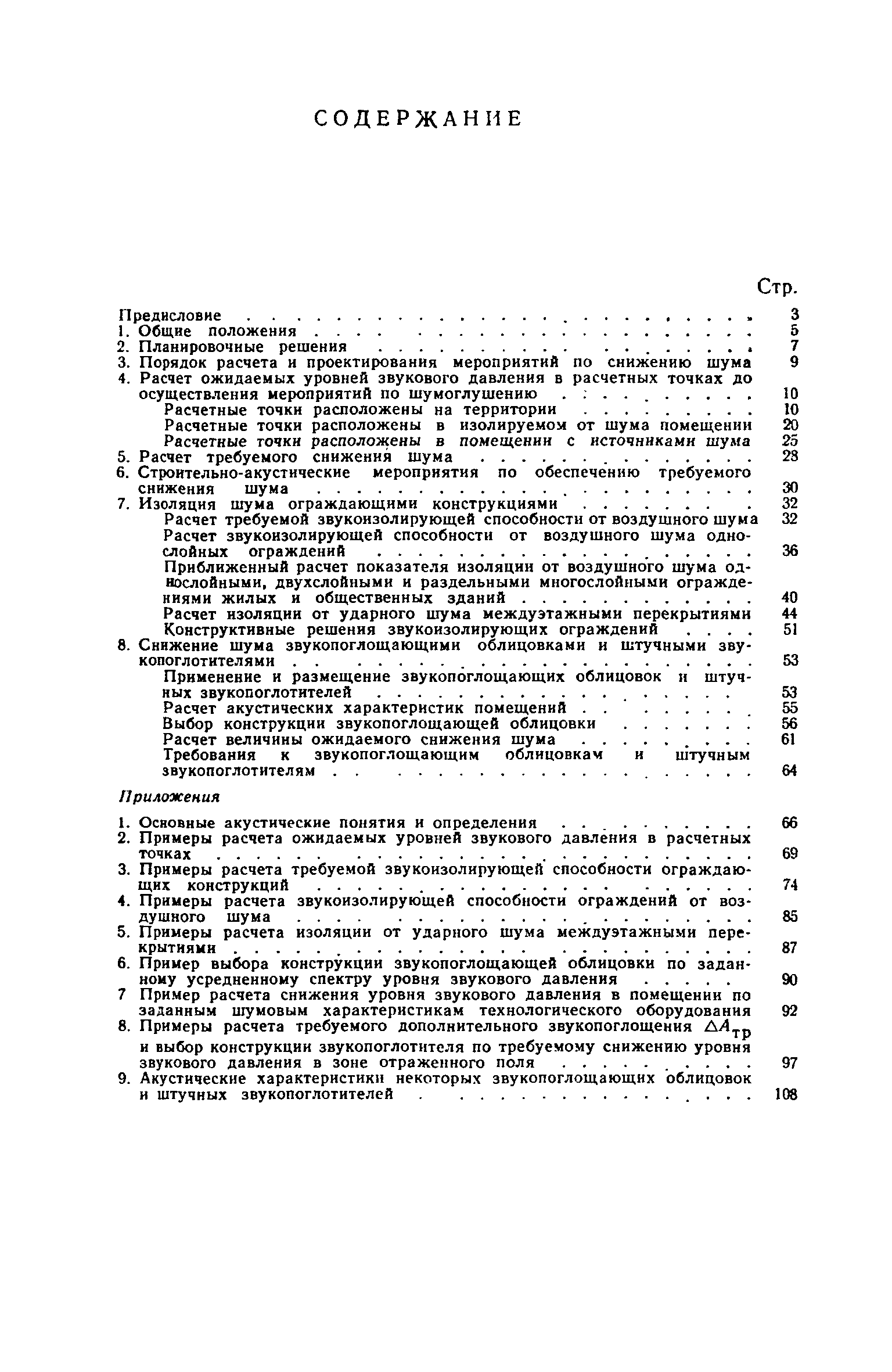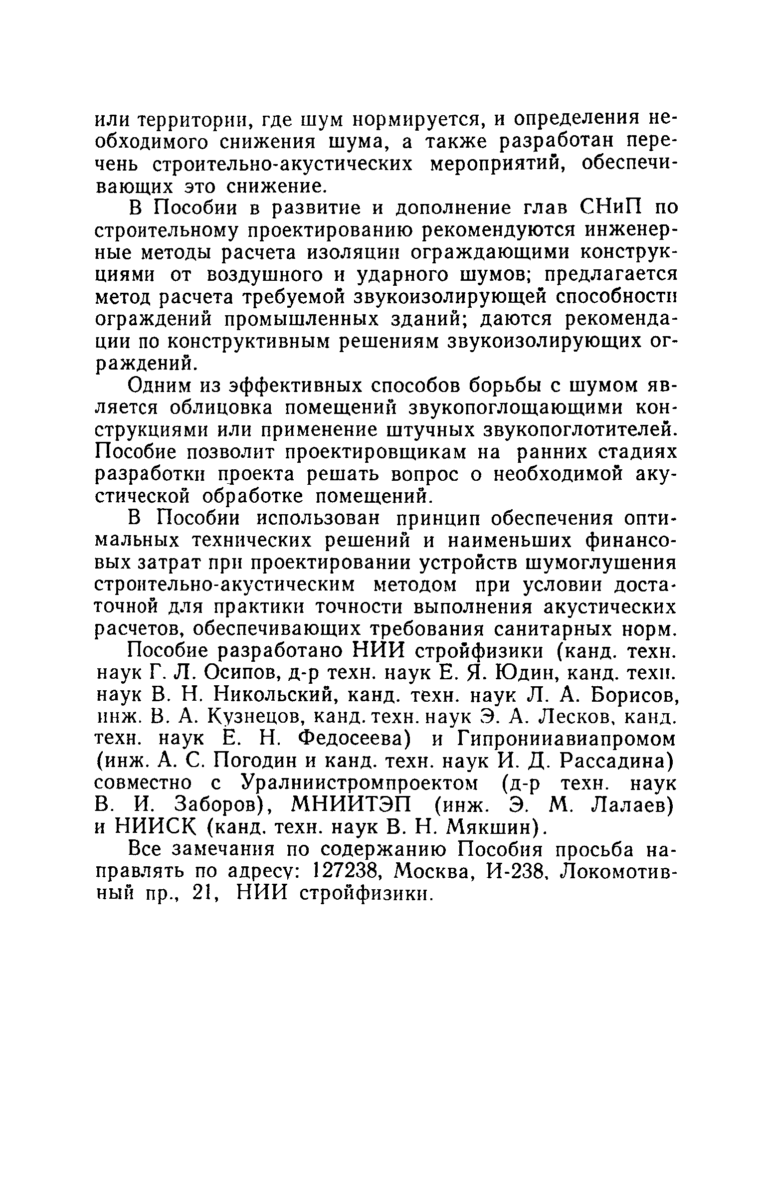 | Оглавление: | Предисловие 1. Общие положения 2. Планировочные решения 3. Порядок расчета и проектирования мероприятий по снижению шума 4. Расчет ожидаемых уровней звукового давления в расчетных точках до осуществления мероприятий по шумоглушению Расчетные точки расположены на территории Расчетные точки расположены в изолируемом от шума помещения Расчетные точки расположены в помещении с источниками шума 5. Расчет требуемого снижения шума 6. Строительно-акустические мероприятия по обеспечению требуемого снижения шума 7. Изоляция шума ограждающими конструкциями Расчет требуемой звукоизолирующей способности от воздушного шума Расчет звукоизолирующей способности от воздушного шума однослойных ограждений Приближенный расчет показателя изоляции от воздушного шума однослойными. двухслойными и раздельными многослойными ограждениями жилых и общественных зданий Расчет изоляции от ударного шума междуэтажными перекрытиями Конструктивные решения звукоизолирующих ограждений 8. Снижение шума звукопоглощающими облицовками и штучными звукопоглотителями Применение и размещение звукопоглощающих облицовок и штучных звукопоглотителей Расчет акустических характеристик помещений Выбор конструкции звукопоглощающей облицовки Расчет величины ожидаемого снижения шума Требования к звукопоглощающим облицовкам и штучным звукопоглотителям Приложение 1. Основные акустические понятия и определения Приложение 2. Примеры расчета ожидаемых уровней звукового давления в расчетных точках Приложение 3. Примеры расчета требуемой звукоизолирующей способности ограждающих конструкций Приложение 4. Примеры расчета звукоизолирующей способности ограждений от воздушного шума Приложение 5. Примеры расчета изоляции от ударного шума междуэтажными перекрытиями Приложение 6. Пример выбора конструкции звукопоглощающей облицовки по заданному усредненному спектру уровня звукового давления Приложение 7. Пример расчета снижения уровня звукового давления в помещении по заданным шумовым характеристикам технологического оборудования Приложение 8. Примеры расчета требуемого дополнительного звукопоглощения и выбор конструкции звукопоглотителя по требуемому снижению уровня звукового давления в зоне отраженного поля Приложение 9. Акустические характеристики некоторых звукопоглощающих облицовок и штучных звукопоглотителей |
