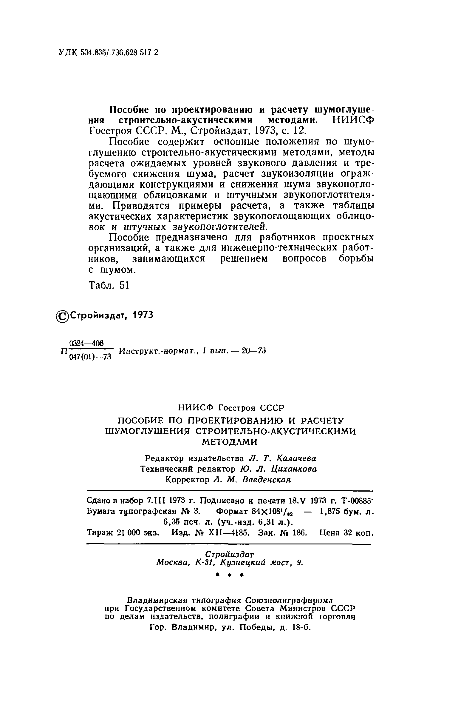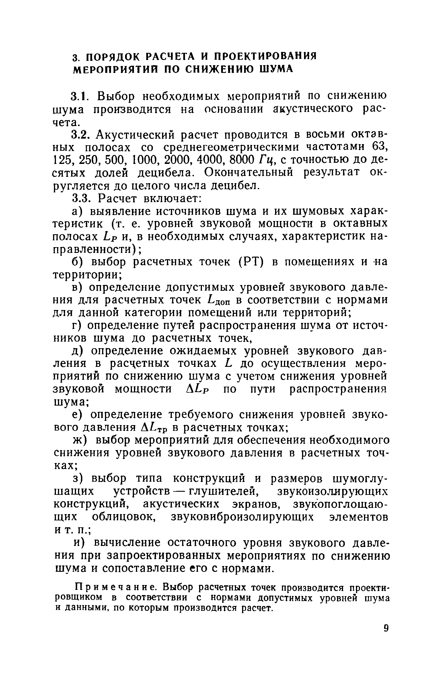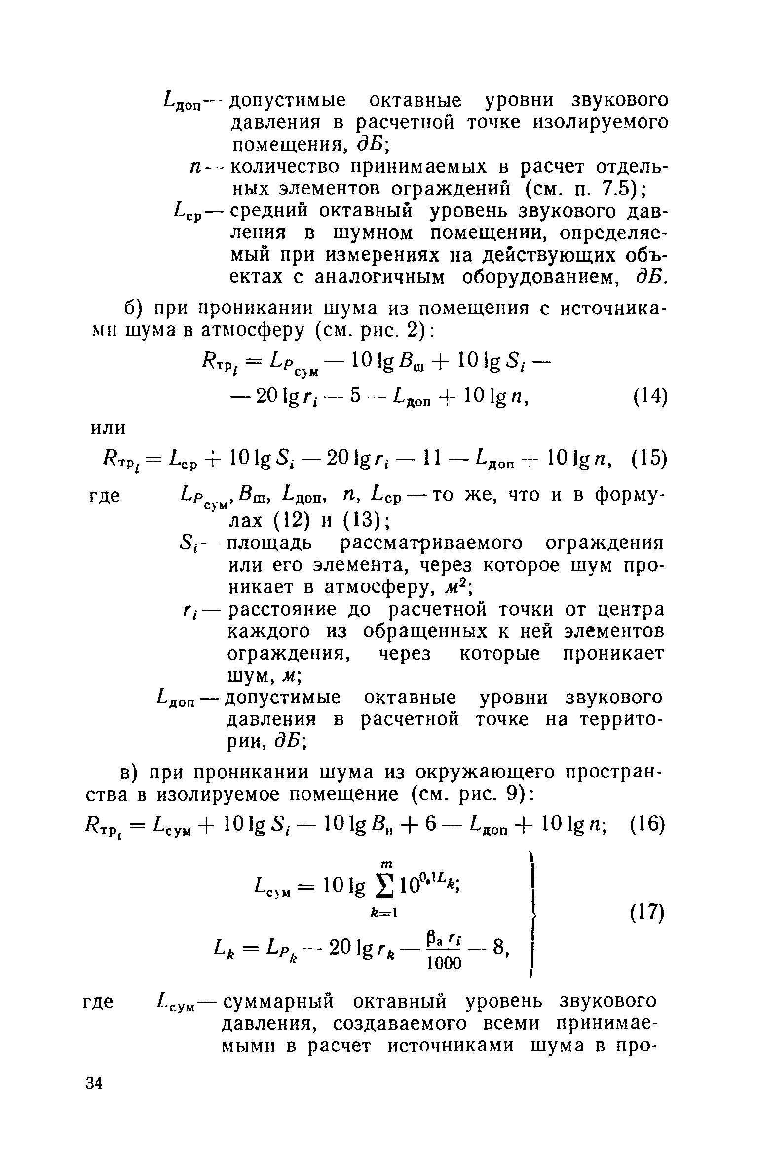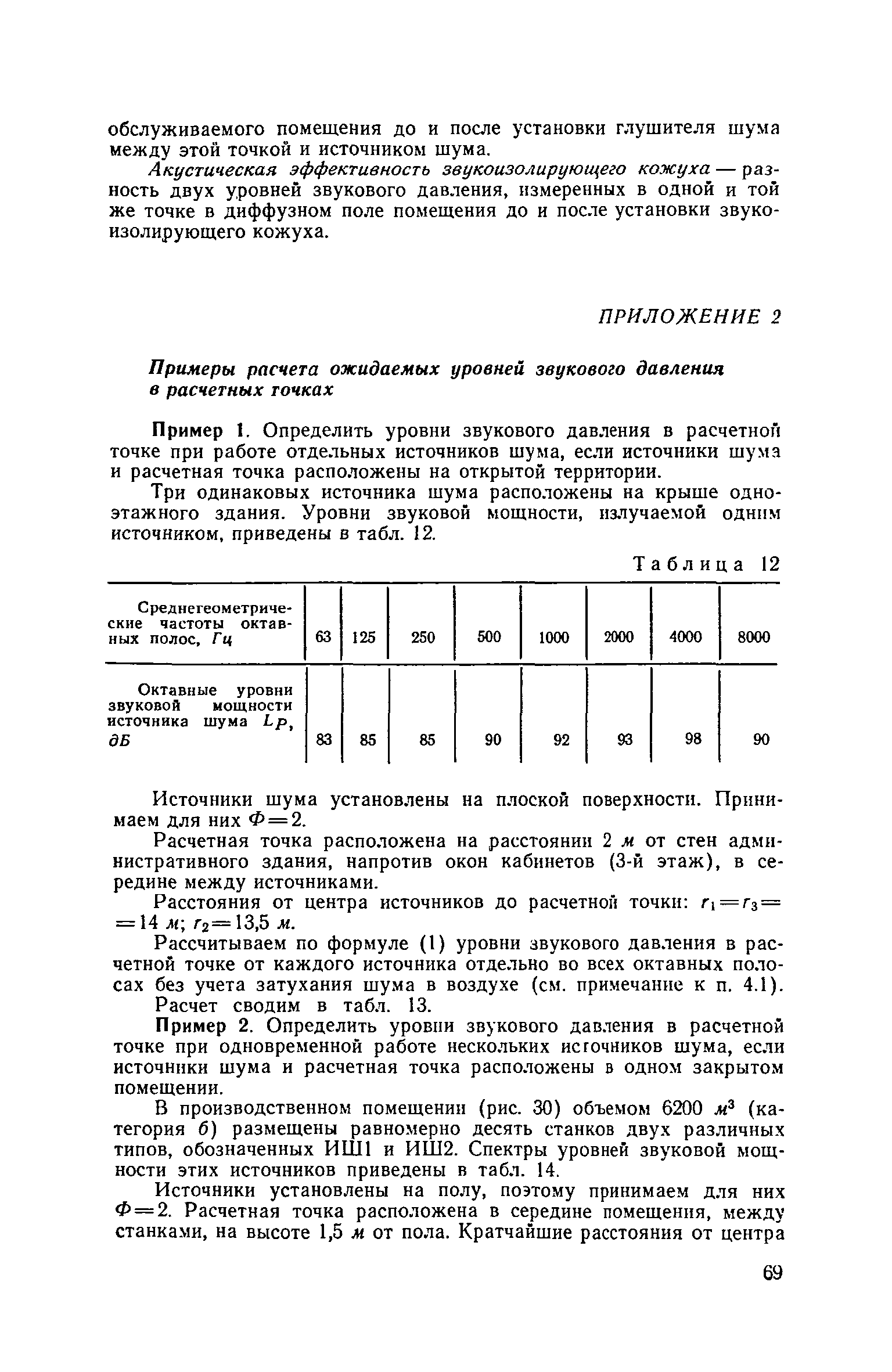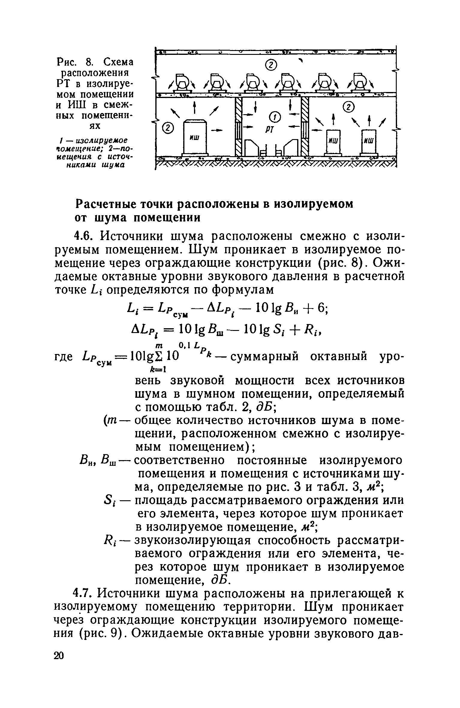 | Оглавление: | Предисловие 1. Общие положения 2. Планировочные решения 3. Порядок расчета и проектирования мероприятий по снижению шума 4. Расчет ожидаемых уровней звукового давления в расчетных точках до осуществления мероприятий по шумоглушению Расчетные точки расположены на территории Расчетные точки расположены в изолируемом от шума помещения Расчетные точки расположены в помещении с источниками шума 5. Расчет требуемого снижения шума 6. Строительно-акустические мероприятия по обеспечению требуемого снижения шума 7. Изоляция шума ограждающими конструкциями Расчет требуемой звукоизолирующей способности от воздушного шума Расчет звукоизолирующей способности от воздушного шума однослойных ограждений Приближенный расчет показателя изоляции от воздушного шума однослойными. двухслойными и раздельными многослойными ограждениями жилых и общественных зданий Расчет изоляции от ударного шума междуэтажными перекрытиями Конструктивные решения звукоизолирующих ограждений 8. Снижение шума звукопоглощающими облицовками и штучными звукопоглотителями Применение и размещение звукопоглощающих облицовок и штучных звукопоглотителей Расчет акустических характеристик помещений Выбор конструкции звукопоглощающей облицовки Расчет величины ожидаемого снижения шума Требования к звукопоглощающим облицовкам и штучным звукопоглотителям Приложение 1. Основные акустические понятия и определения Приложение 2. Примеры расчета ожидаемых уровней звукового давления в расчетных точках Приложение 3. Примеры расчета требуемой звукоизолирующей способности ограждающих конструкций Приложение 4. Примеры расчета звукоизолирующей способности ограждений от воздушного шума Приложение 5. Примеры расчета изоляции от ударного шума междуэтажными перекрытиями Приложение 6. Пример выбора конструкции звукопоглощающей облицовки по заданному усредненному спектру уровня звукового давления Приложение 7. Пример расчета снижения уровня звукового давления в помещении по заданным шумовым характеристикам технологического оборудования Приложение 8. Примеры расчета требуемого дополнительного звукопоглощения и выбор конструкции звукопоглотителя по требуемому снижению уровня звукового давления в зоне отраженного поля Приложение 9. Акустические характеристики некоторых звукопоглощающих облицовок и штучных звукопоглотителей |