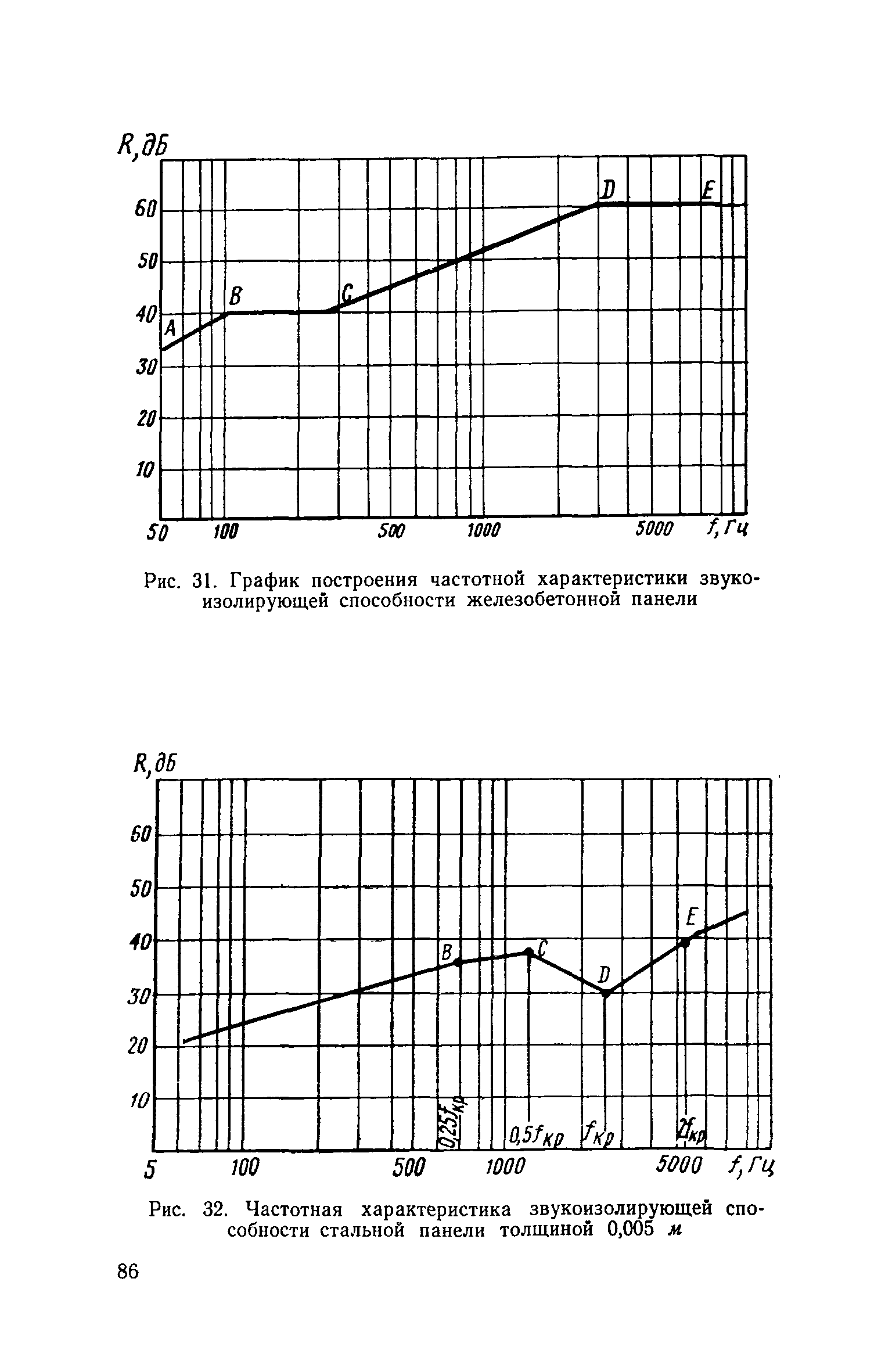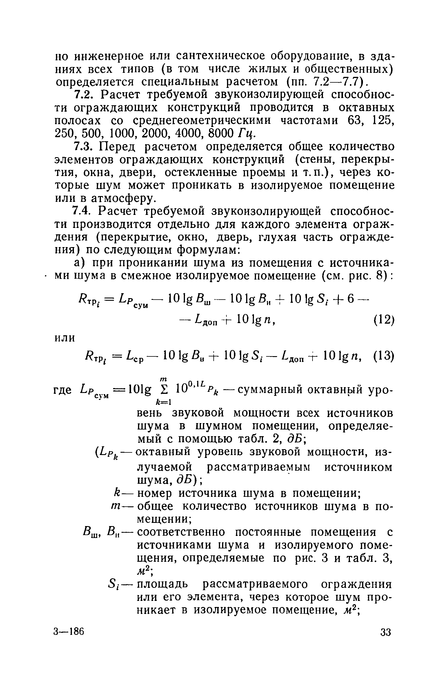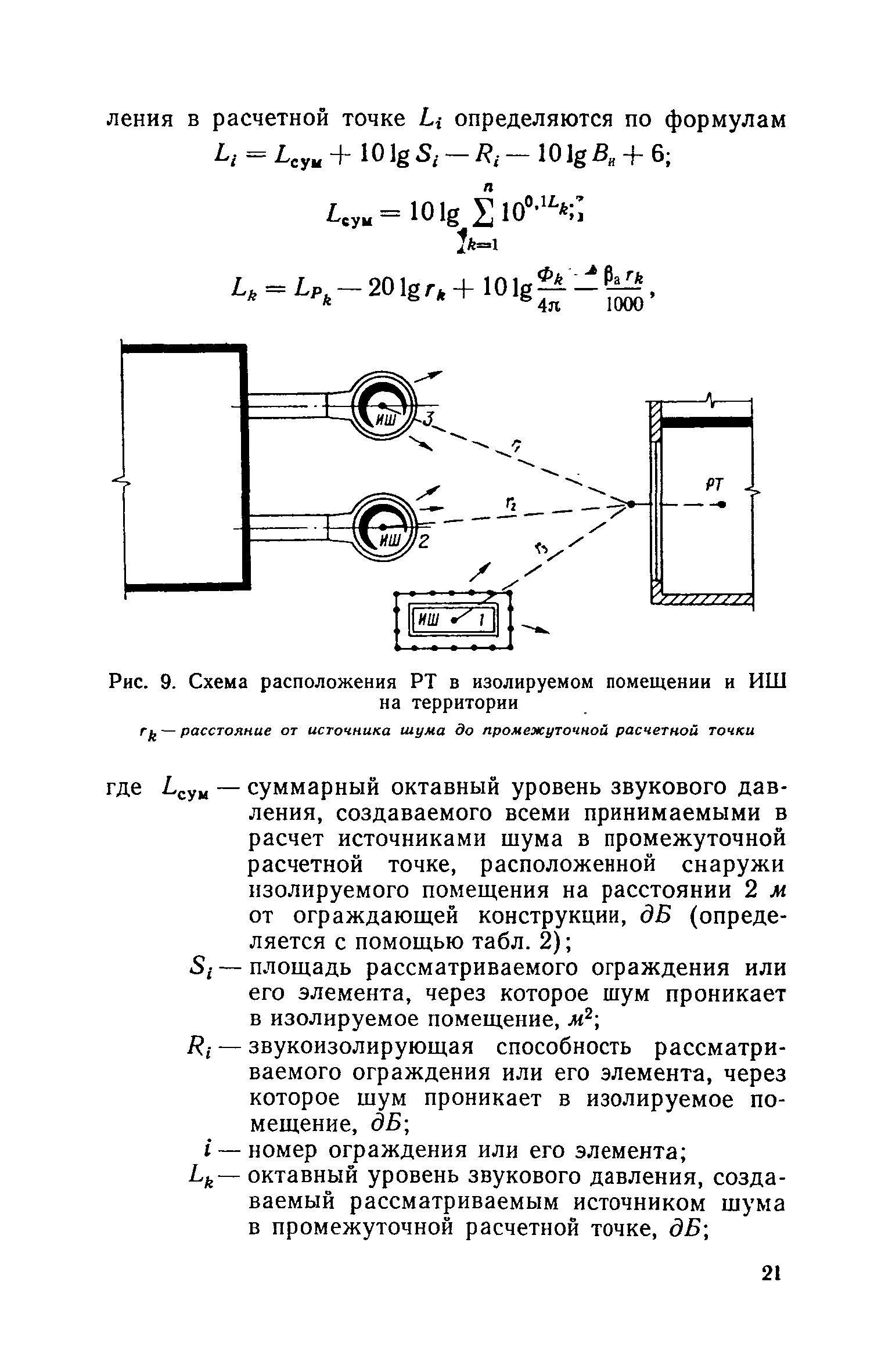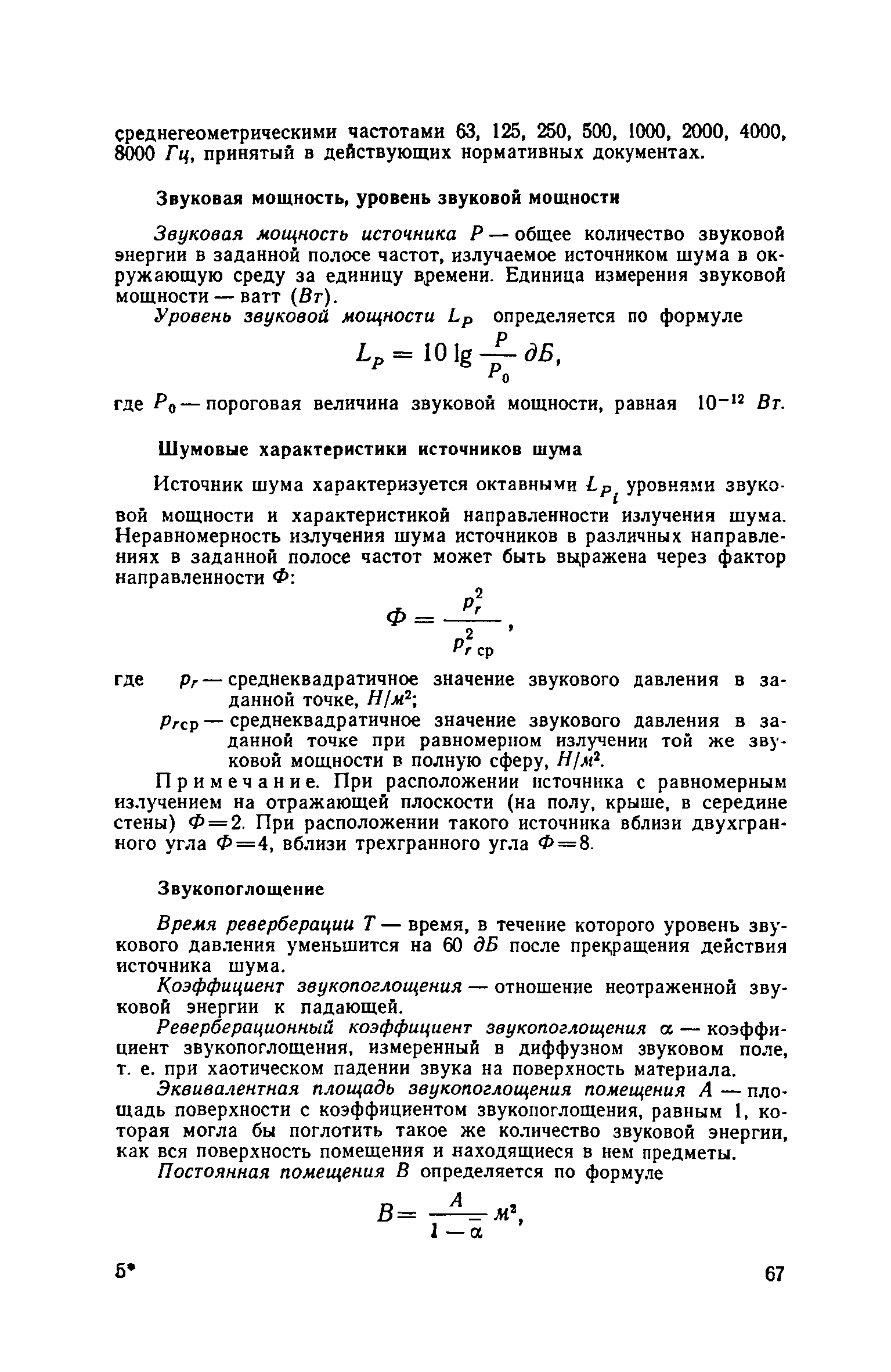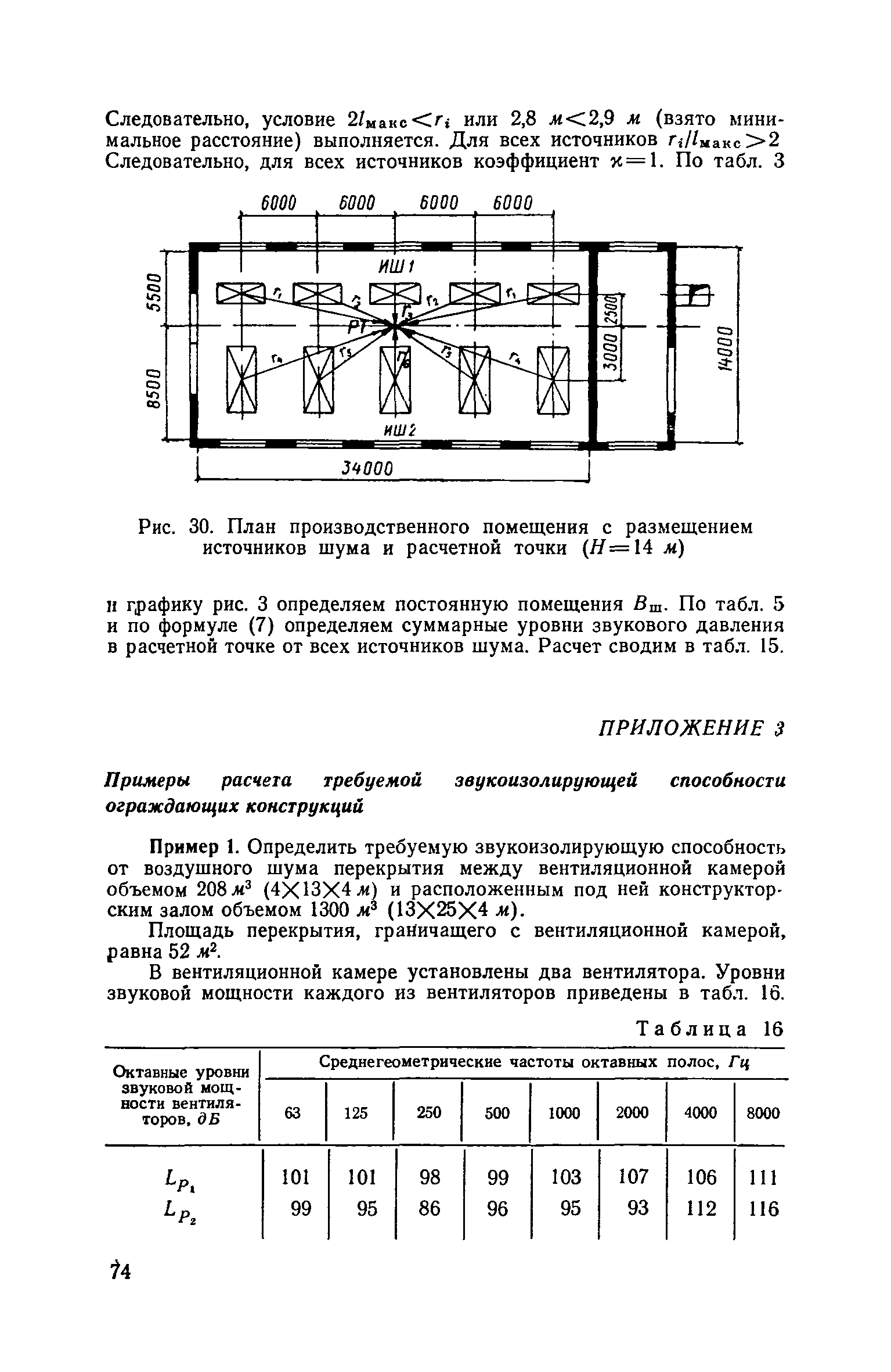 | Оглавление: | Предисловие 1. Общие положения 2. Планировочные решения 3. Порядок расчета и проектирования мероприятий по снижению шума 4. Расчет ожидаемых уровней звукового давления в расчетных точках до осуществления мероприятий по шумоглушению Расчетные точки расположены на территории Расчетные точки расположены в изолируемом от шума помещения Расчетные точки расположены в помещении с источниками шума 5. Расчет требуемого снижения шума 6. Строительно-акустические мероприятия по обеспечению требуемого снижения шума 7. Изоляция шума ограждающими конструкциями Расчет требуемой звукоизолирующей способности от воздушного шума Расчет звукоизолирующей способности от воздушного шума однослойных ограждений Приближенный расчет показателя изоляции от воздушного шума однослойными. двухслойными и раздельными многослойными ограждениями жилых и общественных зданий Расчет изоляции от ударного шума междуэтажными перекрытиями Конструктивные решения звукоизолирующих ограждений 8. Снижение шума звукопоглощающими облицовками и штучными звукопоглотителями Применение и размещение звукопоглощающих облицовок и штучных звукопоглотителей Расчет акустических характеристик помещений Выбор конструкции звукопоглощающей облицовки Расчет величины ожидаемого снижения шума Требования к звукопоглощающим облицовкам и штучным звукопоглотителям Приложение 1. Основные акустические понятия и определения Приложение 2. Примеры расчета ожидаемых уровней звукового давления в расчетных точках Приложение 3. Примеры расчета требуемой звукоизолирующей способности ограждающих конструкций Приложение 4. Примеры расчета звукоизолирующей способности ограждений от воздушного шума Приложение 5. Примеры расчета изоляции от ударного шума междуэтажными перекрытиями Приложение 6. Пример выбора конструкции звукопоглощающей облицовки по заданному усредненному спектру уровня звукового давления Приложение 7. Пример расчета снижения уровня звукового давления в помещении по заданным шумовым характеристикам технологического оборудования Приложение 8. Примеры расчета требуемого дополнительного звукопоглощения и выбор конструкции звукопоглотителя по требуемому снижению уровня звукового давления в зоне отраженного поля Приложение 9. Акустические характеристики некоторых звукопоглощающих облицовок и штучных звукопоглотителей |