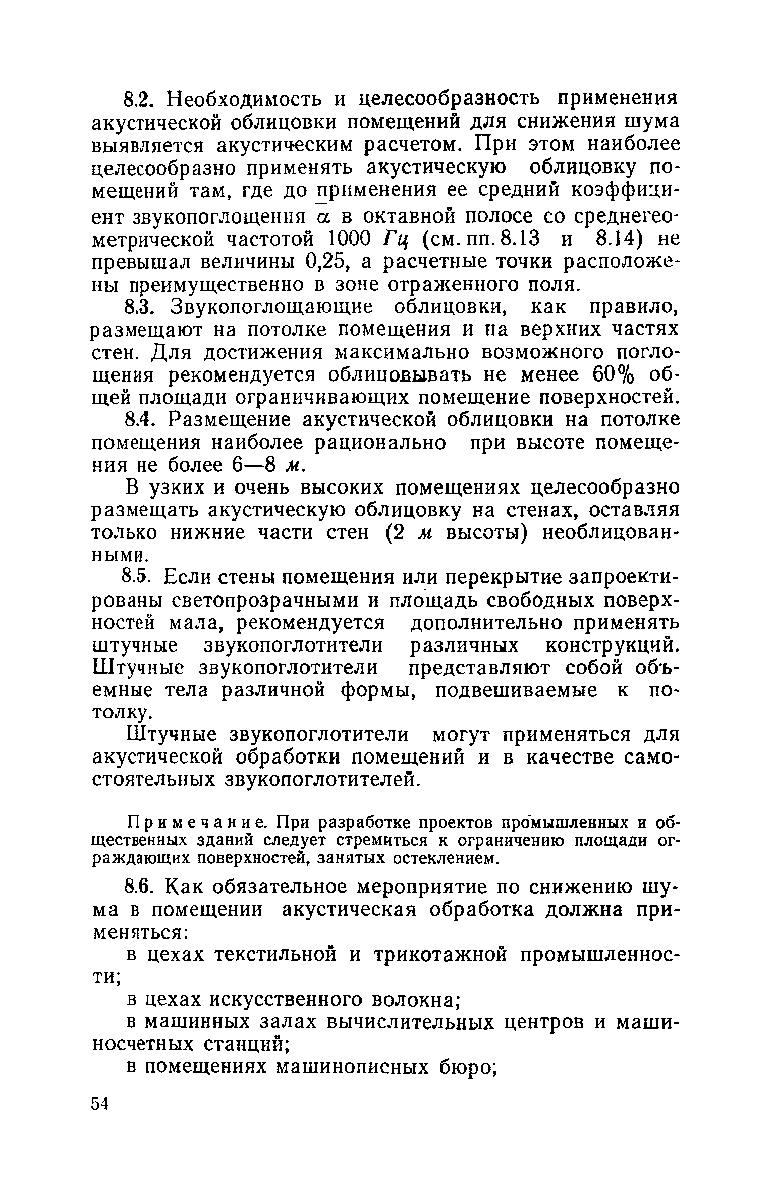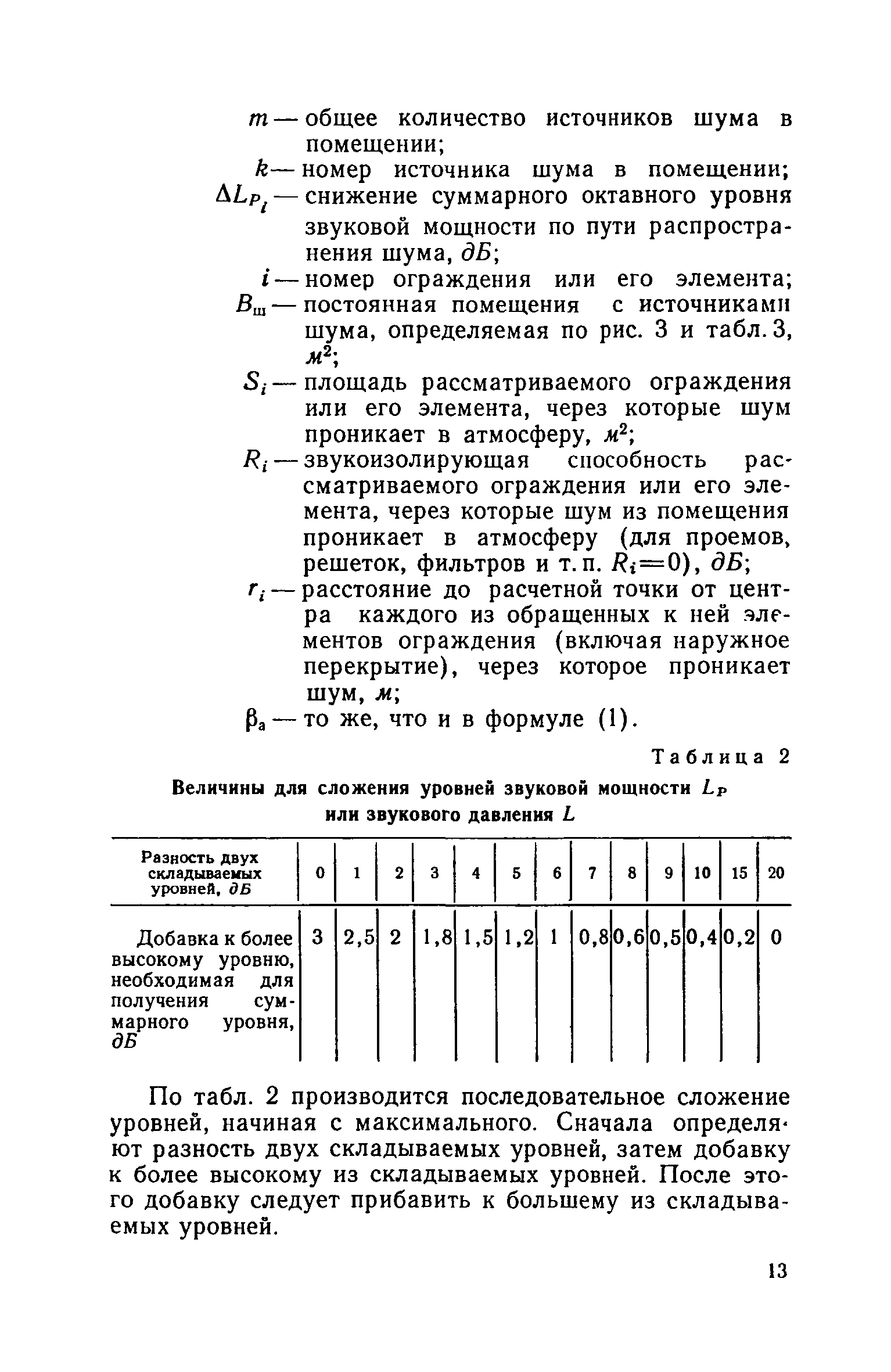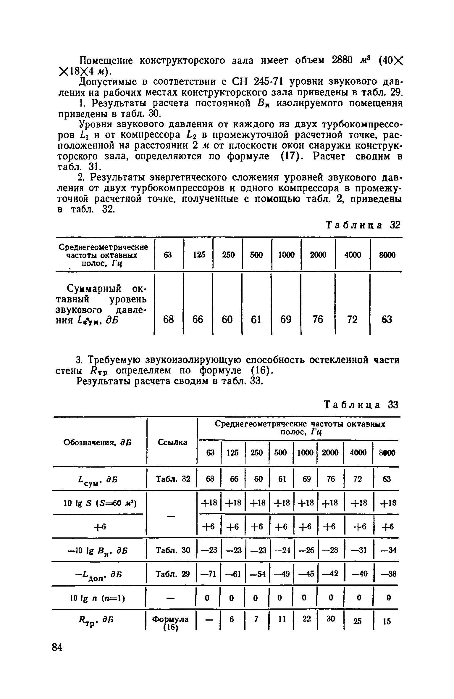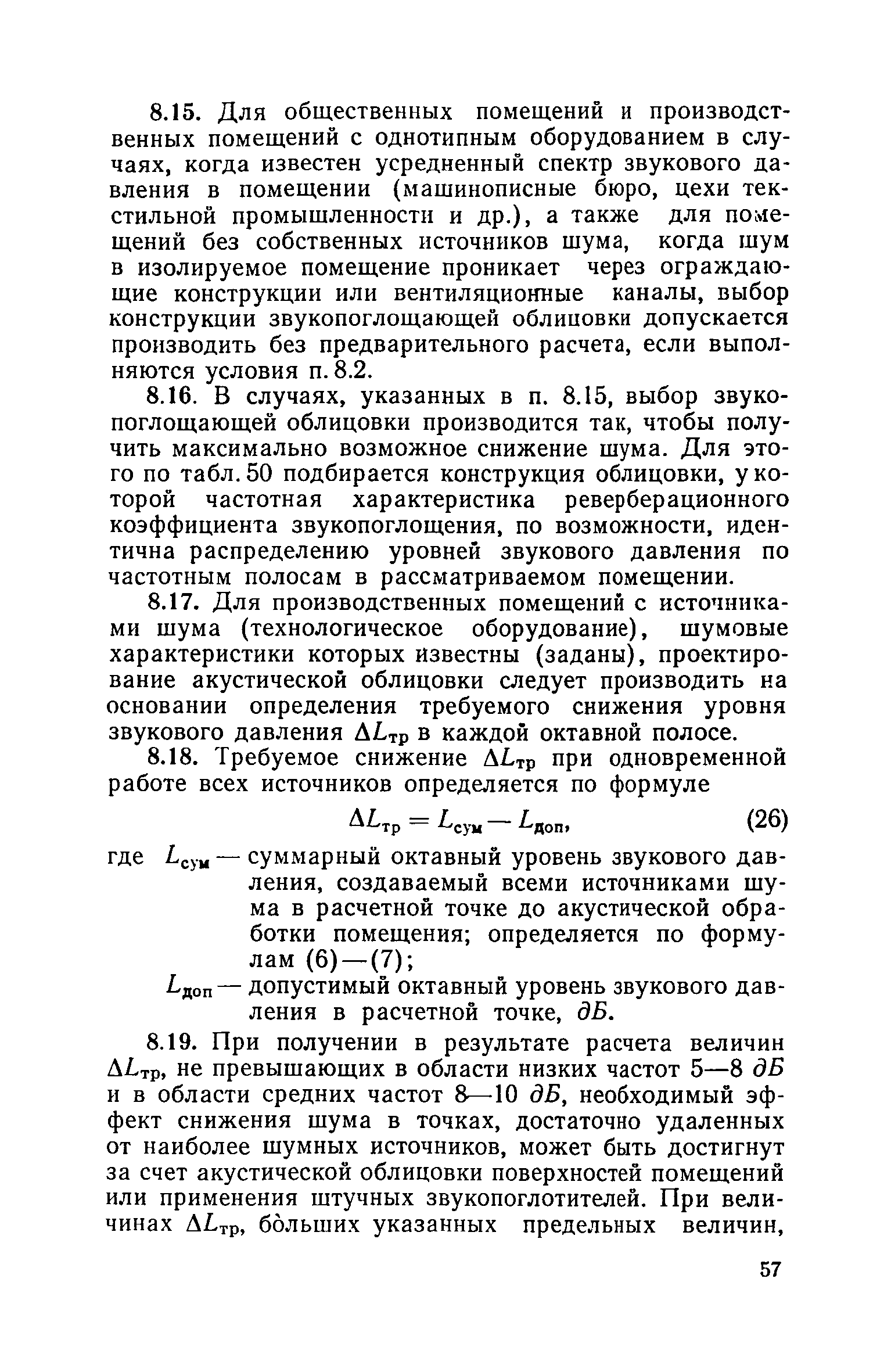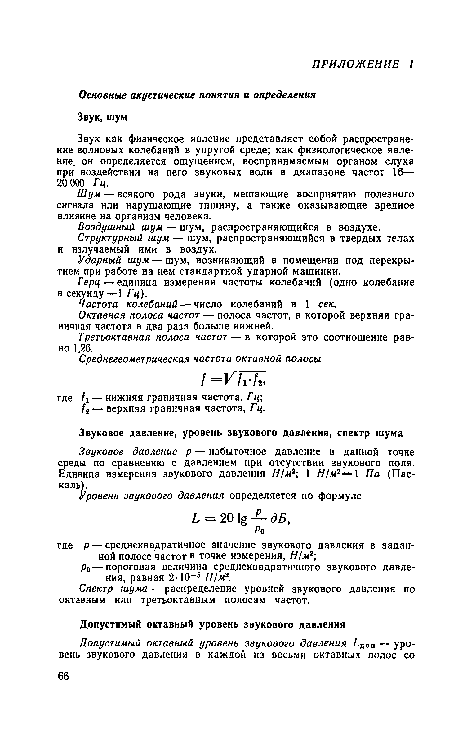 | Оглавление: | Предисловие 1. Общие положения 2. Планировочные решения 3. Порядок расчета и проектирования мероприятий по снижению шума 4. Расчет ожидаемых уровней звукового давления в расчетных точках до осуществления мероприятий по шумоглушению Расчетные точки расположены на территории Расчетные точки расположены в изолируемом от шума помещения Расчетные точки расположены в помещении с источниками шума 5. Расчет требуемого снижения шума 6. Строительно-акустические мероприятия по обеспечению требуемого снижения шума 7. Изоляция шума ограждающими конструкциями Расчет требуемой звукоизолирующей способности от воздушного шума Расчет звукоизолирующей способности от воздушного шума однослойных ограждений Приближенный расчет показателя изоляции от воздушного шума однослойными. двухслойными и раздельными многослойными ограждениями жилых и общественных зданий Расчет изоляции от ударного шума междуэтажными перекрытиями Конструктивные решения звукоизолирующих ограждений 8. Снижение шума звукопоглощающими облицовками и штучными звукопоглотителями Применение и размещение звукопоглощающих облицовок и штучных звукопоглотителей Расчет акустических характеристик помещений Выбор конструкции звукопоглощающей облицовки Расчет величины ожидаемого снижения шума Требования к звукопоглощающим облицовкам и штучным звукопоглотителям Приложение 1. Основные акустические понятия и определения Приложение 2. Примеры расчета ожидаемых уровней звукового давления в расчетных точках Приложение 3. Примеры расчета требуемой звукоизолирующей способности ограждающих конструкций Приложение 4. Примеры расчета звукоизолирующей способности ограждений от воздушного шума Приложение 5. Примеры расчета изоляции от ударного шума междуэтажными перекрытиями Приложение 6. Пример выбора конструкции звукопоглощающей облицовки по заданному усредненному спектру уровня звукового давления Приложение 7. Пример расчета снижения уровня звукового давления в помещении по заданным шумовым характеристикам технологического оборудования Приложение 8. Примеры расчета требуемого дополнительного звукопоглощения и выбор конструкции звукопоглотителя по требуемому снижению уровня звукового давления в зоне отраженного поля Приложение 9. Акустические характеристики некоторых звукопоглощающих облицовок и штучных звукопоглотителей |