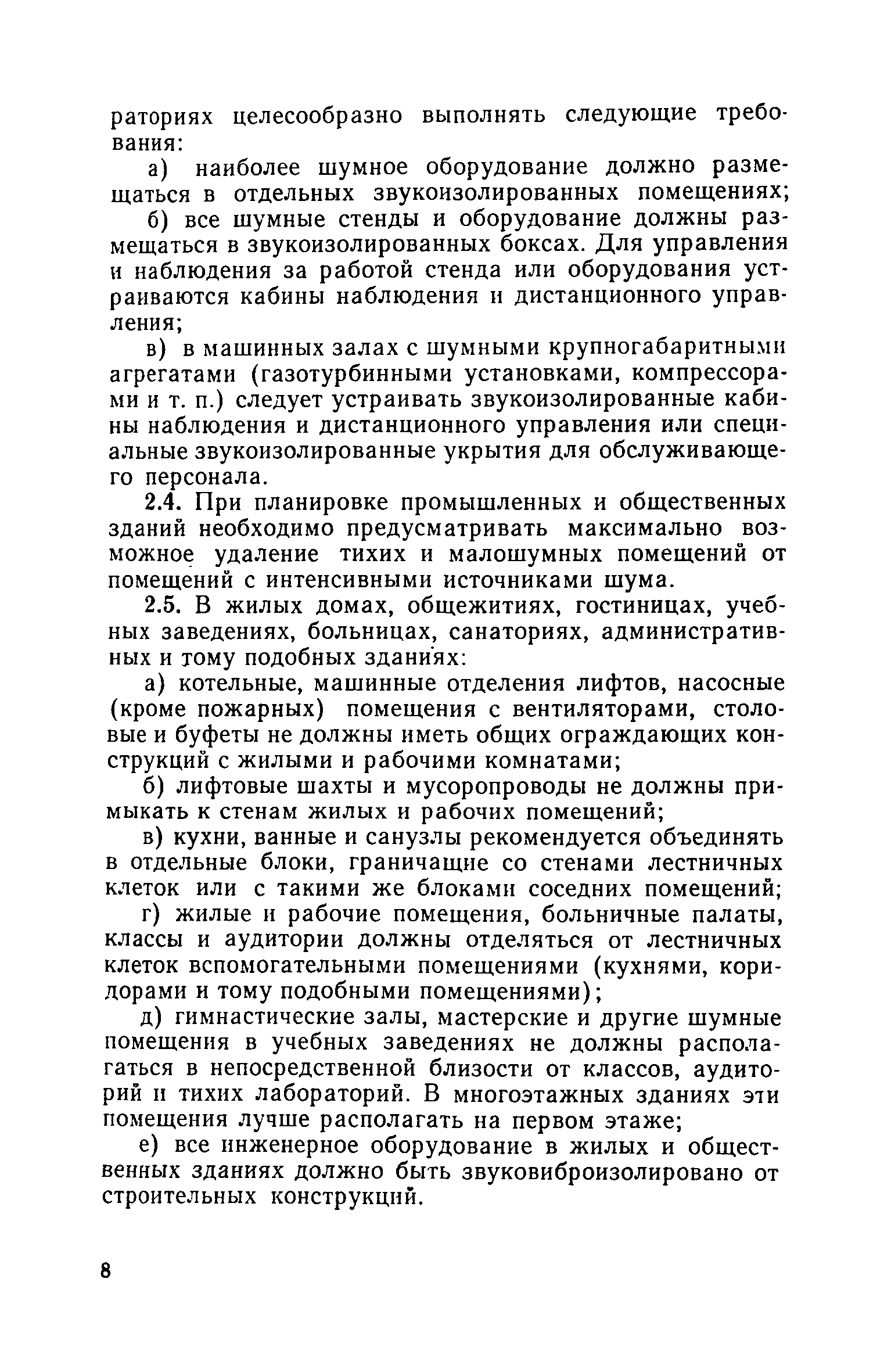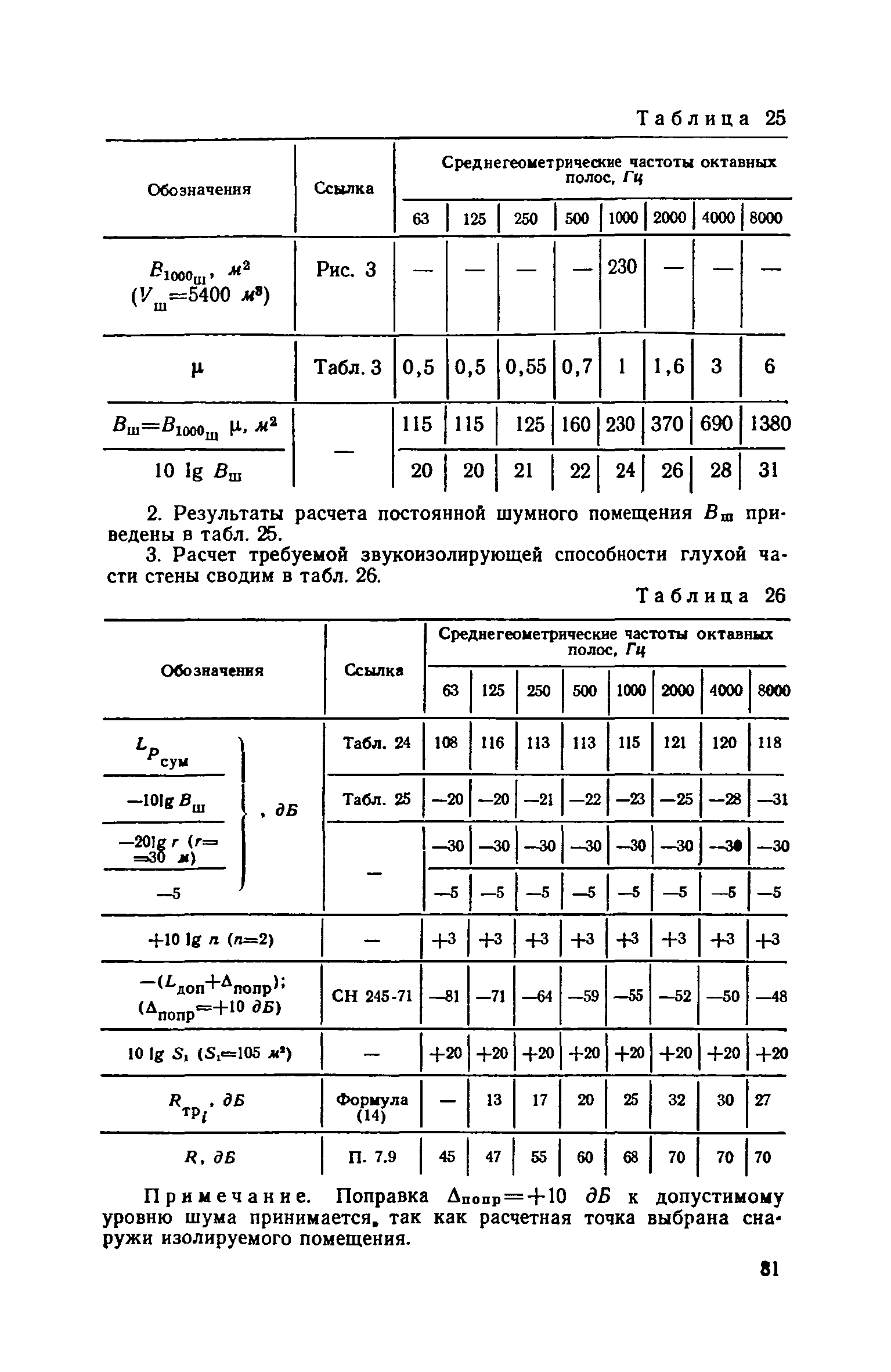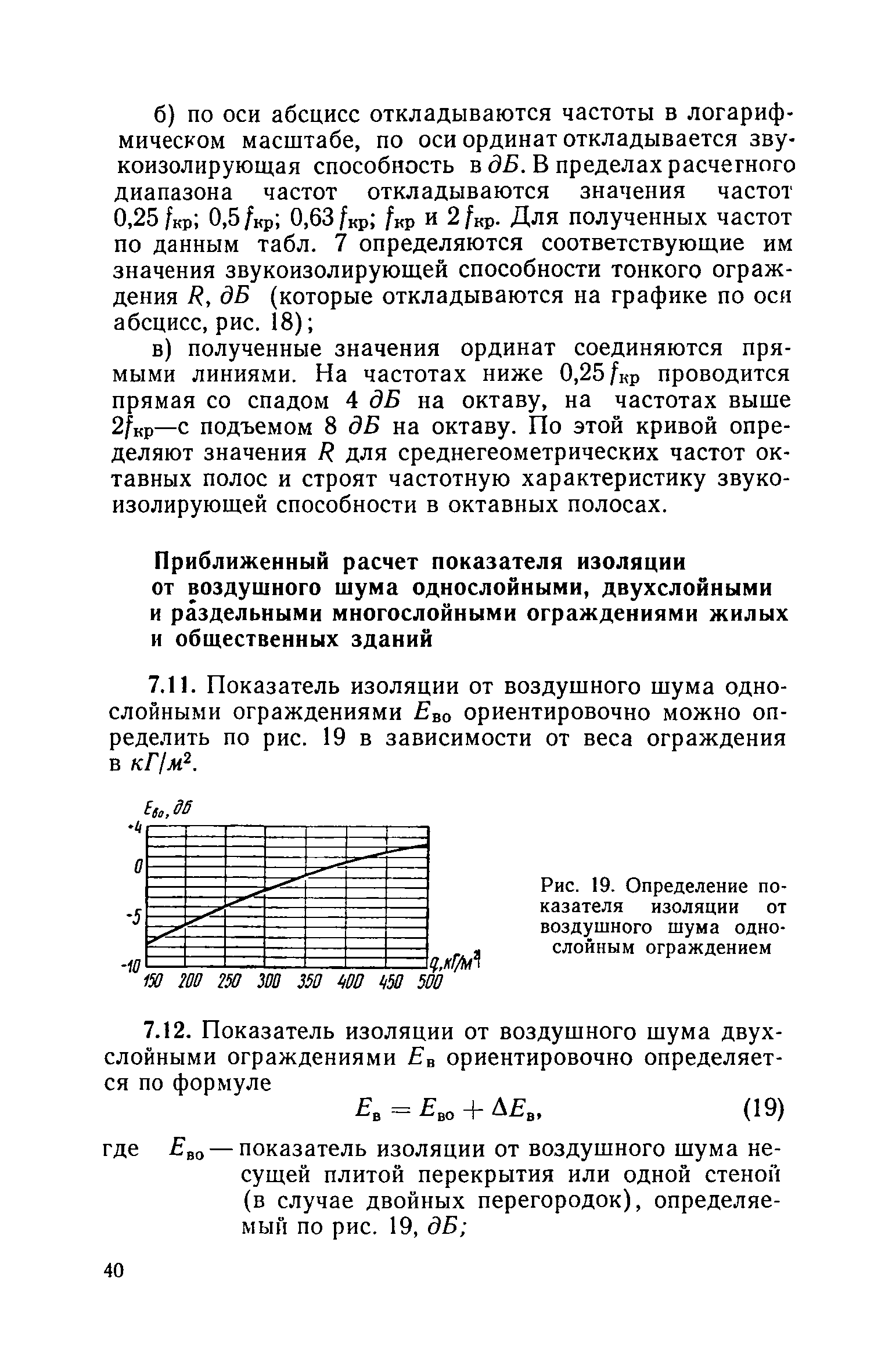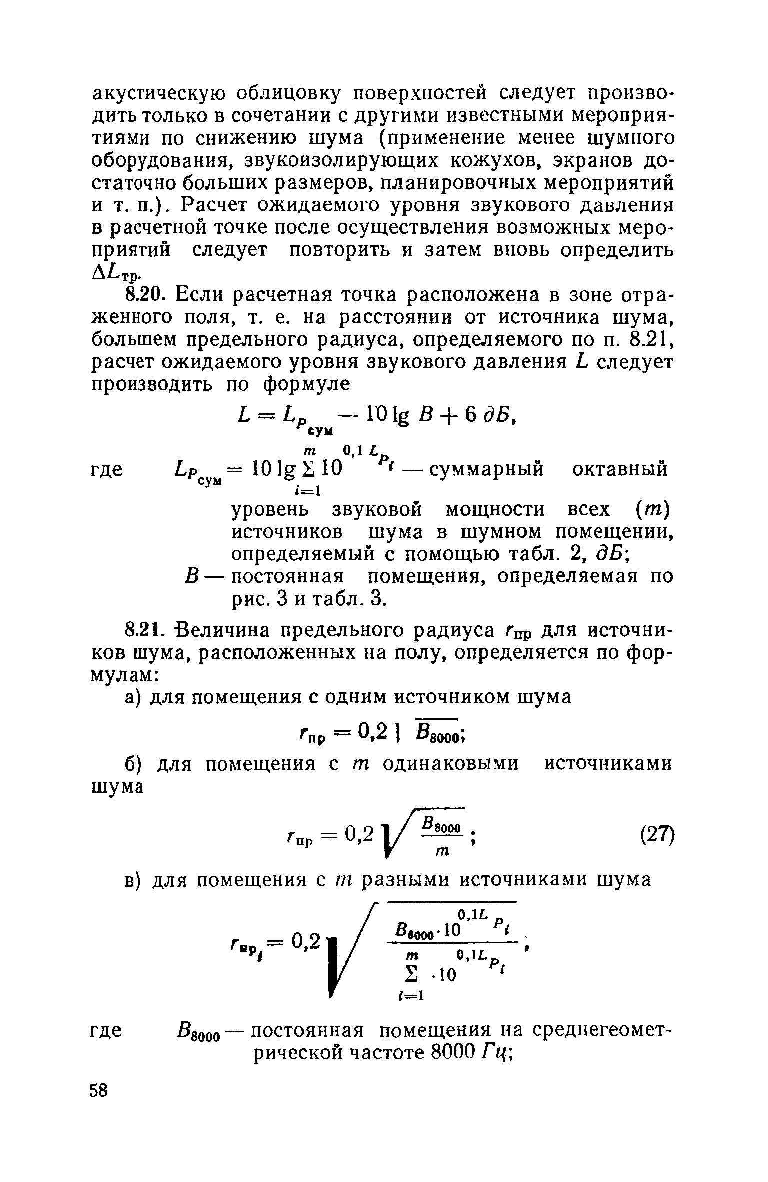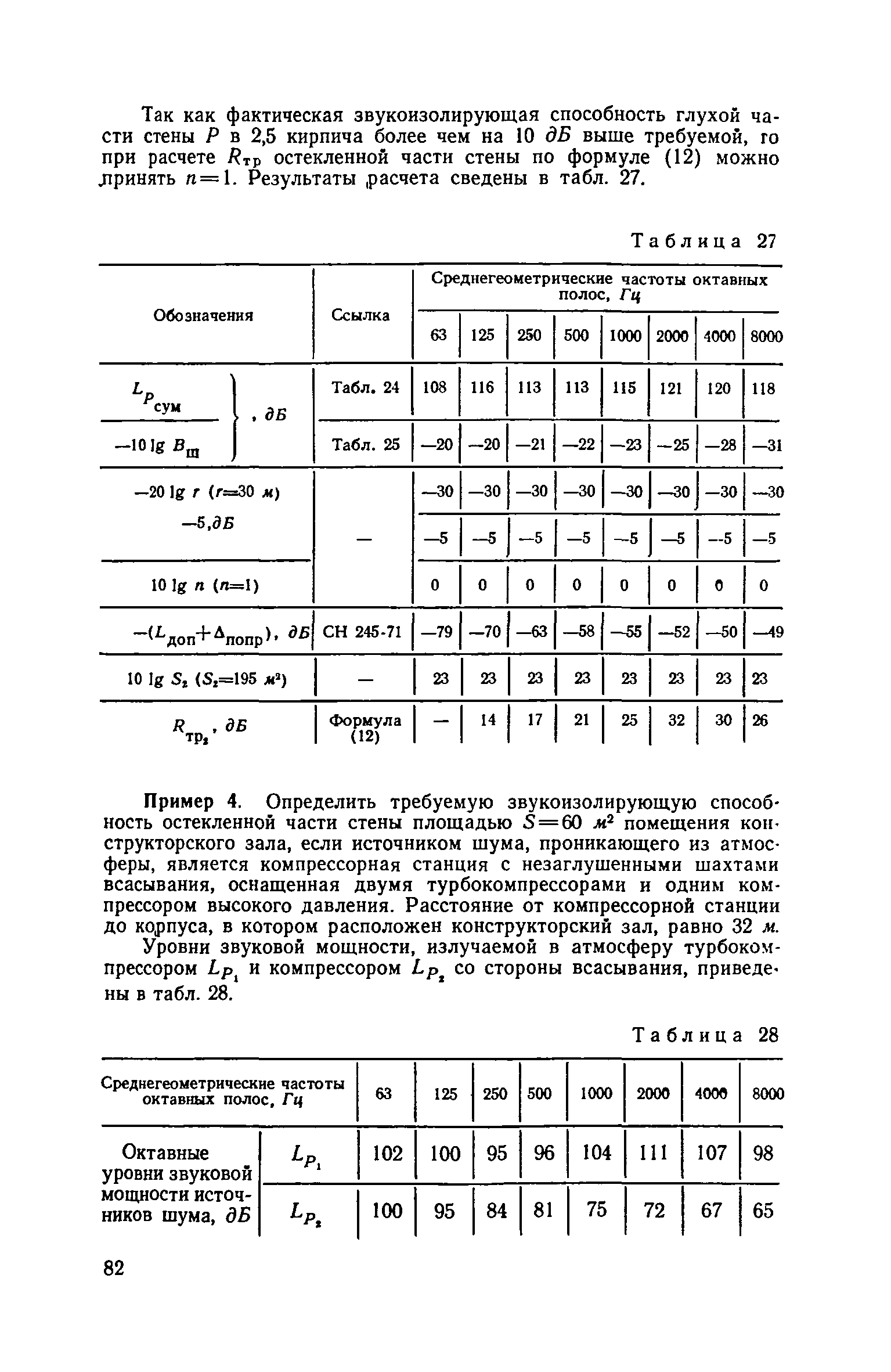 | Оглавление: | Предисловие 1. Общие положения 2. Планировочные решения 3. Порядок расчета и проектирования мероприятий по снижению шума 4. Расчет ожидаемых уровней звукового давления в расчетных точках до осуществления мероприятий по шумоглушению Расчетные точки расположены на территории Расчетные точки расположены в изолируемом от шума помещения Расчетные точки расположены в помещении с источниками шума 5. Расчет требуемого снижения шума 6. Строительно-акустические мероприятия по обеспечению требуемого снижения шума 7. Изоляция шума ограждающими конструкциями Расчет требуемой звукоизолирующей способности от воздушного шума Расчет звукоизолирующей способности от воздушного шума однослойных ограждений Приближенный расчет показателя изоляции от воздушного шума однослойными. двухслойными и раздельными многослойными ограждениями жилых и общественных зданий Расчет изоляции от ударного шума междуэтажными перекрытиями Конструктивные решения звукоизолирующих ограждений 8. Снижение шума звукопоглощающими облицовками и штучными звукопоглотителями Применение и размещение звукопоглощающих облицовок и штучных звукопоглотителей Расчет акустических характеристик помещений Выбор конструкции звукопоглощающей облицовки Расчет величины ожидаемого снижения шума Требования к звукопоглощающим облицовкам и штучным звукопоглотителям Приложение 1. Основные акустические понятия и определения Приложение 2. Примеры расчета ожидаемых уровней звукового давления в расчетных точках Приложение 3. Примеры расчета требуемой звукоизолирующей способности ограждающих конструкций Приложение 4. Примеры расчета звукоизолирующей способности ограждений от воздушного шума Приложение 5. Примеры расчета изоляции от ударного шума междуэтажными перекрытиями Приложение 6. Пример выбора конструкции звукопоглощающей облицовки по заданному усредненному спектру уровня звукового давления Приложение 7. Пример расчета снижения уровня звукового давления в помещении по заданным шумовым характеристикам технологического оборудования Приложение 8. Примеры расчета требуемого дополнительного звукопоглощения и выбор конструкции звукопоглотителя по требуемому снижению уровня звукового давления в зоне отраженного поля Приложение 9. Акустические характеристики некоторых звукопоглощающих облицовок и штучных звукопоглотителей |