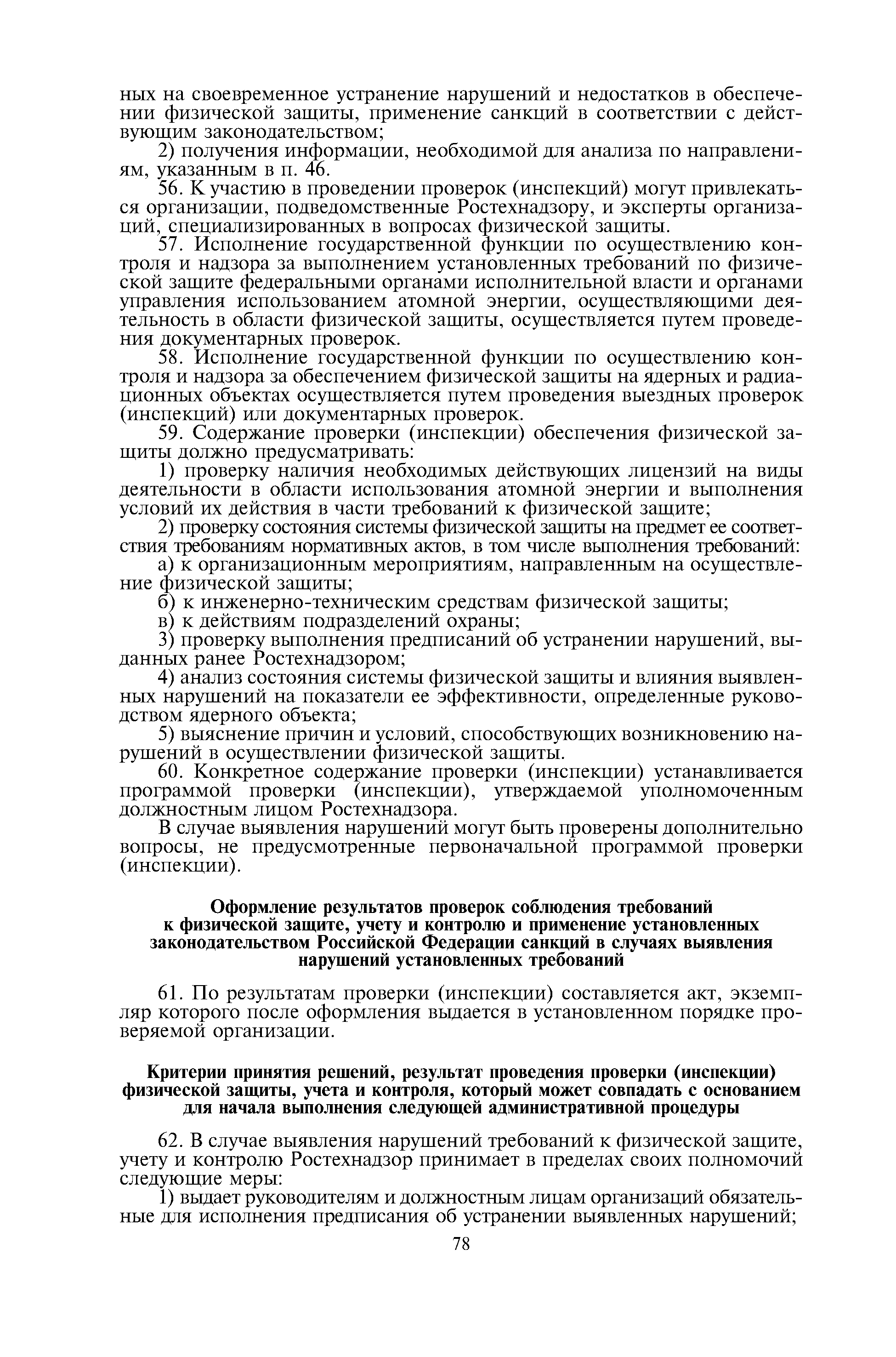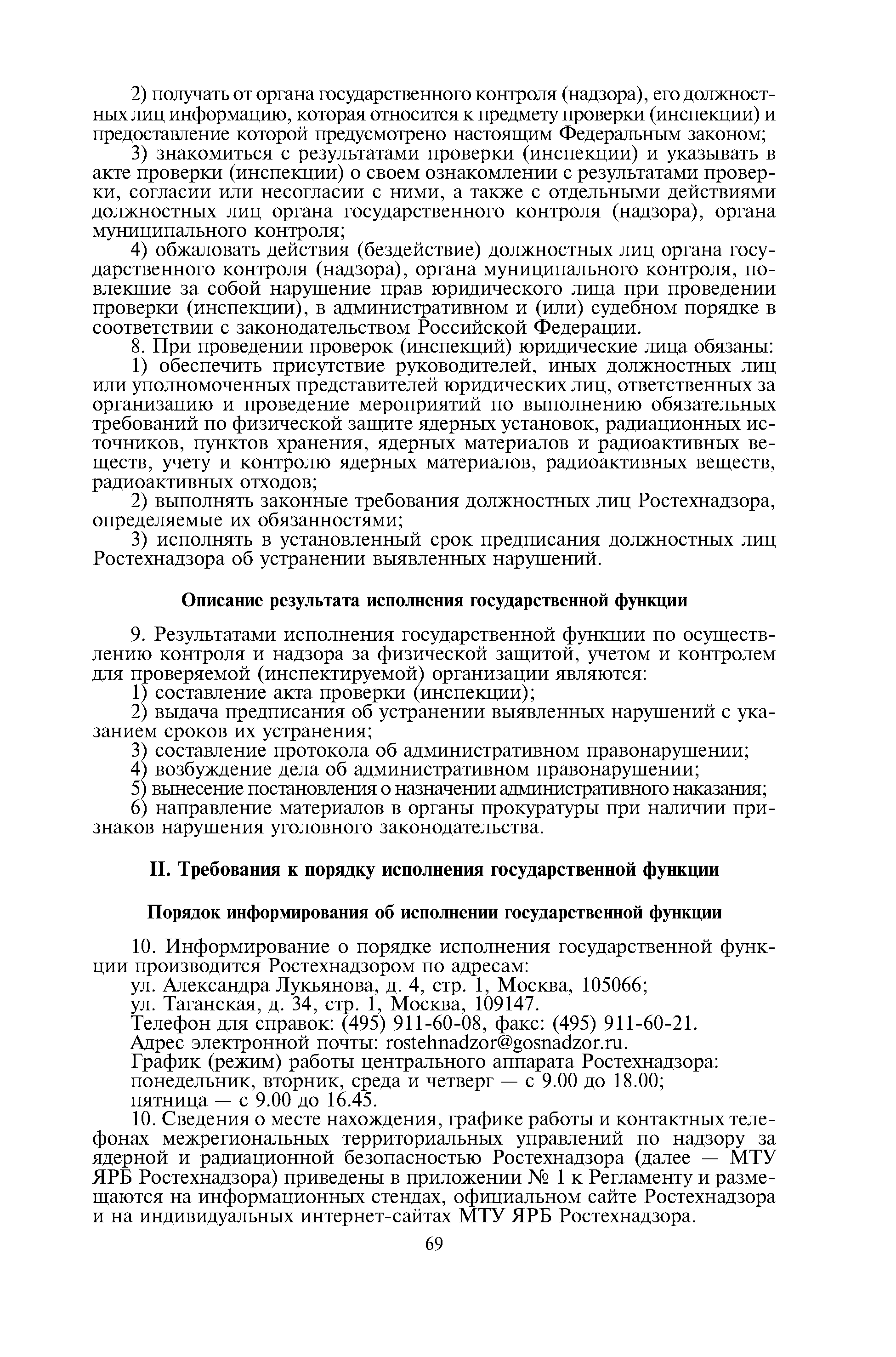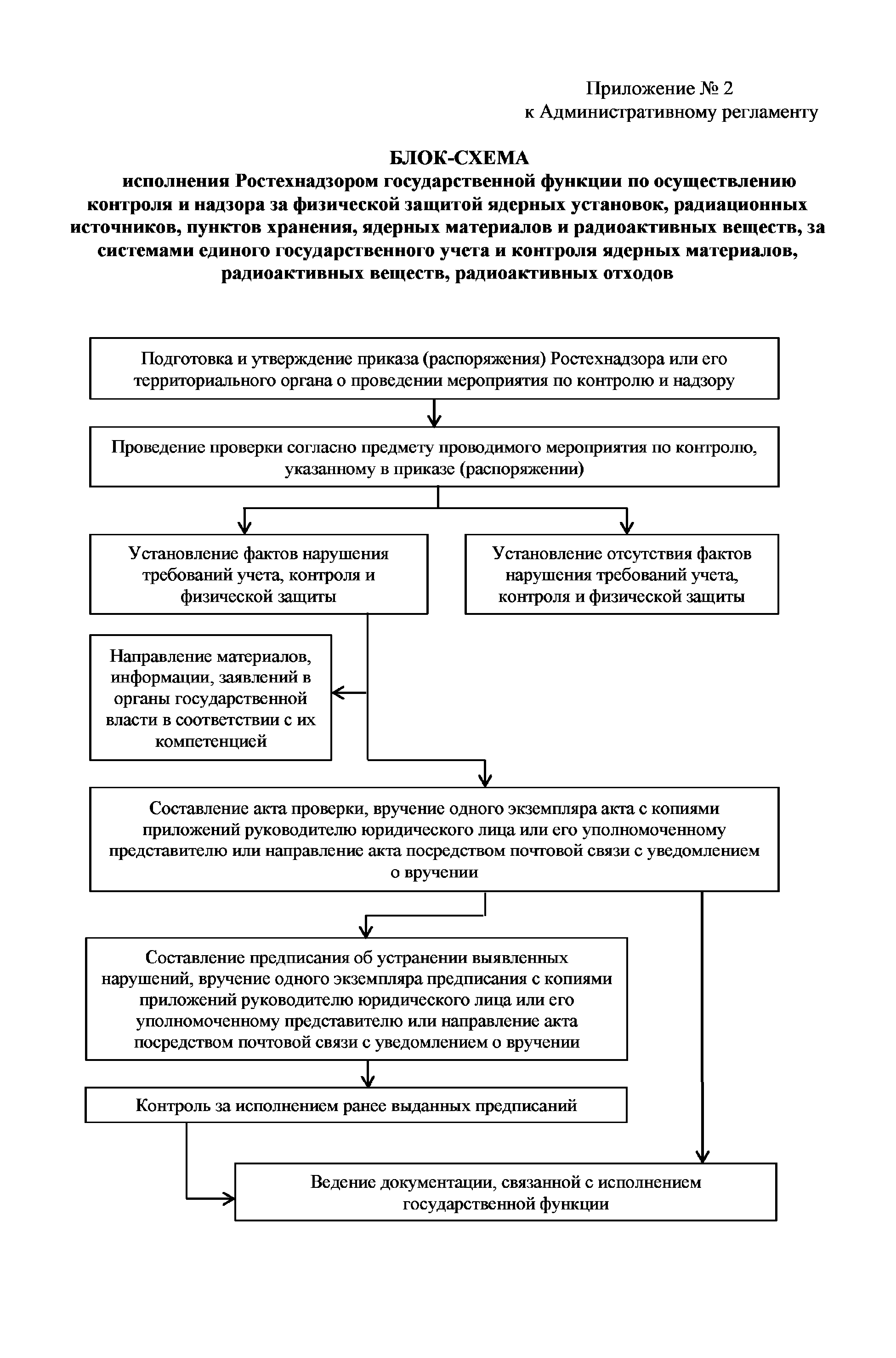 Административный регламент по исполнению Федеральной службой по экологическому, технологическому и атомному надзору государственной функции по осуществлению контроля и надзора за физической защитой ядерных установок, радиационных источников, пунктов хранения, ядерных материалов и радиоактивных веществ, за системами единого государственного учета и контроля ядерных материалов, радиоактивных веществ, радиоактивных отходов| Статус: | действует | | Название рус.: | Административный регламент по исполнению Федеральной службой по экологическому, технологическому и атомному надзору государственной функции по осуществлению контроля и надзора за физической защитой ядерных установок, радиационных источников, пунктов хранения, ядерных материалов и радиоактивных веществ, за системами единого государственного учета и контроля ядерных материалов, радиоактивных веществ, радиоактивных отходов | | Дата добавления в базу: | 01.10.2014 | | Дата актуализации: | 01.01.2021 | | Дата введения: | 24.08.2012 | | Оглавление: | I. Общие положения II. Требования к порядку исполнения государственной функции III. Состав, последовательность и сроки выполнения административных процедур (действий) IV. Порядок и формы контроля за исполнением государственной функции V. Досудебный (внесудебный) порядок обжалования решений, действий (бездействия) Ростехнадзора и его должностных лиц Приложение 1. Перечень территориальных органов Ростехнадзора Приложение 2. Блок-схема исполнения Ростехнадзором государственной функции по осуществлению контроля и надзора за физической защитой ядерных установок, радиационных источников, пунктов хранения, ядерных материалов и радиоактивных веществ, за системами единого государственного учета и контроля ядерных материалов, радиоактивных веществ, радиоактивных отходов | | Утверждён: | 15.12.2011 Федеральная служба по экологическому, технологическому и атомному надзору (703)