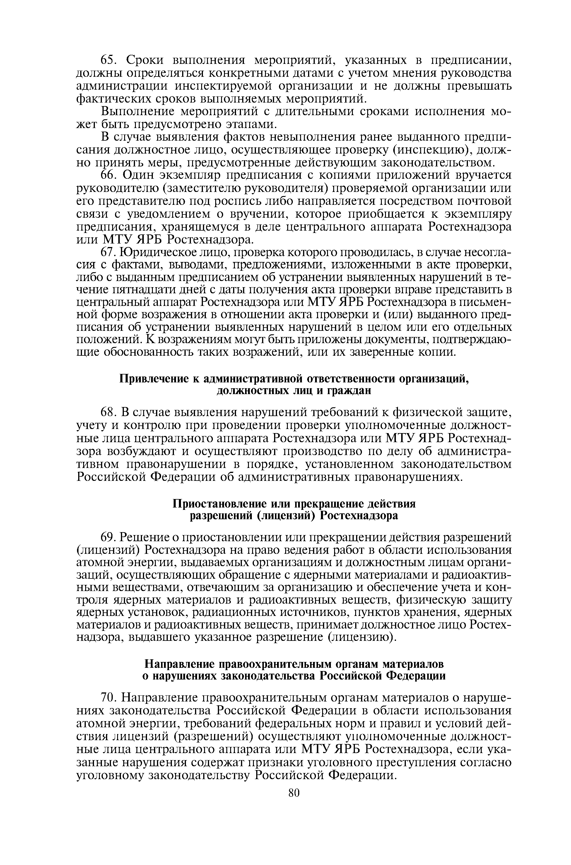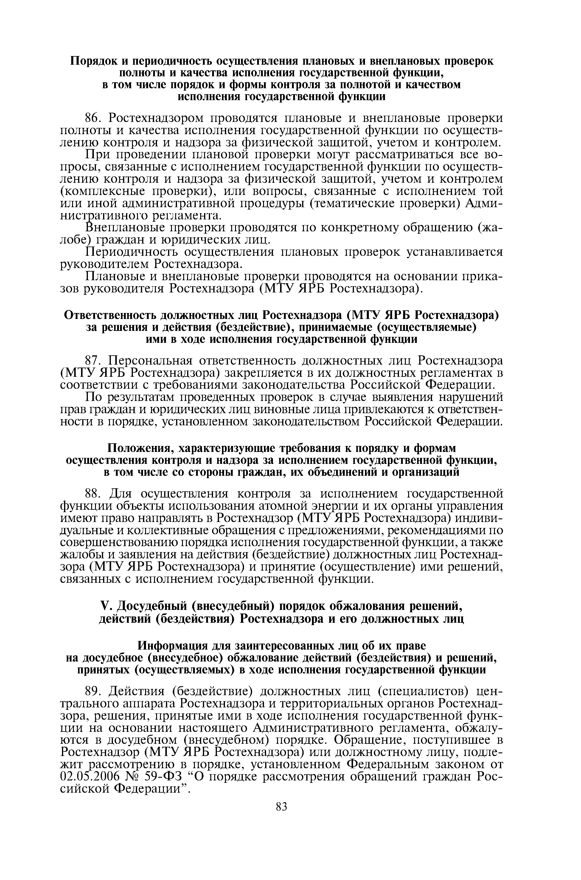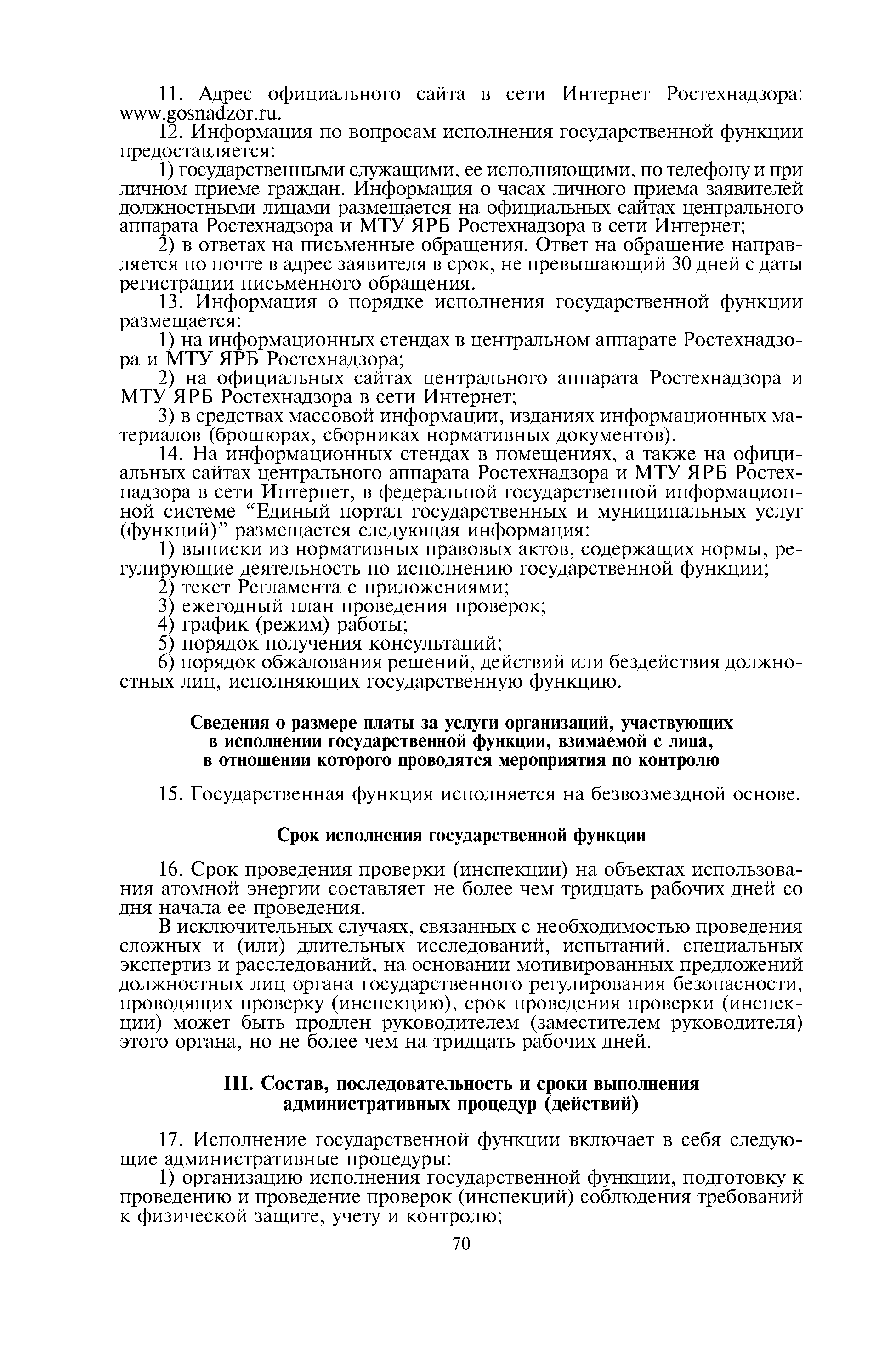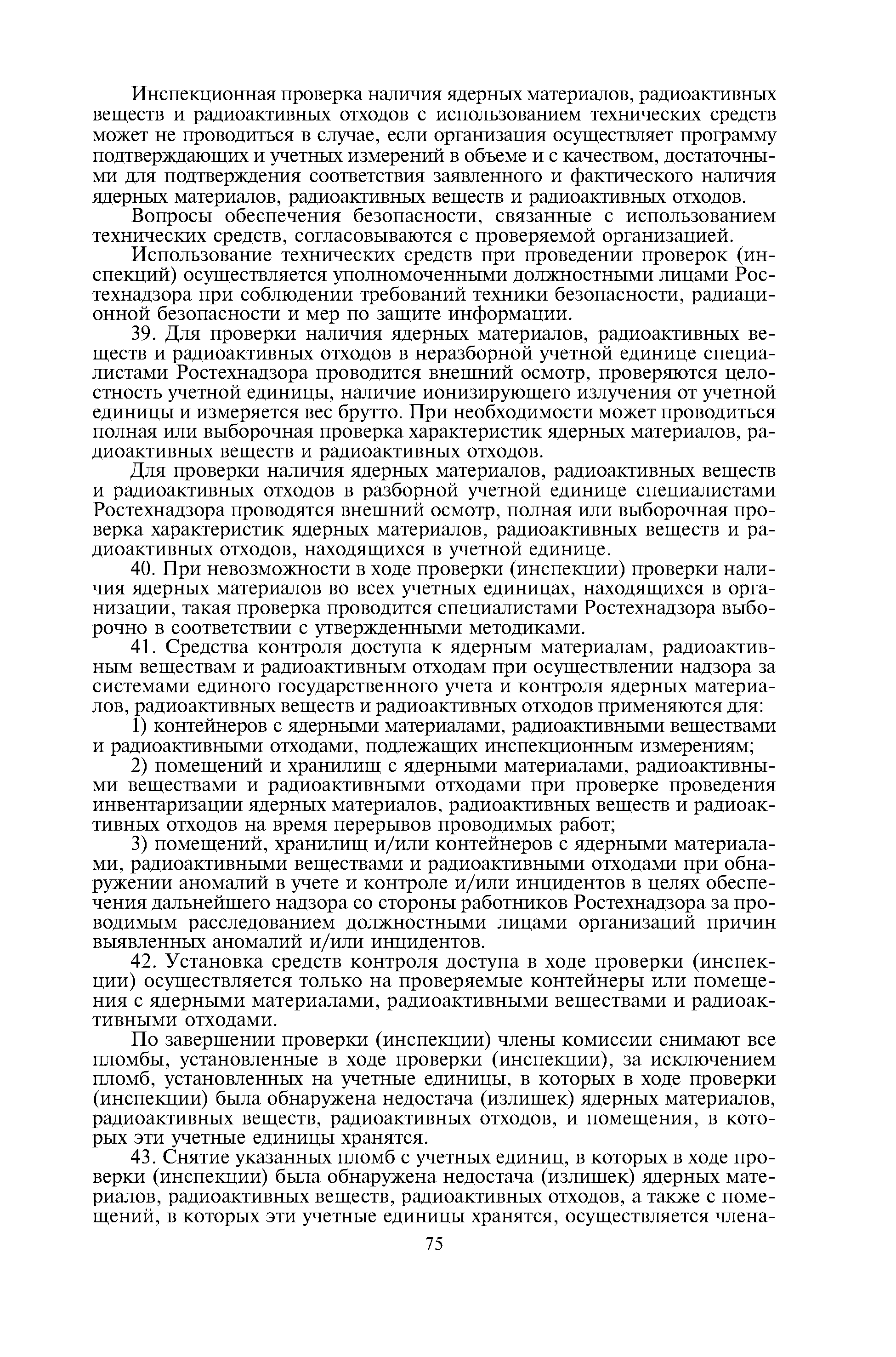 Административный регламент по исполнению Федеральной службой по экологическому, технологическому и атомному надзору государственной функции по осуществлению контроля и надзора за физической защитой ядерных установок, радиационных источников, пунктов хранения, ядерных материалов и радиоактивных веществ, за системами единого государственного учета и контроля ядерных материалов, радиоактивных веществ, радиоактивных отходов| Статус: | действует | | Название рус.: | Административный регламент по исполнению Федеральной службой по экологическому, технологическому и атомному надзору государственной функции по осуществлению контроля и надзора за физической защитой ядерных установок, радиационных источников, пунктов хранения, ядерных материалов и радиоактивных веществ, за системами единого государственного учета и контроля ядерных материалов, радиоактивных веществ, радиоактивных отходов | | Дата добавления в базу: | 01.10.2014 | | Дата актуализации: | 01.01.2021 | | Дата введения: | 24.08.2012 | | Оглавление: | I. Общие положения II. Требования к порядку исполнения государственной функции III. Состав, последовательность и сроки выполнения административных процедур (действий) IV. Порядок и формы контроля за исполнением государственной функции V. Досудебный (внесудебный) порядок обжалования решений, действий (бездействия) Ростехнадзора и его должностных лиц Приложение 1. Перечень территориальных органов Ростехнадзора Приложение 2. Блок-схема исполнения Ростехнадзором государственной функции по осуществлению контроля и надзора за физической защитой ядерных установок, радиационных источников, пунктов хранения, ядерных материалов и радиоактивных веществ, за системами единого государственного учета и контроля ядерных материалов, радиоактивных веществ, радиоактивных отходов | | Утверждён: | 15.12.2011 Федеральная служба по экологическому, технологическому и атомному надзору (703)