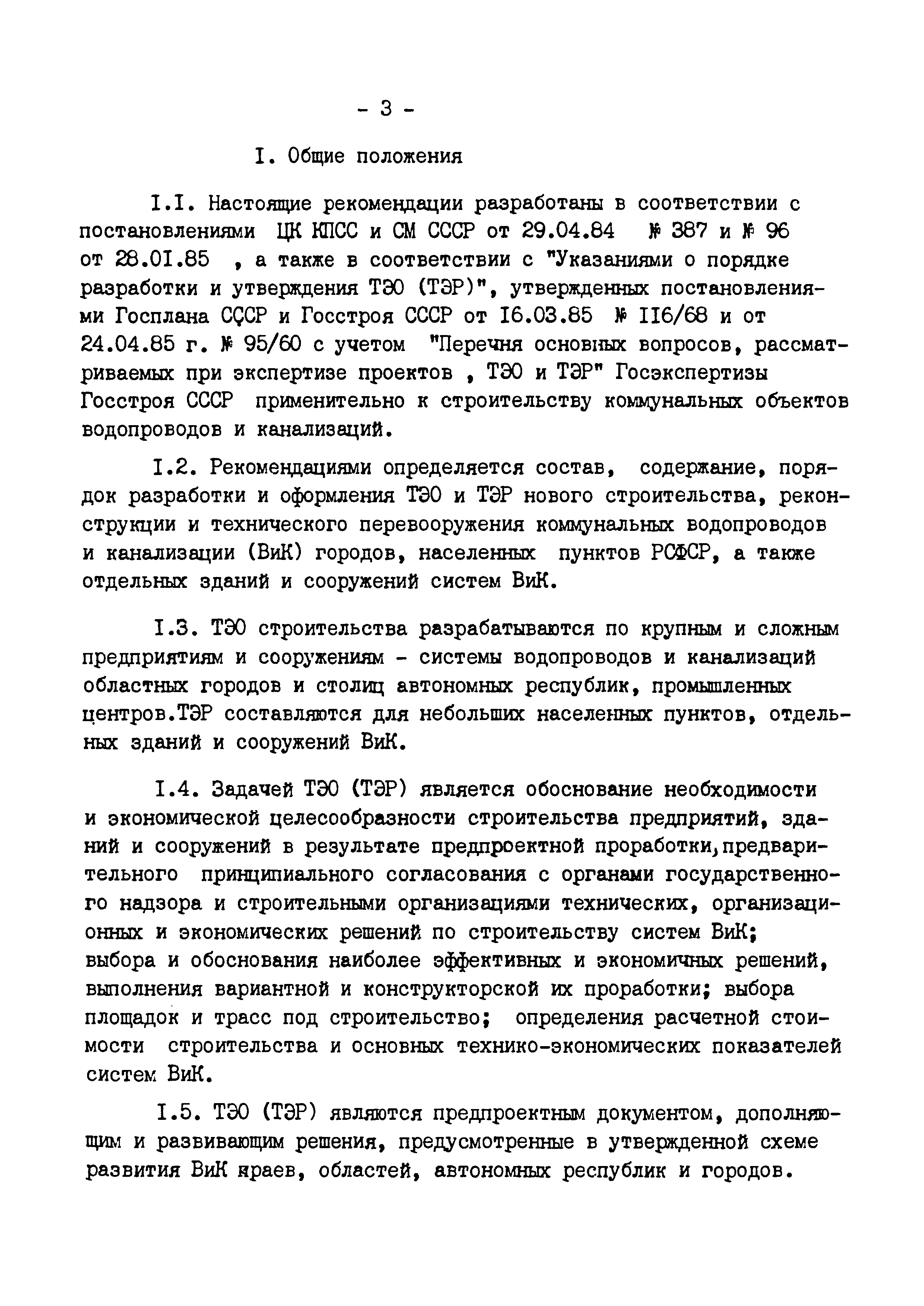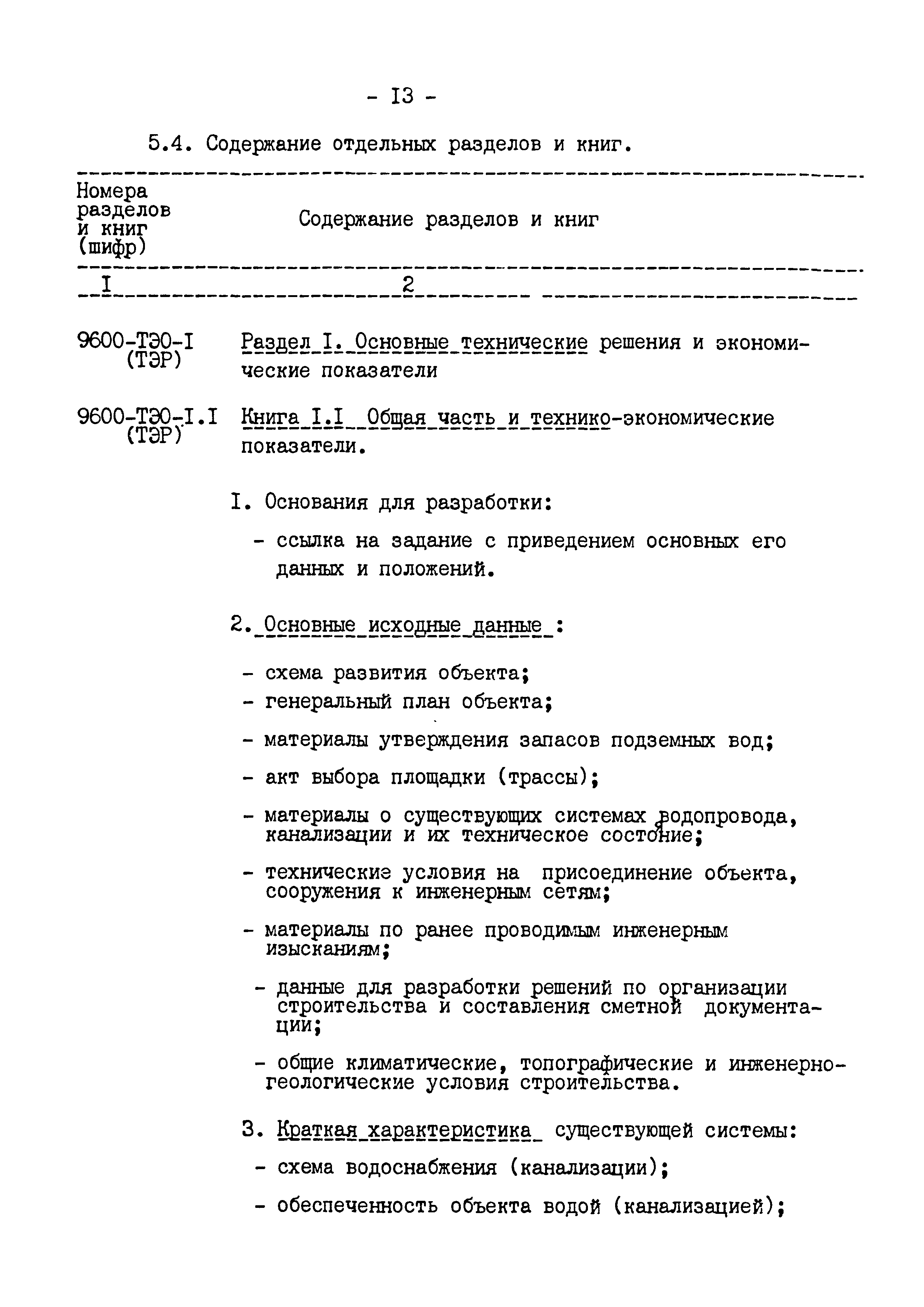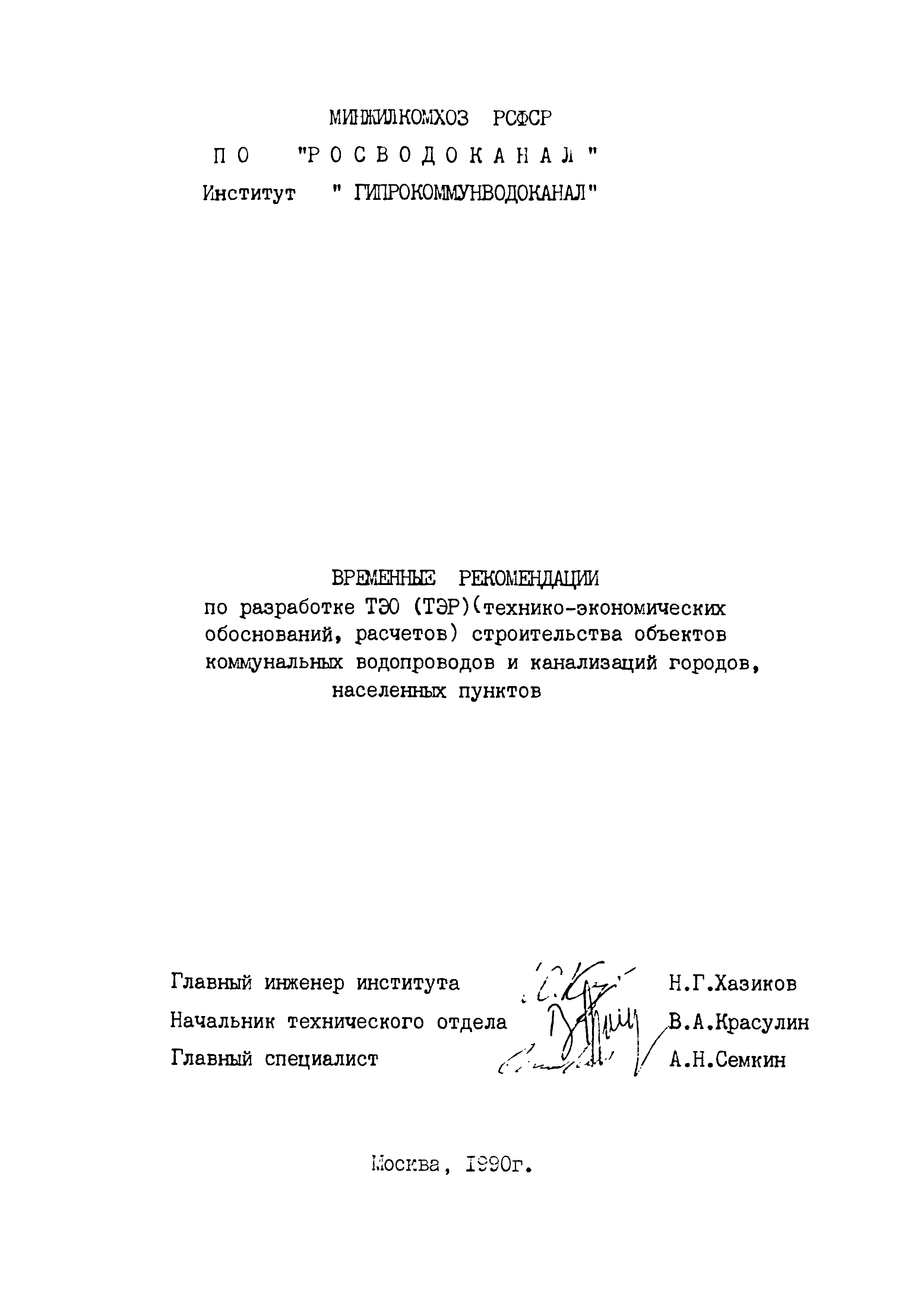 Временные рекомендации по разработке ТЭО (ТЭР) (технико-экономических обоснований, расчетов) строительства объектов коммунальных водопроводов и канализаций городов, населенных пунктов| Статус: | не установлен срок действия | | Название рус.: | Временные рекомендации по разработке ТЭО (ТЭР) (технико-экономических обоснований, расчетов) строительства объектов коммунальных водопроводов и канализаций городов, населенных пунктов | | Дата добавления в базу: | 01.10.2014 | | Дата актуализации: | 01.01.2021 | | Область применения: | Рекомендациями определяется состав, содержание, порядок разработки и оформления ТЭО и ТЭР нового строительства, реконструкции и технического перевооружения коммунальных водопроводов и канализации (ВиК) городов, населенных пунктов РСФСР, а также отдельных зданий и сооружений систем ВиК. | | Оглавление: | 1. Общие положения 2. Основные вопросы. рассматриваемые в ТЭО (ТЭР) 2.1 Общие вопросы 2.2 Основные технические решения и экономические показатели 2.3 Технология производства 2.4 Генеральный план и транспорт 2.5 Архитектурно-строительные решения 2.6 Охрана окружающей среды 2.7 Стоимость строительства 3. Состав ТЭО (ТЭР) 4. Состав и обозначения разделов и книг ТЭО (ТЭР) 5. Содержание ТЭО (ТЭР) | | Разработан: | Институт Гипрокоммунводоканал