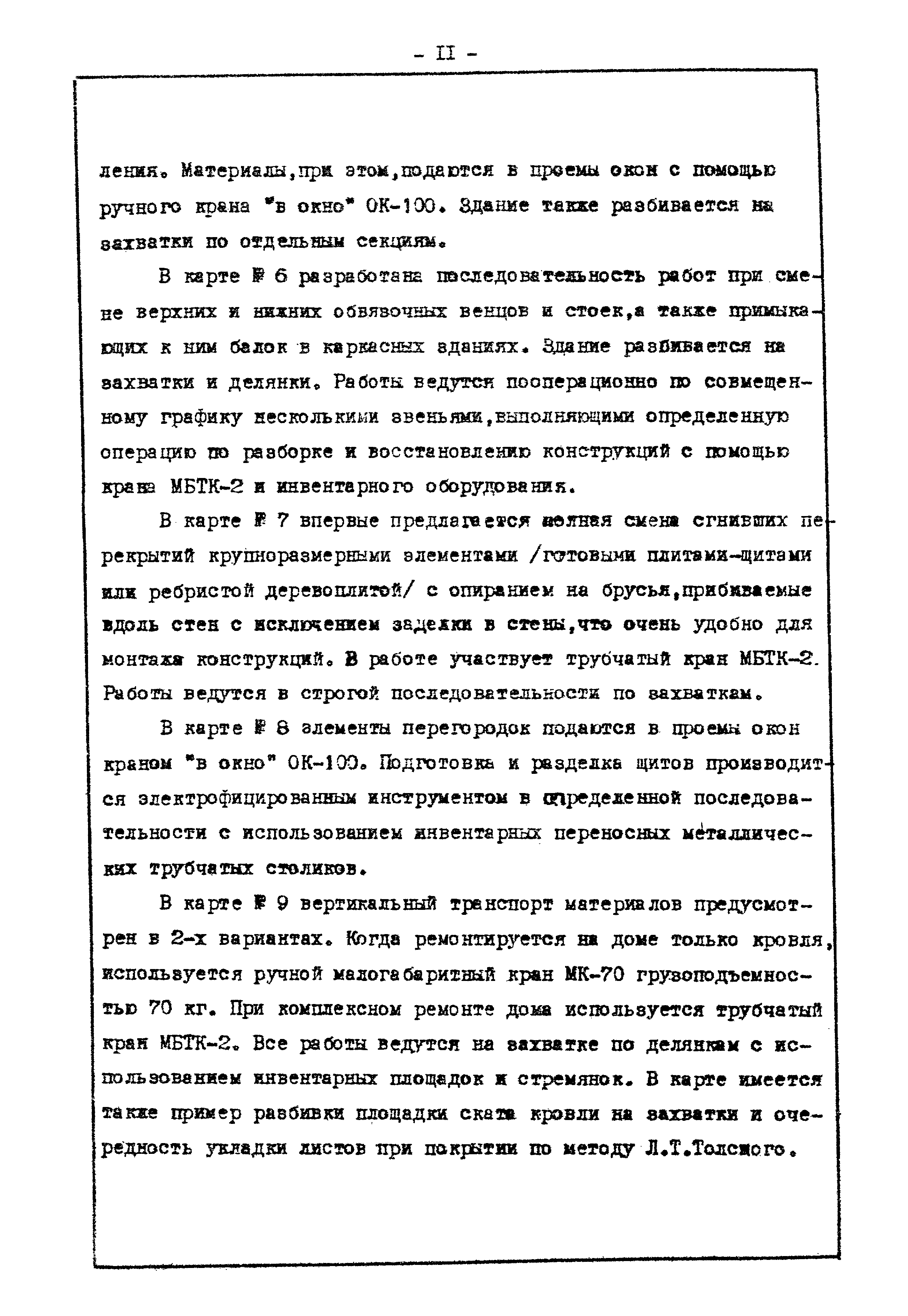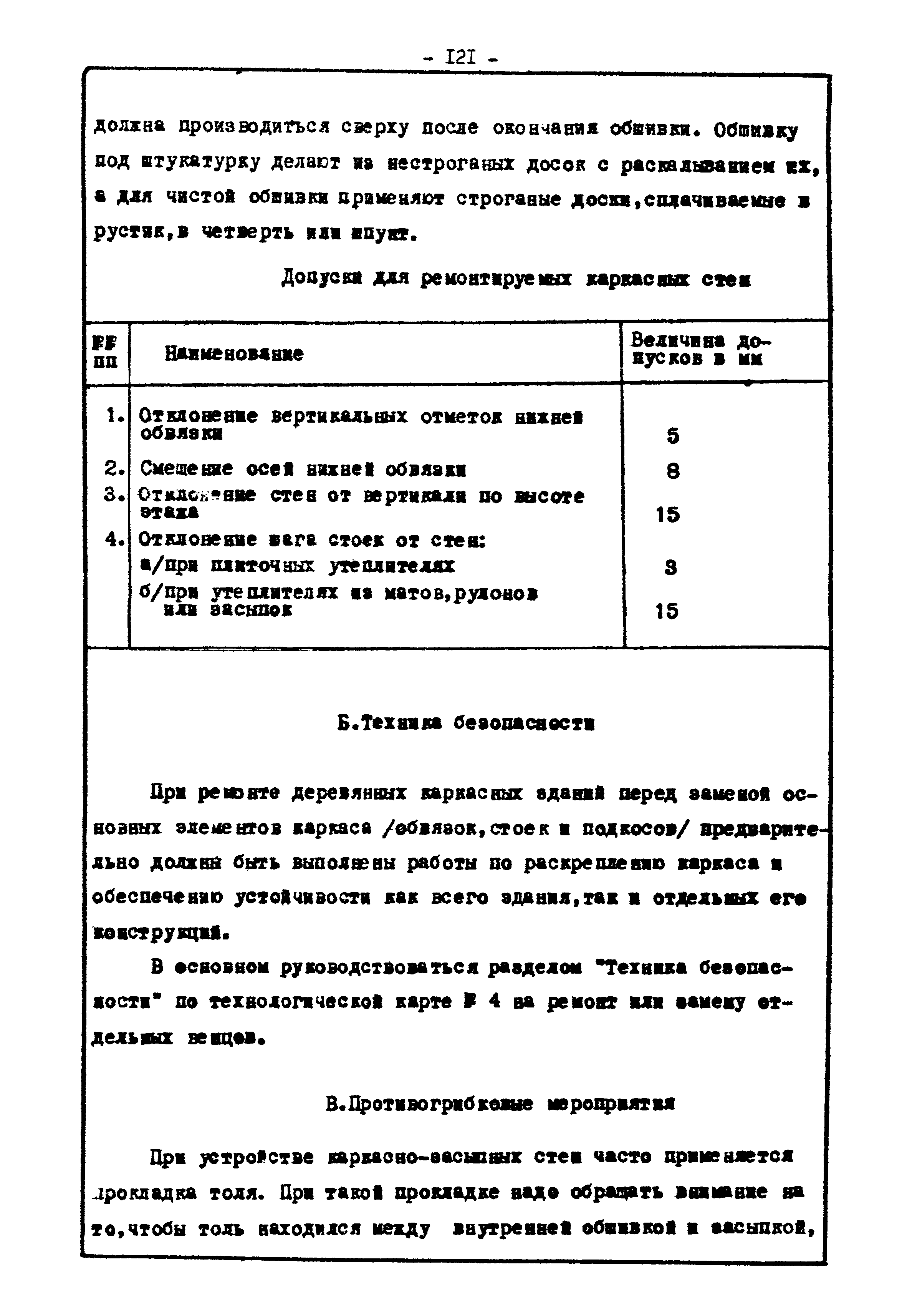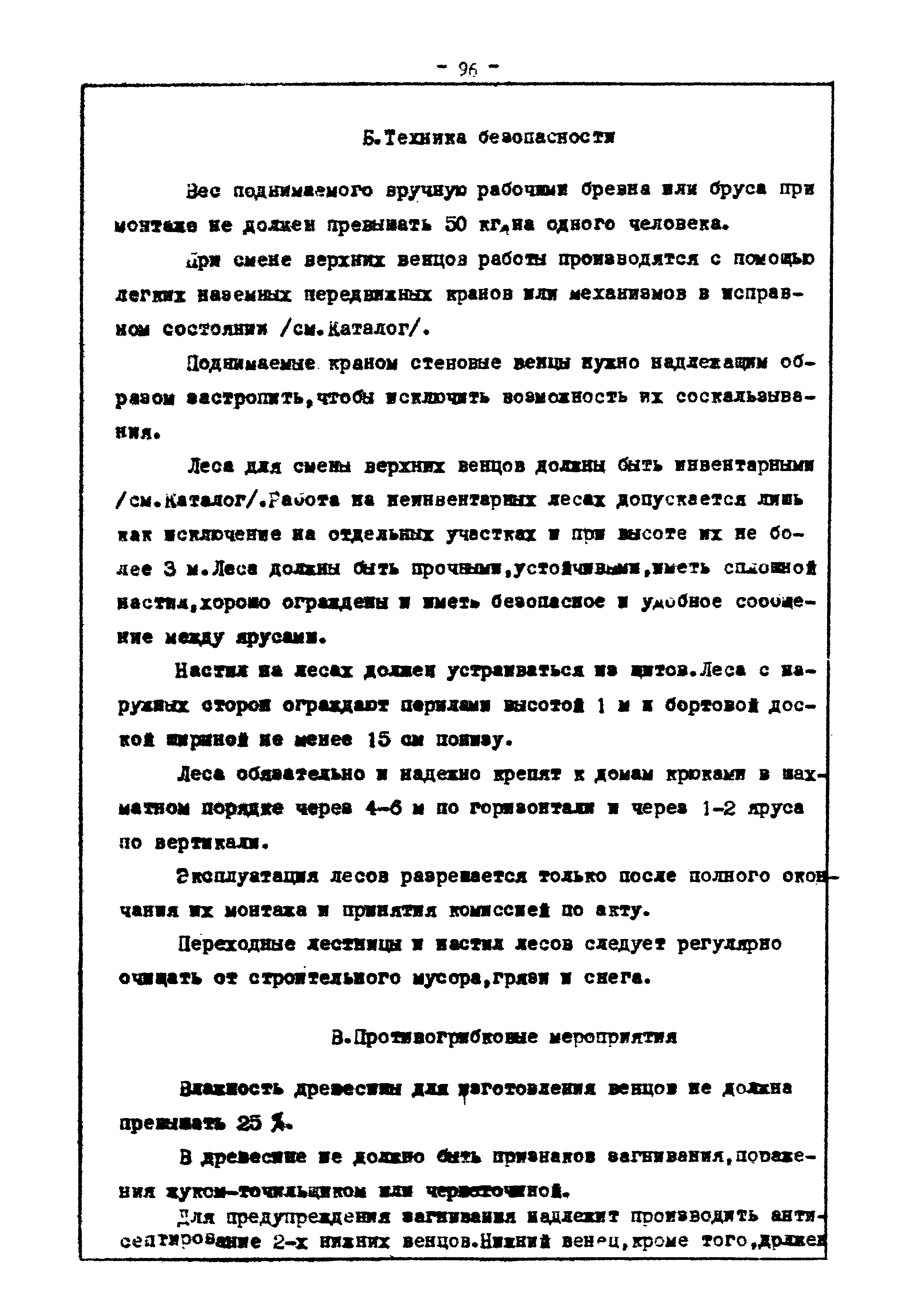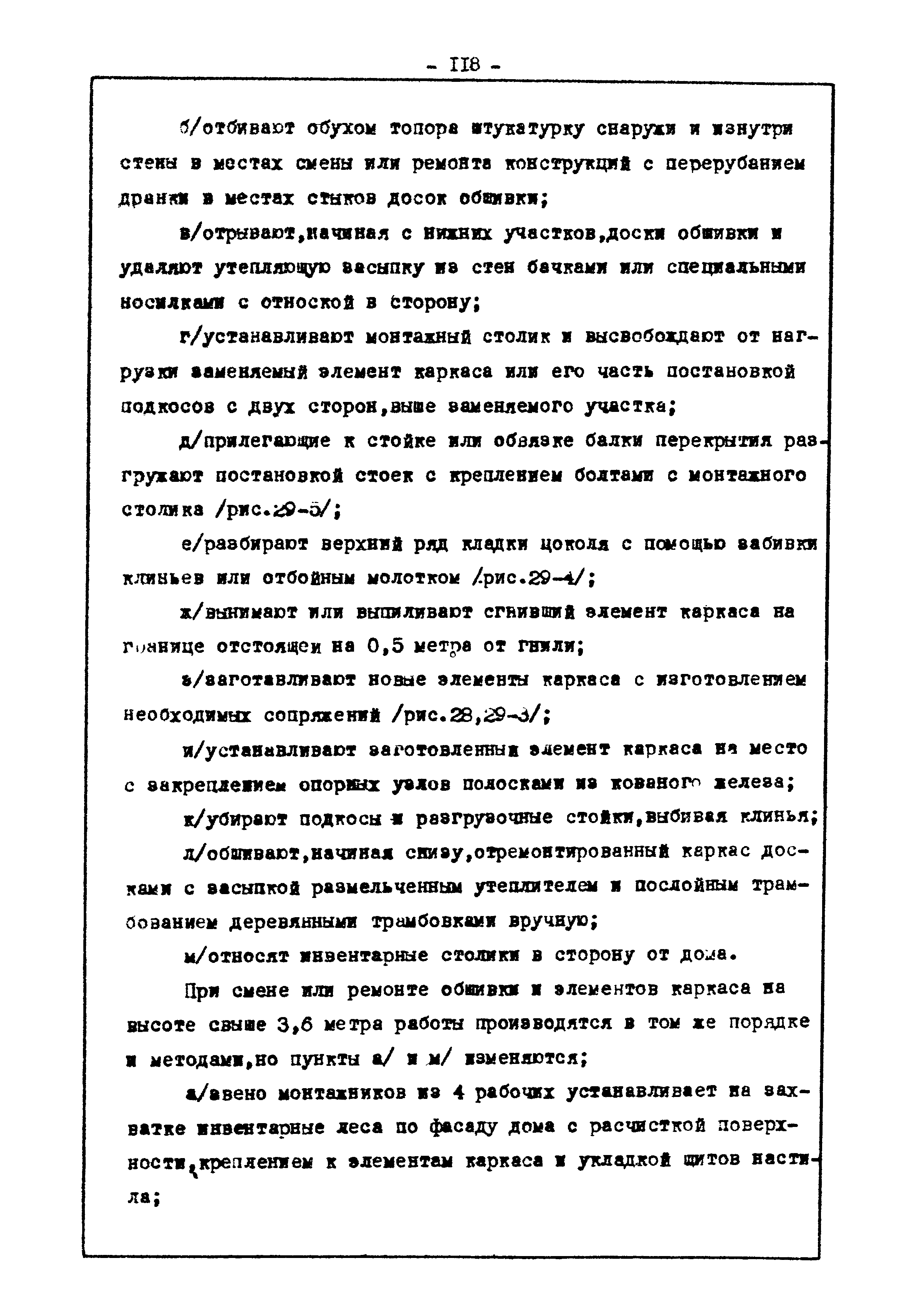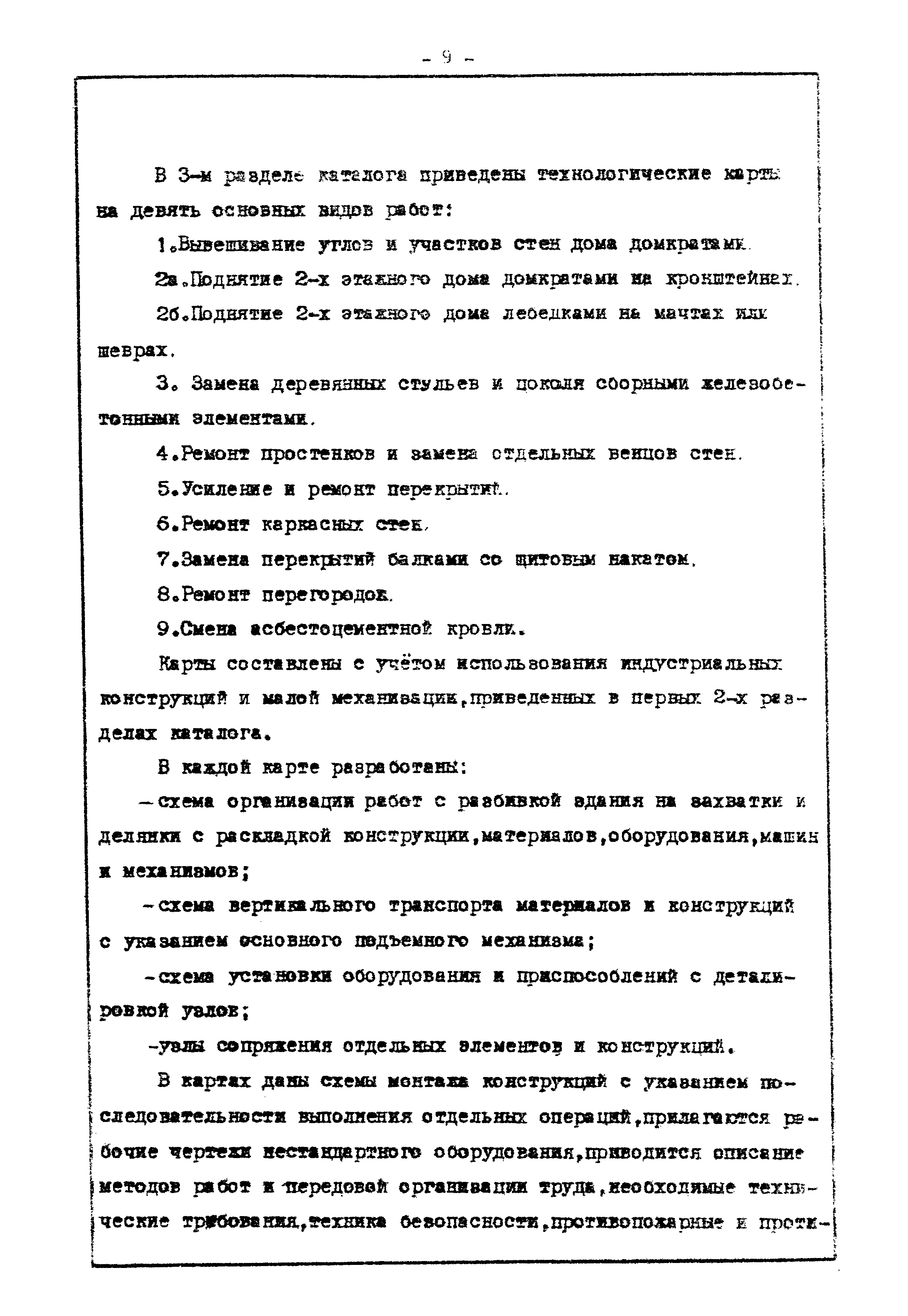 Каталог индустриальных конструкций, машин, механизмов и технологические карты для капитального ремонта деревянных жилых домов| Статус: | справочные материалы, мп, тпр | | Название рус.: | Каталог индустриальных конструкций, машин, механизмов и технологические карты для капитального ремонта деревянных жилых домов | | Дата добавления в базу: | 01.10.2014 | | Дата актуализации: | 01.01.2021 | | Область применения: | Каталог содержит индустриальные конструкции, рекомендуемые для ремонта: фундаментов и цоколя (как в обычных условиях, так и в грунтах, подверженных морозному пучению), стен, перекрытий и перегородок. Во втором разделе приведены машины, механизмы, приспособления и инструмент необходимые для механизации: земляных работ, вывешивания и поднимания домов, вертикального транспорта, погрузо-разгрузочных, плотнично-столярных и отделочных работ. | | Оглавление: | Пояснительная записка 1. Индустриальные конструкции и детали 1.1 Фундаменты и цоколь 1.2 Стены 1.3 Перекрытия 1.4 Перегородки 2. Машины, механизмы, приспособления и инструмент 2.1 Машины для земляных работ. 2.2 Приспособления для вывешивания и поднимания домов 2.3 Машины и механизмы для вертикального транспорта 2.4 Погрузочно-разгрузочная и транспортная машина 2.5 Станки и инструмент для плотнично-столярных работ 2.6 Механизмы и инструмент для отделочных работ 2.7 Леса и подмости . 3. Технологические карты 3.1 Вывешивание углов и участков стен дома домкратами 3.2а Поднятие 2х этажного дома домкратами на кронштейнах 3.2б Поднятие 2х этажного дома лебедками на мачтах или шеврах 3.3 Замена деревянных стульев и цоколя сборными железобетонными элементами 3.4 Ремонт простенков, и замена отдельных венцов стен 3.5 Усиление и ремонт перекрытий 3.6 Ремонт каркасных стен 3.7 Замена перекрытий балками со щитовым канатом 3.8 Ремонт перегородок 3.9 Смена асбестоцементной кровли Приложение 1. Расчет конструкций Приложение 2. Требования к древесине Приложение 3. Антисептики, антипирены, инсектициды Приложение 4. Пример диспетчеризации связи на ремонте деревянных домов в Свердловском РСТ Литература | | Разработан: | Академия коммунального хозяйства им. К.Д. Памфилова Минжилкомхоза РСФСР Уральский научно-исследовательский институт АКХ