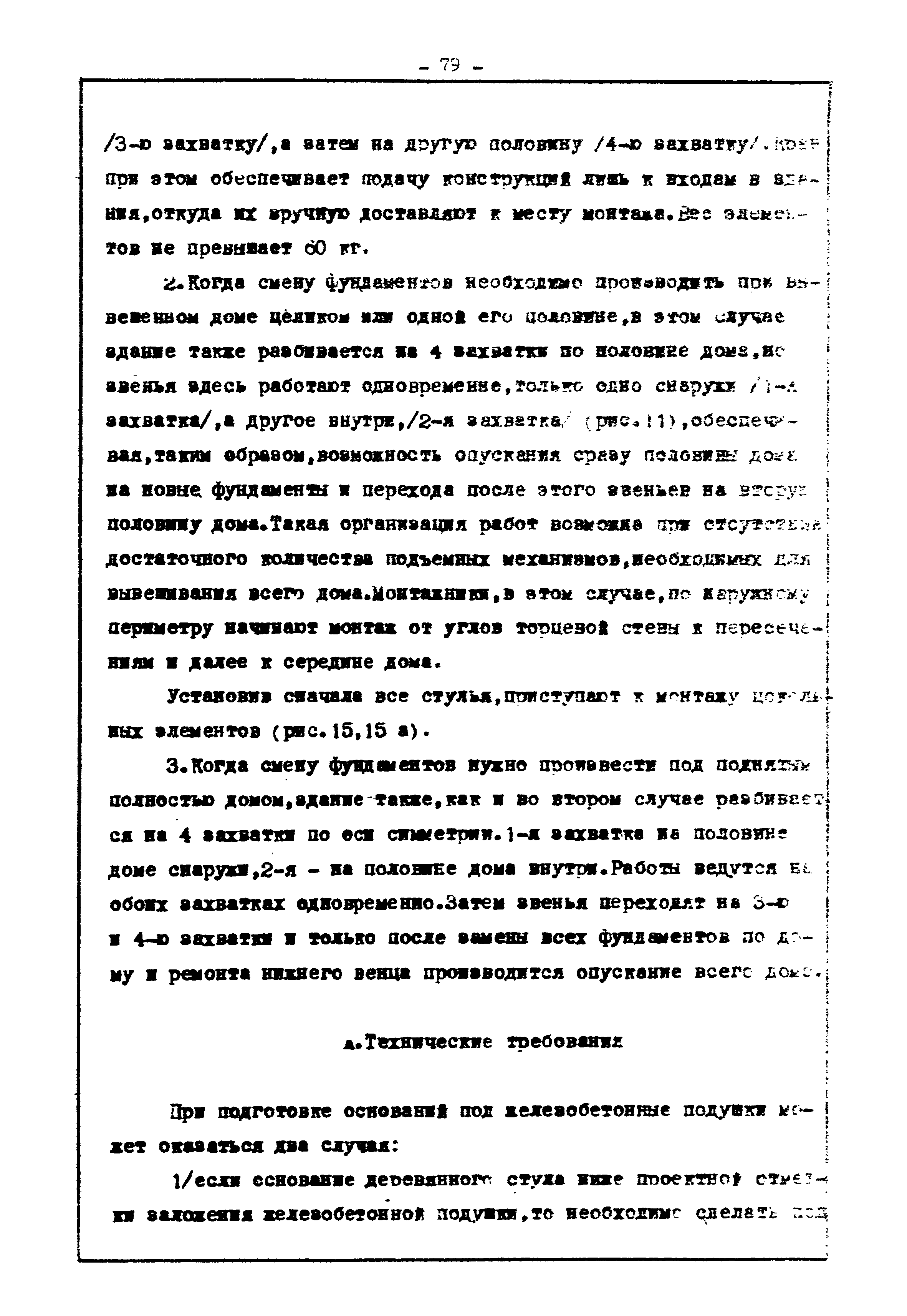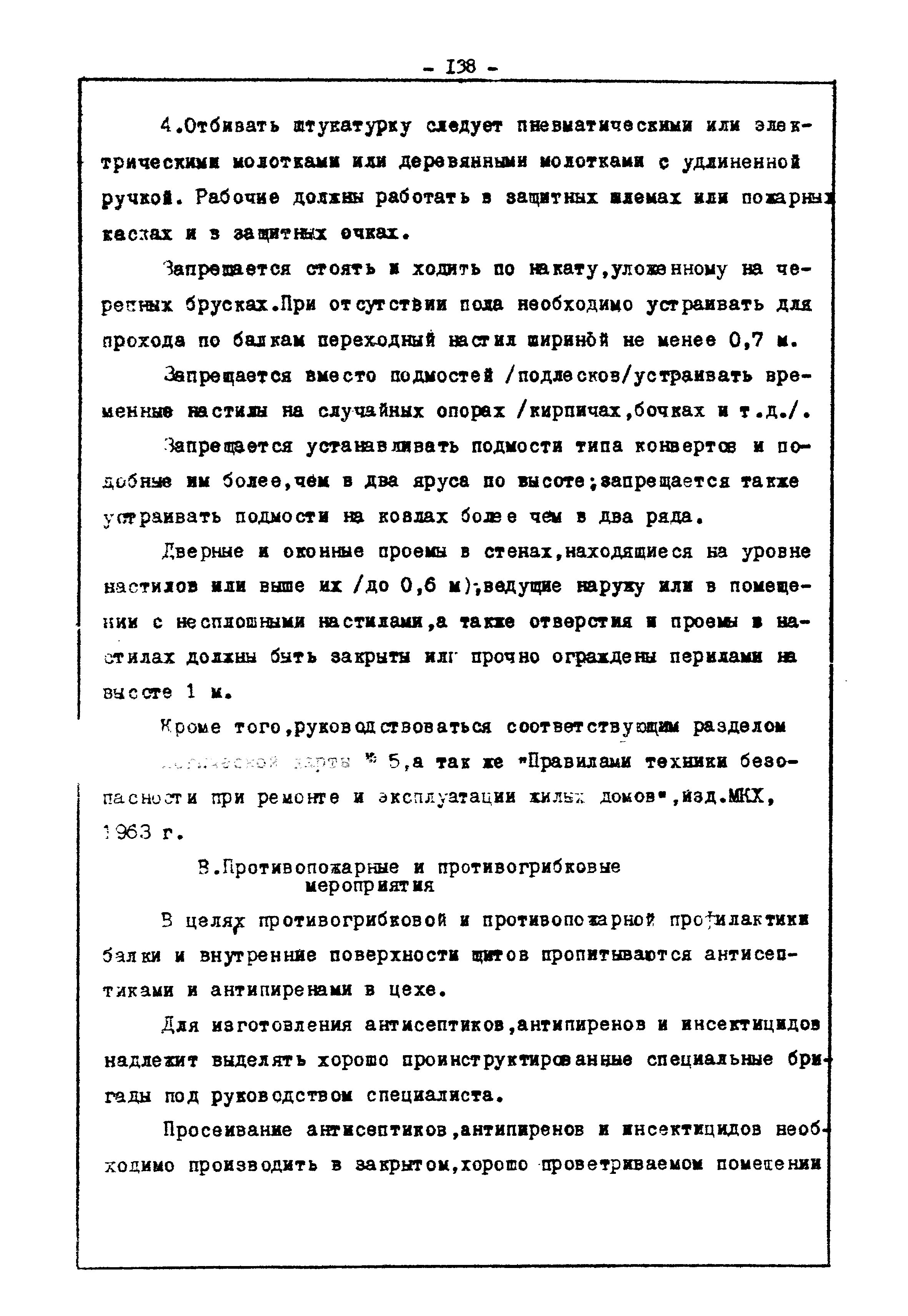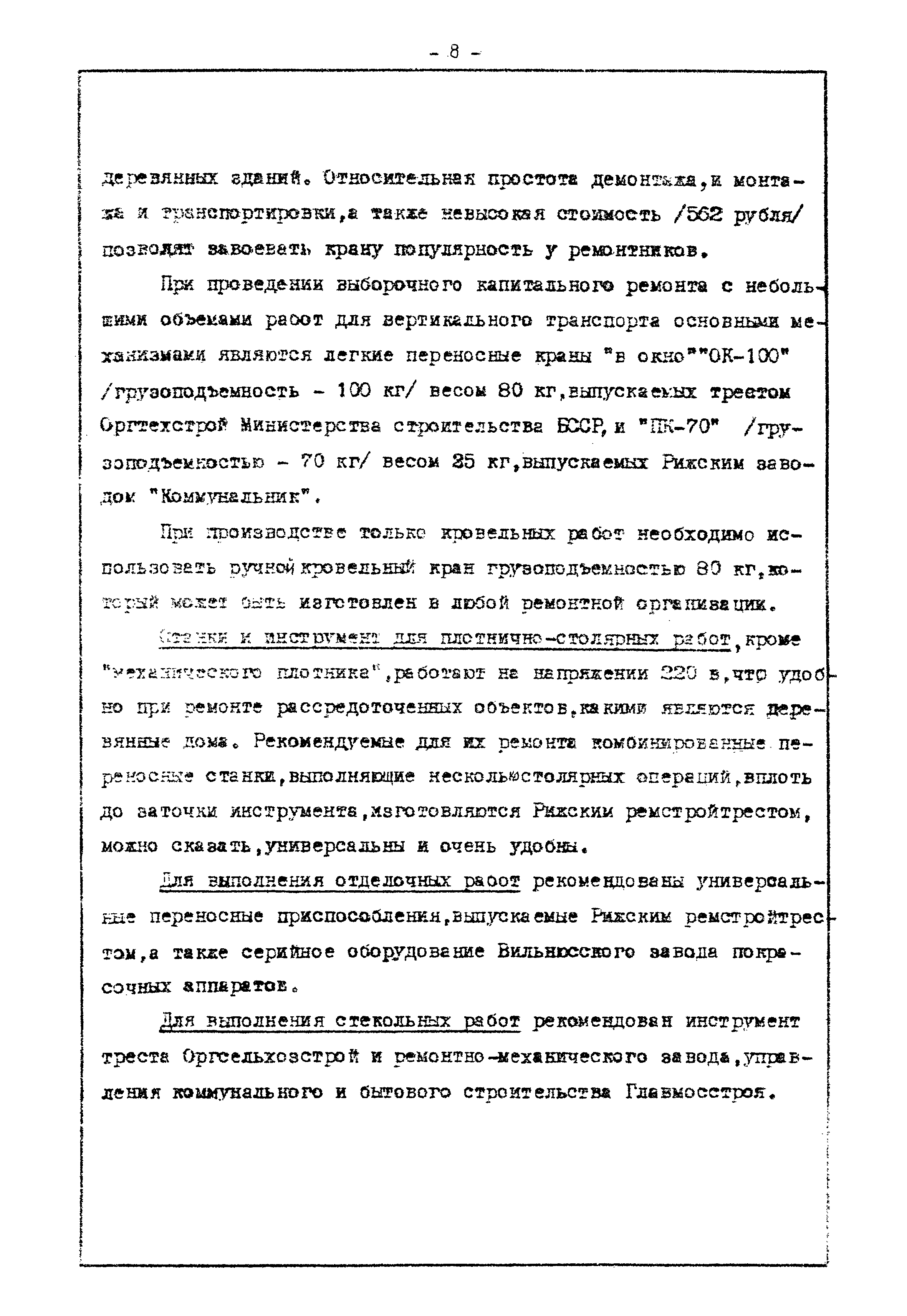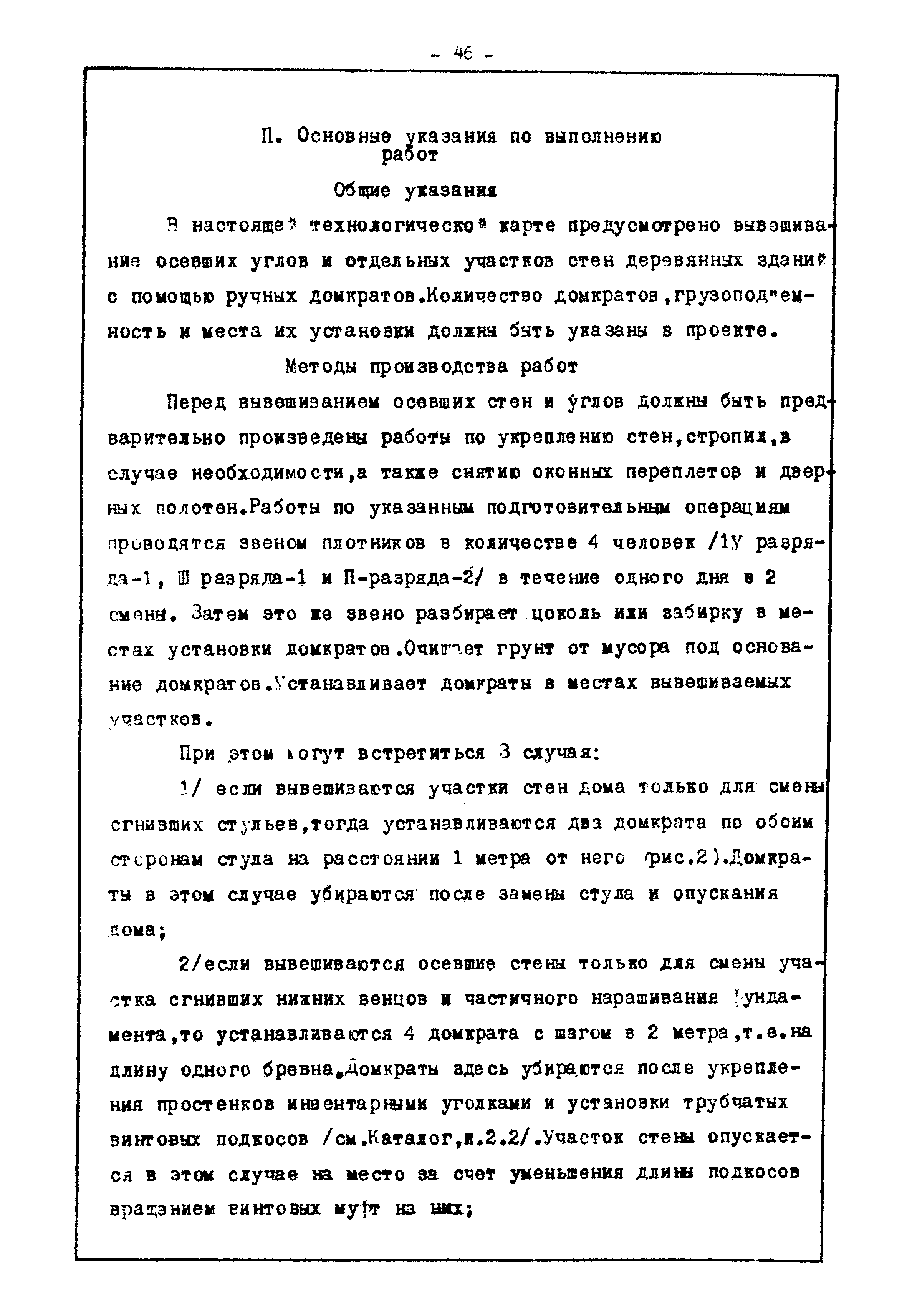 Каталог индустриальных конструкций, машин, механизмов и технологические карты для капитального ремонта деревянных жилых домов| Статус: | справочные материалы, мп, тпр | | Название рус.: | Каталог индустриальных конструкций, машин, механизмов и технологические карты для капитального ремонта деревянных жилых домов | | Дата добавления в базу: | 01.10.2014 | | Дата актуализации: | 01.01.2021 | | Область применения: | Каталог содержит индустриальные конструкции, рекомендуемые для ремонта: фундаментов и цоколя (как в обычных условиях, так и в грунтах, подверженных морозному пучению), стен, перекрытий и перегородок. Во втором разделе приведены машины, механизмы, приспособления и инструмент необходимые для механизации: земляных работ, вывешивания и поднимания домов, вертикального транспорта, погрузо-разгрузочных, плотнично-столярных и отделочных работ. | | Оглавление: | Пояснительная записка 1. Индустриальные конструкции и детали 1.1 Фундаменты и цоколь 1.2 Стены 1.3 Перекрытия 1.4 Перегородки 2. Машины, механизмы, приспособления и инструмент 2.1 Машины для земляных работ. 2.2 Приспособления для вывешивания и поднимания домов 2.3 Машины и механизмы для вертикального транспорта 2.4 Погрузочно-разгрузочная и транспортная машина 2.5 Станки и инструмент для плотнично-столярных работ 2.6 Механизмы и инструмент для отделочных работ 2.7 Леса и подмости . 3. Технологические карты 3.1 Вывешивание углов и участков стен дома домкратами 3.2а Поднятие 2х этажного дома домкратами на кронштейнах 3.2б Поднятие 2х этажного дома лебедками на мачтах или шеврах 3.3 Замена деревянных стульев и цоколя сборными железобетонными элементами 3.4 Ремонт простенков, и замена отдельных венцов стен 3.5 Усиление и ремонт перекрытий 3.6 Ремонт каркасных стен 3.7 Замена перекрытий балками со щитовым канатом 3.8 Ремонт перегородок 3.9 Смена асбестоцементной кровли Приложение 1. Расчет конструкций Приложение 2. Требования к древесине Приложение 3. Антисептики, антипирены, инсектициды Приложение 4. Пример диспетчеризации связи на ремонте деревянных домов в Свердловском РСТ Литература | | Разработан: | Академия коммунального хозяйства им. К.Д. Памфилова Минжилкомхоза РСФСР Уральский научно-исследовательский институт АКХ