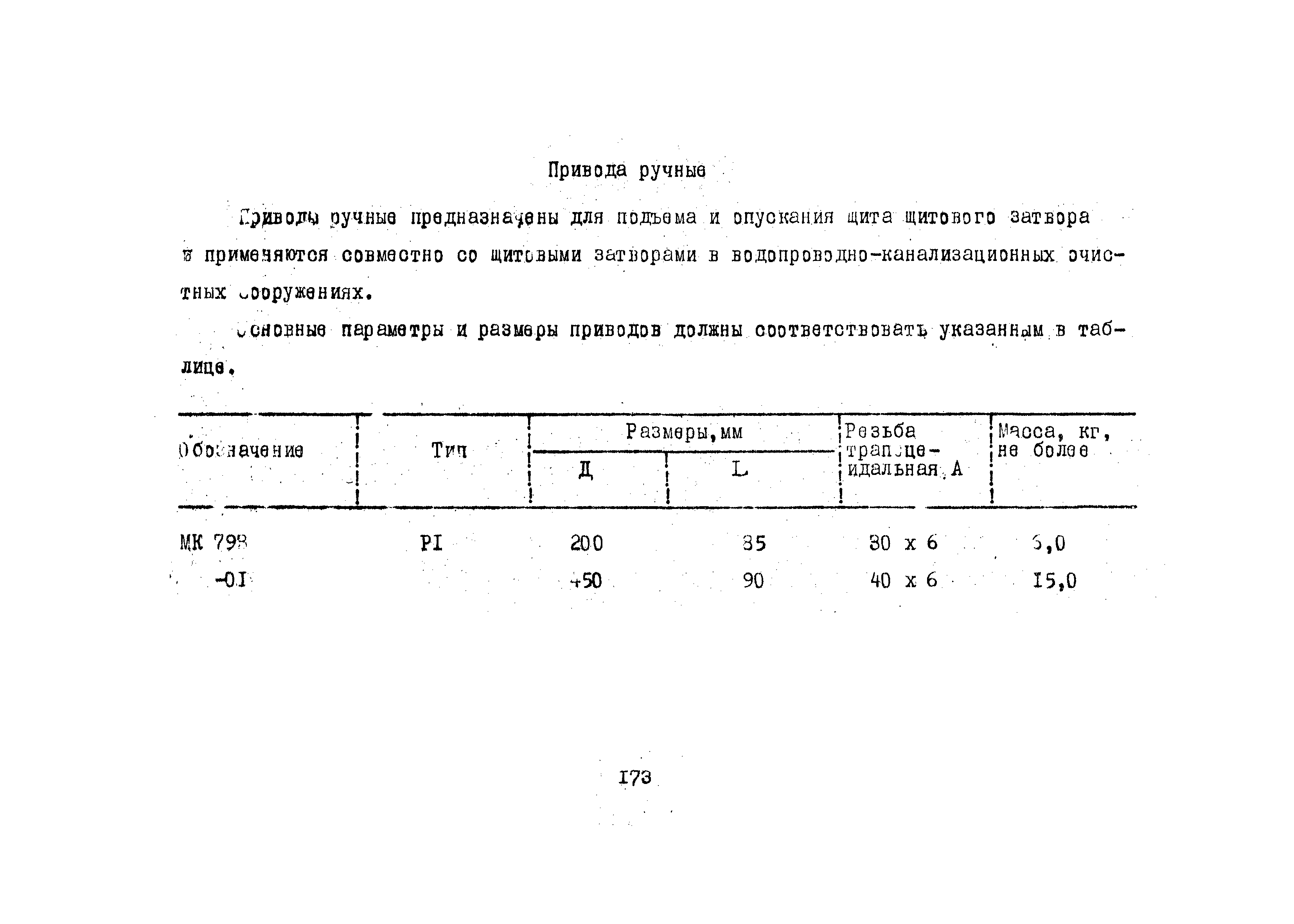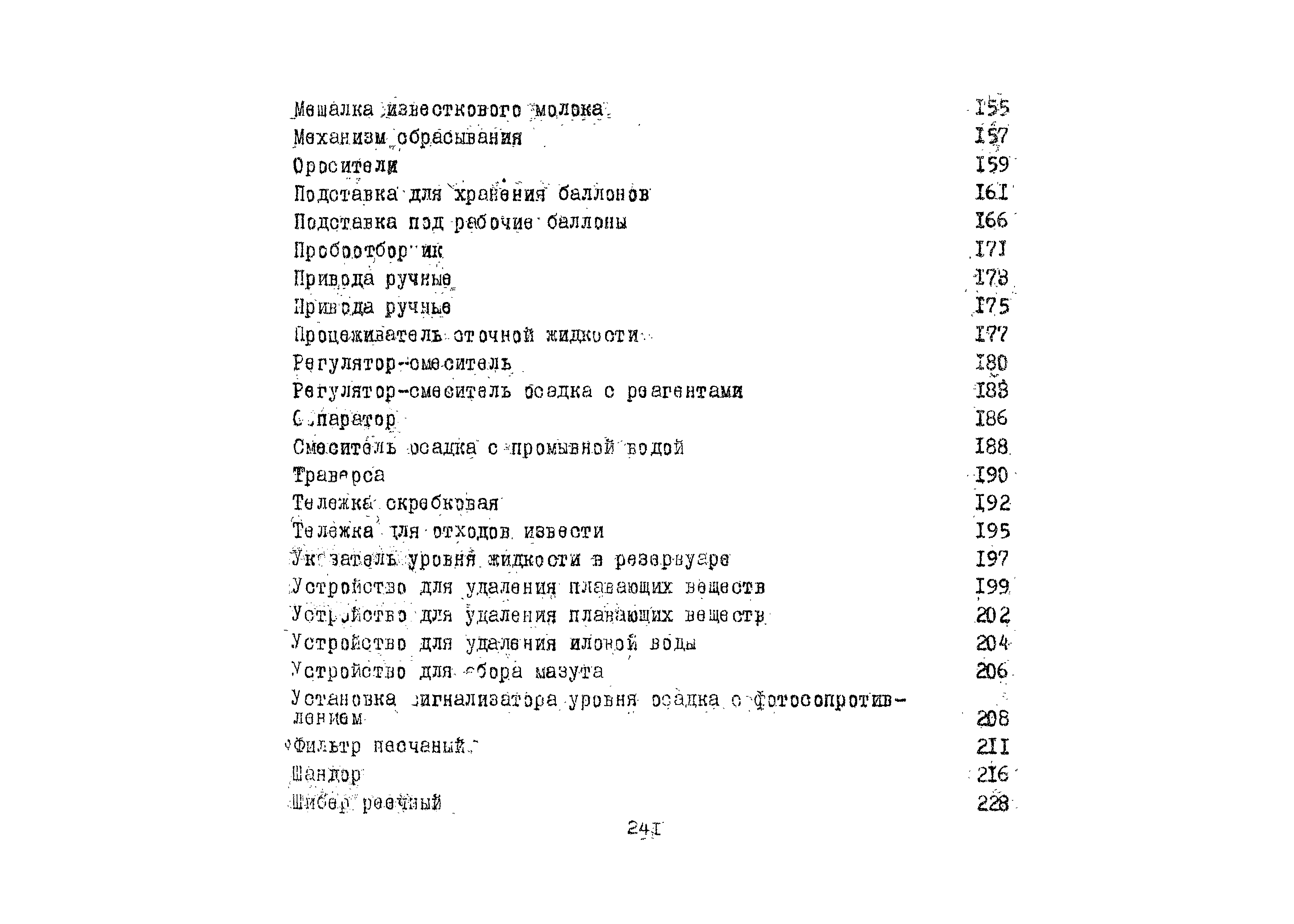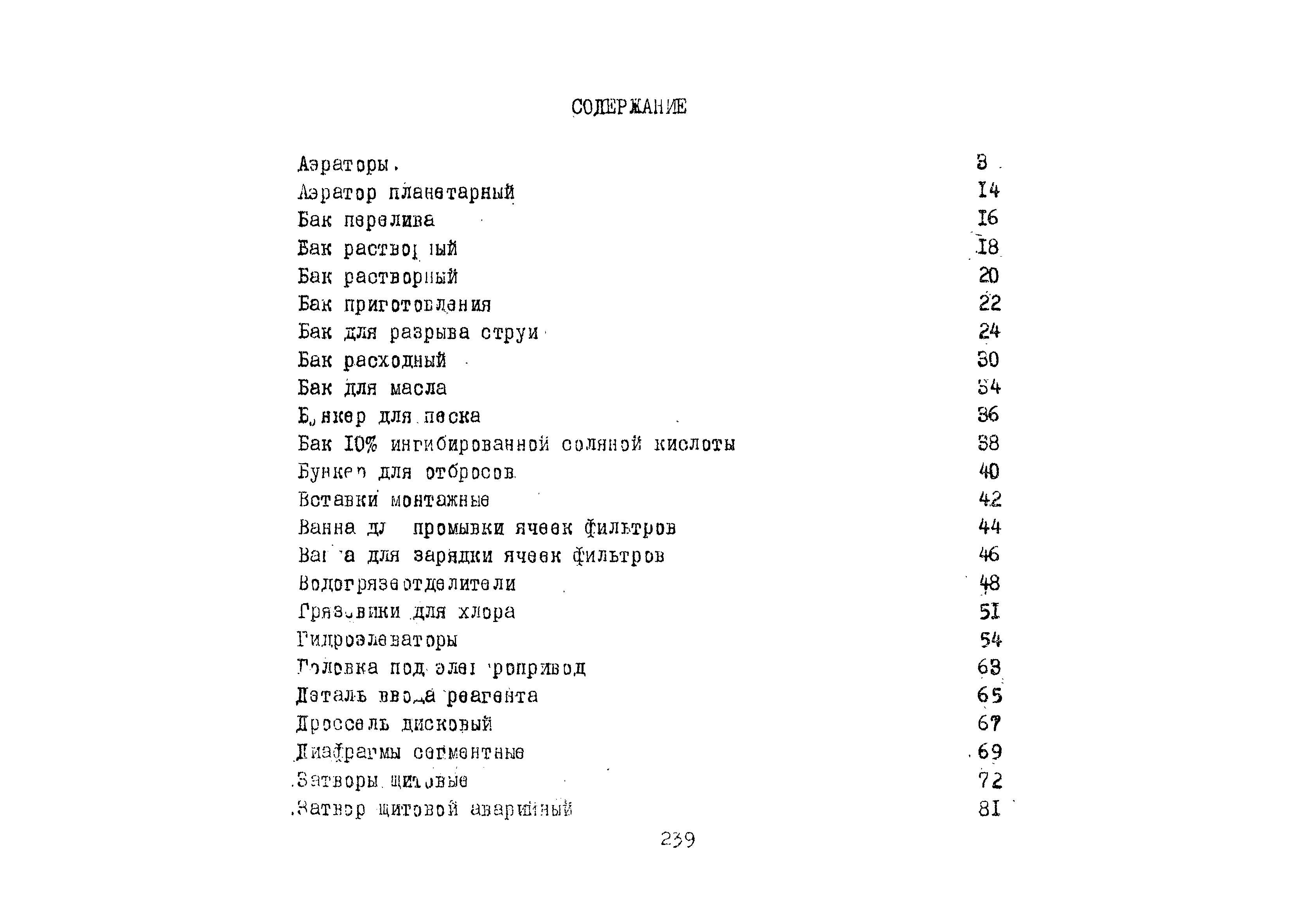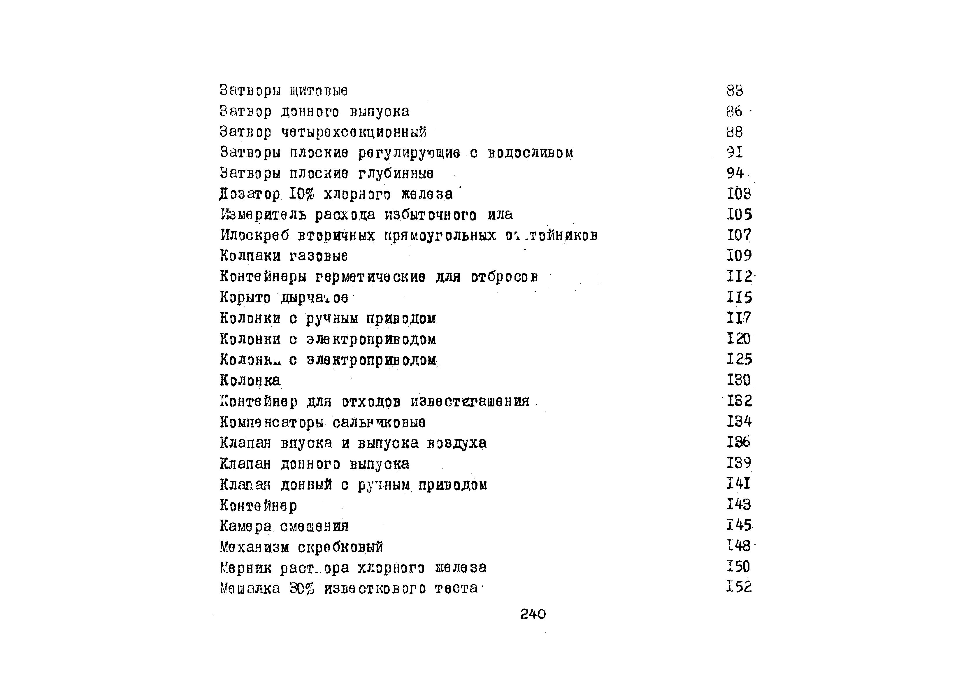 | Оглавление: | Аэраторы Аэратор планетарный Бак перелива Бак растворный Баr приготовления Бак для разрыва струи Бак расходный Бак для масла Бункер для песка Бак 10% ингибированной соляной кислоты Бункер для отбросов Вставки монтажные Ванна для промывки ячеек фильтров Ванна для зарядки ячеек фильтров Водогрязеотделители Грязевики для хлора Гидроэлеваторы Головка под электропривод Деталь ввода реагента Дроссель дисковый Диафрагмы сегментные Затворы щитовые Затвор щитовой аварийный Затворы щитовые Затвор донного выпуска Затвор четырехсекционный Затворы плоские регулирующие .с водосливом Затворы плоские глубинные Дозатор 10% хлорного железа Измеритель расхода избыточного ила Илоскреб вторичных прямоугольных отстойников Колпаки газовые Контейнеры герметические для отбросов ‘ Корыто дырчатое Колонки с ручным приводом Колонки с электроприводом Колонка Контейнер для отходов известогашения Компенсаторы сальниковые Клапан впуска и выпуска воздуха Клапан донного выпуска Клапан донный с ручным приводом Контейнер Камера смешения Механизм скребковый Мерник раствора хлорного железа Мешалка 30 % известкового теста Мешалка известкового молока Механизм сбрасывания Оросители Подставка для хранения баллонов Подставка под рабочие баллоны Пробоотборник Привода ручные Процеживатель сточной жидкости Регулятор-смеситель Регулятор-смеситель осадка с реагентами Сепаратор Смеситель осадка с промывной водой Траверса Тележка скребковая Тележка для отходов извести Указатель уровня жидкости в резервуаре Устройство для удаления плавающих веществ Устройство для удаления илоной воды Устройство для отбора мазута Установка сигнализатора уровня осадка с фотосопротивлением Фильтр песчаный Шандор Шибер реечный Эрлифт Электропривод специальный |