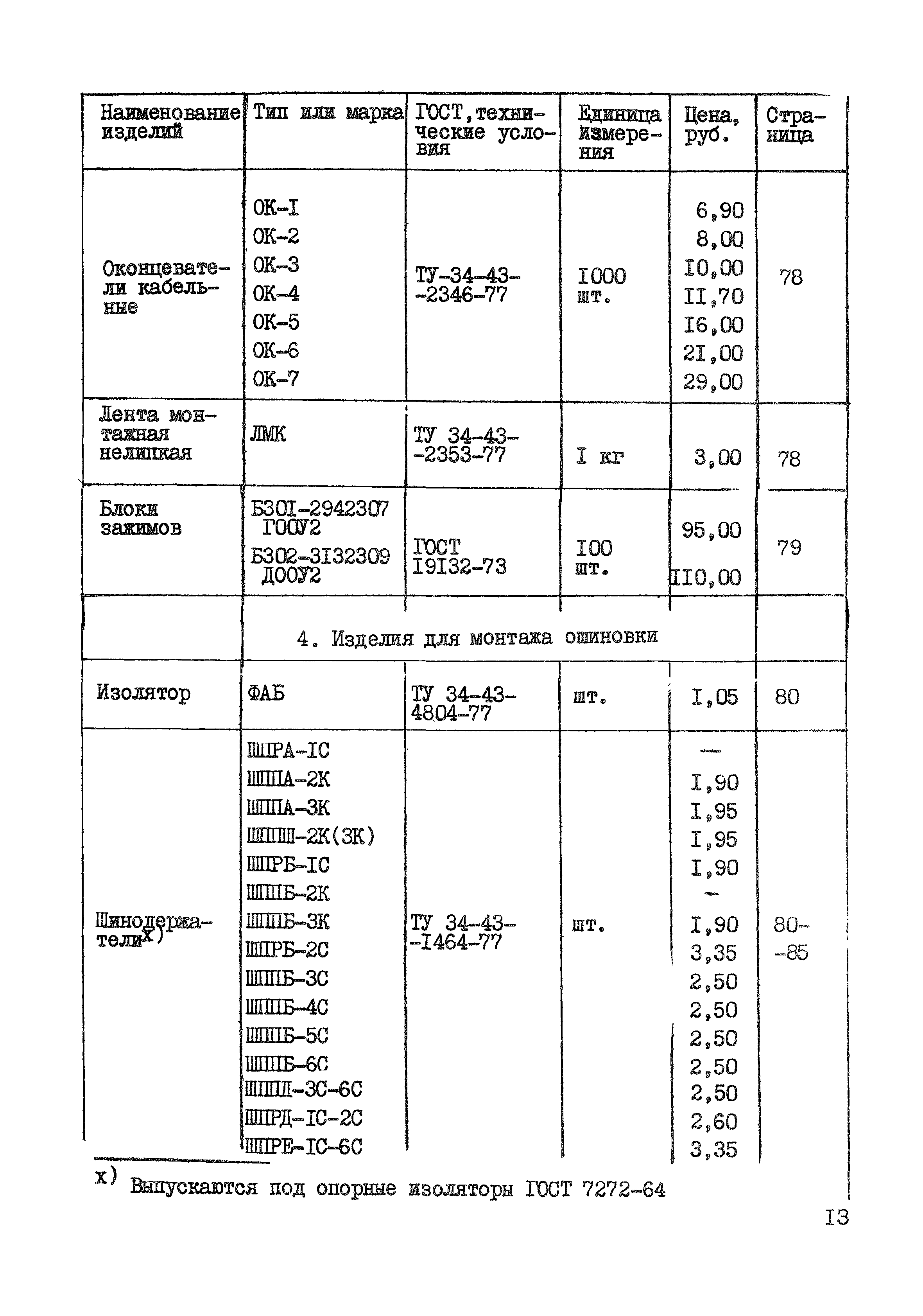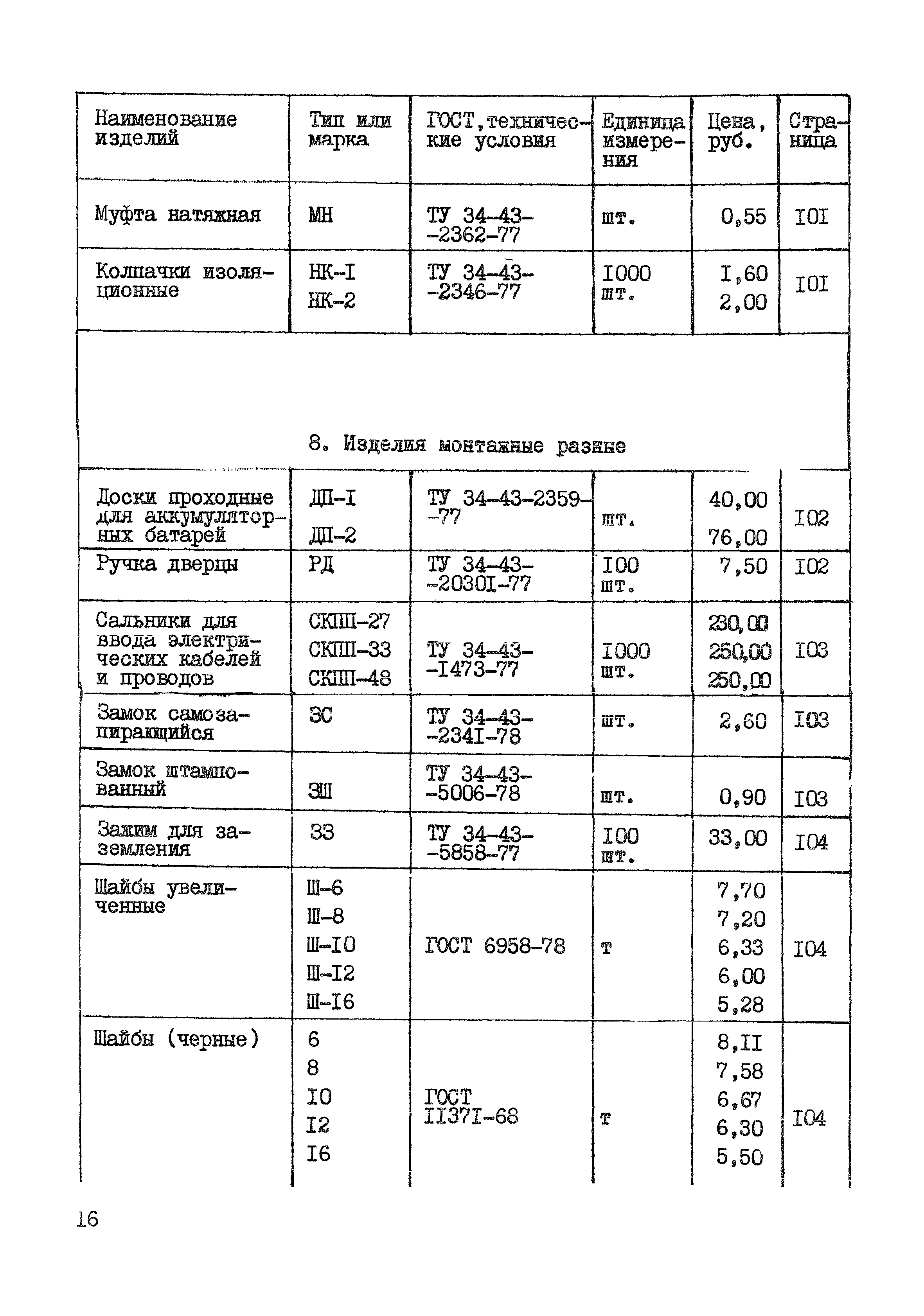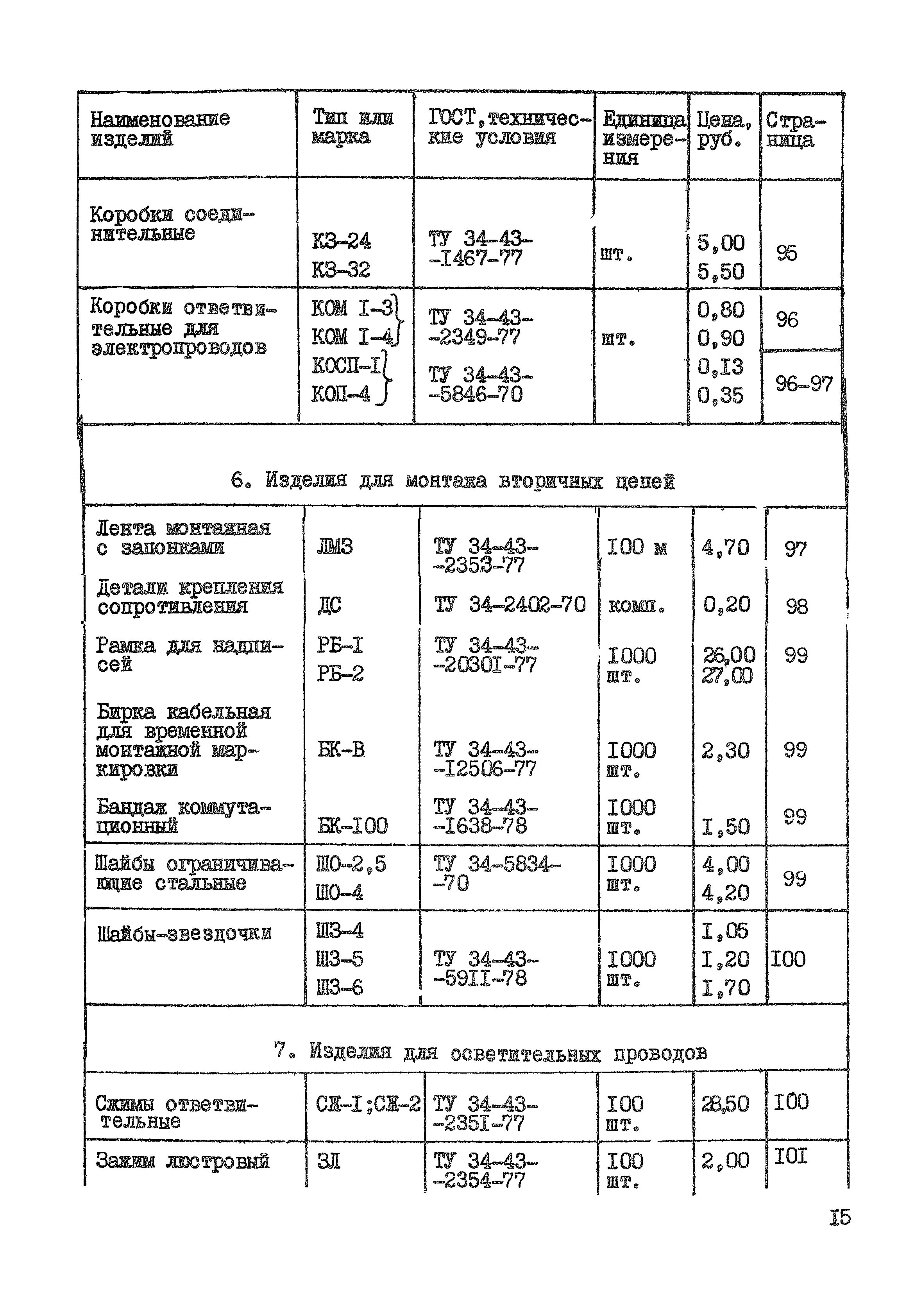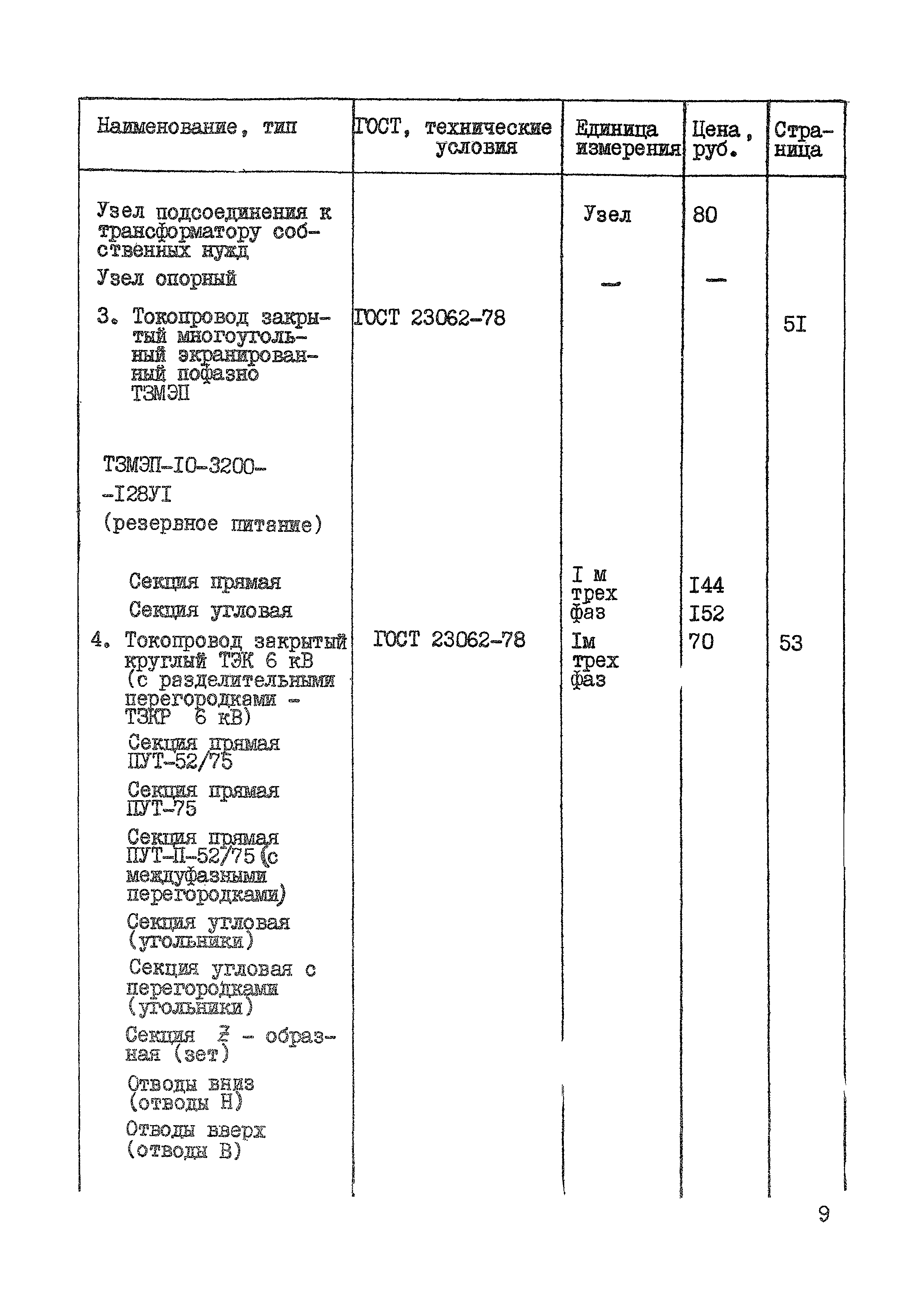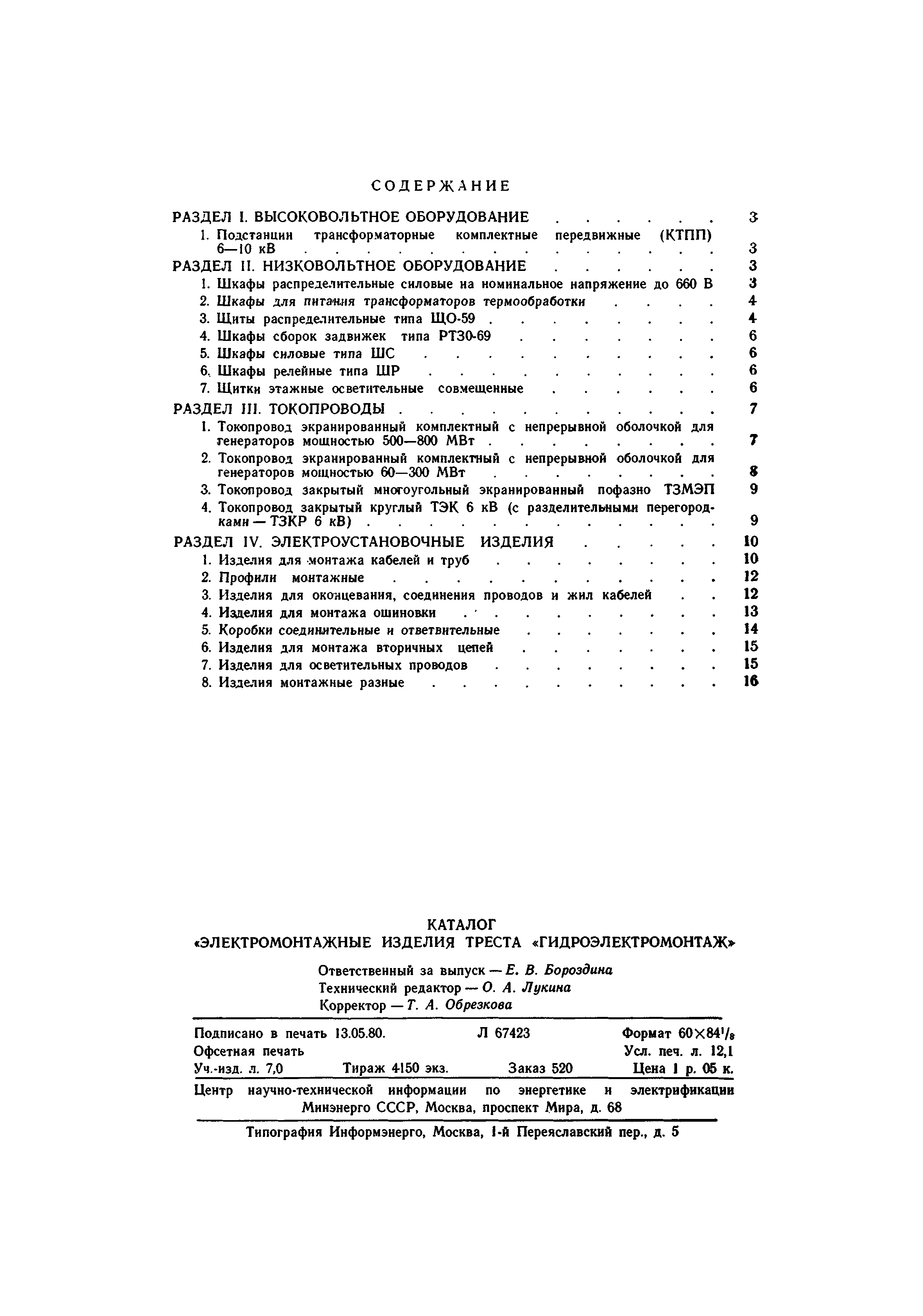 | Оглавление: | Раздел 1. Высоковольтное оборудование 1. Подстанции трансформаторные комплектные передвижные (КТПП) 6 - 10 кВ Раздел II. Низковольтное оборудование 1. Шкафы распределительные силовые на номинальное напряжение до 660 В 2. Шкафы для питания трансформаторов термообработки 3. Щиты распределительные типа ЩО-59 4. Шкафы сборок задвижек типа РТ30-69 5. Шкафы силовые типа ШС 6. Шкафы релейные типа ШР 7. Щитки этажные осветительные совмещенные Раздел III. Токопроводы 1. Токопровод экранированный комплектный с непрерывной оболочкой для генераторов мощностью 500 - 800 МВ 2. Токопровод экранированный комплектвый с непрерывной оболочкой для генераторов мощностью 60 - 300 МВт 3. Токопровод закрытый многоугольный экранированный пофазно ТЗМЭП 4. Токопровод закрытый круглый ТЭК 6 кВ (с разделительными перегородками-ТЗКР 6 кВ) Раздел IV. Электроустановочные изделия 1. Изделия для монтажа кабелей и труб 2. Профили монтажные 3. Изделия для оконцевания, соединения проводов и жил кабелей 4. Изделия для монтажа ошиновки 5. Коробки соединительные и ответвительные 6. Изделия для монтажа вторичных целей 7. Изделия для осветительных проводов 8. Изделия монтажные разные |