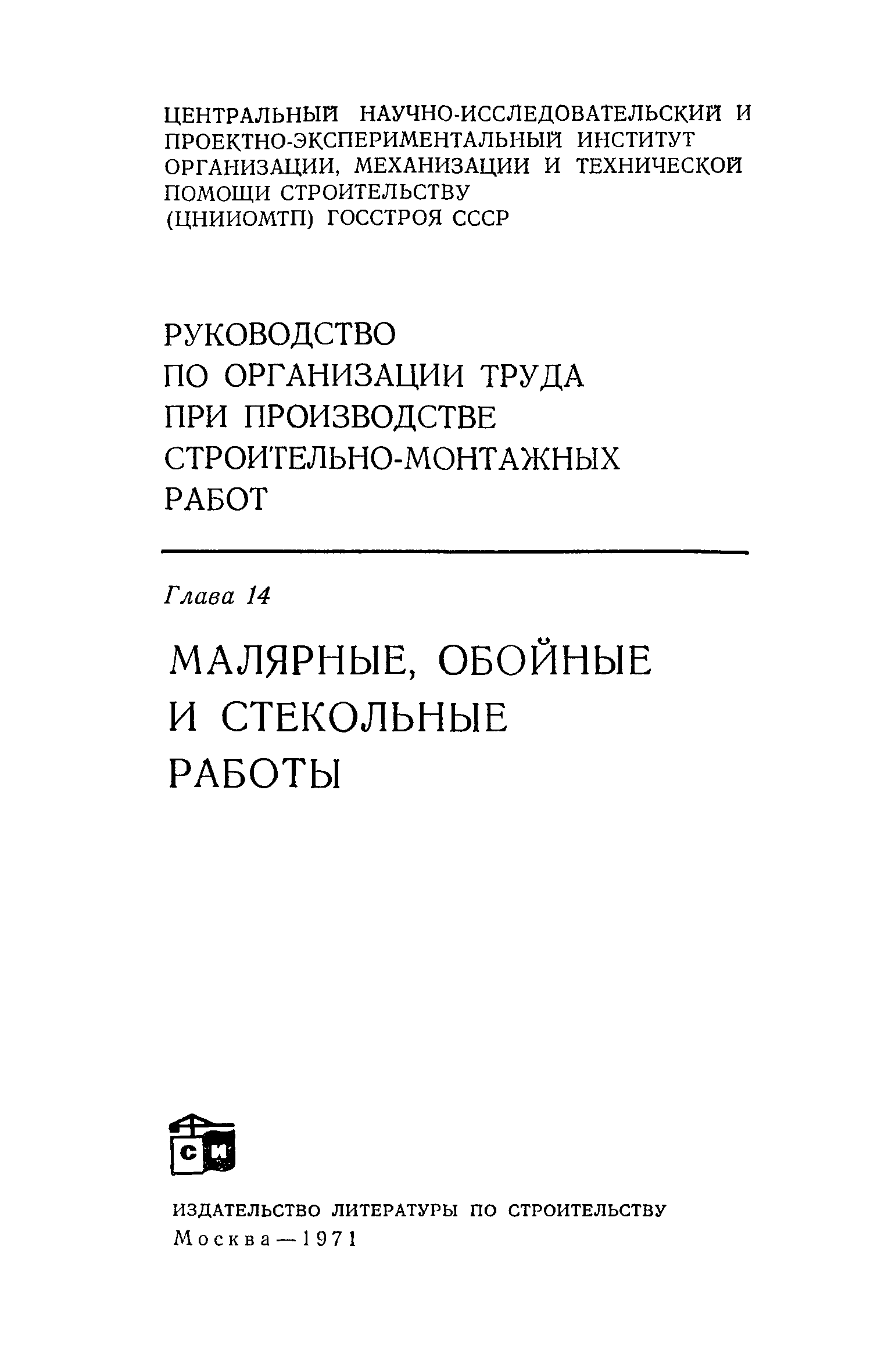 Скачать Руководство по организации труда при производстве строительно-монтажных работ. Глава 14. Малярные, обойные и стекольные работыДата актуализации: 01.01.2021