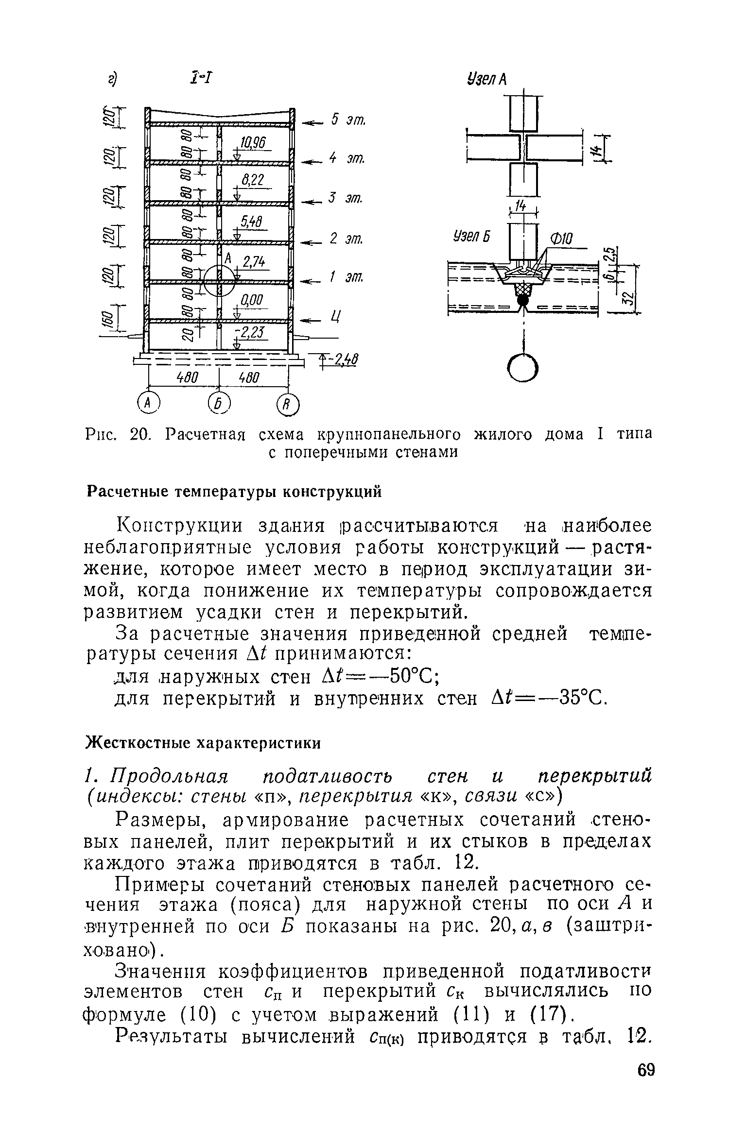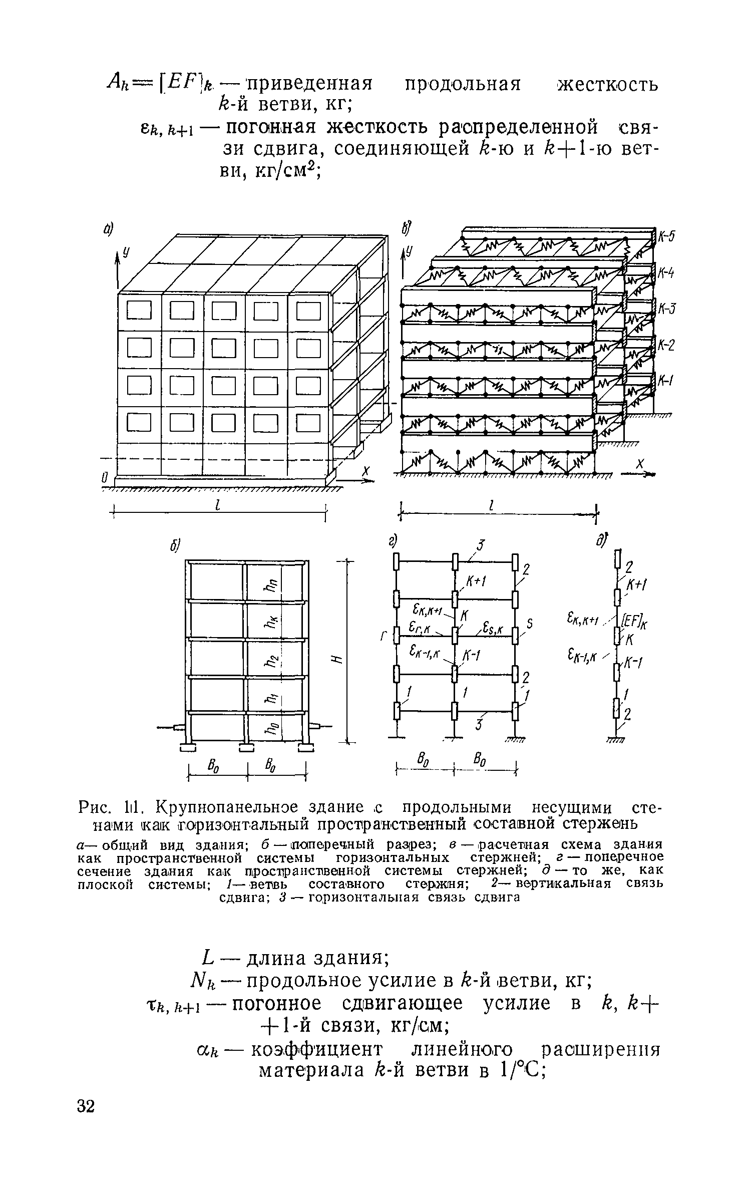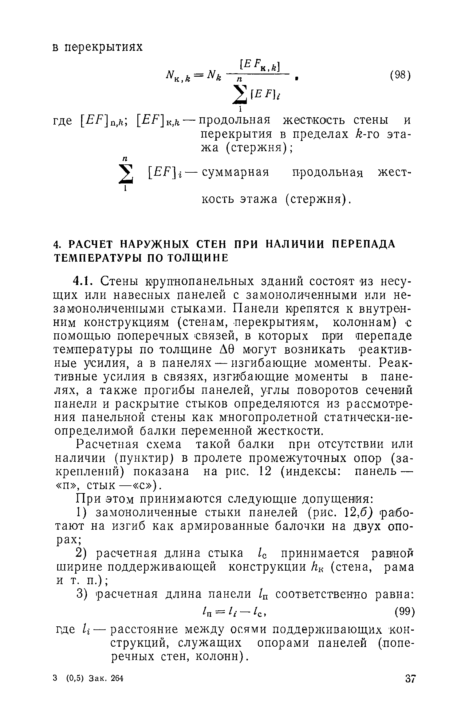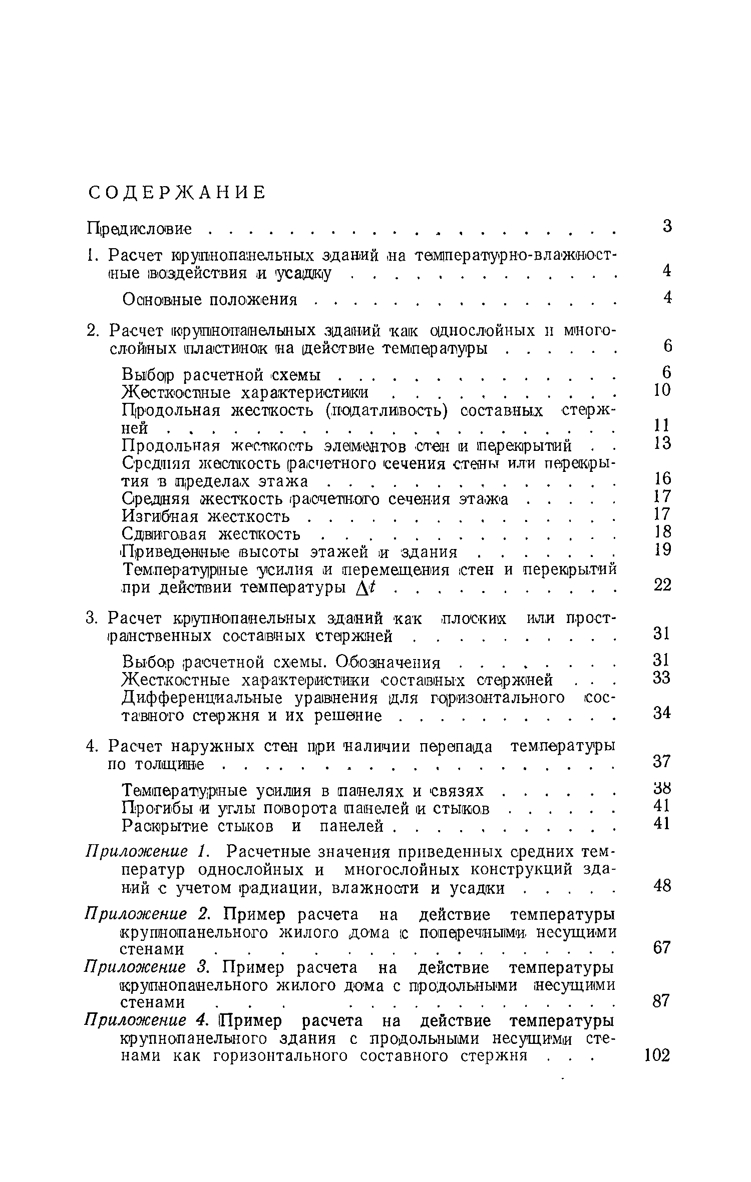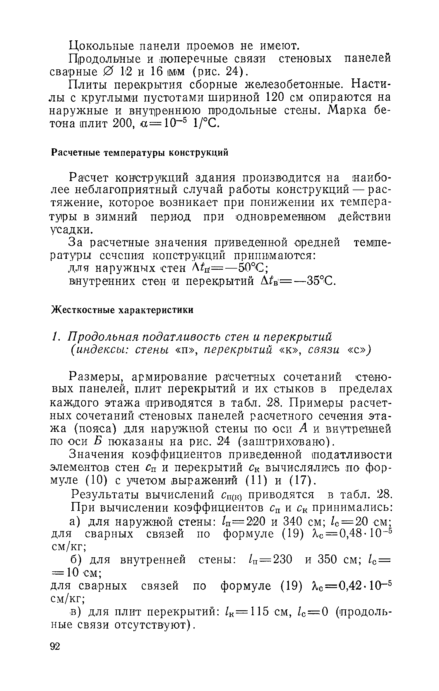| Оглавление: | Предисловие 1. Расчет крупнопанельных зданий на температурно-влажностные воздействия и усадку Основные положения 2. Расчет крупнопанельных зданий как однослойных и многослойных пластинок на действие температуры Выбор расчетной схемы Жесткостные характеристики Продольная жесткость (податливость) составных стержней Продольная жесткость элементов стен и перекрытий Средняя жесткость Расчетного сечения стены или перекрытия в пределах этажа Средняя жесткость расчетного сечения этажа Изгибная жесткость Сдвиговая жесткость Приведенные высоты этажей и здания Температурные усилия и перемещения стен и перекрытий при действии температуры 3. Расчет крупнопанельных зданий как плоских или пространственных составных стержней Выбор расчетной схемы. Обозначения Жесткостные характеристики составных стержней Дифференциальные уравнения для горизонтального составного стержня и их решение 4. Расчет наружных стен при наличии перепада температуры по толщине Температурные усилия в панелях и связях Прогибы и углы поворота панелей и стыков Раскрытие стыков и панелей Приложение 1. Расчетные значения приведенных средних температур однослойных и многослойных конструкций зданий с учетом радиации, влажности и усадки Приложение 2. Пример расчета на действие температуры крупнопанельного жилого дома с поперечными несущими стенами Приложение 3. Пример расчета на действие температуры крупнопанельного жилого дома с продольными несущими стенами Приложение 4. Пример расчета на действие температуры крупнопанельного здания с продольными несущими стенами как горизонтального составного стержня |