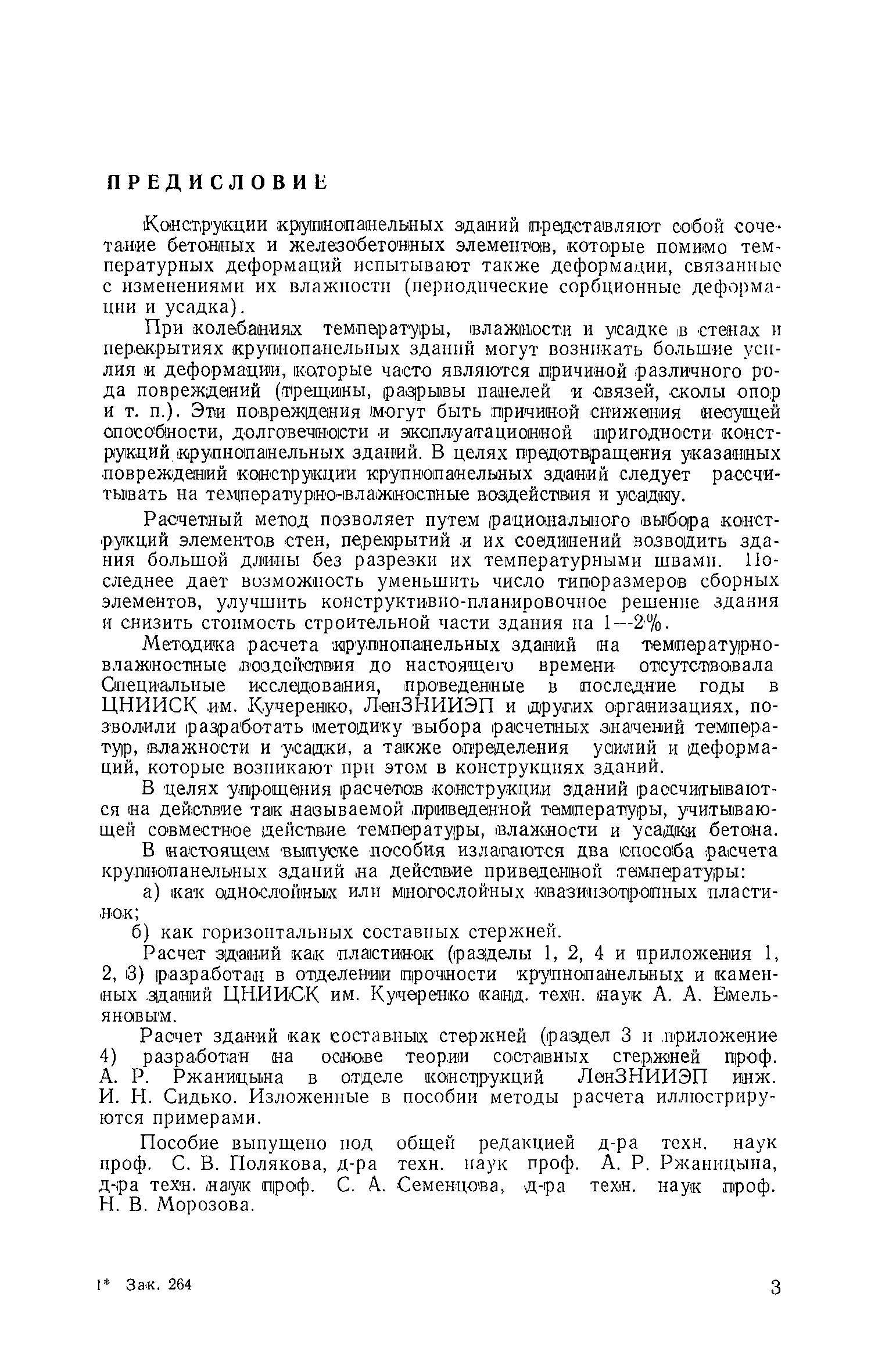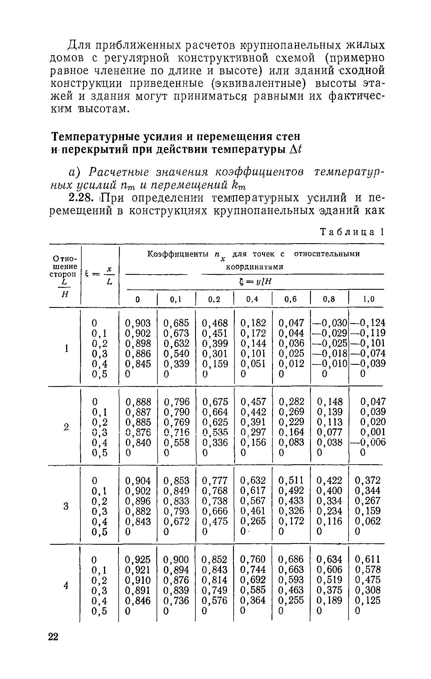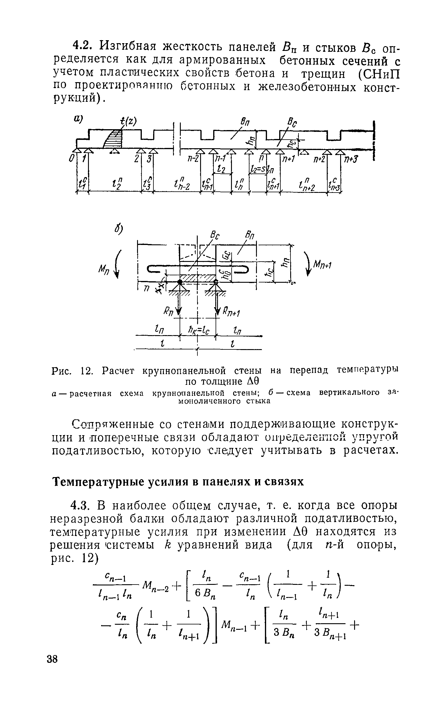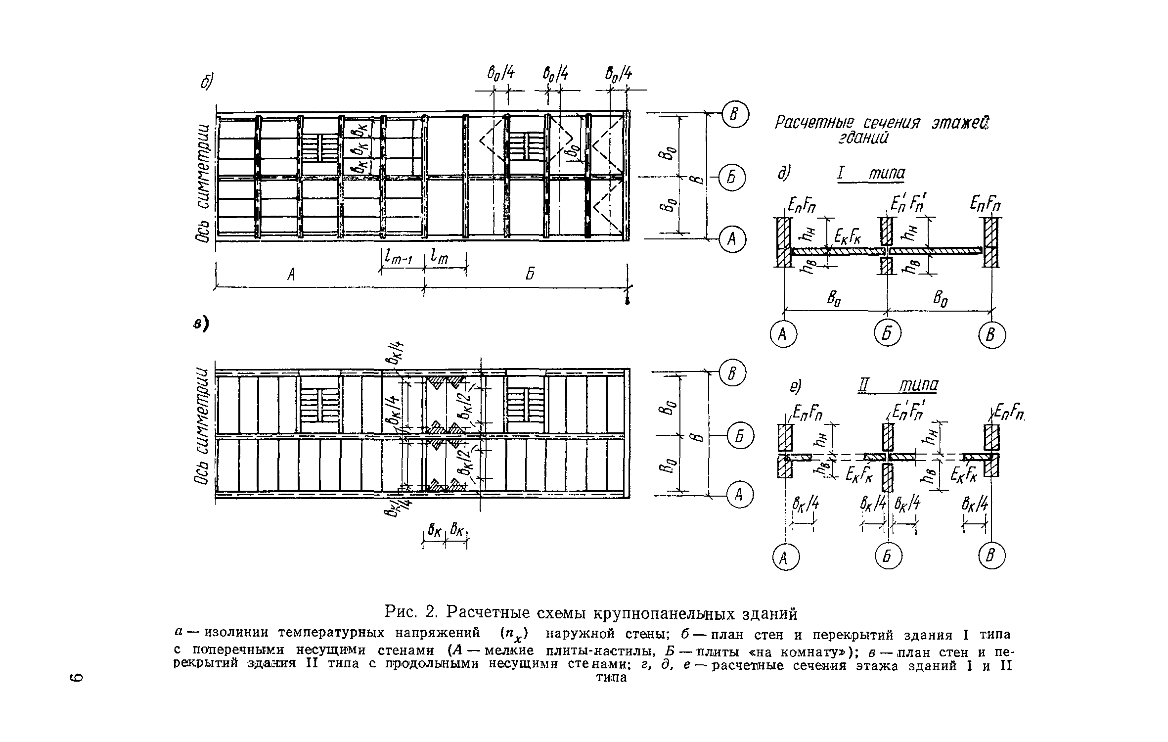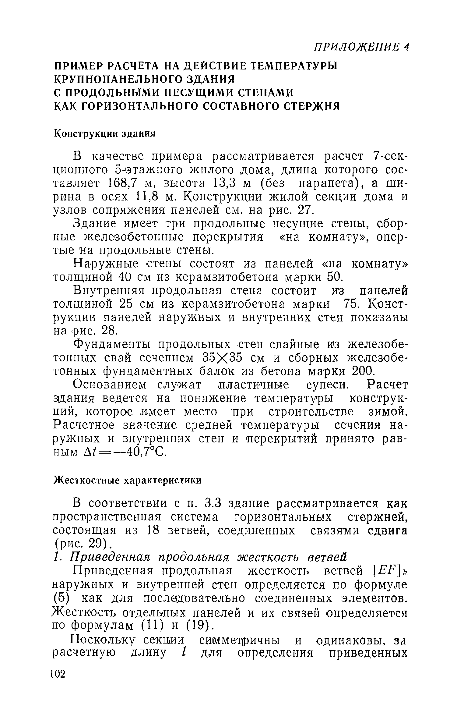 | Оглавление: | Предисловие 1. Расчет крупнопанельных зданий на температурно-влажностные воздействия и усадку Основные положения 2. Расчет крупнопанельных зданий как однослойных и многослойных пластинок на действие температуры Выбор расчетной схемы Жесткостные характеристики Продольная жесткость (податливость) составных стержней Продольная жесткость элементов стен и перекрытий Средняя жесткость Расчетного сечения стены или перекрытия в пределах этажа Средняя жесткость расчетного сечения этажа Изгибная жесткость Сдвиговая жесткость Приведенные высоты этажей и здания Температурные усилия и перемещения стен и перекрытий при действии температуры 3. Расчет крупнопанельных зданий как плоских или пространственных составных стержней Выбор расчетной схемы. Обозначения Жесткостные характеристики составных стержней Дифференциальные уравнения для горизонтального составного стержня и их решение 4. Расчет наружных стен при наличии перепада температуры по толщине Температурные усилия в панелях и связях Прогибы и углы поворота панелей и стыков Раскрытие стыков и панелей Приложение 1. Расчетные значения приведенных средних температур однослойных и многослойных конструкций зданий с учетом радиации, влажности и усадки Приложение 2. Пример расчета на действие температуры крупнопанельного жилого дома с поперечными несущими стенами Приложение 3. Пример расчета на действие температуры крупнопанельного жилого дома с продольными несущими стенами Приложение 4. Пример расчета на действие температуры крупнопанельного здания с продольными несущими стенами как горизонтального составного стержня |