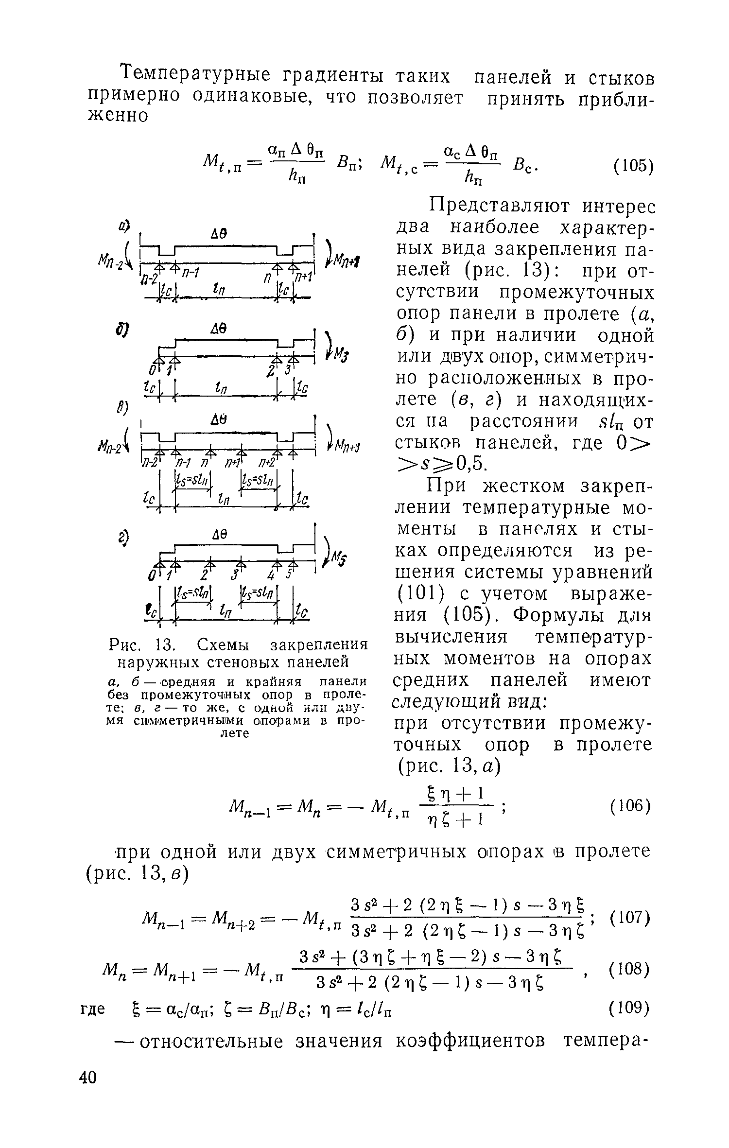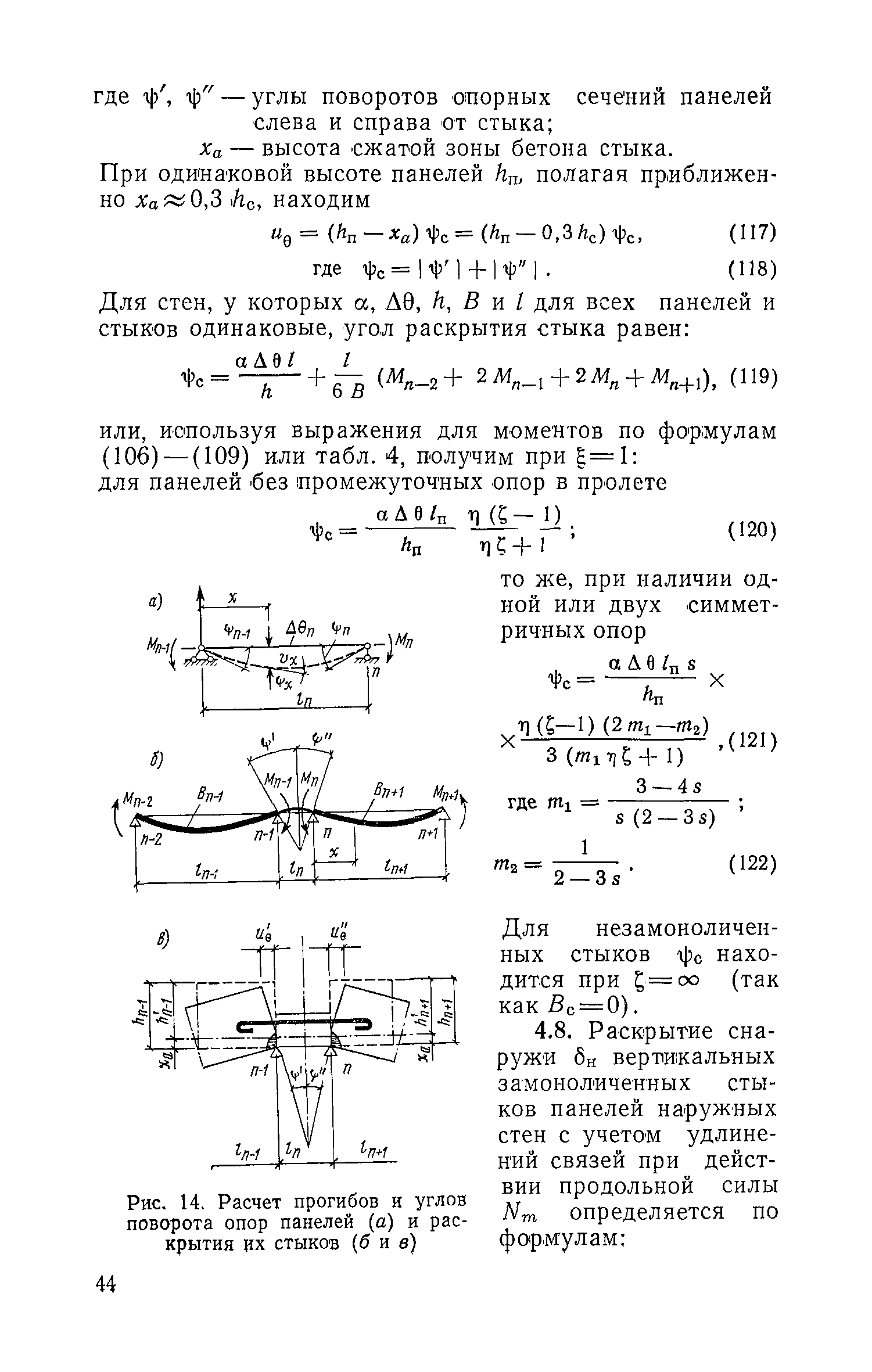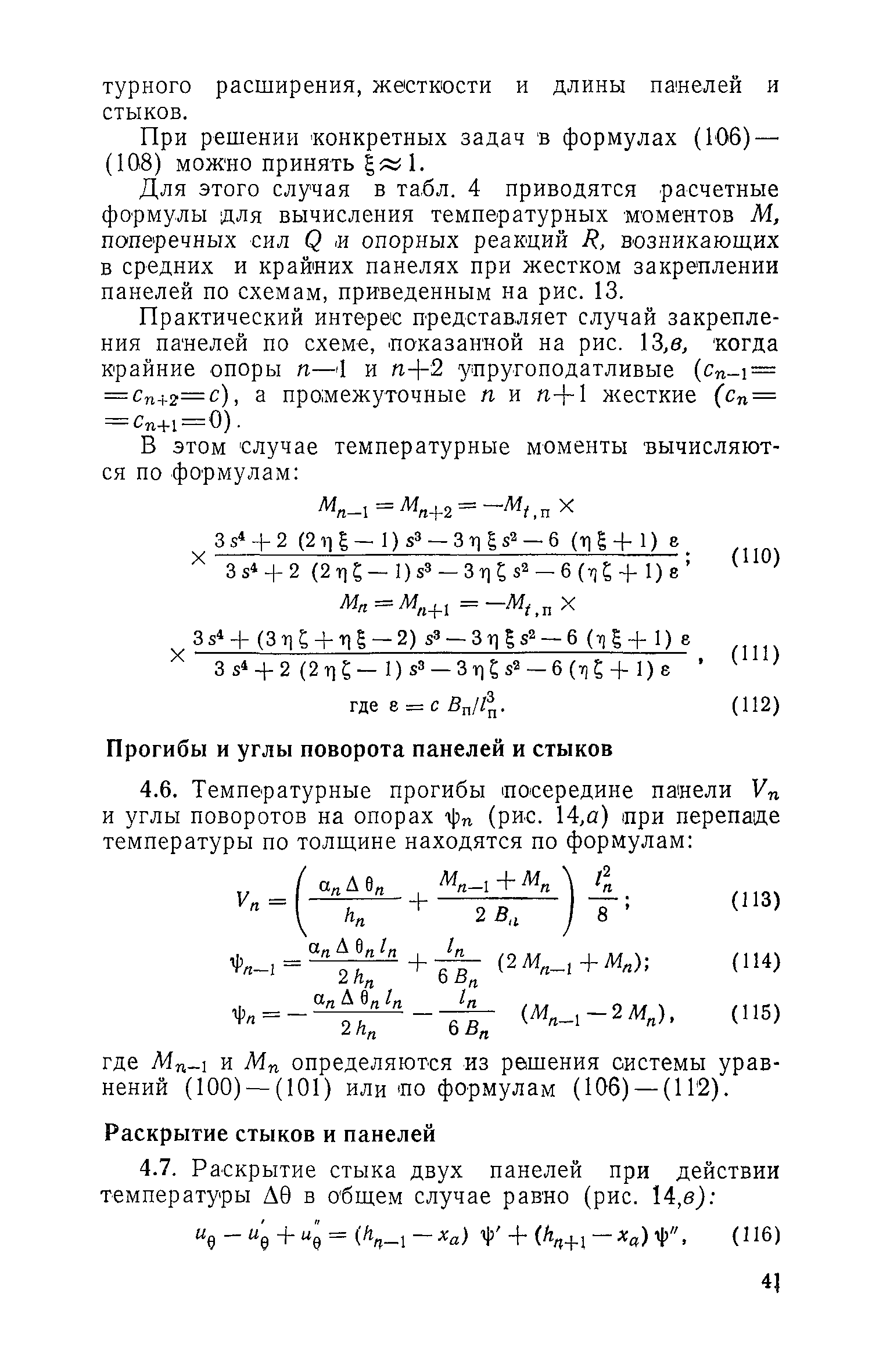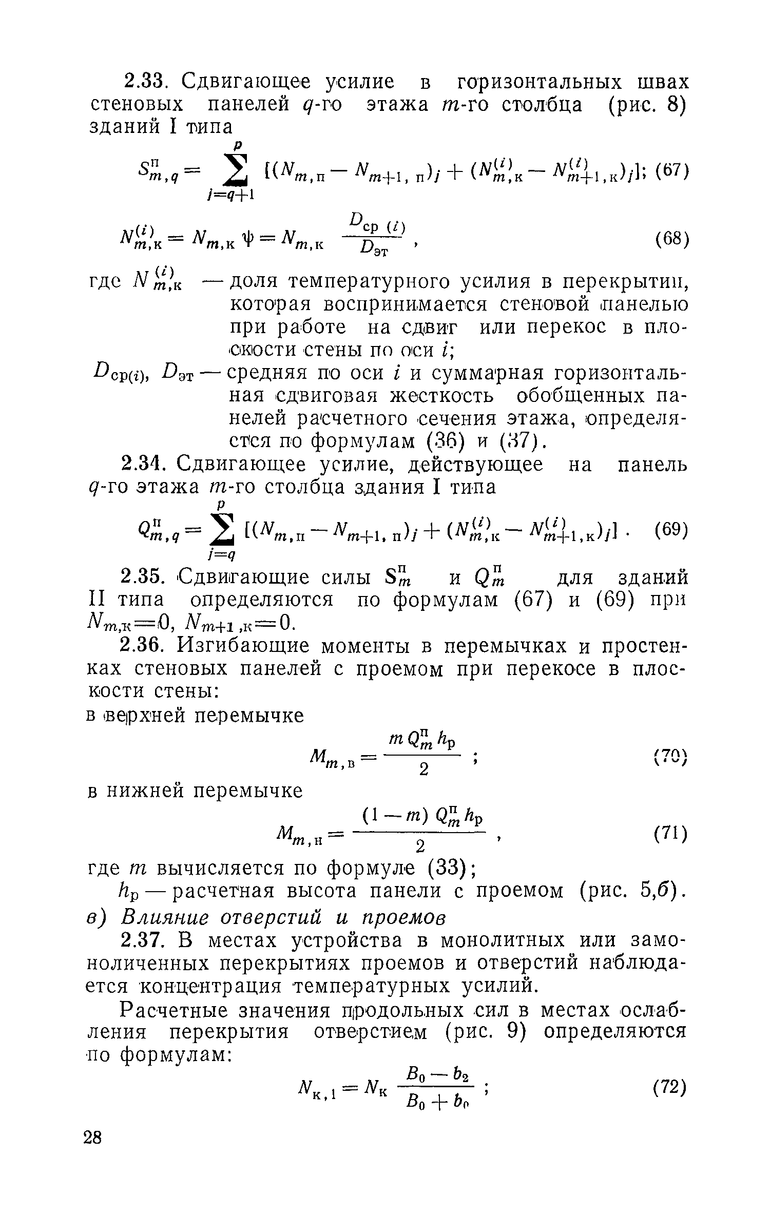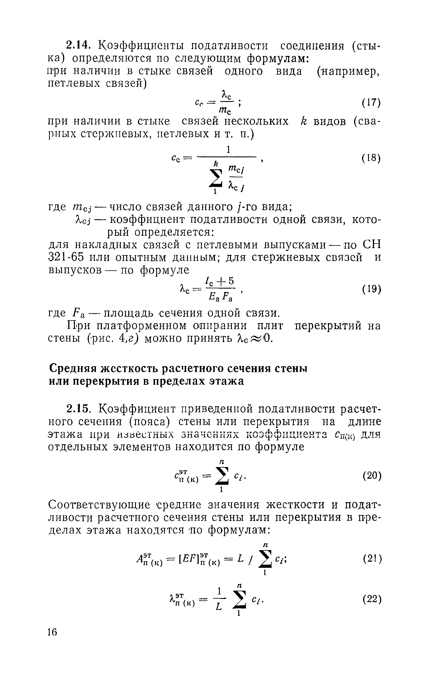 | Оглавление: | Предисловие 1. Расчет крупнопанельных зданий на температурно-влажностные воздействия и усадку Основные положения 2. Расчет крупнопанельных зданий как однослойных и многослойных пластинок на действие температуры Выбор расчетной схемы Жесткостные характеристики Продольная жесткость (податливость) составных стержней Продольная жесткость элементов стен и перекрытий Средняя жесткость Расчетного сечения стены или перекрытия в пределах этажа Средняя жесткость расчетного сечения этажа Изгибная жесткость Сдвиговая жесткость Приведенные высоты этажей и здания Температурные усилия и перемещения стен и перекрытий при действии температуры 3. Расчет крупнопанельных зданий как плоских или пространственных составных стержней Выбор расчетной схемы. Обозначения Жесткостные характеристики составных стержней Дифференциальные уравнения для горизонтального составного стержня и их решение 4. Расчет наружных стен при наличии перепада температуры по толщине Температурные усилия в панелях и связях Прогибы и углы поворота панелей и стыков Раскрытие стыков и панелей Приложение 1. Расчетные значения приведенных средних температур однослойных и многослойных конструкций зданий с учетом радиации, влажности и усадки Приложение 2. Пример расчета на действие температуры крупнопанельного жилого дома с поперечными несущими стенами Приложение 3. Пример расчета на действие температуры крупнопанельного жилого дома с продольными несущими стенами Приложение 4. Пример расчета на действие температуры крупнопанельного здания с продольными несущими стенами как горизонтального составного стержня |