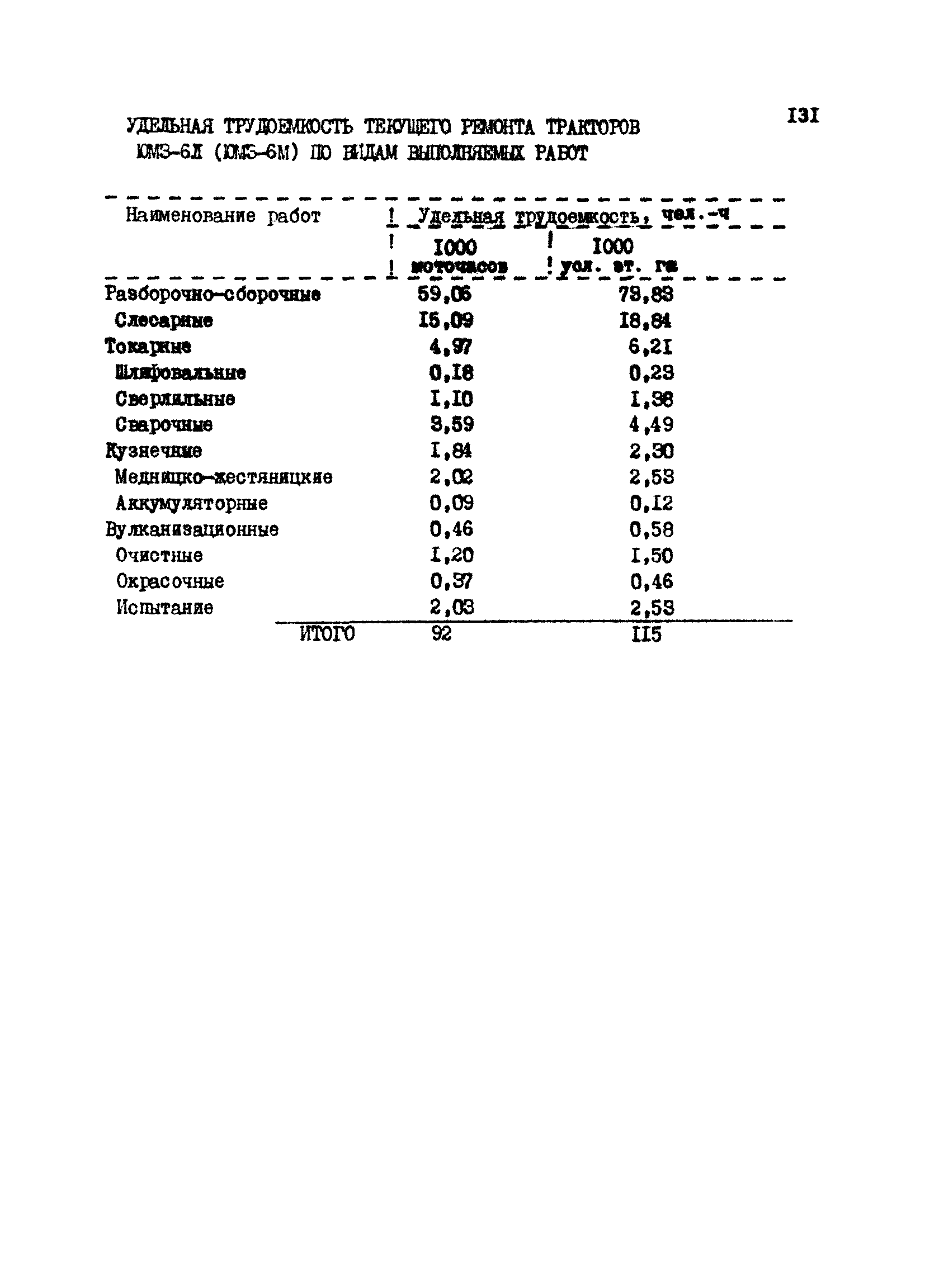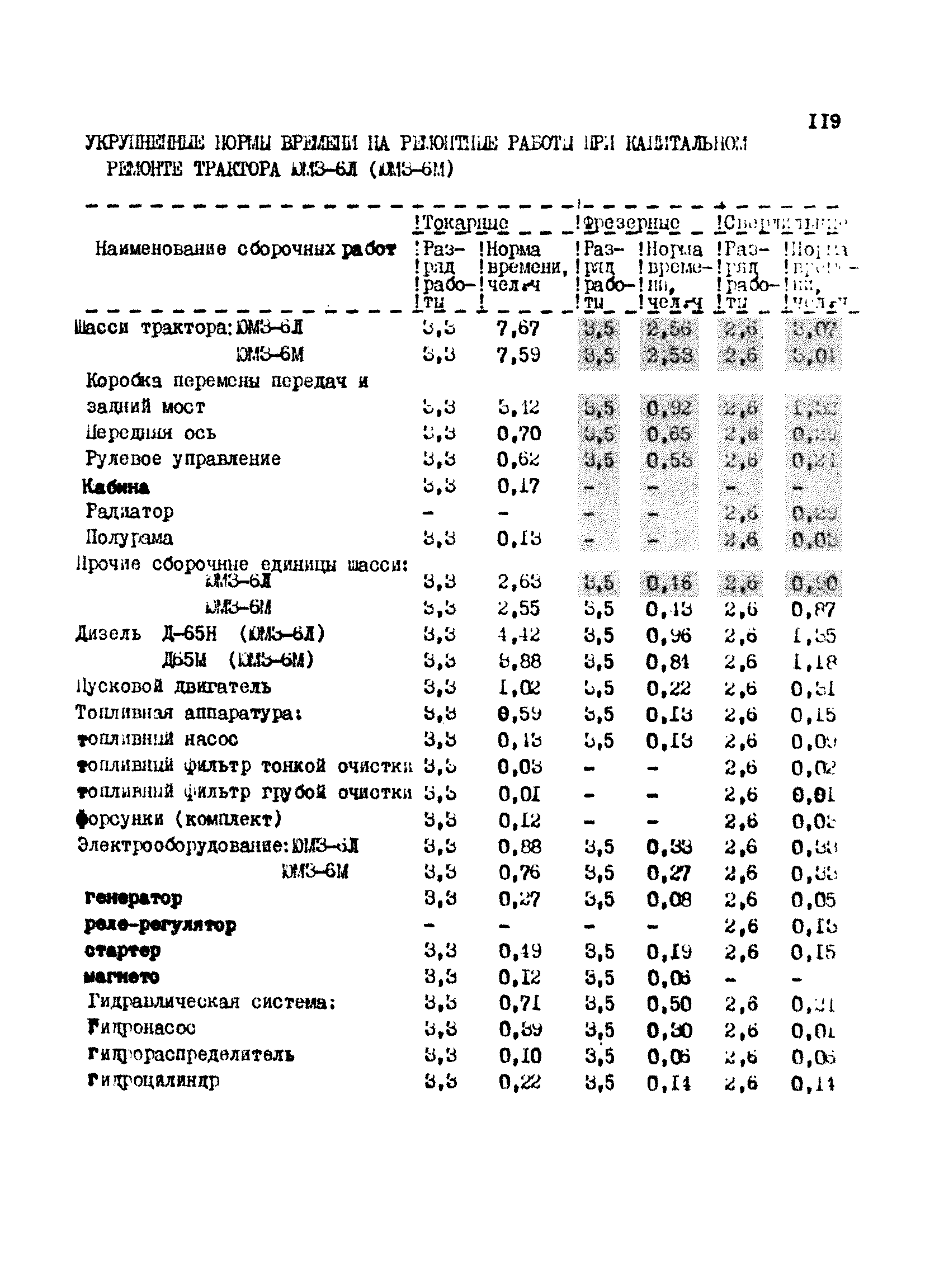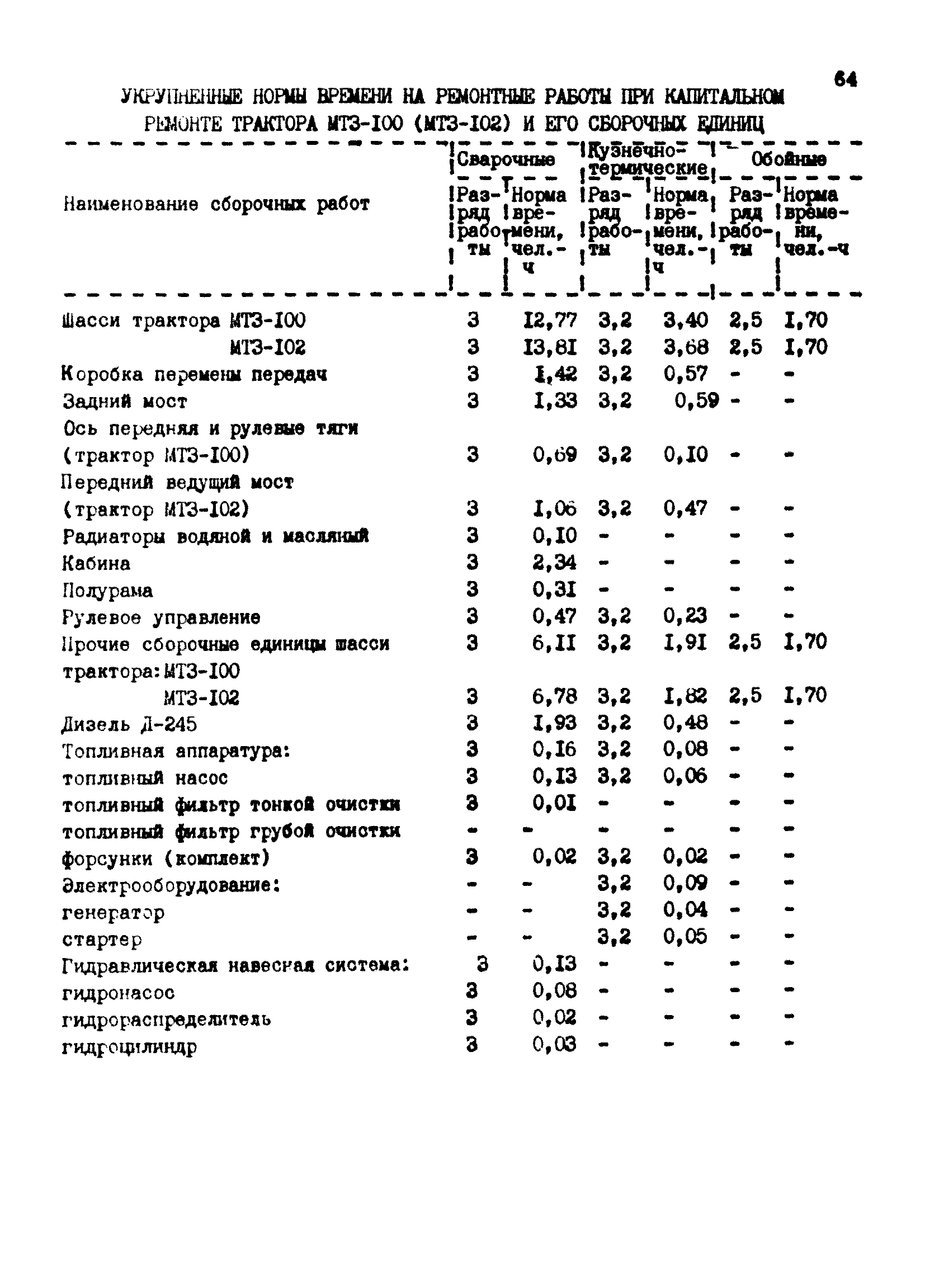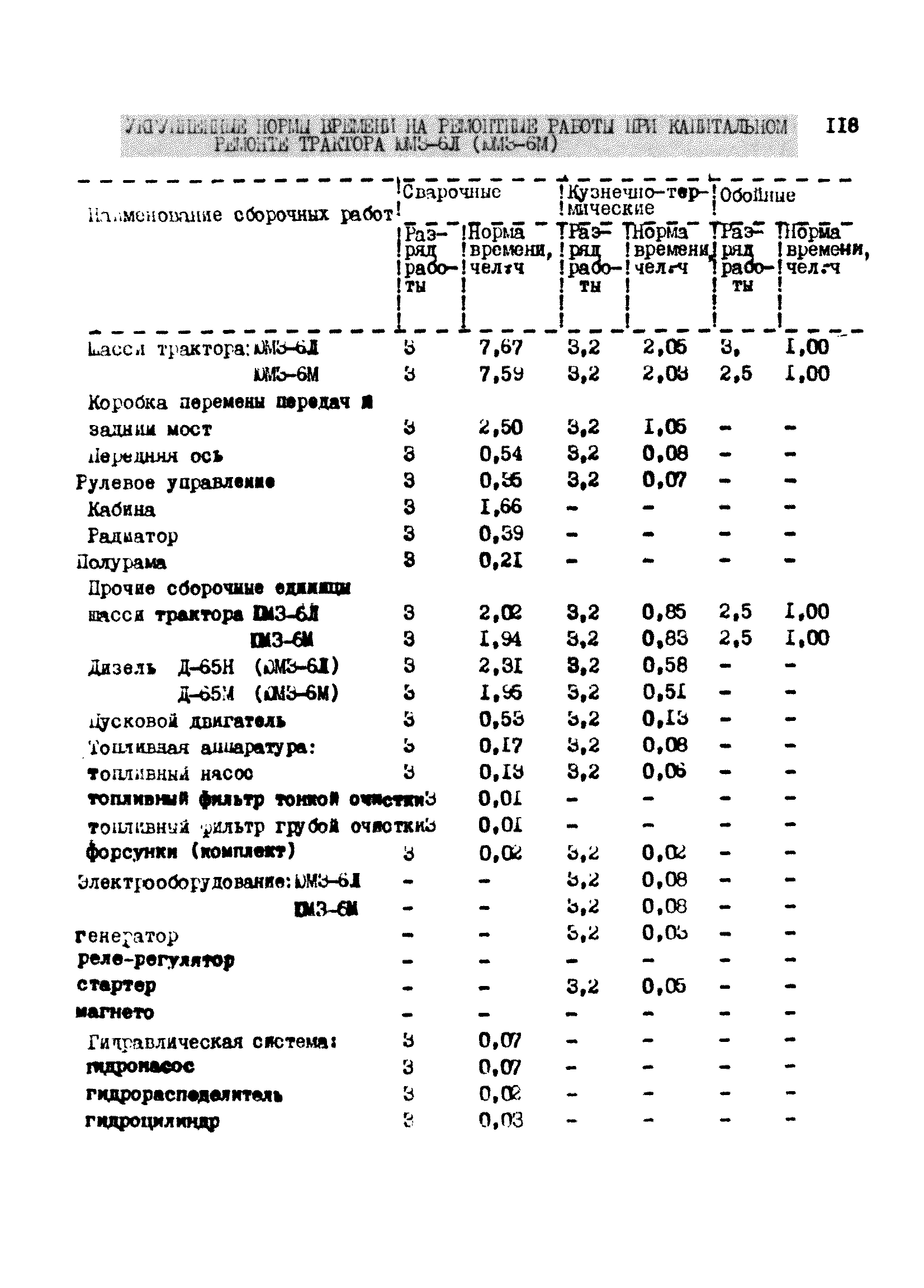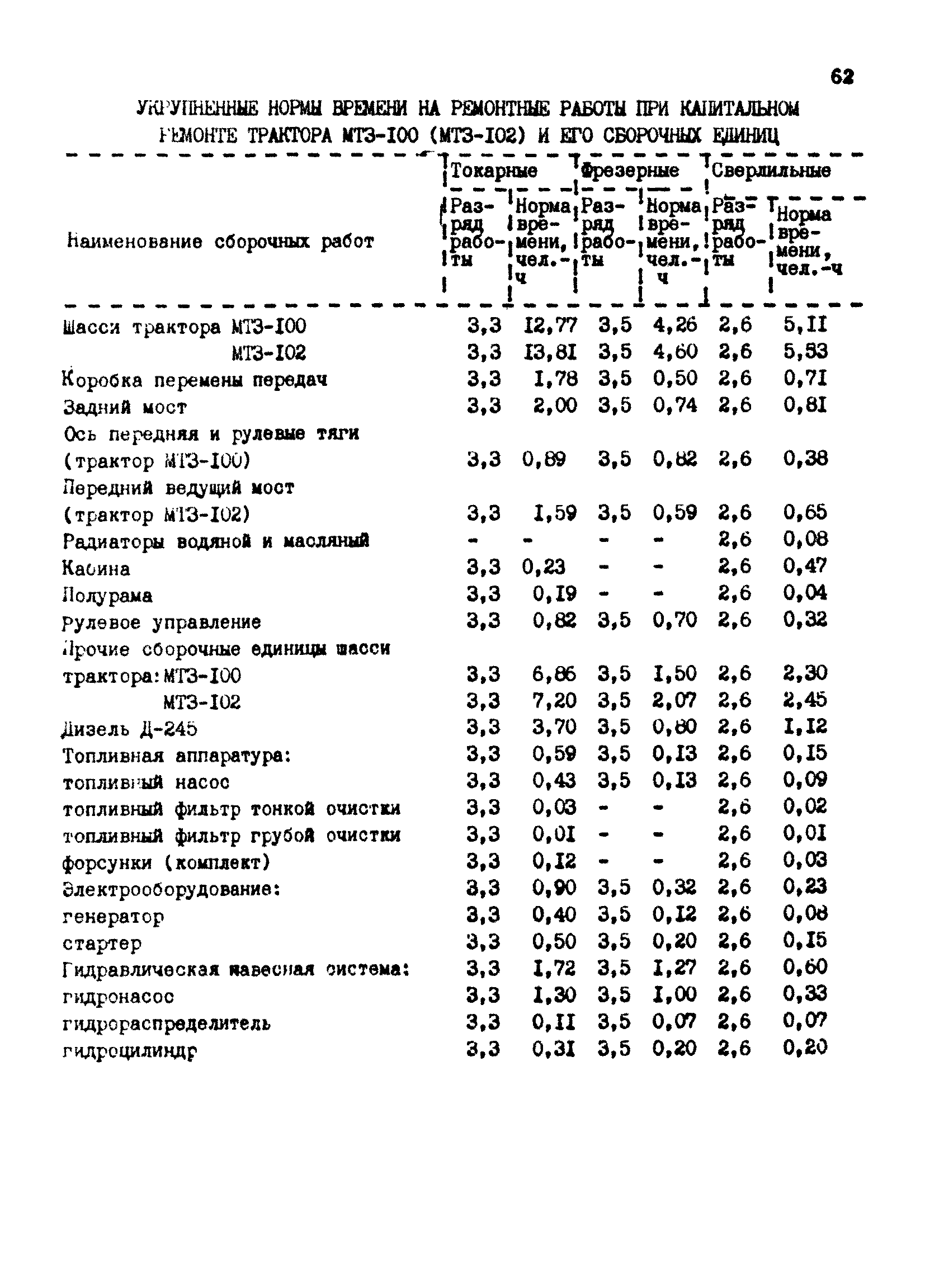 Межотраслевые укрупненные нормы времени на ремонт тракторов (гусеничных, колесных) с тяговым усилием от 0,6 тс (6 кН) до 2 тс (20 кН)| Статус: | не установлен срок действия | | Название рус.: | Межотраслевые укрупненные нормы времени на ремонт тракторов (гусеничных, колесных) с тяговым усилием от 0,6 тс (6 кН) до 2 тс (20 кН) | | Дата добавления в базу: | 01.10.2014 | | Дата актуализации: | 01.01.2021 | | Область применения: | Нормы рекомендуются для применения на всех предприятиях, в подразделениях, входящих в состав предприятий и организаций, занимающихся ремонтом тракторов, независимо от их ведомственной подчиненности, форм собственности и хозяйствования | | Оглавление: | Общая часть Организация труда Санитарно-гигиенические и производственно-эстетические условия выполнения ремонтно-обслуживающих работ Перечень оборудования и приспособлений Часть 1. Нормы времени на капитальный и текущий ремонт тракторов с тяговым от 2 тс (20кН) до 0,6 тс (6 кН) | | Разработан: | ЦБНТ