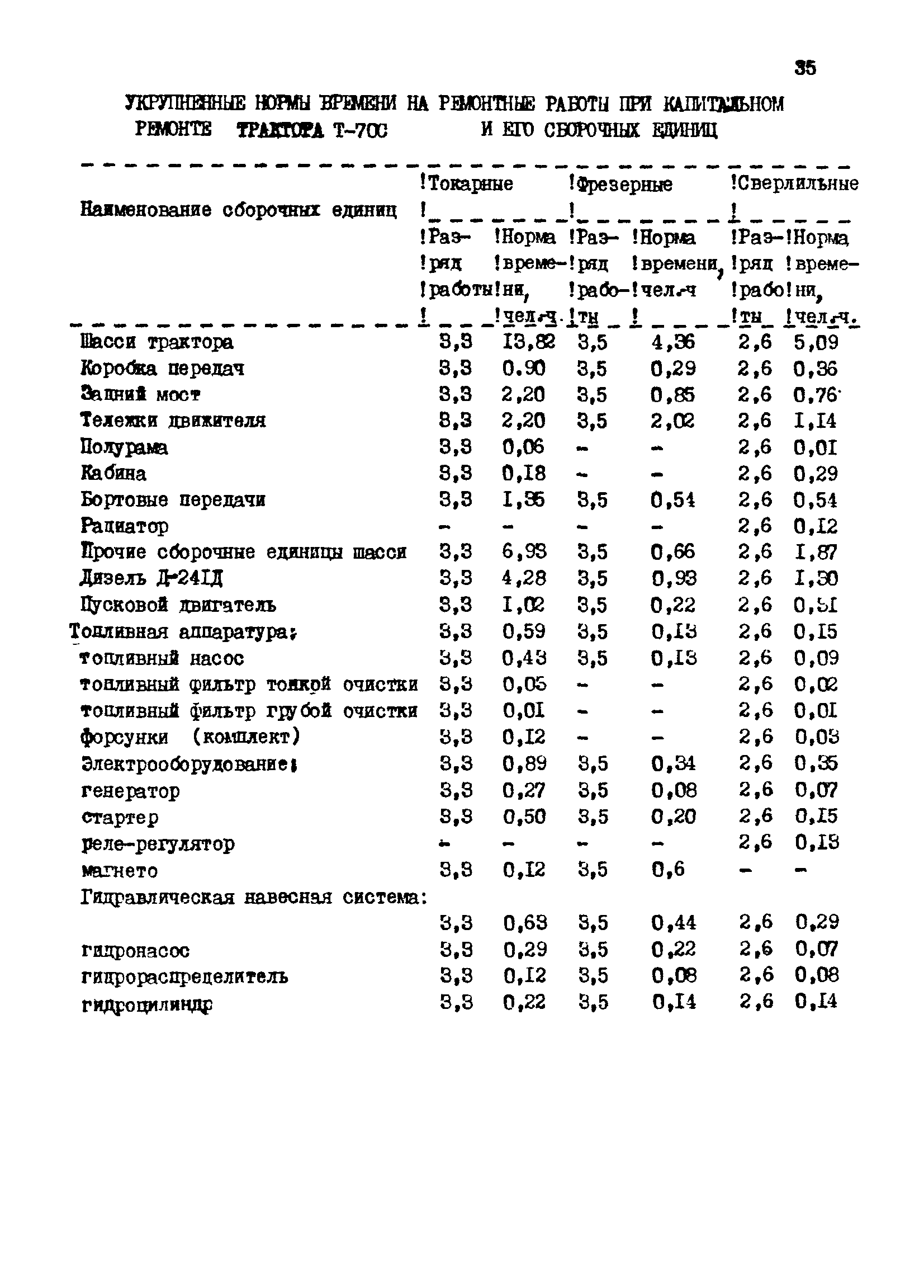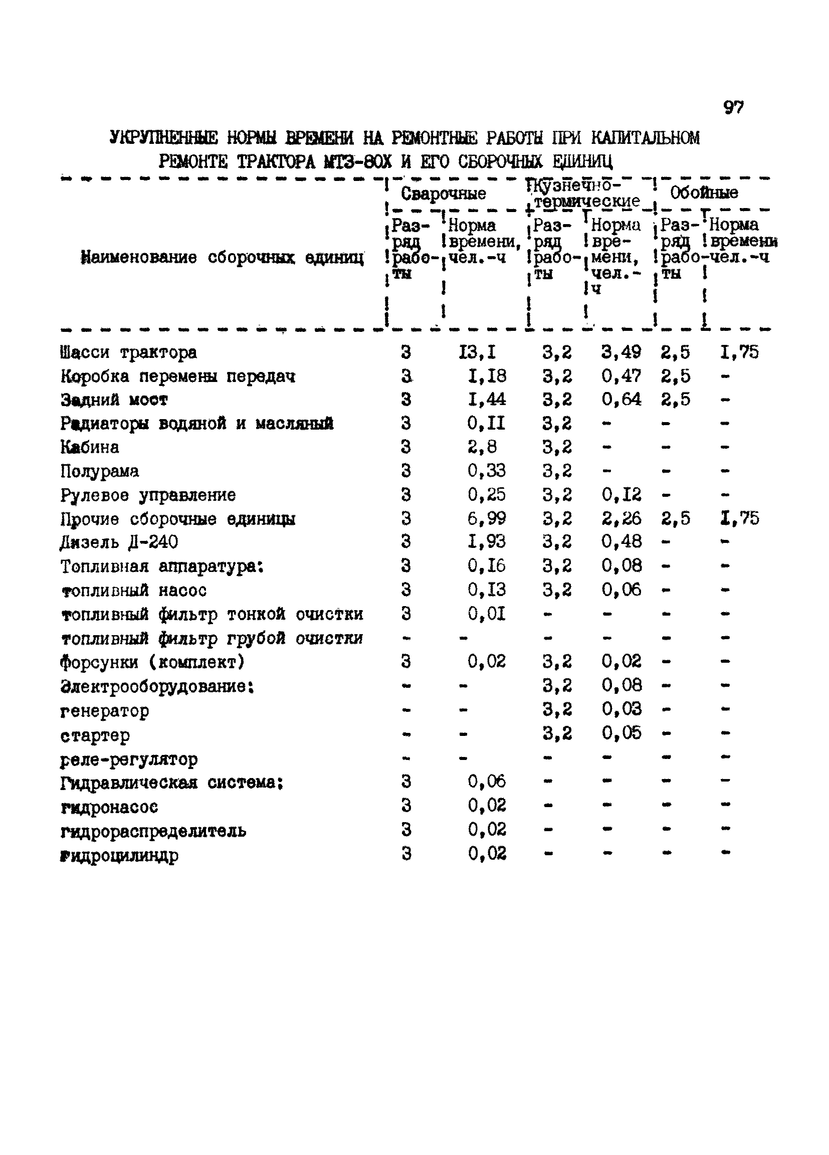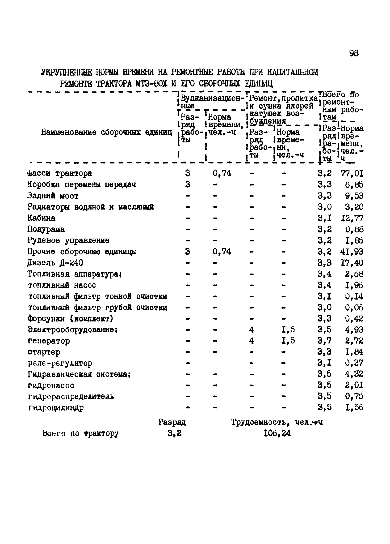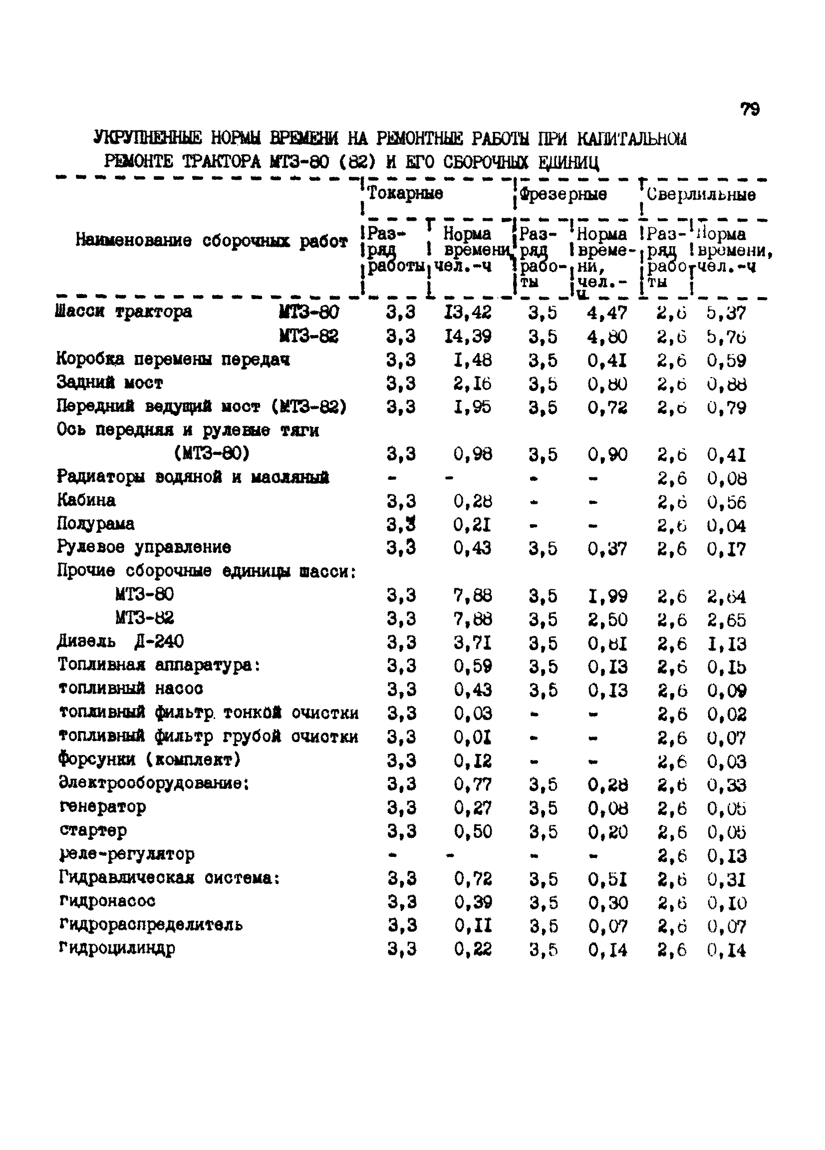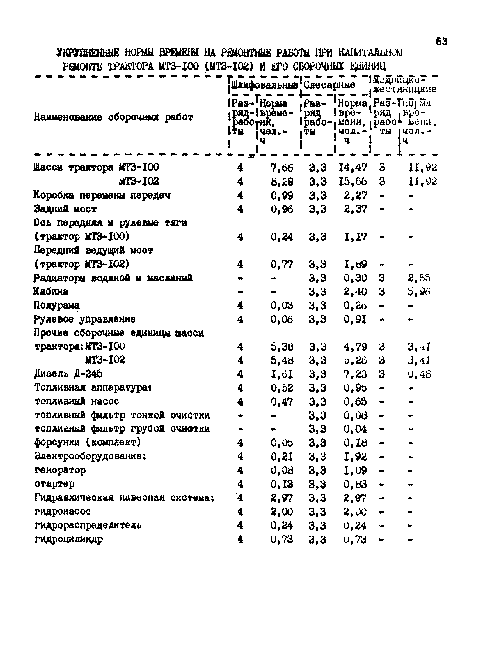 Межотраслевые укрупненные нормы времени на ремонт тракторов (гусеничных, колесных) с тяговым усилием от 0,6 тс (6 кН) до 2 тс (20 кН)| Статус: | не установлен срок действия | | Название рус.: | Межотраслевые укрупненные нормы времени на ремонт тракторов (гусеничных, колесных) с тяговым усилием от 0,6 тс (6 кН) до 2 тс (20 кН) | | Дата добавления в базу: | 01.10.2014 | | Дата актуализации: | 01.01.2021 | | Область применения: | Нормы рекомендуются для применения на всех предприятиях, в подразделениях, входящих в состав предприятий и организаций, занимающихся ремонтом тракторов, независимо от их ведомственной подчиненности, форм собственности и хозяйствования | | Оглавление: | Общая часть Организация труда Санитарно-гигиенические и производственно-эстетические условия выполнения ремонтно-обслуживающих работ Перечень оборудования и приспособлений Часть 1. Нормы времени на капитальный и текущий ремонт тракторов с тяговым от 2 тс (20кН) до 0,6 тс (6 кН) | | Разработан: | ЦБНТ