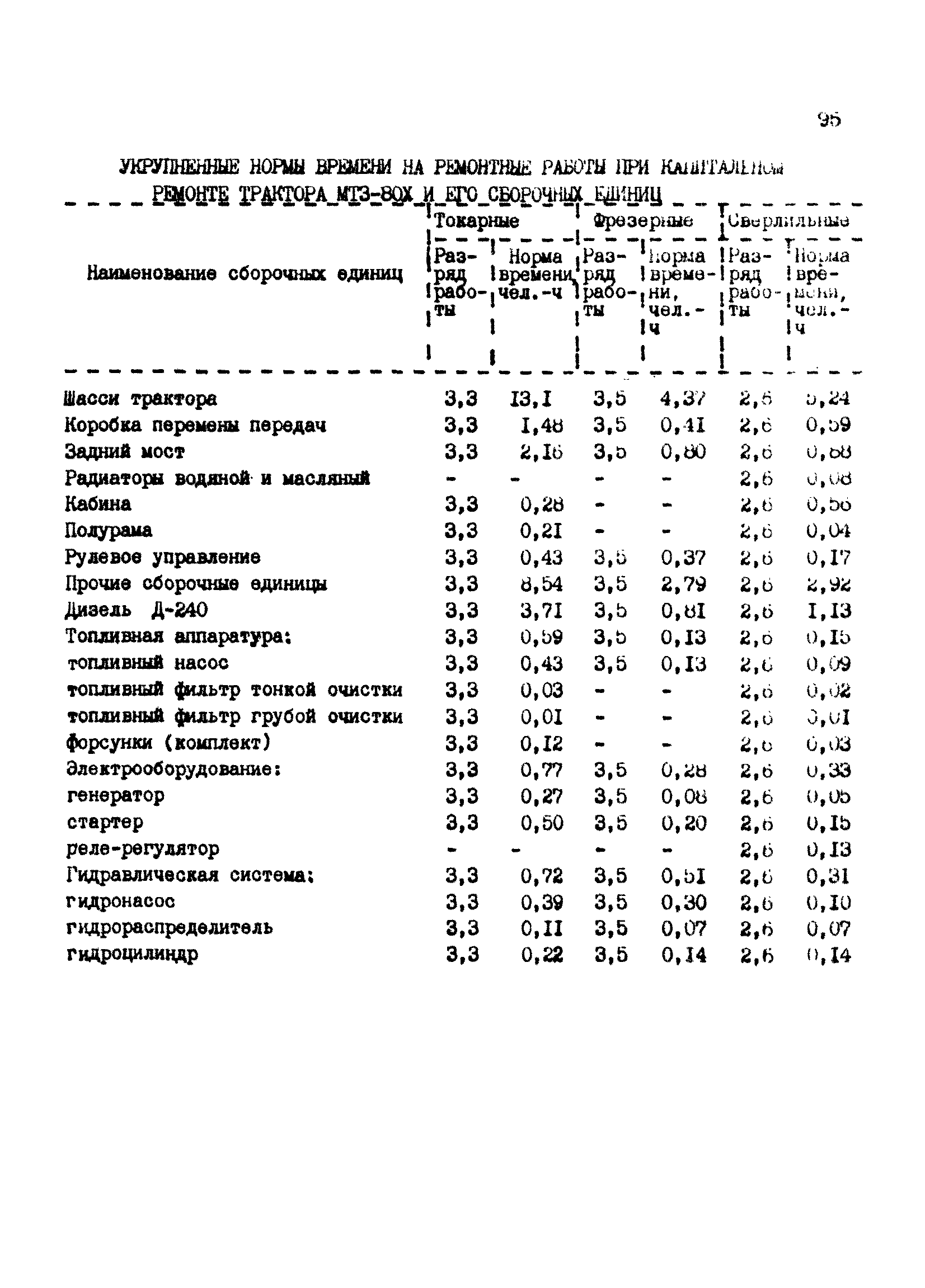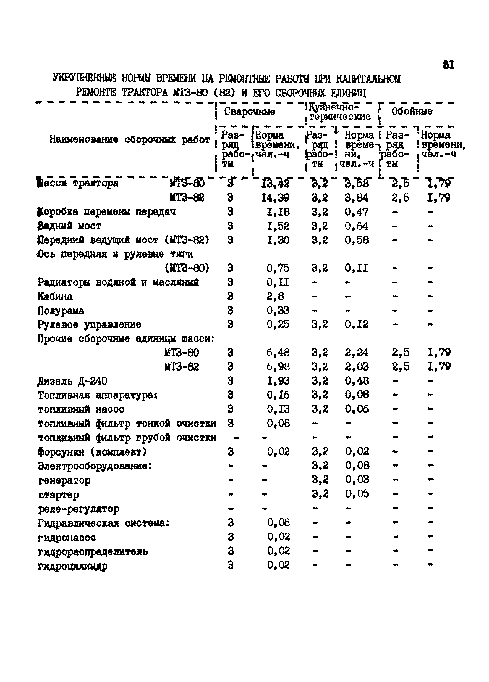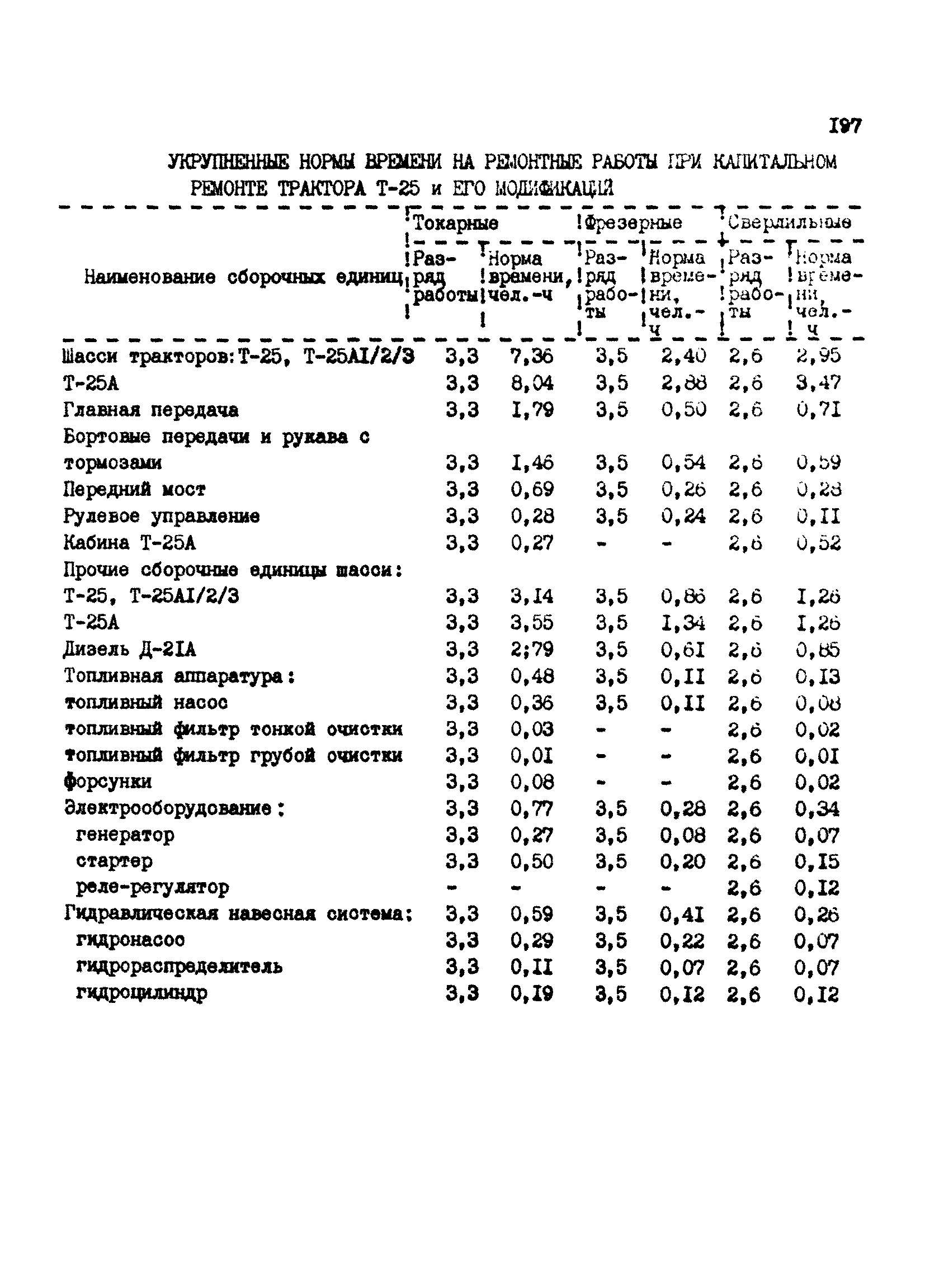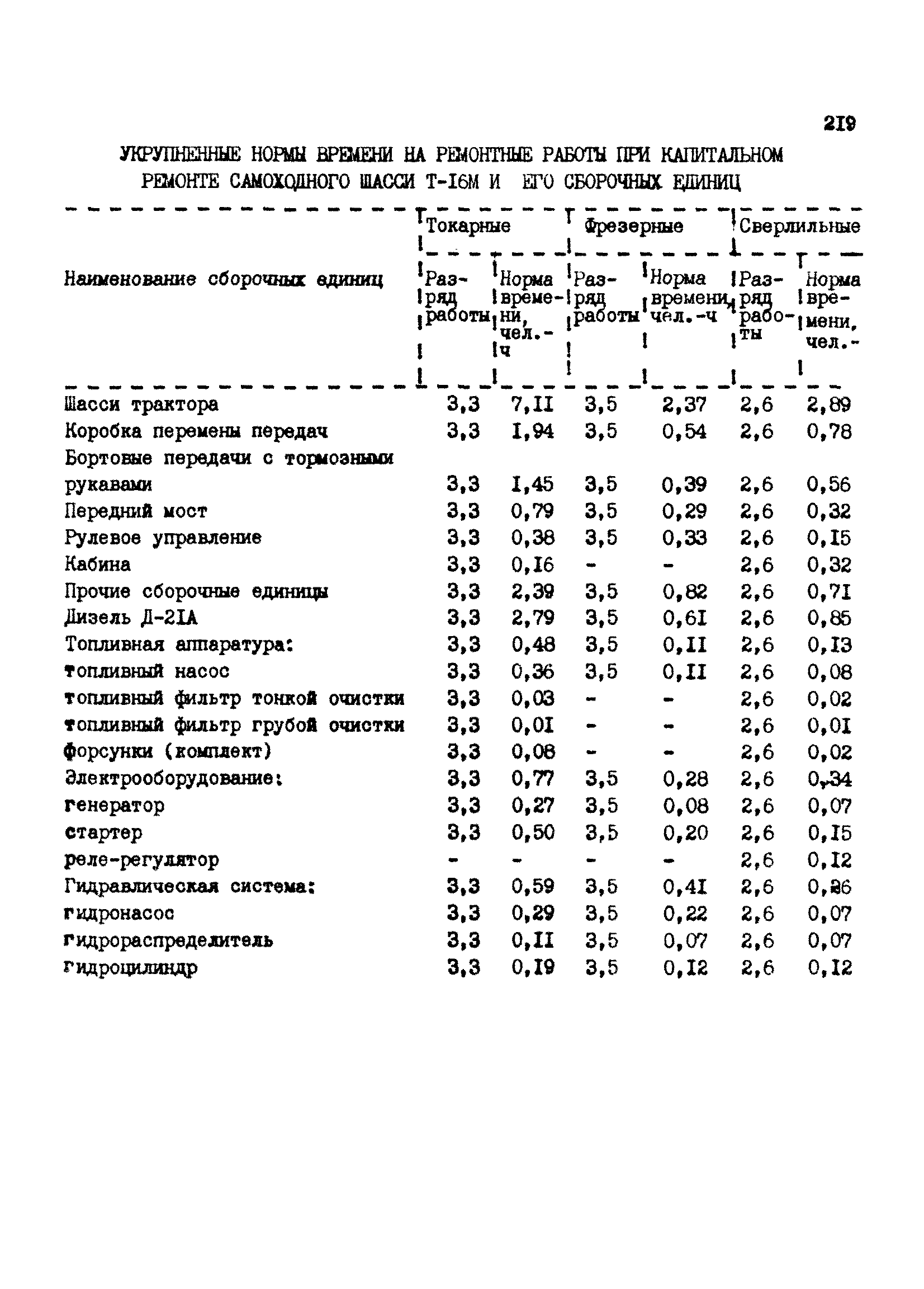 Межотраслевые укрупненные нормы времени на ремонт тракторов (гусеничных, колесных) с тяговым усилием от 0,6 тс (6 кН) до 2 тс (20 кН)| Статус: | не установлен срок действия | | Название рус.: | Межотраслевые укрупненные нормы времени на ремонт тракторов (гусеничных, колесных) с тяговым усилием от 0,6 тс (6 кН) до 2 тс (20 кН) | | Дата добавления в базу: | 01.10.2014 | | Дата актуализации: | 01.01.2021 | | Область применения: | Нормы рекомендуются для применения на всех предприятиях, в подразделениях, входящих в состав предприятий и организаций, занимающихся ремонтом тракторов, независимо от их ведомственной подчиненности, форм собственности и хозяйствования | | Оглавление: | Общая часть Организация труда Санитарно-гигиенические и производственно-эстетические условия выполнения ремонтно-обслуживающих работ Перечень оборудования и приспособлений Часть 1. Нормы времени на капитальный и текущий ремонт тракторов с тяговым от 2 тс (20кН) до 0,6 тс (6 кН) | | Разработан: | ЦБНТ