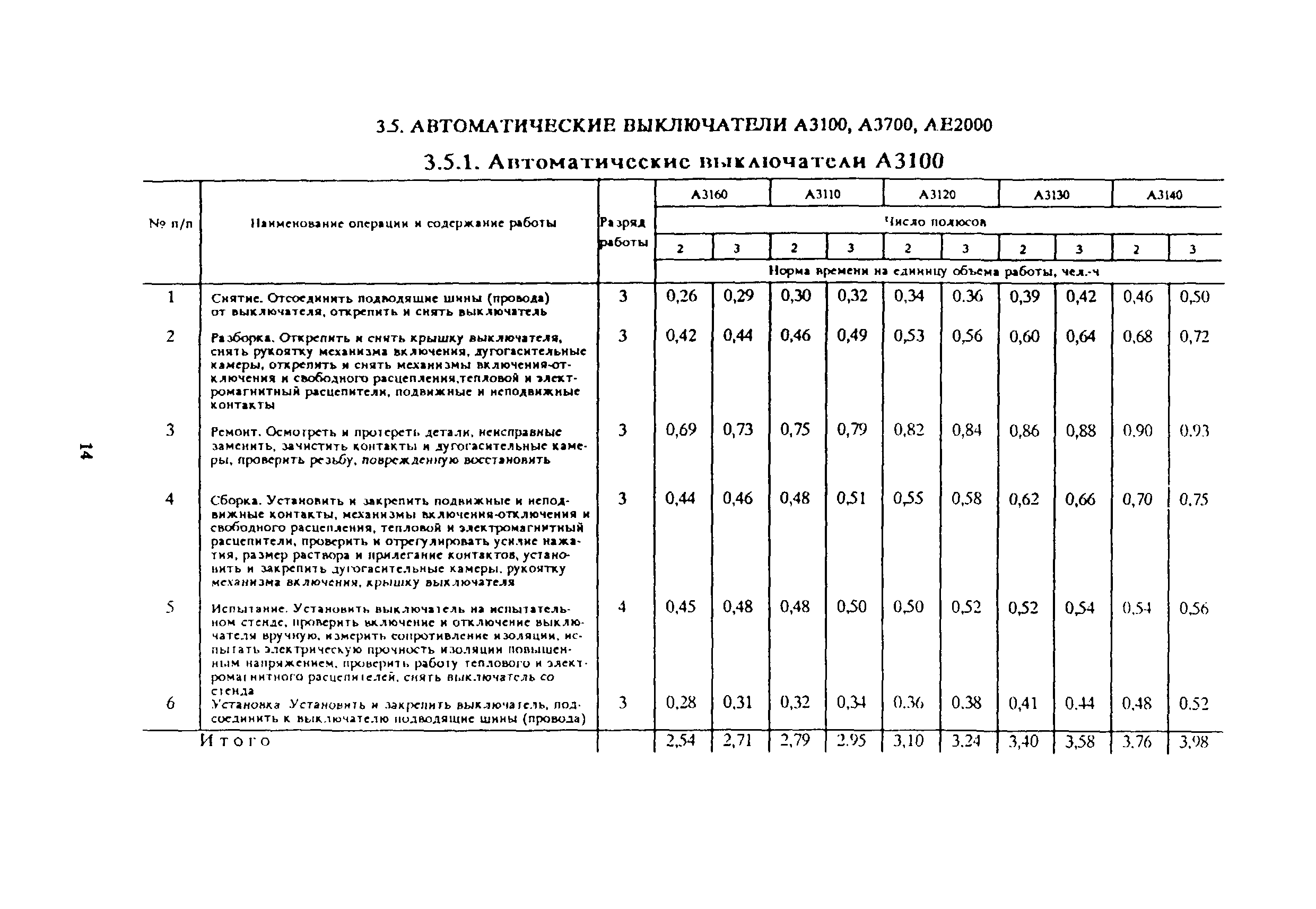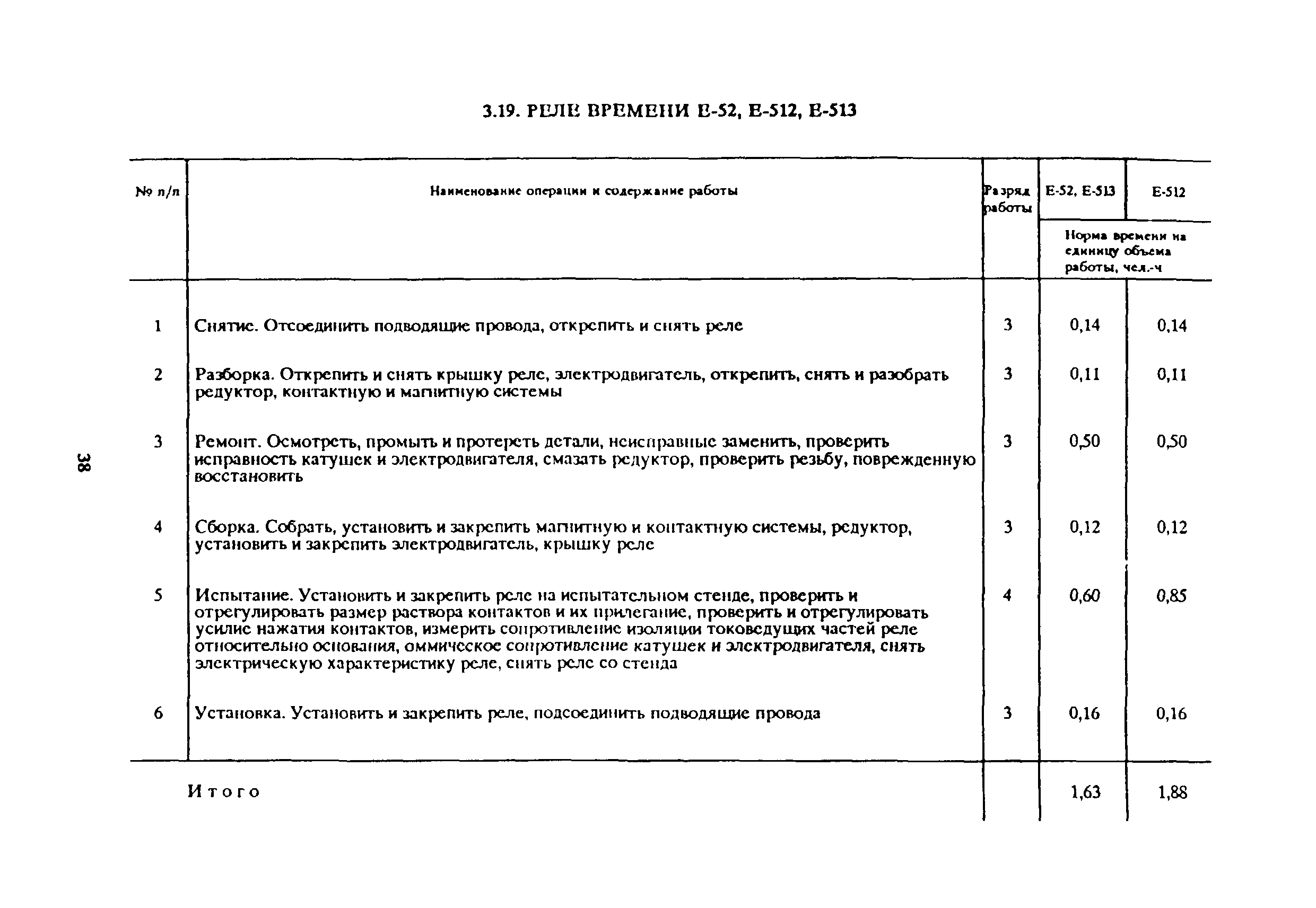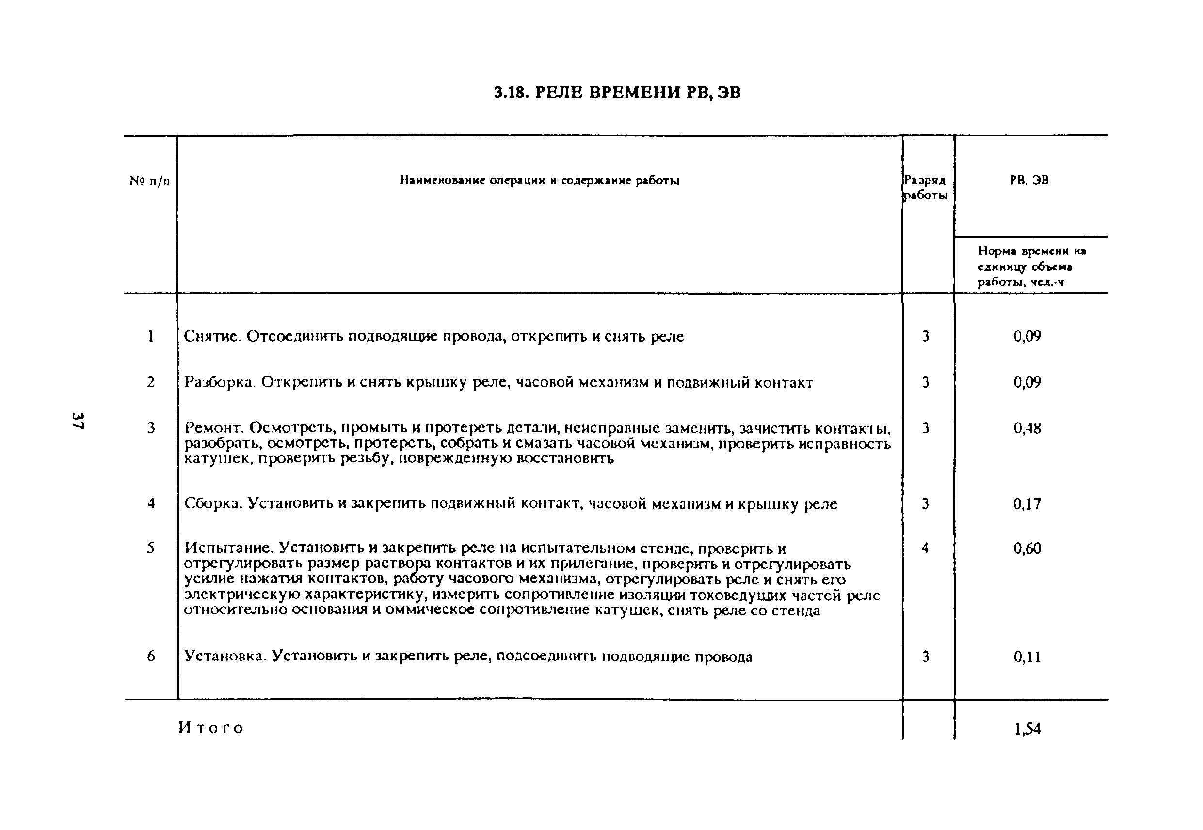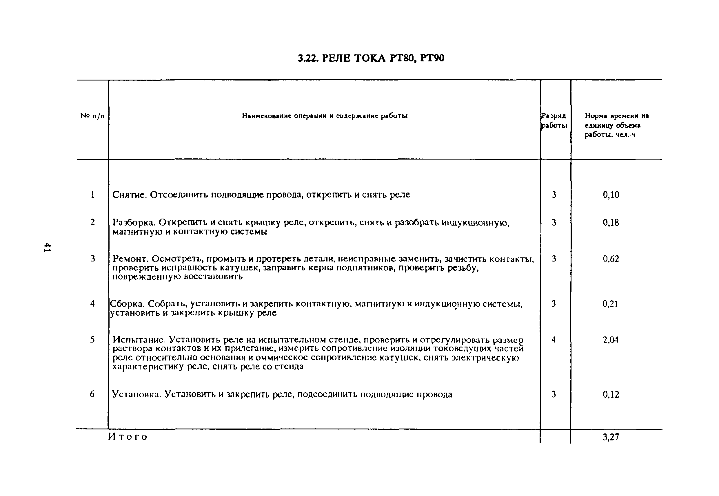 Типовые нормы времени на ремонт пускорегулирующей аппаратуры, релейной защиты и средств автоматики| Статус: | отменен в рф | | Название рус.: | Типовые нормы времени на ремонт пускорегулирующей аппаратуры, релейной защиты и средств автоматики | | Дата добавления в базу: | 01.10.2014 | | Дата актуализации: | 01.01.2021 | | Дата окончания срока действия: | 25.06.2020 | | Область применения: | Нормы рекомендуются для применения в условиях электромеханических цехов, участков предприятий и специализированных ремонтных мастерских отраслей народного хозяйства независимо от их ведомственной подчиненности | | Оглавление: | 1. Общая часть 2. Организация труда 3. Нормативная часть 3.1. Рубильники (переключатели) Р, П 3.2. Рубильники (переключатели) РБ, ПБ 3.3. Рубильники РПБ, РПЦ 3.4. Автоматические выключатели АП-25, АП-50 3.5. Автоматические выключатели А3100, А3700, АЕ2000 3.6. Автоматический выключатель А2050 3.7. Автоматические выключатели АВ, АВМ 3.8. Электромагнитные контакторы КТ6000, КТП6000, КТ7000, КТПВ600, КПВ600, КГП620, МК1, КВ, КГЭ, КП 3.9. Магнитные пускатели ПМЕ, ПА, ПАЕ, МПК, ПМИ, МКР 3.10. Маслонаполненные магнитные пускатели ПМ-700, ПР-700, ММП-1 3.11. Маслонаполненные кнопочные посты управления КУ-700, КУ-700М, КУТ-700М и конечный выключатель ВК-700М 3.12. Пакетные выключатели (переключатели) ПВ, ПВМ, ПП, ППМ 3.13. Универсальный переключатель УП5100 3.14. Ключи управления КВ, КВФ, КФ, КФ3, КСВФ, КСФ 3.15. Кнопки управления КУ, К 3.16. Реле промежуточные ПЭ, ЭП, РГТМ, МКУ-48, РЭВ, РП 3.17. Реле указательные и сигнальные устройства РУ-21, ЭС-41, БРУ-4, СЭ-2 3.18. Реле времени РВ, ЭВ 3.19. Реле времени Е-52, Е-512, Е-513 3.20. Реле напряжения РН, РЭВ, РНБ 3.21. Реле напряжения (обрыва фаз) Е-511 3.22. Реле тока РТ80, РТ90 3.23. Реле тока РТ80, РТ40/Ф, РТ40/1Д, РТ40/Р 3.24. Реле тепловое РГ, ТРП, ТРА, ТРВ, РТН 3.25. Предохранители низковольтные ПР, П 3.26. Работы, встречающиеся при ремонте рубильников 3.27. Работы, встречающиеся при ремонте автоматических выключателей типов АП-25, АП-50 3.28. Работы, встречающиеся при ремонте электромагнитных контакторов серии КП 3.29. Работы, встречающиеся при ремонте магнитных пускателей 3.30. Работы, встречающиеся при ремонте реле 3.31. Ремонт катушки 3.32. Намотка катушки | | Разработан: | ЦБНТ