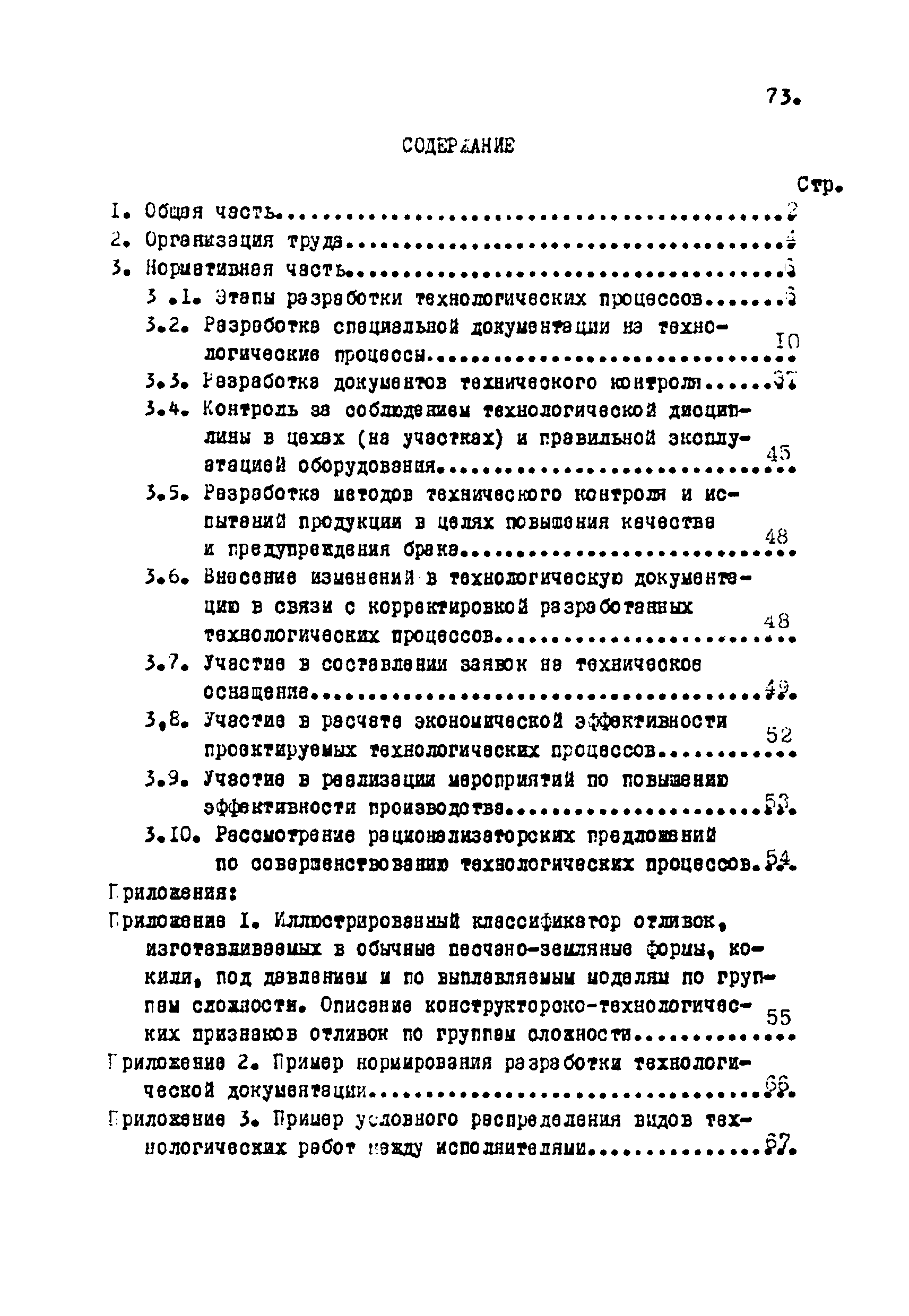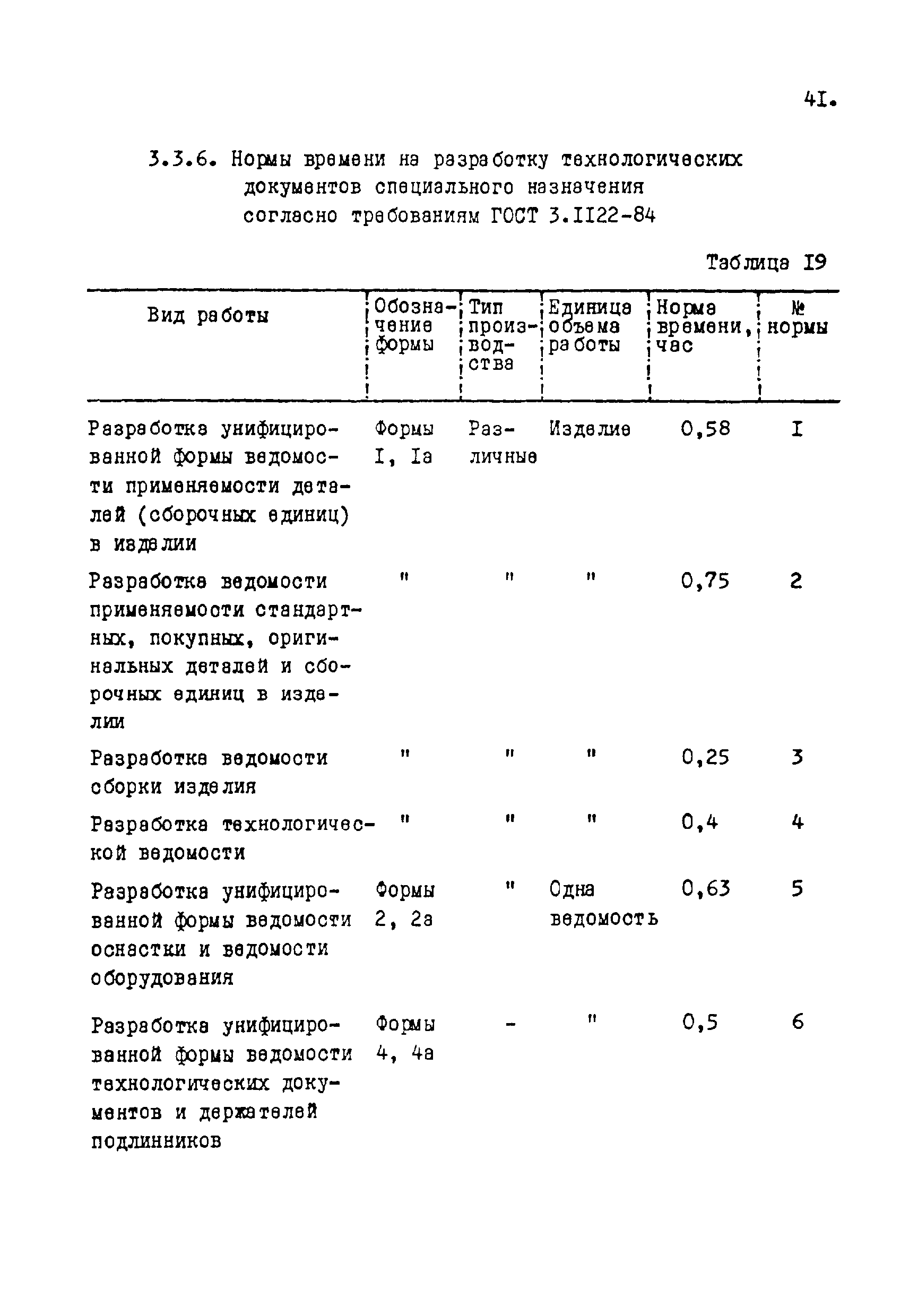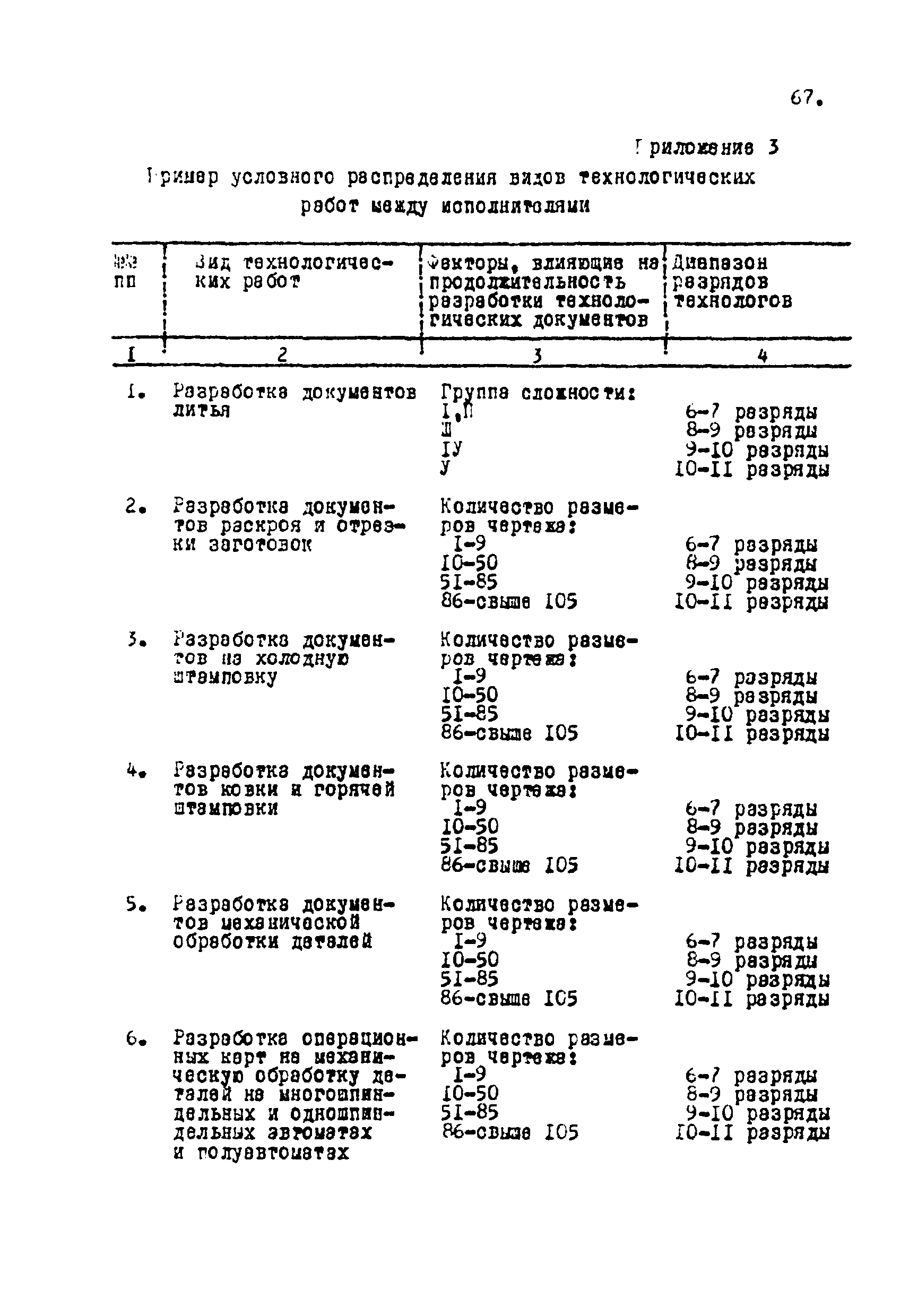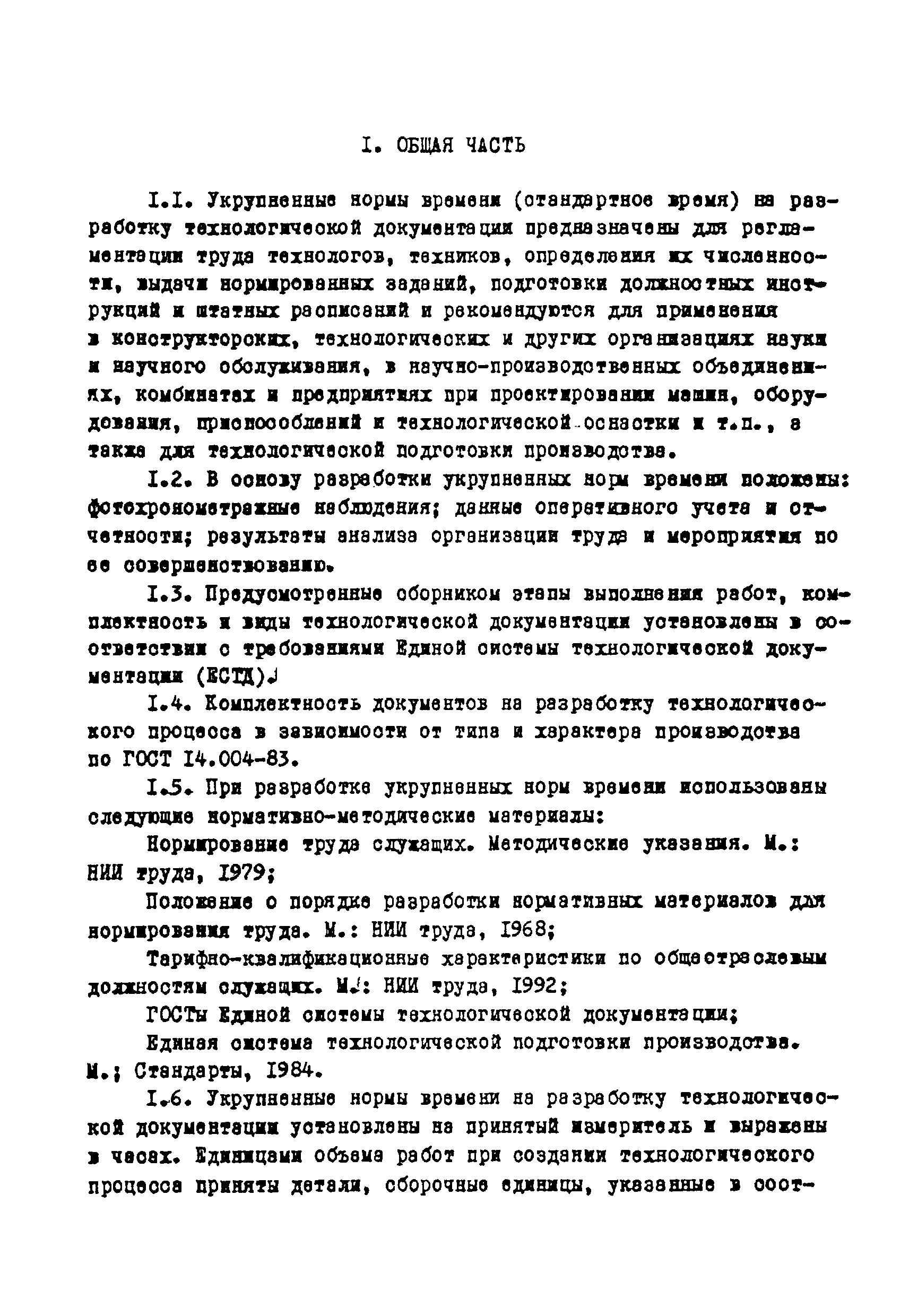 Укрупненные нормы времени на разработку технологической документации| Статус: | не установлен срок действия | | Название рус.: | Укрупненные нормы времени на разработку технологической документации | | Дата добавления в базу: | 01.10.2014 | | Дата актуализации: | 01.01.2021 | | Область применения: | Укрупненные нормы времени (стандартное время) на разработку технологической документация предназначены для регламентации труда технологов, техников, определения их численности, выдачи нормированных заданий, подготовки должностных инструкций и штатных расписаний и рекомендуются для применения конструкторских, технологических и других организациях науки и научного обслуживания, в научно-производственных объединениях, комбинатах и предприятиях при проектировании машин, оборудования, приспособлений и технологической оснастки и т.п., а также для технологической подготовки производства. | | Оглавление: | 1 Общая часть 2 Организация труда 3 Нормативная часть 3.1. Этапы разработки технологических процессов 3.2. Разработка специальной документации на технологические процессы 3.3. Разработка документов технического контроля 3.4. Контроль за соблюдением технологической дисциплины в цехах (на участках) и правильной эксплуатации оборудования 3.5. Разработка методов технического контроля и испытаний продукции в целях повышения качества и предупреждения брака 3.6. Внесение изменений в технологическую документацию в связи с корректировкой разработанных технологических процессов 3.7. Участие в составлении заявок на техническое оснащение 3.8. Участие в расчете экономической эффективности проектируемых технологических процессов 3.9. Участие в реализации мероприятий по повышению эффективности производства 3.10. Рассмотрение рационализаторских предложений по совершенствованию технологических процессов Приложение 1 Иллюстрированный классификатор отливок, изготавливаемых в обычные песчано-земляные формы, кокили, под давлением и по выплавляемым моделям по грунтам сложности. Описание конструкторско-технологических признаков отливок по группам сложности Приложение 2. Пример нормирования разработки технологической документации Приложение 3. Пример условного распределения видов технологических работ между исполнителями Приложение 4. Примерный перечень средств оснащения рабочего места технолога Приложение 5. Пример расчета численности технологов технического отдела Приложение 6. Пример Классификатора изделий | | Разработан: | ЦБНТ