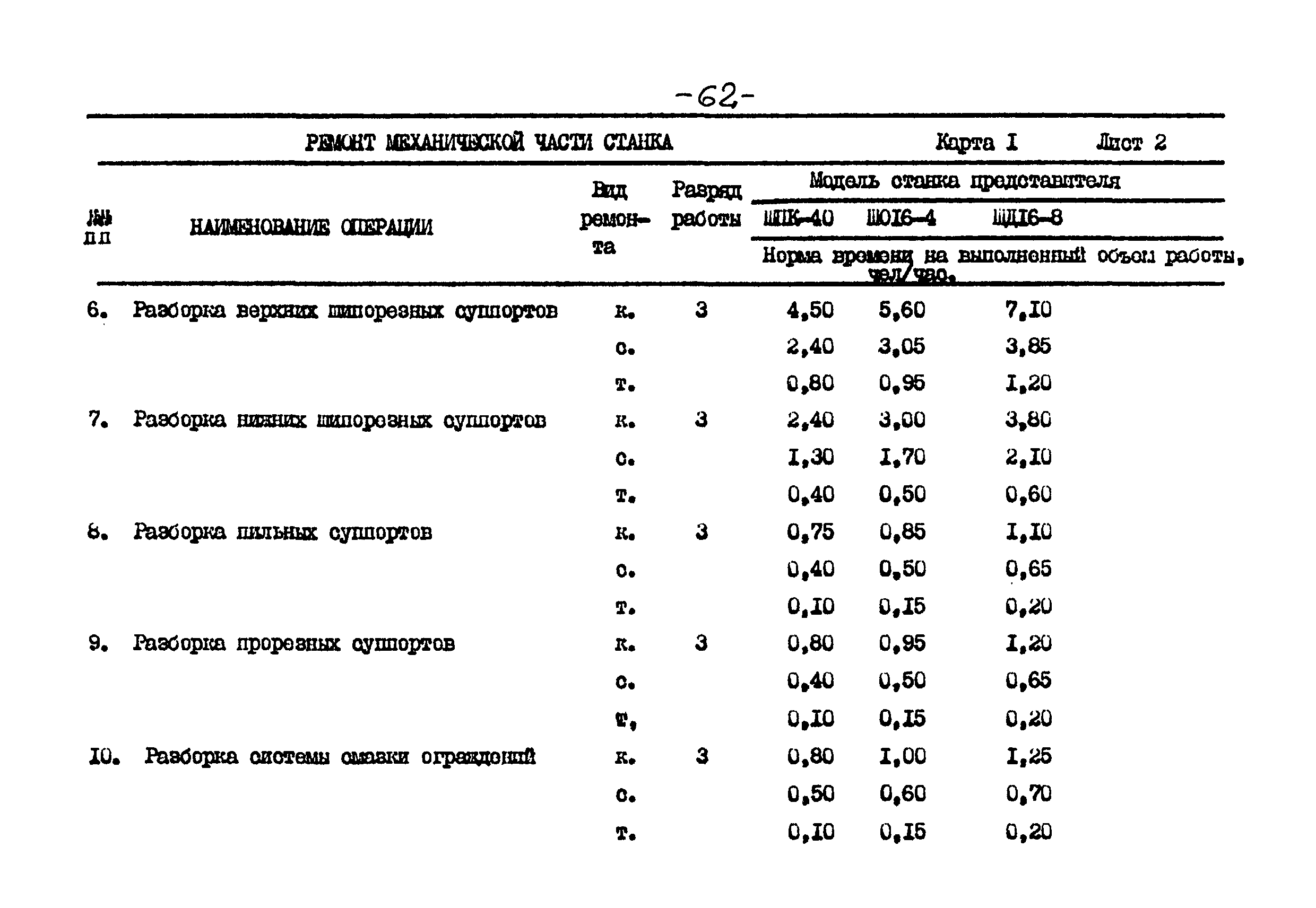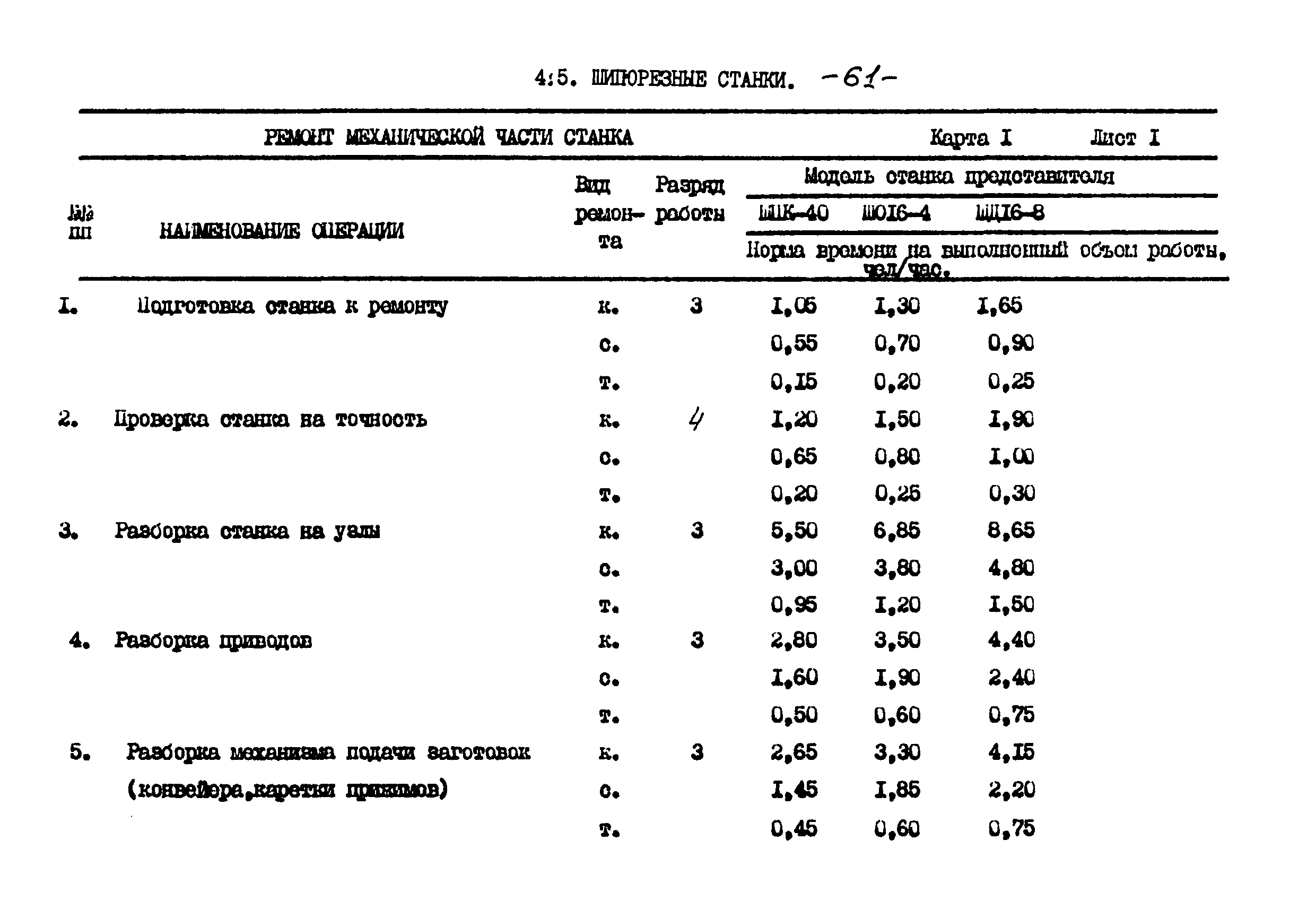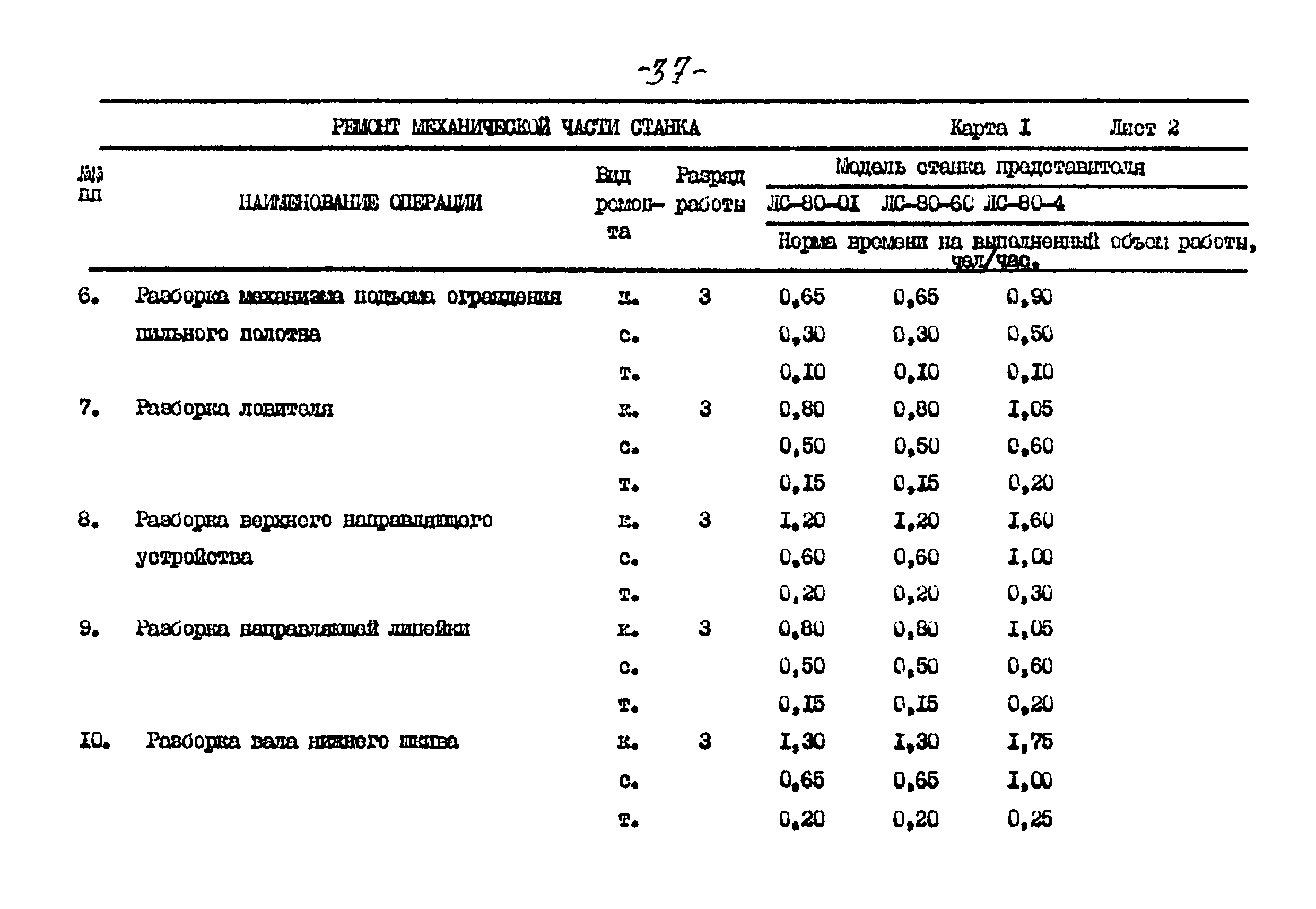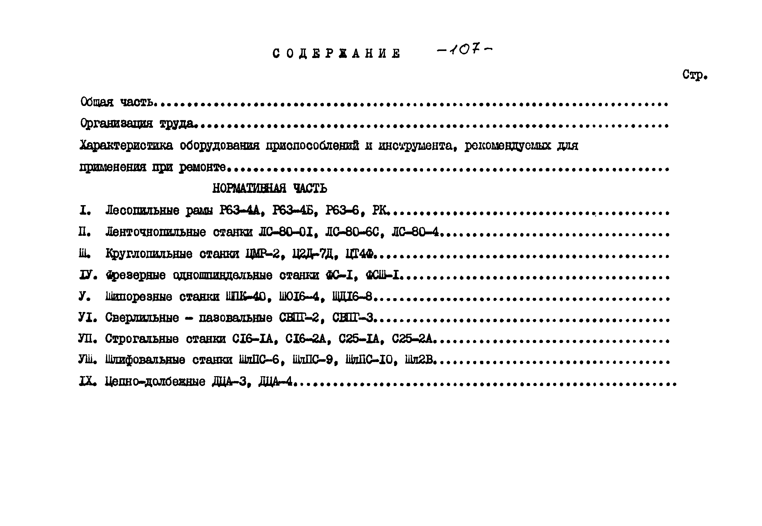 | Оглавление: | Общая часть Организация труда Характеристика оборудования приспособлений и инструмента, рекомендуемых для применения при ремонте Нормативная часть 1 Лесопильные рамы Р63-4А, Р63-4Б, Р63-6, РК 2 Ленточнопильные станки ЛС-80-01, ЛС-80-6С, ЛС-80-4 3 Круглопильные станки ЦМР-2, Ц2Д-7Д, ЦТ4Ф 4 Фрезерные одношпиндельные станки ФС-1, ФСШ-1 5 Шипорезные станки ШПК-40, ШО16-4, ШД16-8 6 Сверлильные-пазовальные СВПГ-2, СВПГ-3 7 Строгальные станки С16-1А, С16-2А, С25-1А, С25-2А 8 Шлифовальные станки ШлПС-6, ШлПС-9, ШлПС-10, Шл2В 9. Цепно-долбежные ДЦА-3, ДЦА-4 |