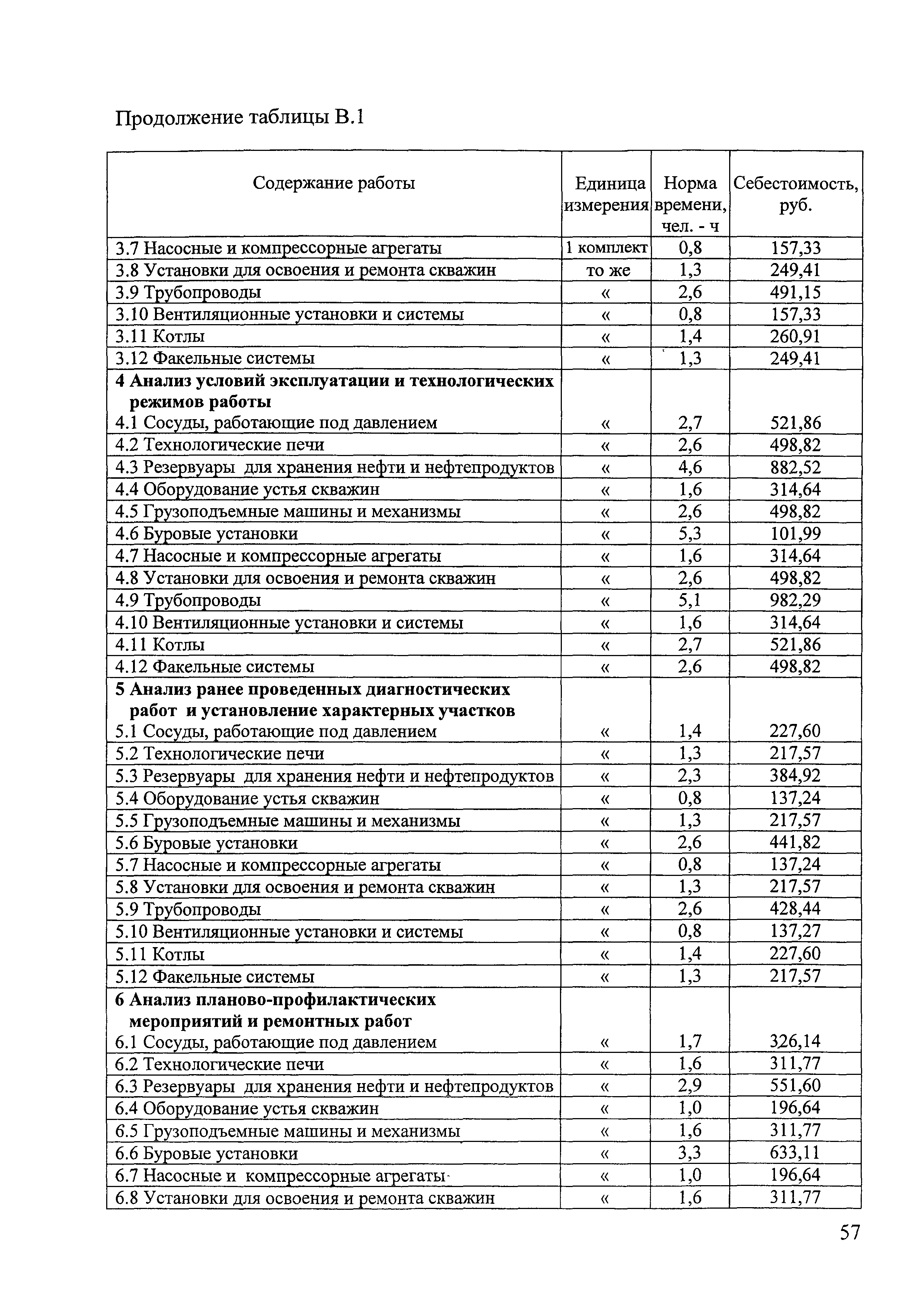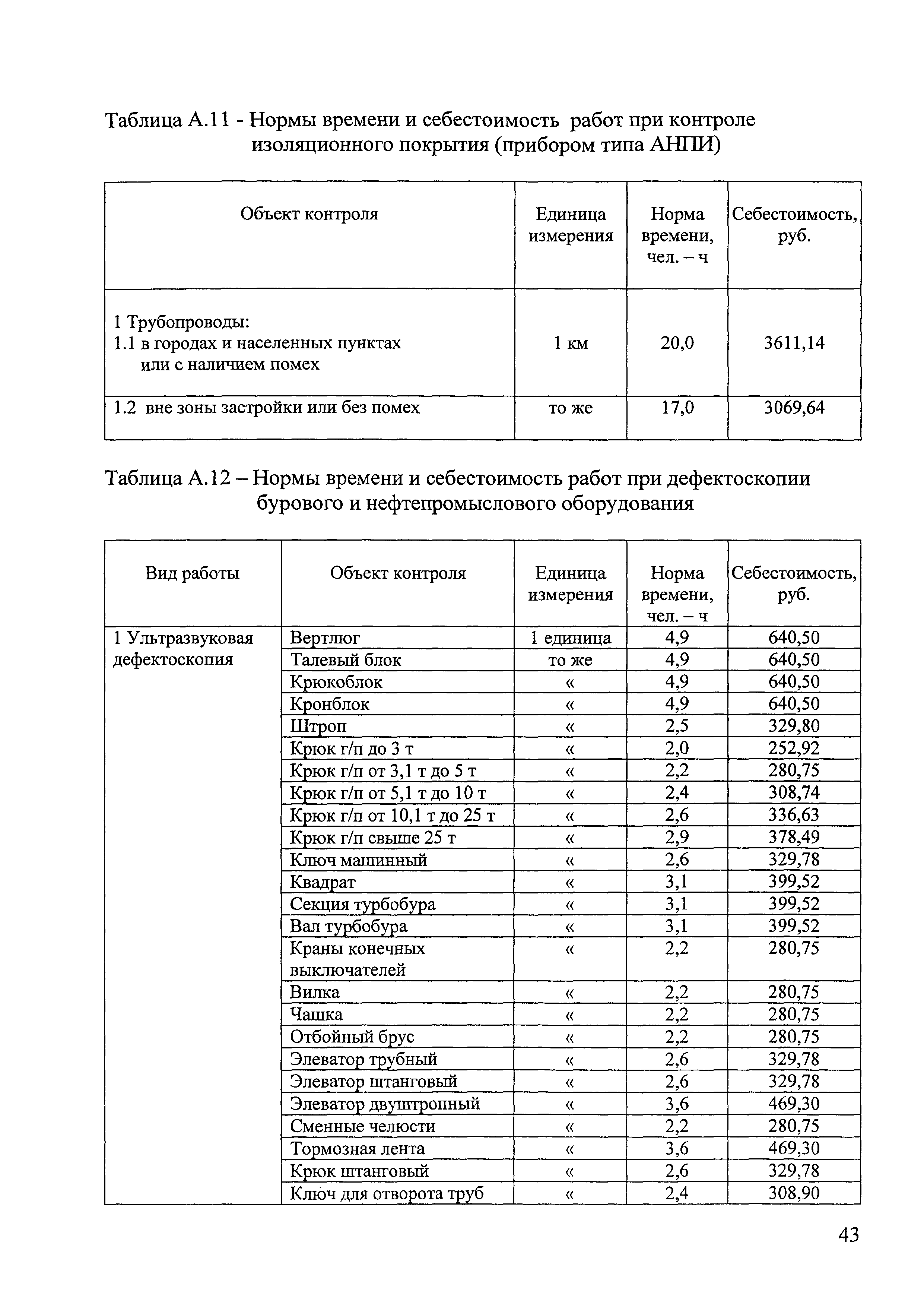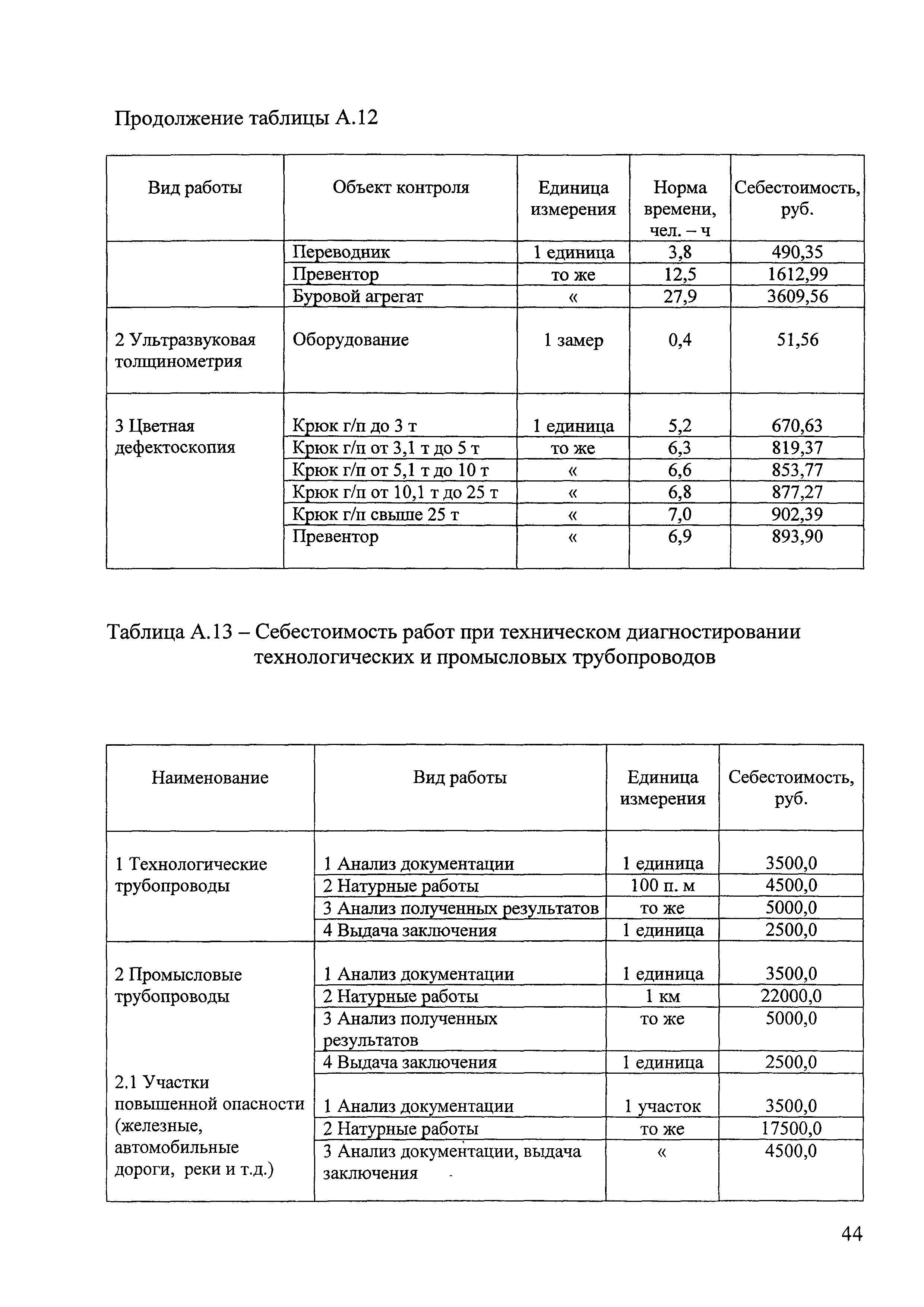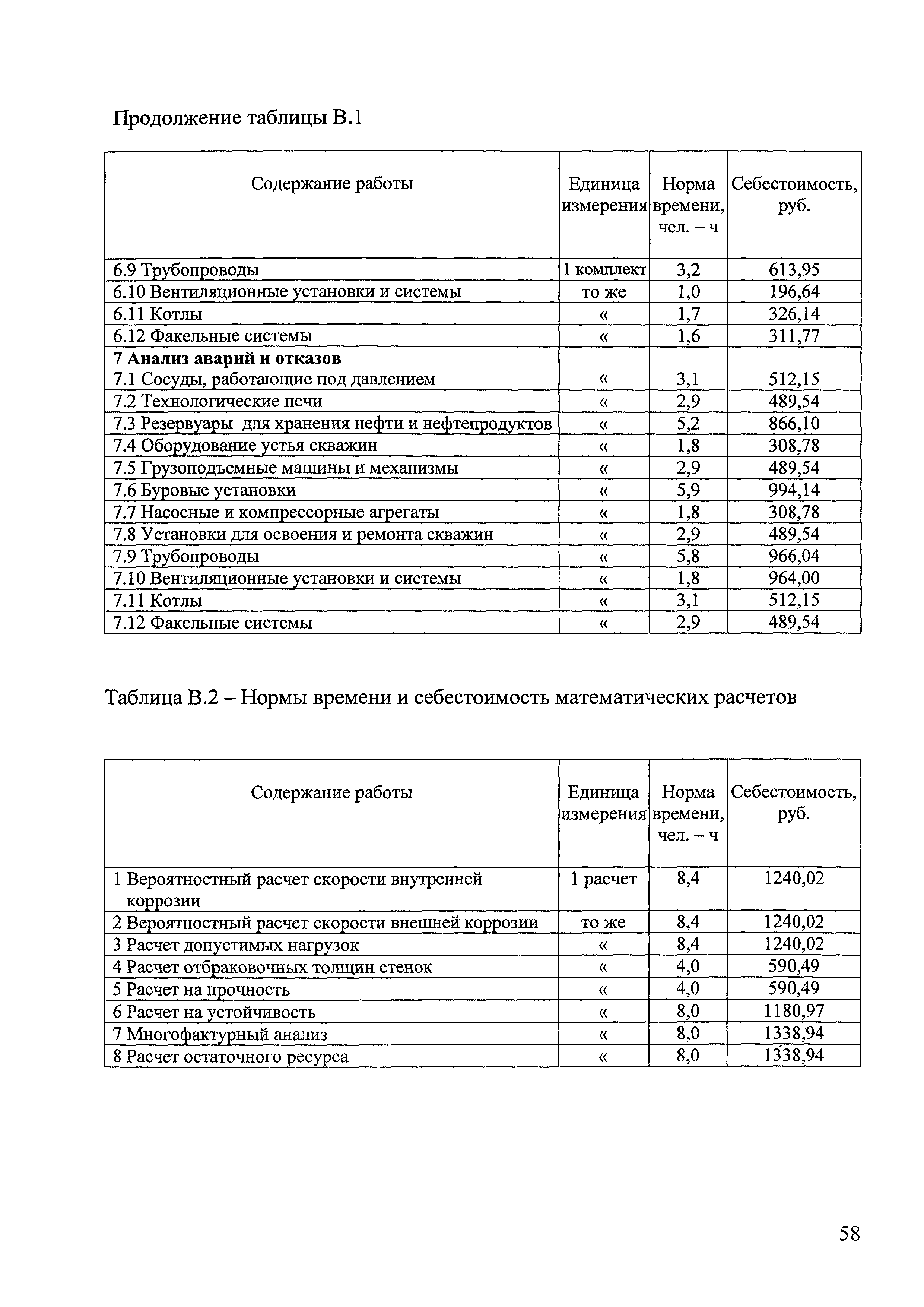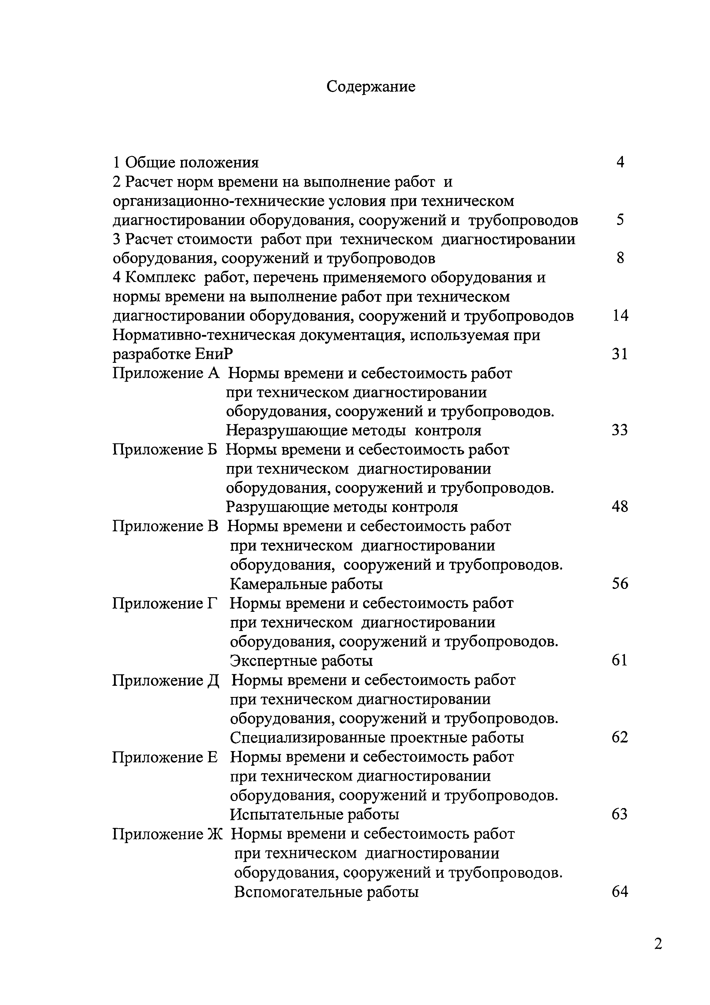 | Оглавление: | 1 Общие положения 2 Расчет норм времени на выполнение работ и организационно-технические условия при техническом диагностировании оборудования, сооружений и трубопроводов 3 Расчет стоимости работ при техническом диагностировании оборудования, сооружений и трубопроводов 4 Комплекс работ, перечень применяемого оборудования и нормы времени на выполнение работ при техническом диагностировании оборудования, сооружений и трубопроводов Нормативно-техническая документация, используемая при разработке ЕниР Приложение А. Нормы времени и себестоимость работ при техническом диагностировании оборудования, сооружений и трубопроводов. Неразрушающие методы контроля Приложение Б. Нормы времени и себестоимость работ при техническом диагностировании оборудования, сооружений и трубопроводов. Разрушающие методы контроля Приложение В. Нормы времени и себестоимость работ при техническом диагностировании оборудования, сооружений и трубопроводов. Камеральные работы Приложение Г. Нормы времени и себестоимость работ при техническом диагностировании оборудования, сооружений и трубопроводов. Экспертные работы Приложение Д. Нормы времени и себестоимость работ при техническом диагностировании оборудования, сооружений и трубопроводов. Специализированные проектные работы Нормы времени и себестоимость работ при техническом диагностировании оборудования, сооружений и трубопроводов. Испытательные работы Нормы времени и себестоимость Приложение Е. Нормы времени и себестоимость работ при техническом диагностировании оборудования, сооружений и трубопроводов. Испытательные работы Приложение Ж. Нормы времени и себестоимость работ при техническом диагностировании оборудования, сооружений и трубопроводов. Вспомогательные работы Приложение И. Нормы времени и себестоимость работ при техническом диагностировании оборудования, сооружений и трубопроводов. Вибродиагностика Приложение К. Нормы времени и себестоимость работ при техническом диагностировании оборудования, сооружений и трубопроводов. Изыскательские и исследовательские работы Приложение Л. Себестоимость работ при обследовании зданий и сооружений промышленного назначения Приложение М. Нормы времени и себестоимость работ по обследованию, испытанию, наладке вентиляционных установок Приложение Н. Нормы времени и себестоимость работ по обследованию, испытанию, наладке вентиляционных систем Приложение П. Себестоимость работ при входном контроле оборудования и материалов Приложение Р. Себестоимость работы аварийной бригады Приложение С. Себестоимость учебно-аттестационной работы |