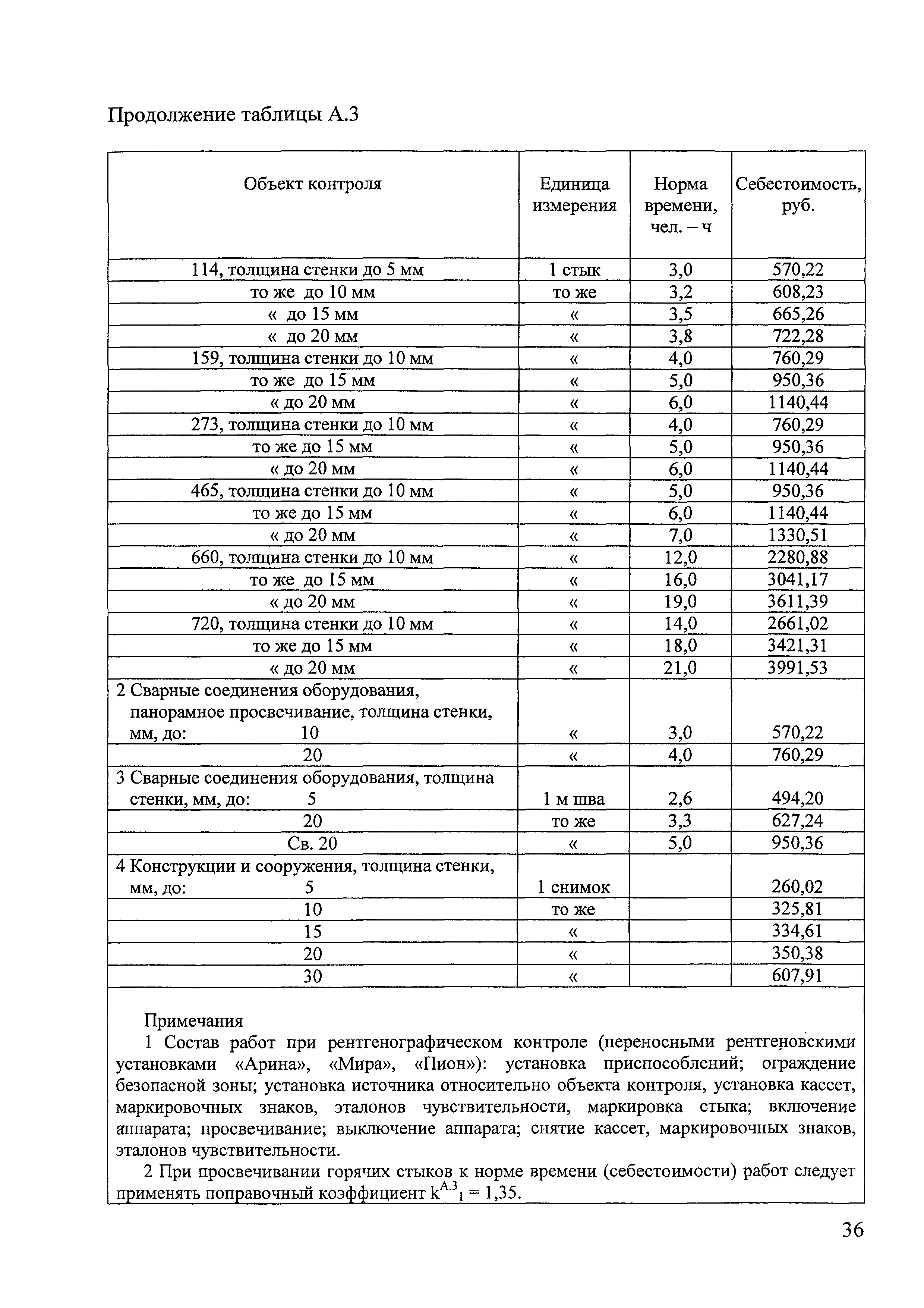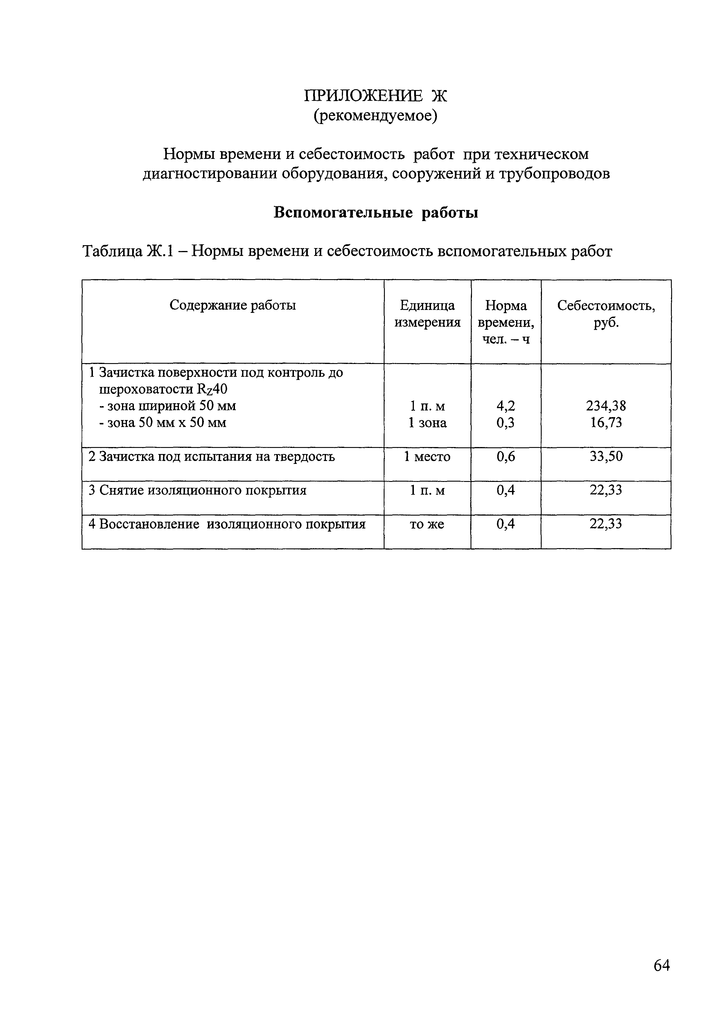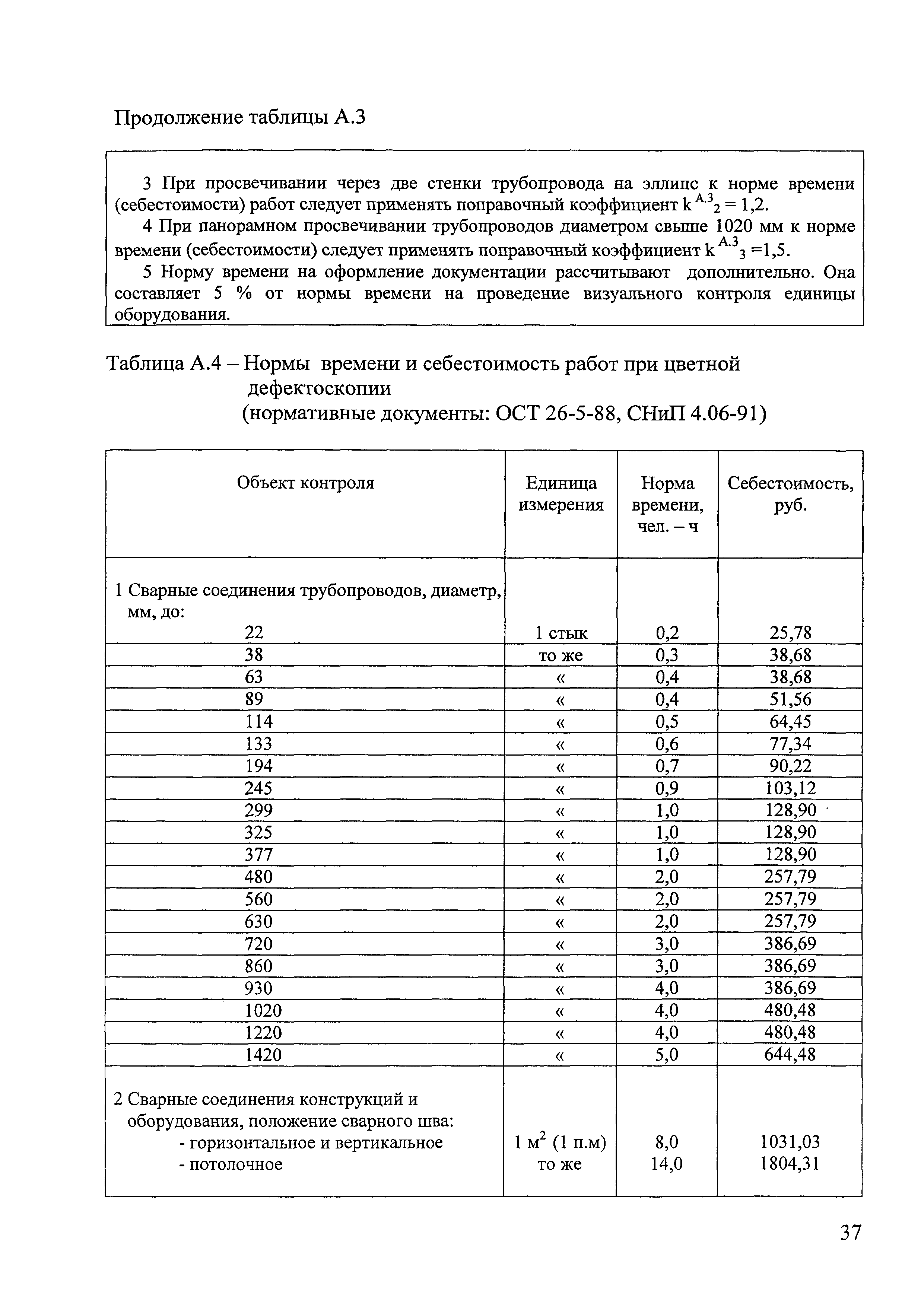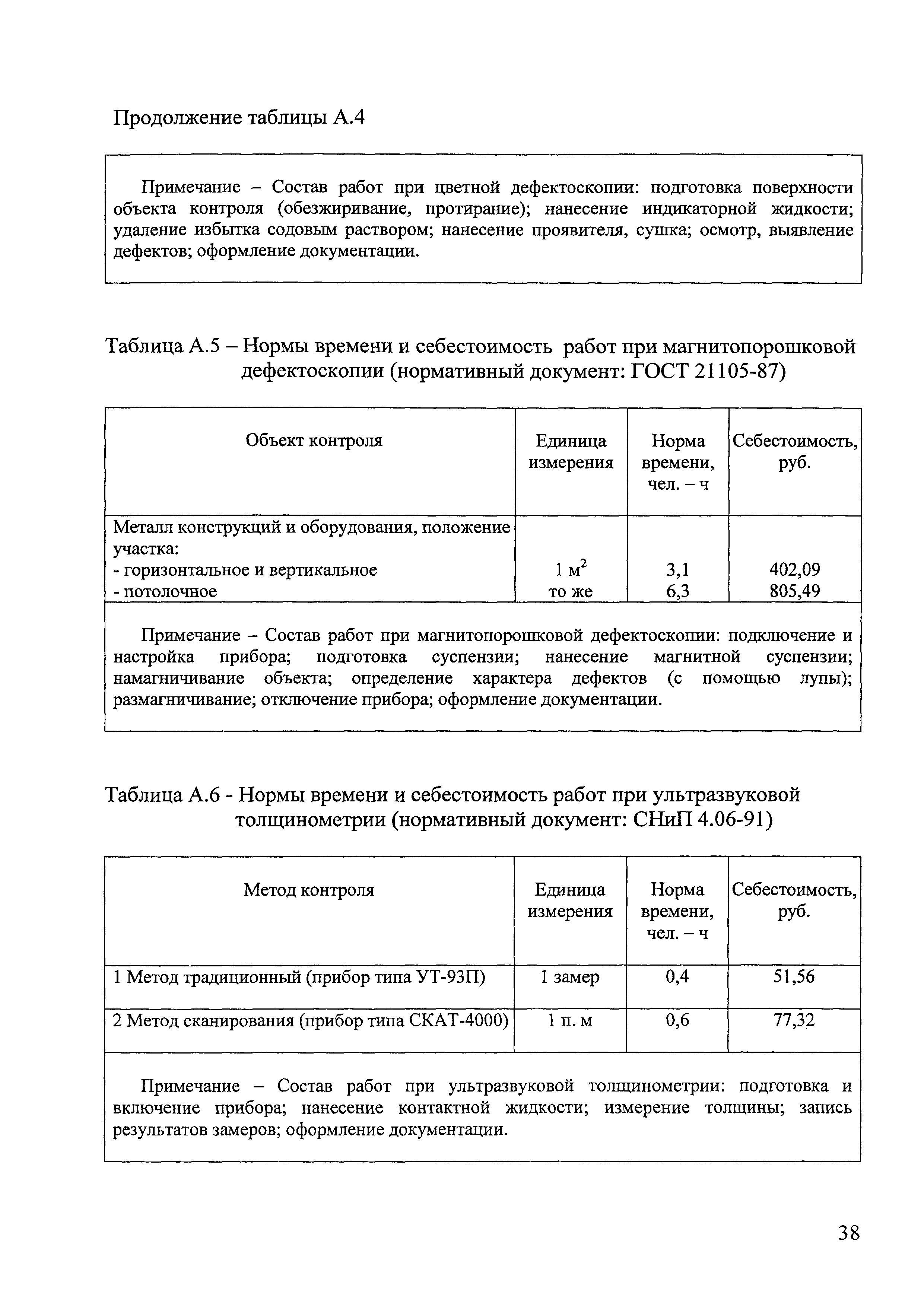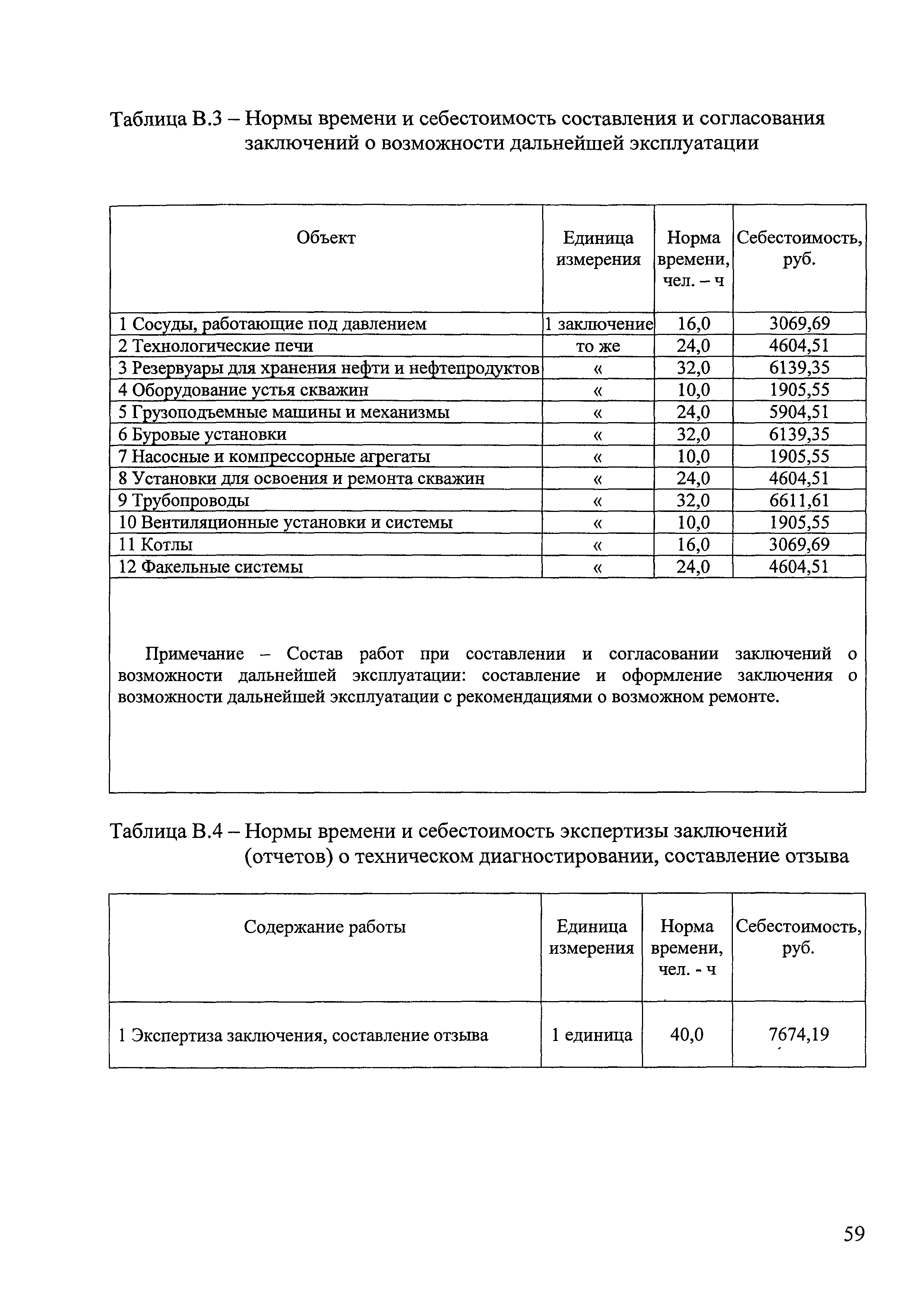 | Оглавление: | 1 Общие положения 2 Расчет норм времени на выполнение работ и организационно-технические условия при техническом диагностировании оборудования, сооружений и трубопроводов 3 Расчет стоимости работ при техническом диагностировании оборудования, сооружений и трубопроводов 4 Комплекс работ, перечень применяемого оборудования и нормы времени на выполнение работ при техническом диагностировании оборудования, сооружений и трубопроводов Нормативно-техническая документация, используемая при разработке ЕниР Приложение А. Нормы времени и себестоимость работ при техническом диагностировании оборудования, сооружений и трубопроводов. Неразрушающие методы контроля Приложение Б. Нормы времени и себестоимость работ при техническом диагностировании оборудования, сооружений и трубопроводов. Разрушающие методы контроля Приложение В. Нормы времени и себестоимость работ при техническом диагностировании оборудования, сооружений и трубопроводов. Камеральные работы Приложение Г. Нормы времени и себестоимость работ при техническом диагностировании оборудования, сооружений и трубопроводов. Экспертные работы Приложение Д. Нормы времени и себестоимость работ при техническом диагностировании оборудования, сооружений и трубопроводов. Специализированные проектные работы Нормы времени и себестоимость работ при техническом диагностировании оборудования, сооружений и трубопроводов. Испытательные работы Нормы времени и себестоимость Приложение Е. Нормы времени и себестоимость работ при техническом диагностировании оборудования, сооружений и трубопроводов. Испытательные работы Приложение Ж. Нормы времени и себестоимость работ при техническом диагностировании оборудования, сооружений и трубопроводов. Вспомогательные работы Приложение И. Нормы времени и себестоимость работ при техническом диагностировании оборудования, сооружений и трубопроводов. Вибродиагностика Приложение К. Нормы времени и себестоимость работ при техническом диагностировании оборудования, сооружений и трубопроводов. Изыскательские и исследовательские работы Приложение Л. Себестоимость работ при обследовании зданий и сооружений промышленного назначения Приложение М. Нормы времени и себестоимость работ по обследованию, испытанию, наладке вентиляционных установок Приложение Н. Нормы времени и себестоимость работ по обследованию, испытанию, наладке вентиляционных систем Приложение П. Себестоимость работ при входном контроле оборудования и материалов Приложение Р. Себестоимость работы аварийной бригады Приложение С. Себестоимость учебно-аттестационной работы |