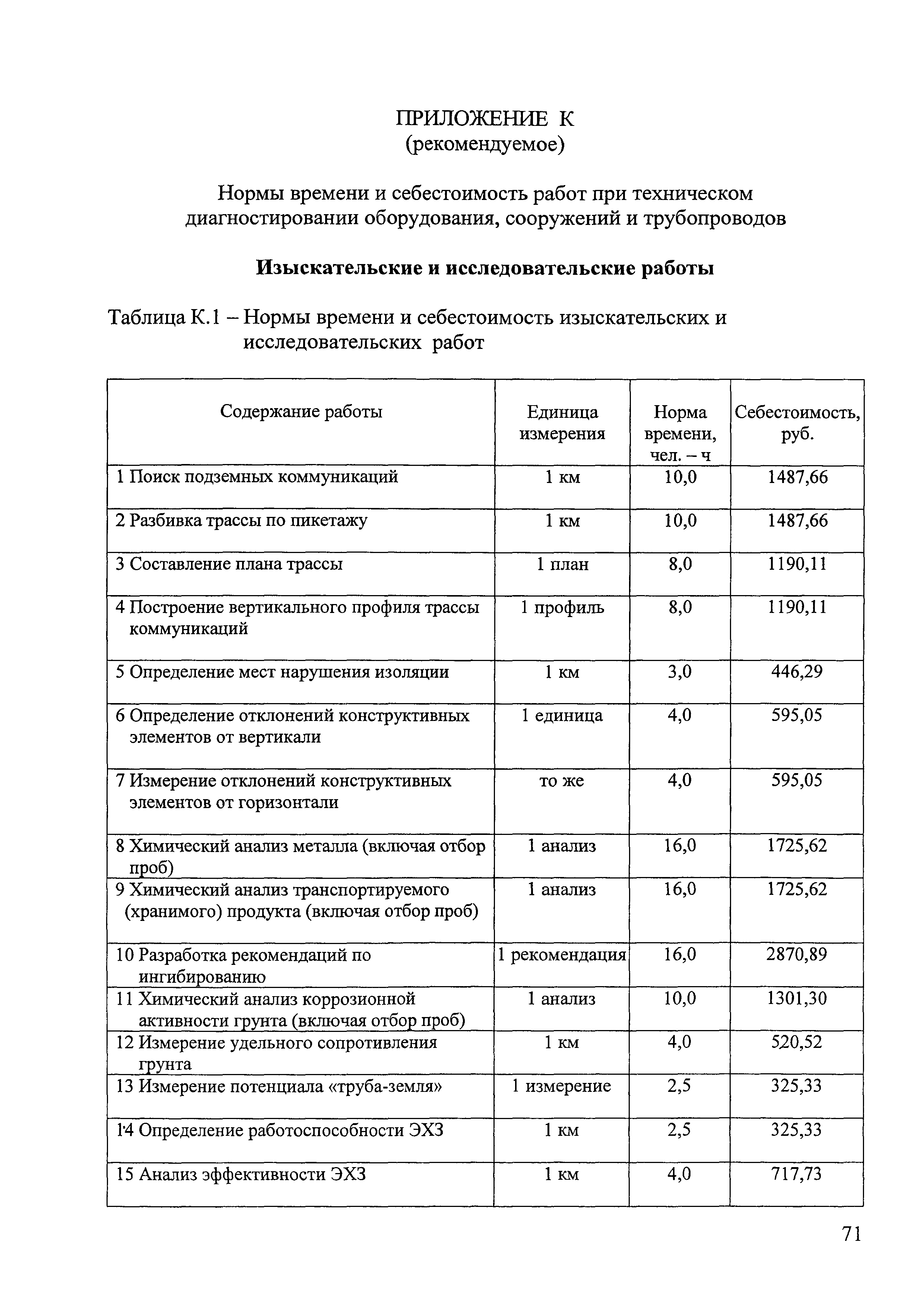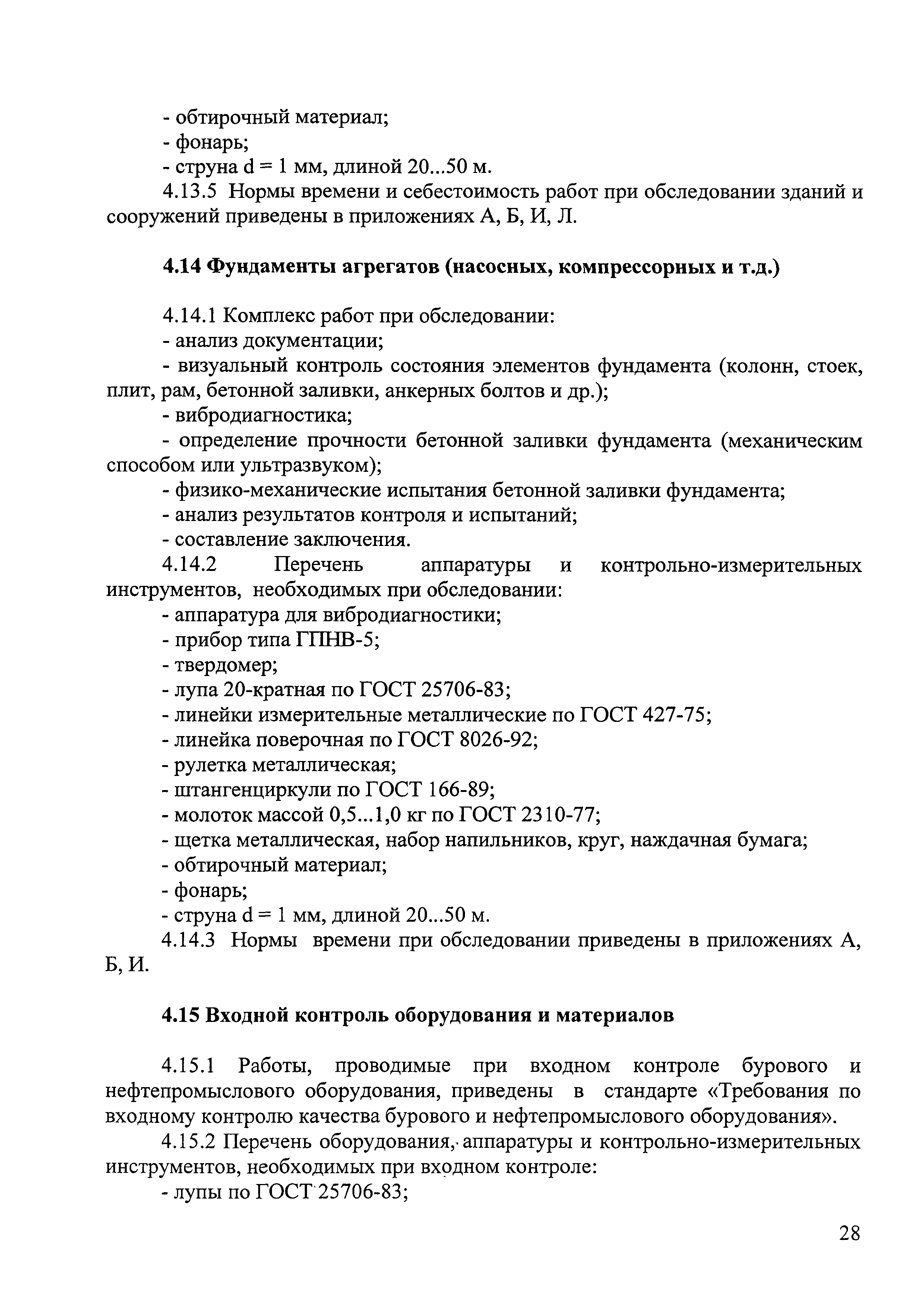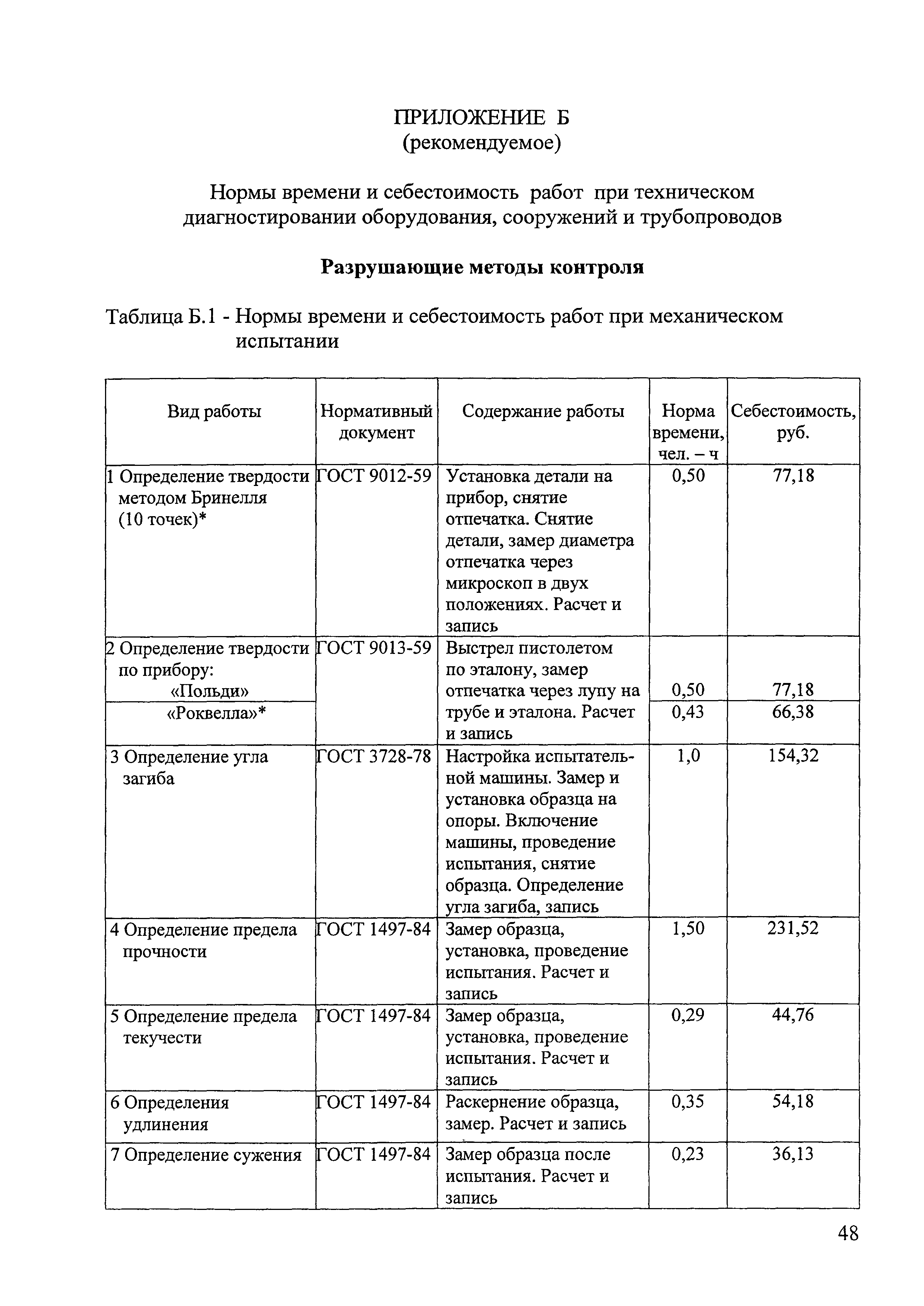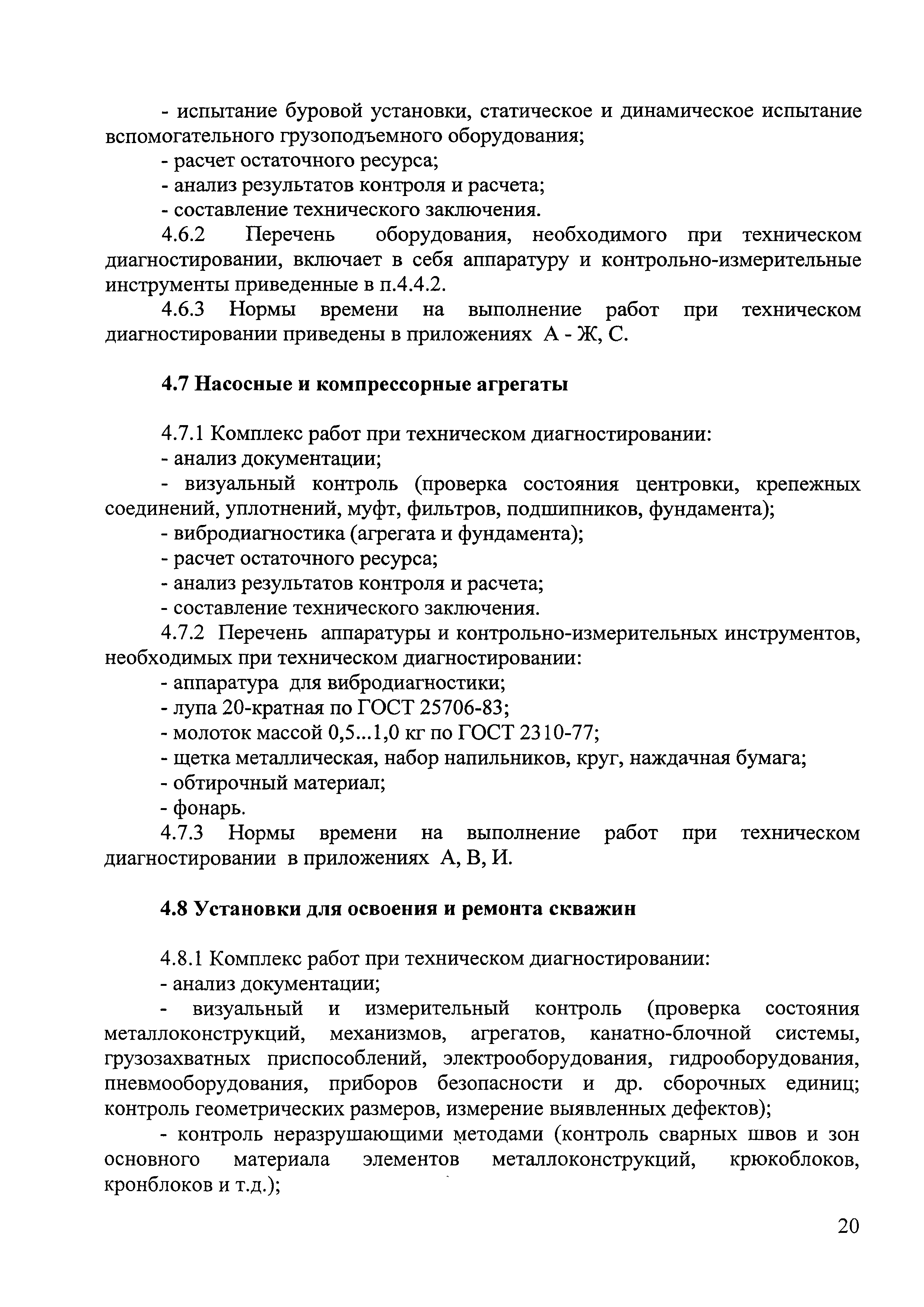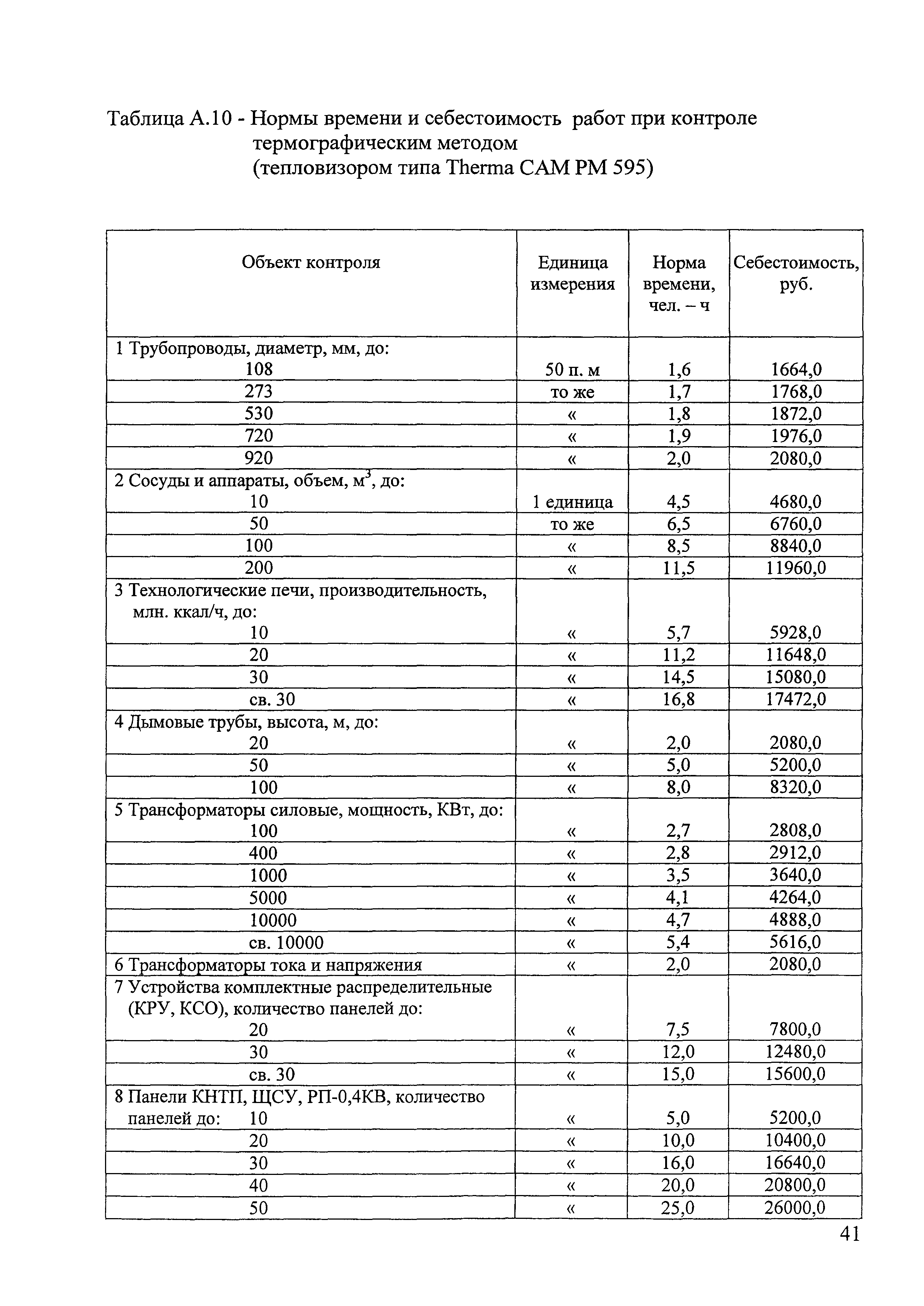 | Оглавление: | 1 Общие положения 2 Расчет норм времени на выполнение работ и организационно-технические условия при техническом диагностировании оборудования, сооружений и трубопроводов 3 Расчет стоимости работ при техническом диагностировании оборудования, сооружений и трубопроводов 4 Комплекс работ, перечень применяемого оборудования и нормы времени на выполнение работ при техническом диагностировании оборудования, сооружений и трубопроводов Нормативно-техническая документация, используемая при разработке ЕниР Приложение А. Нормы времени и себестоимость работ при техническом диагностировании оборудования, сооружений и трубопроводов. Неразрушающие методы контроля Приложение Б. Нормы времени и себестоимость работ при техническом диагностировании оборудования, сооружений и трубопроводов. Разрушающие методы контроля Приложение В. Нормы времени и себестоимость работ при техническом диагностировании оборудования, сооружений и трубопроводов. Камеральные работы Приложение Г. Нормы времени и себестоимость работ при техническом диагностировании оборудования, сооружений и трубопроводов. Экспертные работы Приложение Д. Нормы времени и себестоимость работ при техническом диагностировании оборудования, сооружений и трубопроводов. Специализированные проектные работы Нормы времени и себестоимость работ при техническом диагностировании оборудования, сооружений и трубопроводов. Испытательные работы Нормы времени и себестоимость Приложение Е. Нормы времени и себестоимость работ при техническом диагностировании оборудования, сооружений и трубопроводов. Испытательные работы Приложение Ж. Нормы времени и себестоимость работ при техническом диагностировании оборудования, сооружений и трубопроводов. Вспомогательные работы Приложение И. Нормы времени и себестоимость работ при техническом диагностировании оборудования, сооружений и трубопроводов. Вибродиагностика Приложение К. Нормы времени и себестоимость работ при техническом диагностировании оборудования, сооружений и трубопроводов. Изыскательские и исследовательские работы Приложение Л. Себестоимость работ при обследовании зданий и сооружений промышленного назначения Приложение М. Нормы времени и себестоимость работ по обследованию, испытанию, наладке вентиляционных установок Приложение Н. Нормы времени и себестоимость работ по обследованию, испытанию, наладке вентиляционных систем Приложение П. Себестоимость работ при входном контроле оборудования и материалов Приложение Р. Себестоимость работы аварийной бригады Приложение С. Себестоимость учебно-аттестационной работы |