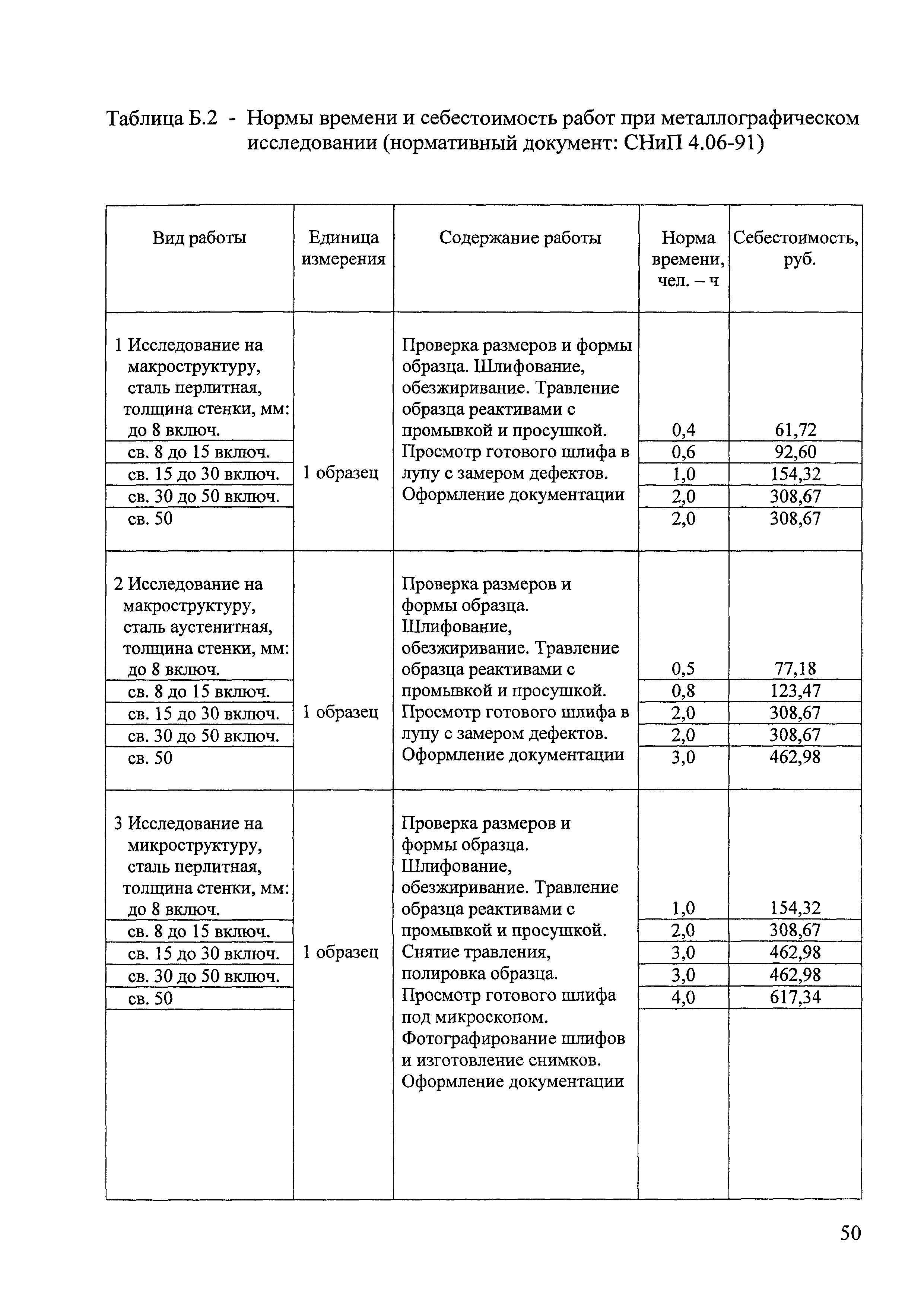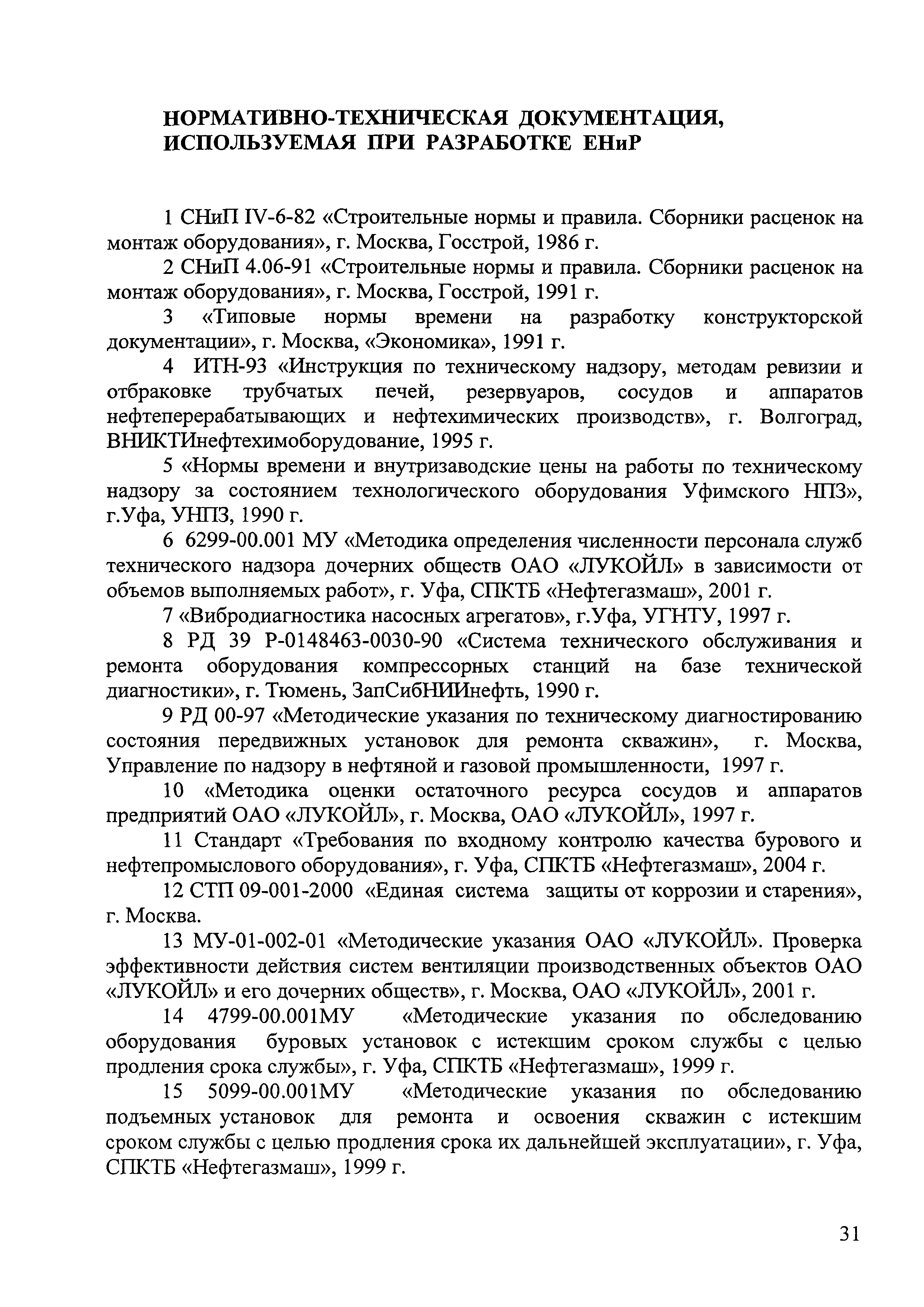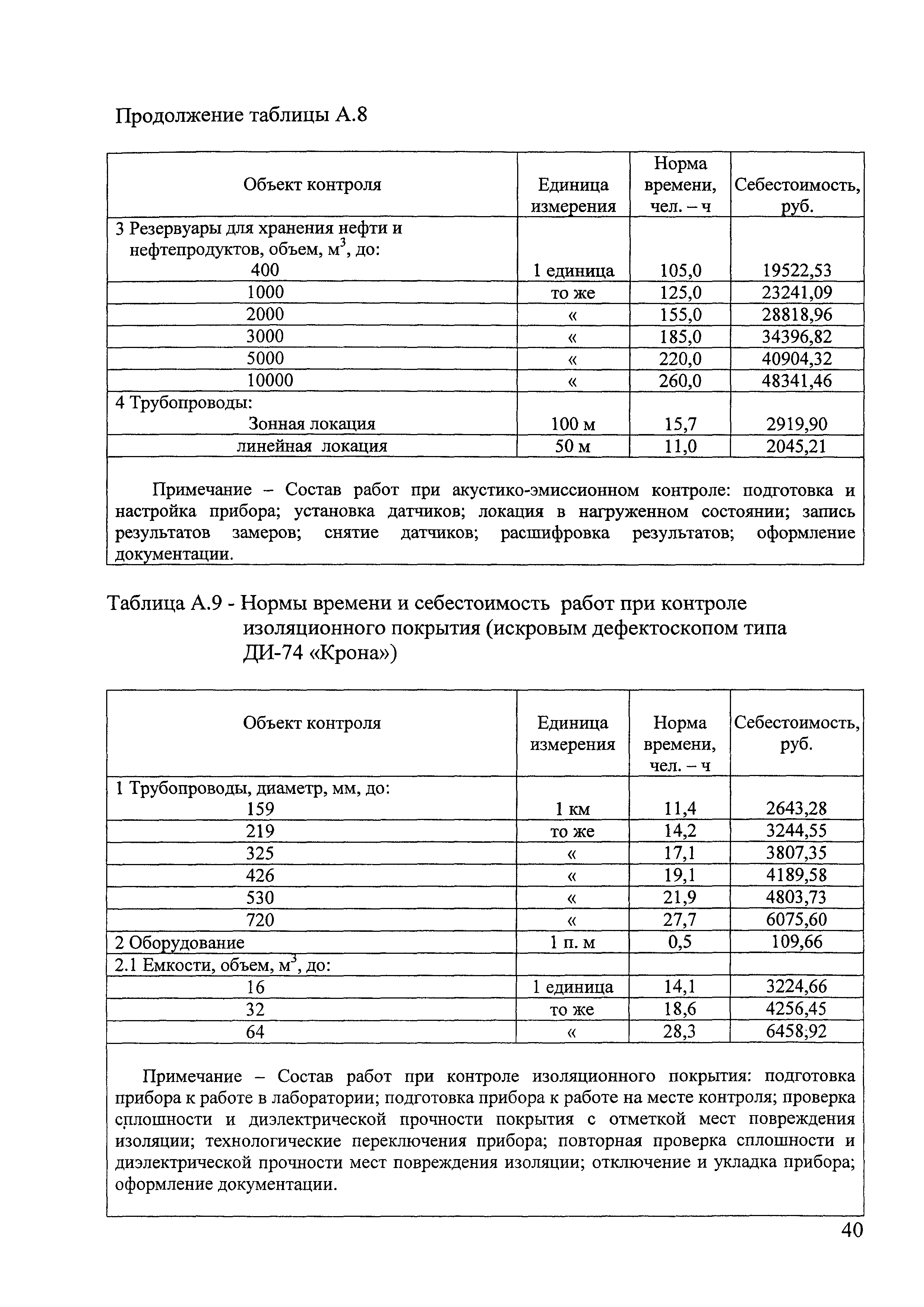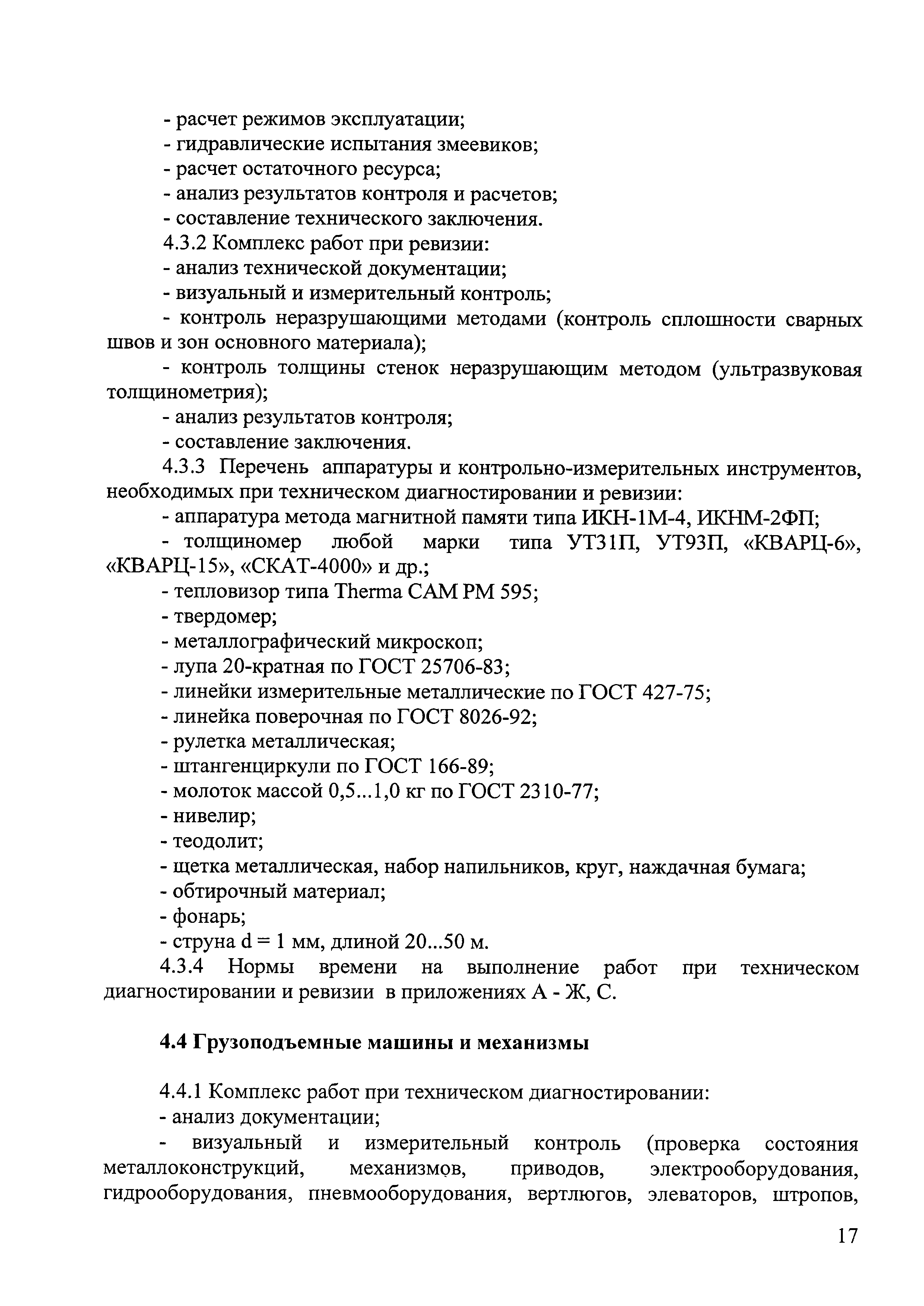 | Оглавление: | 1 Общие положения 2 Расчет норм времени на выполнение работ и организационно-технические условия при техническом диагностировании оборудования, сооружений и трубопроводов 3 Расчет стоимости работ при техническом диагностировании оборудования, сооружений и трубопроводов 4 Комплекс работ, перечень применяемого оборудования и нормы времени на выполнение работ при техническом диагностировании оборудования, сооружений и трубопроводов Нормативно-техническая документация, используемая при разработке ЕниР Приложение А. Нормы времени и себестоимость работ при техническом диагностировании оборудования, сооружений и трубопроводов. Неразрушающие методы контроля Приложение Б. Нормы времени и себестоимость работ при техническом диагностировании оборудования, сооружений и трубопроводов. Разрушающие методы контроля Приложение В. Нормы времени и себестоимость работ при техническом диагностировании оборудования, сооружений и трубопроводов. Камеральные работы Приложение Г. Нормы времени и себестоимость работ при техническом диагностировании оборудования, сооружений и трубопроводов. Экспертные работы Приложение Д. Нормы времени и себестоимость работ при техническом диагностировании оборудования, сооружений и трубопроводов. Специализированные проектные работы Нормы времени и себестоимость работ при техническом диагностировании оборудования, сооружений и трубопроводов. Испытательные работы Нормы времени и себестоимость Приложение Е. Нормы времени и себестоимость работ при техническом диагностировании оборудования, сооружений и трубопроводов. Испытательные работы Приложение Ж. Нормы времени и себестоимость работ при техническом диагностировании оборудования, сооружений и трубопроводов. Вспомогательные работы Приложение И. Нормы времени и себестоимость работ при техническом диагностировании оборудования, сооружений и трубопроводов. Вибродиагностика Приложение К. Нормы времени и себестоимость работ при техническом диагностировании оборудования, сооружений и трубопроводов. Изыскательские и исследовательские работы Приложение Л. Себестоимость работ при обследовании зданий и сооружений промышленного назначения Приложение М. Нормы времени и себестоимость работ по обследованию, испытанию, наладке вентиляционных установок Приложение Н. Нормы времени и себестоимость работ по обследованию, испытанию, наладке вентиляционных систем Приложение П. Себестоимость работ при входном контроле оборудования и материалов Приложение Р. Себестоимость работы аварийной бригады Приложение С. Себестоимость учебно-аттестационной работы |