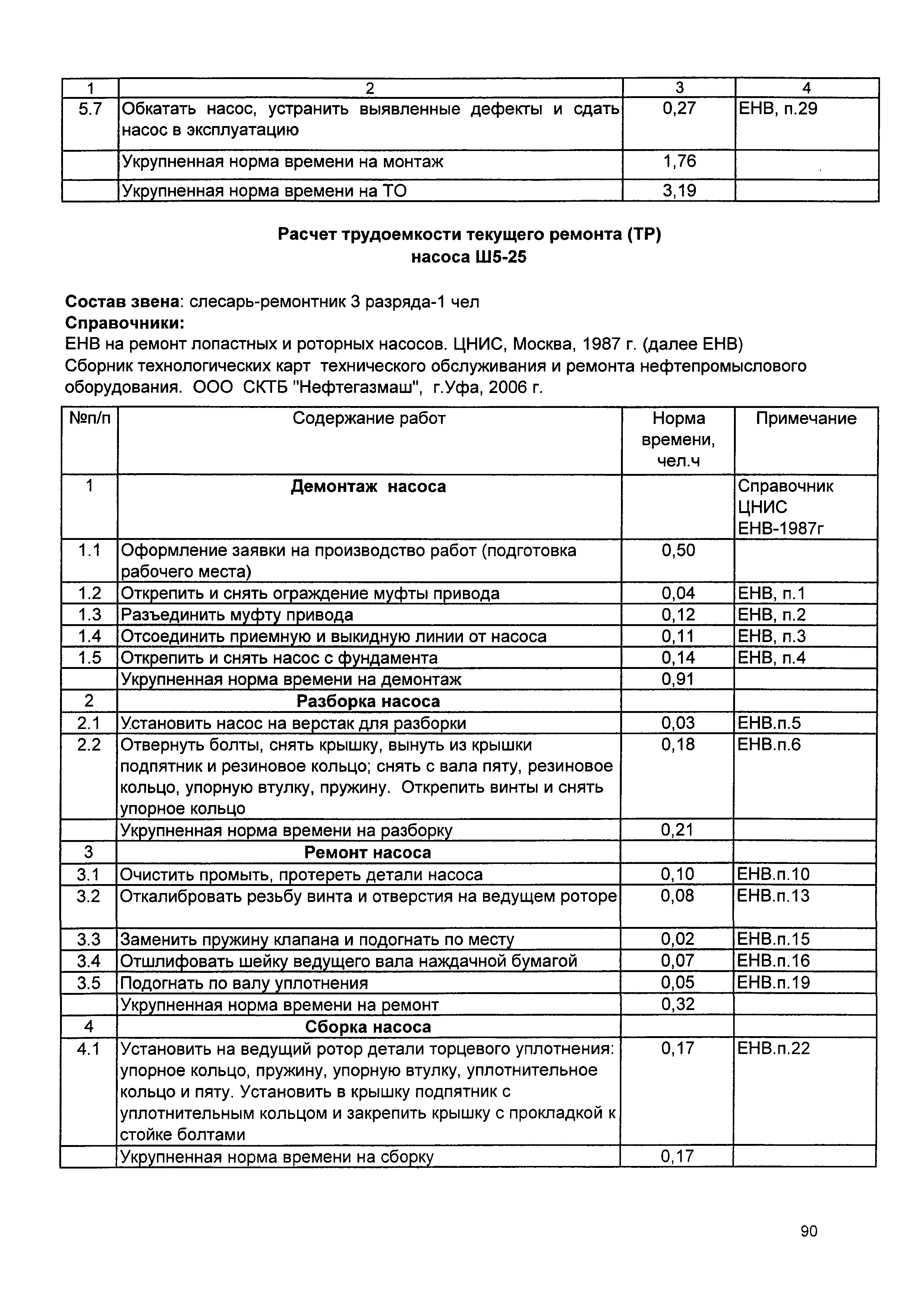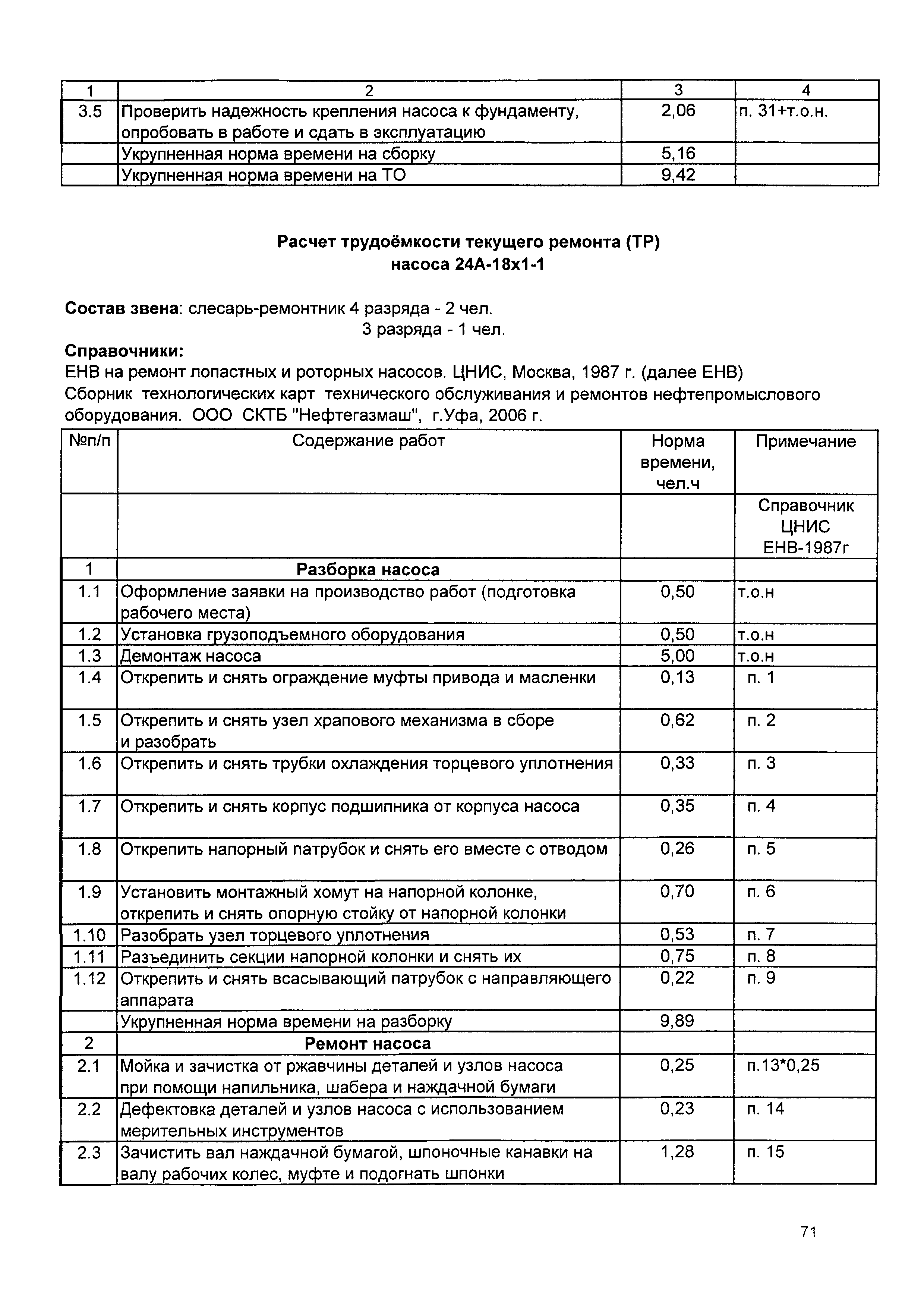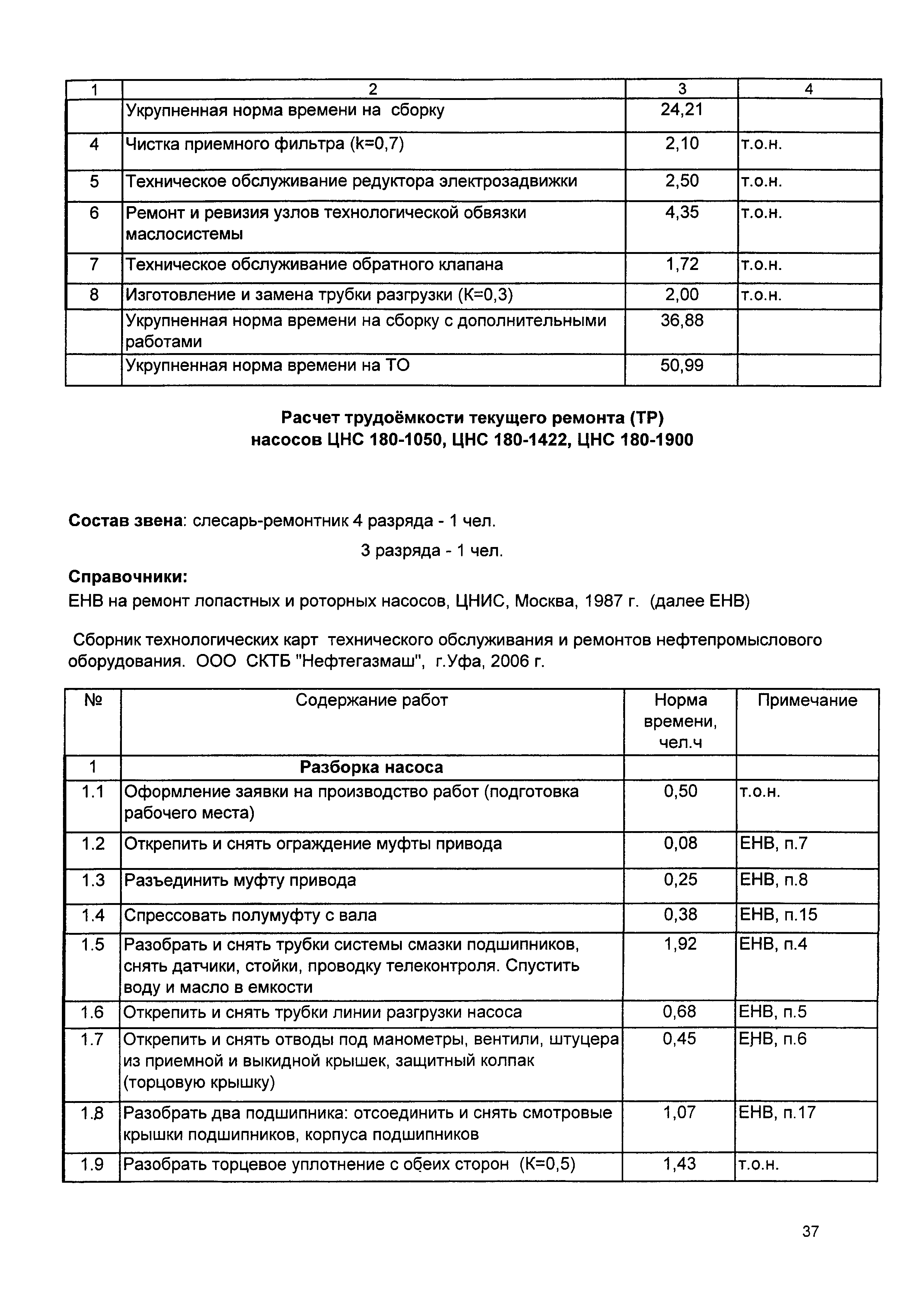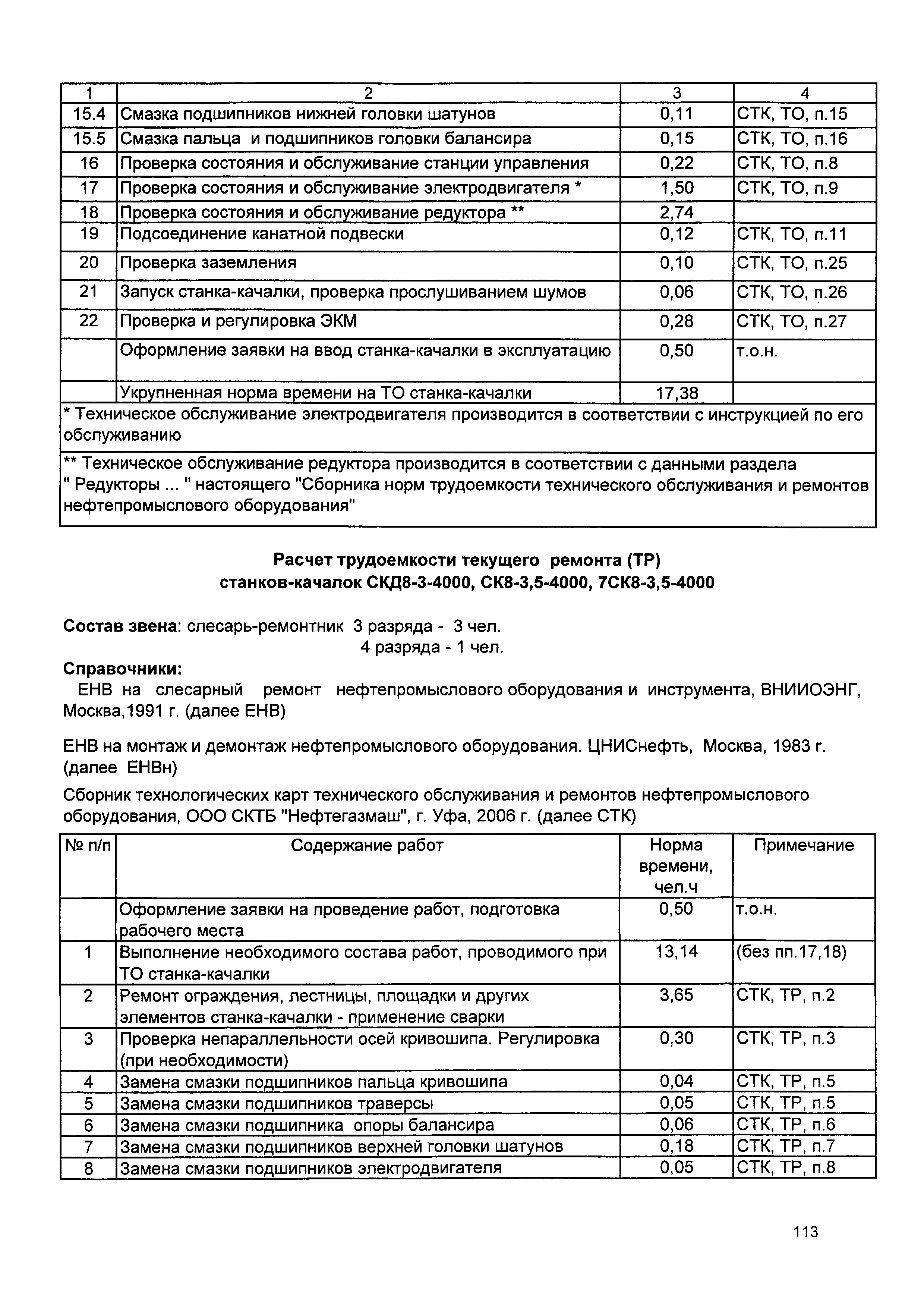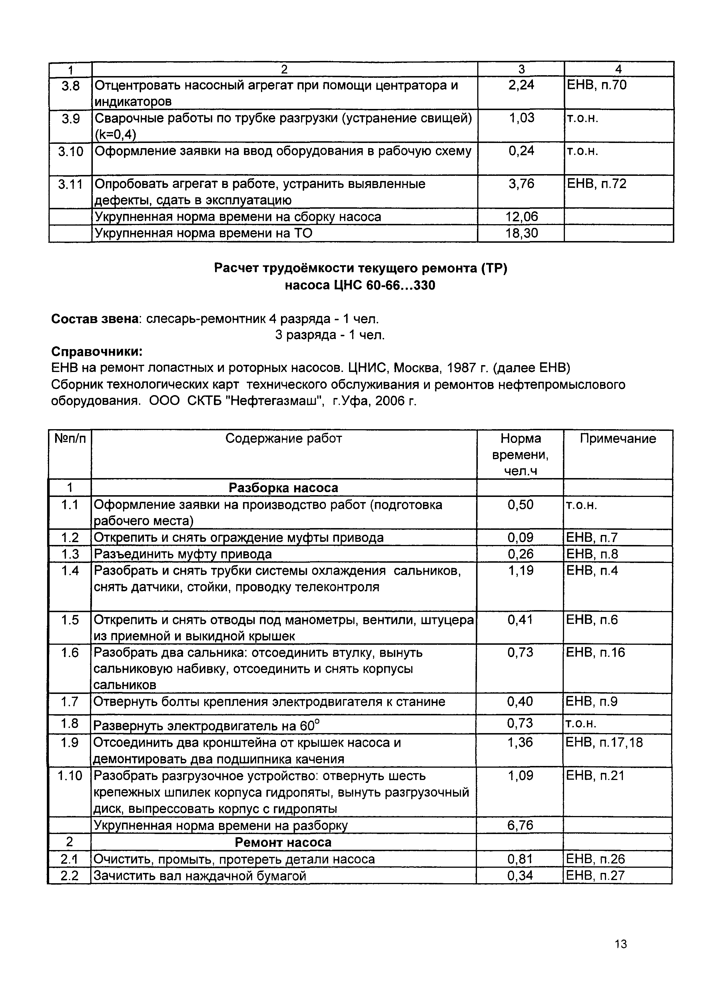 Сборник норм трудоемкости технического обслуживания и ремонтов насосов и станков-качалок. Часть 2| Статус: | действует | | Название рус.: | Сборник норм трудоемкости технического обслуживания и ремонтов насосов и станков-качалок. Часть 2 | | Дата добавления в базу: | 01.10.2014 | | Дата актуализации: | 01.01.2021 | | Область применения: | Сборник является нормативным документом по проведению технического обслуживания и ремонтов (ТО и Р) НПО и служит для: планирования ремонтных работ, определения их объема, составления сметной документации и организации подготовительных работ к ремонту; определения потребности в технических средствах (машинах, механизмах и т.д.) и материальных ресурсах, подбора ремонтного персонала и осуществления контроля за правильным расходованием средств на ремонтные работы. Сборник предназначен для работников структурных подразделений и производственных объектов, занятых планированием, организацией и проведением технического обслуживания и ремонтов (НПО). | | Оглавление: | Общие положения Насос ЦНС 38-44…220 Насос ЦНС 60-66…330 Насос ЦНС 105-98…490 Насосы ЦНС 180-1050. ЦНС 180-1422, ЦНС 180-1900 Насос ЦНС 300-120…600 Насос ЦН 900-310 Насос 12НА-9Х4 Насос 24А-18Х1-1 Насос АХП 45/31-А-СД-П Насос К20/30 Насос Ш5-25 Насос 6Ш8-2 Насос НБ-32 Насос НК 200/210А Станки-качалки СКД8-3-4000, СК8-3,5-4000, 7СК8-3,5-4000 Редукторы Ц2НШ-750А, Ц2НШ-750Б, R-35 ("Вулкан") | | Разработан: | ООО СПКТБ НЕФТЕГАЗМАШ