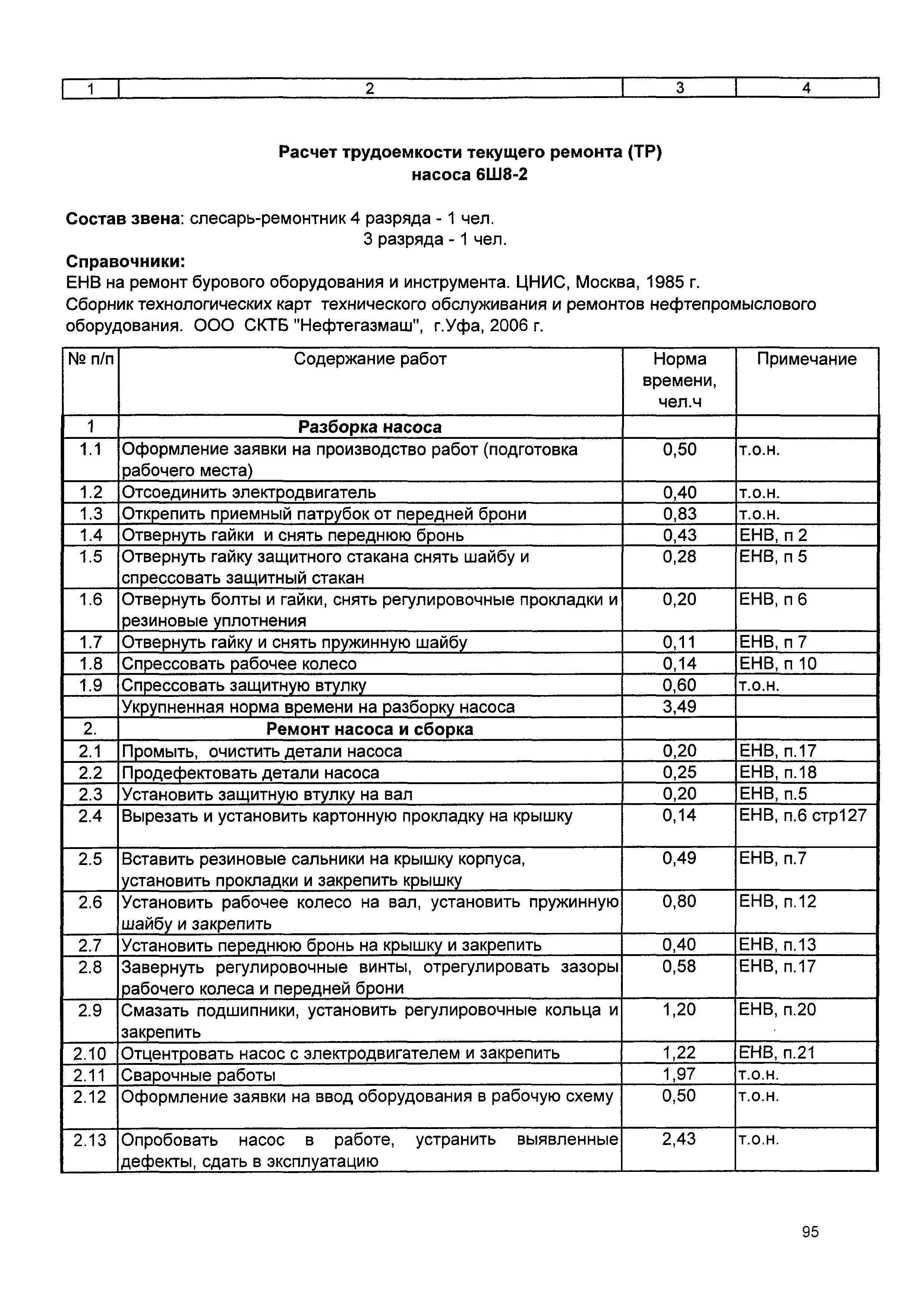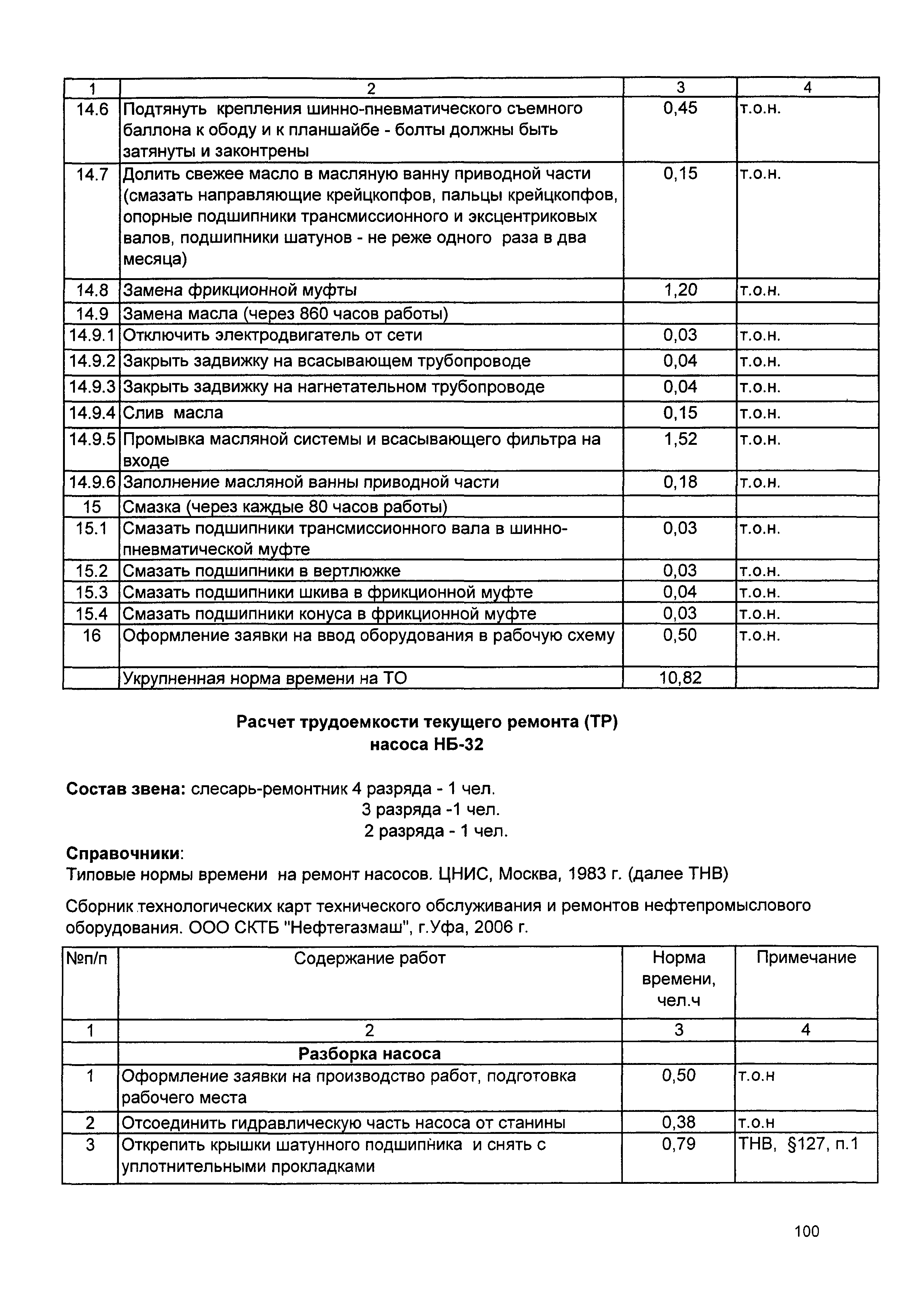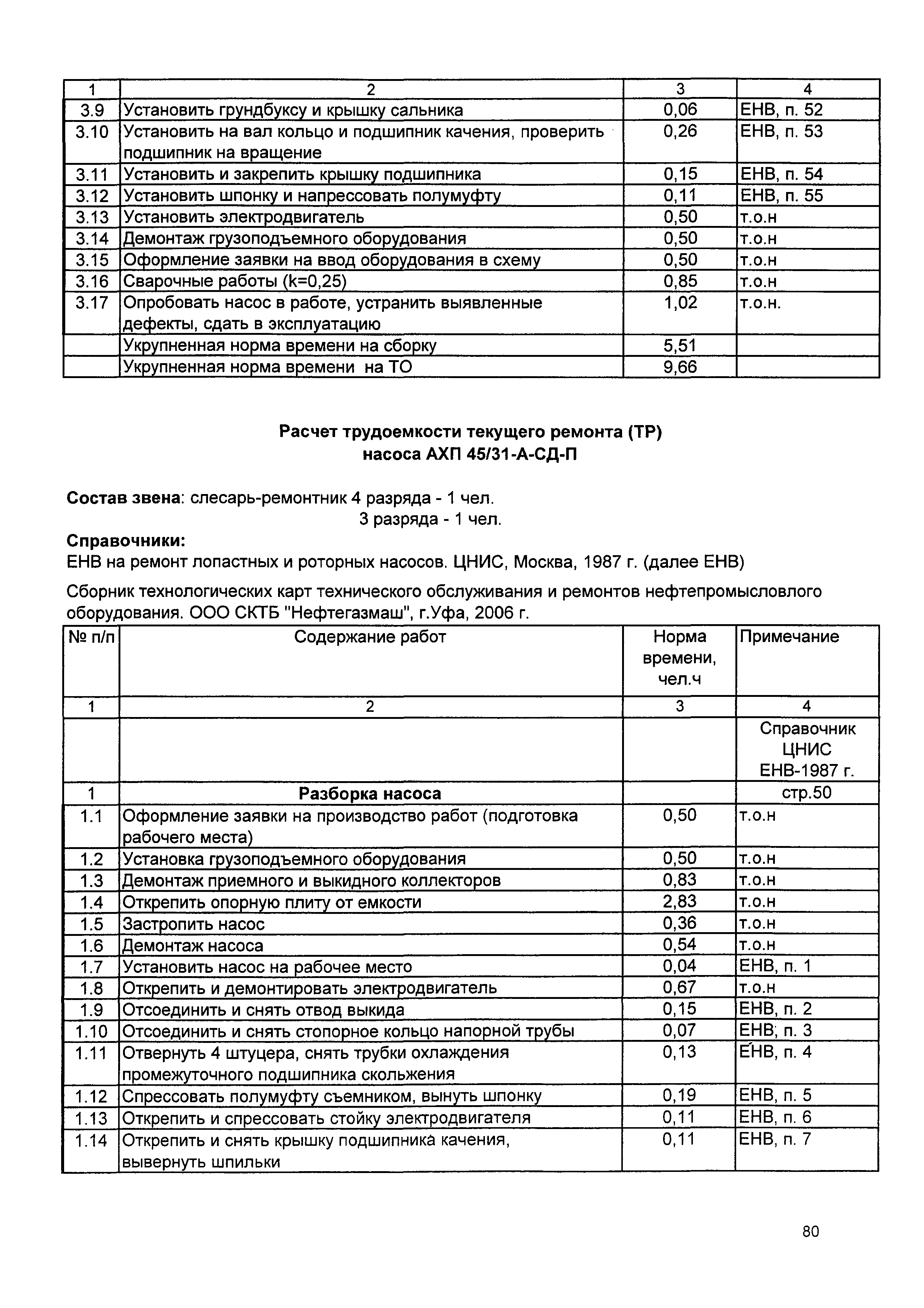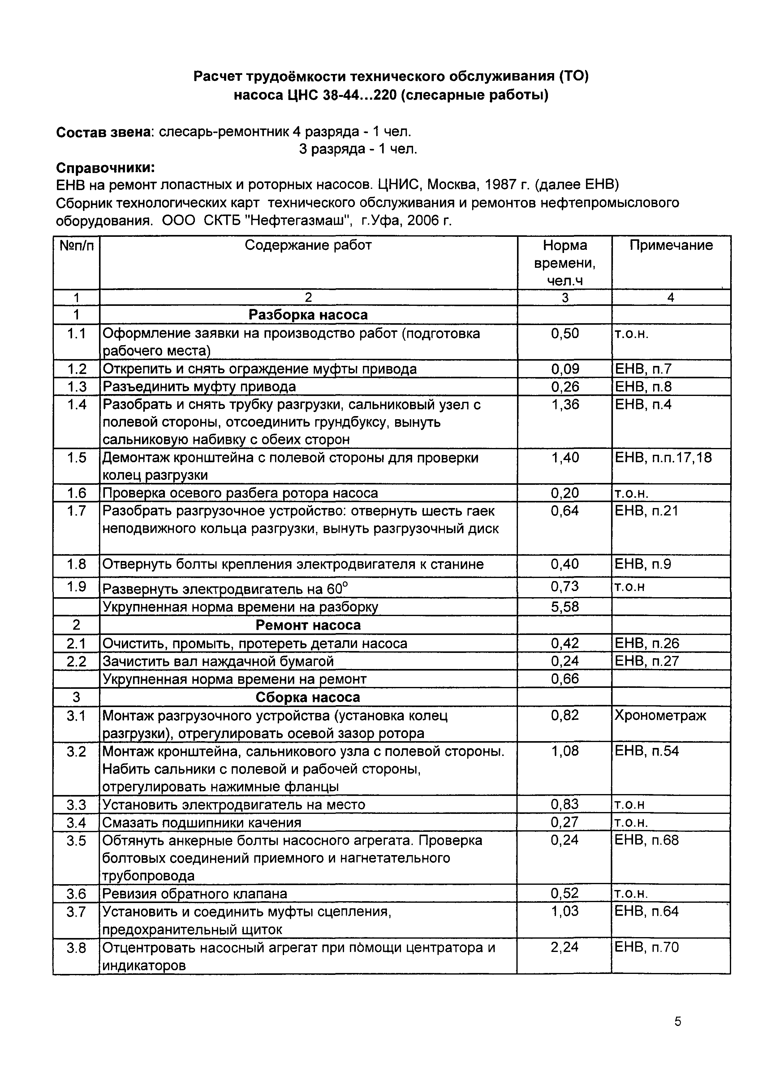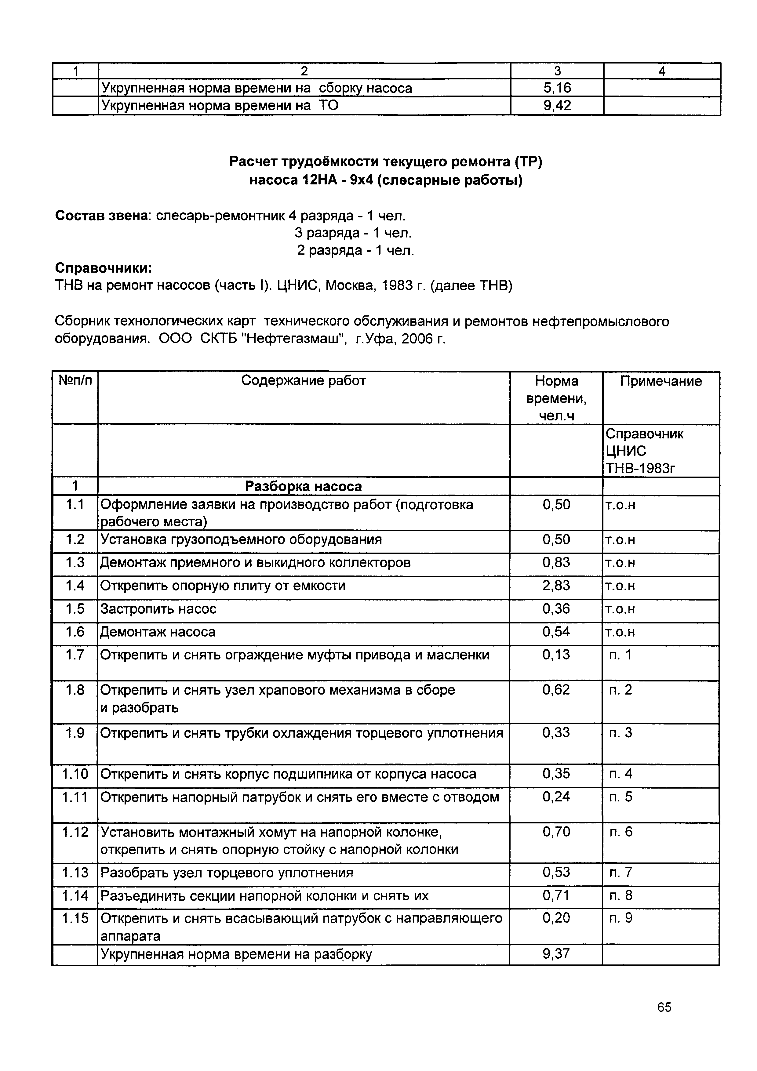 Сборник норм трудоемкости технического обслуживания и ремонтов насосов и станков-качалок. Часть 2| Статус: | действует | | Название рус.: | Сборник норм трудоемкости технического обслуживания и ремонтов насосов и станков-качалок. Часть 2 | | Дата добавления в базу: | 01.10.2014 | | Дата актуализации: | 01.01.2021 | | Область применения: | Сборник является нормативным документом по проведению технического обслуживания и ремонтов (ТО и Р) НПО и служит для: планирования ремонтных работ, определения их объема, составления сметной документации и организации подготовительных работ к ремонту; определения потребности в технических средствах (машинах, механизмах и т.д.) и материальных ресурсах, подбора ремонтного персонала и осуществления контроля за правильным расходованием средств на ремонтные работы. Сборник предназначен для работников структурных подразделений и производственных объектов, занятых планированием, организацией и проведением технического обслуживания и ремонтов (НПО). | | Оглавление: | Общие положения Насос ЦНС 38-44…220 Насос ЦНС 60-66…330 Насос ЦНС 105-98…490 Насосы ЦНС 180-1050. ЦНС 180-1422, ЦНС 180-1900 Насос ЦНС 300-120…600 Насос ЦН 900-310 Насос 12НА-9Х4 Насос 24А-18Х1-1 Насос АХП 45/31-А-СД-П Насос К20/30 Насос Ш5-25 Насос 6Ш8-2 Насос НБ-32 Насос НК 200/210А Станки-качалки СКД8-3-4000, СК8-3,5-4000, 7СК8-3,5-4000 Редукторы Ц2НШ-750А, Ц2НШ-750Б, R-35 ("Вулкан") | | Разработан: | ООО СПКТБ НЕФТЕГАЗМАШ
