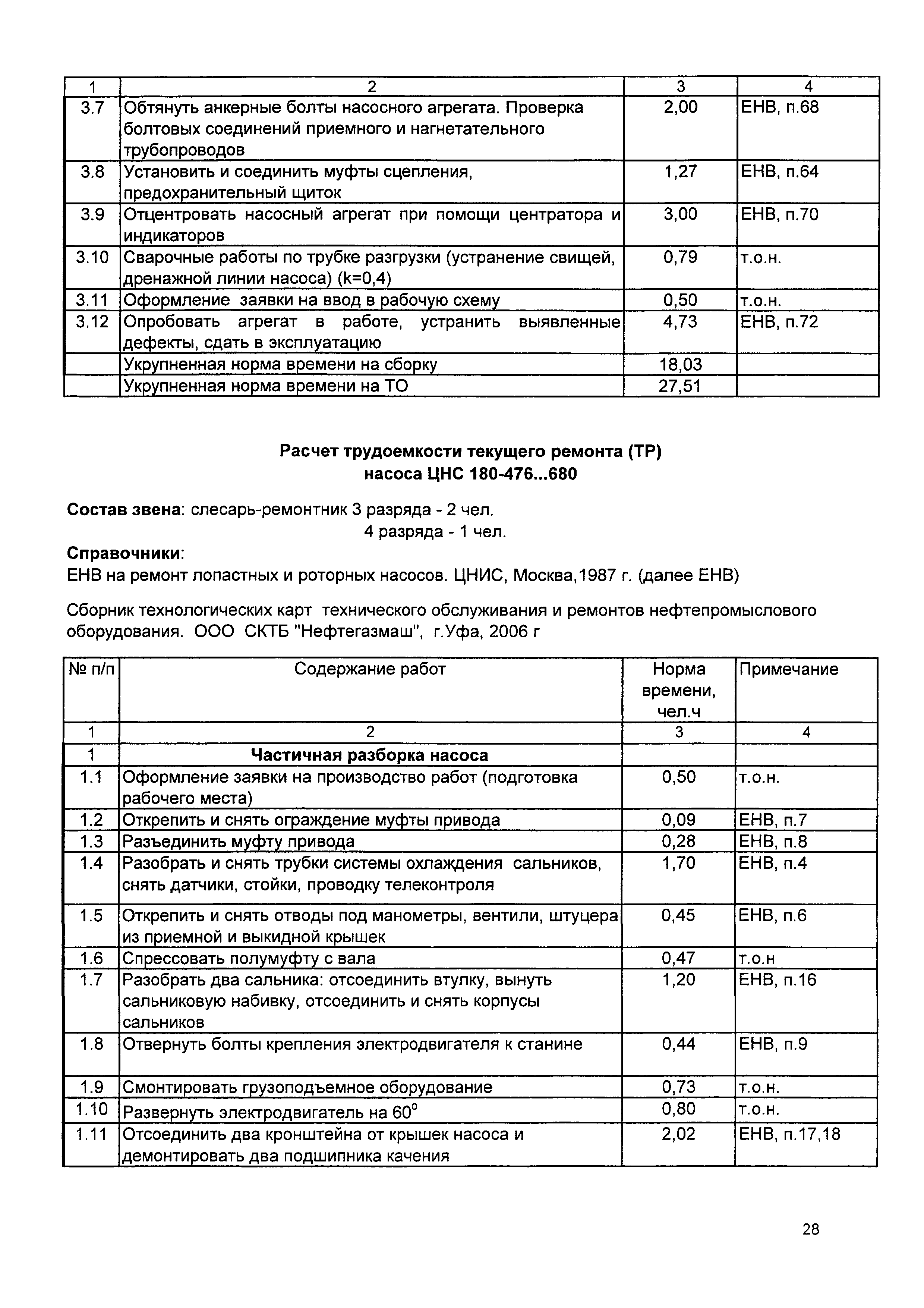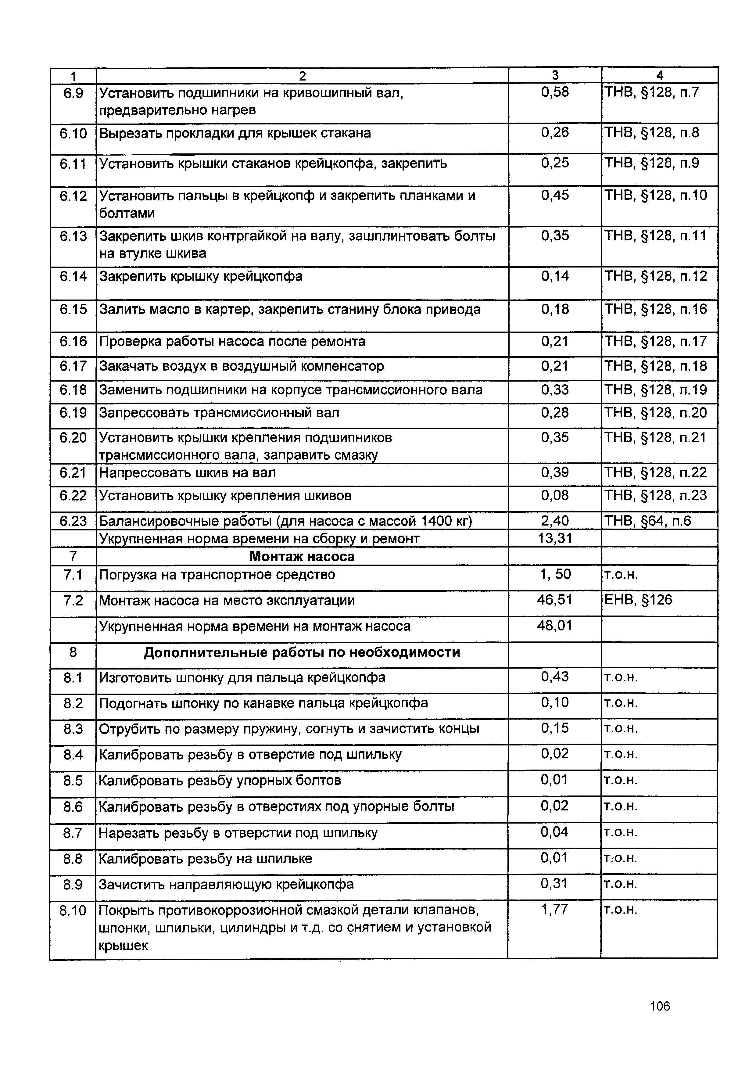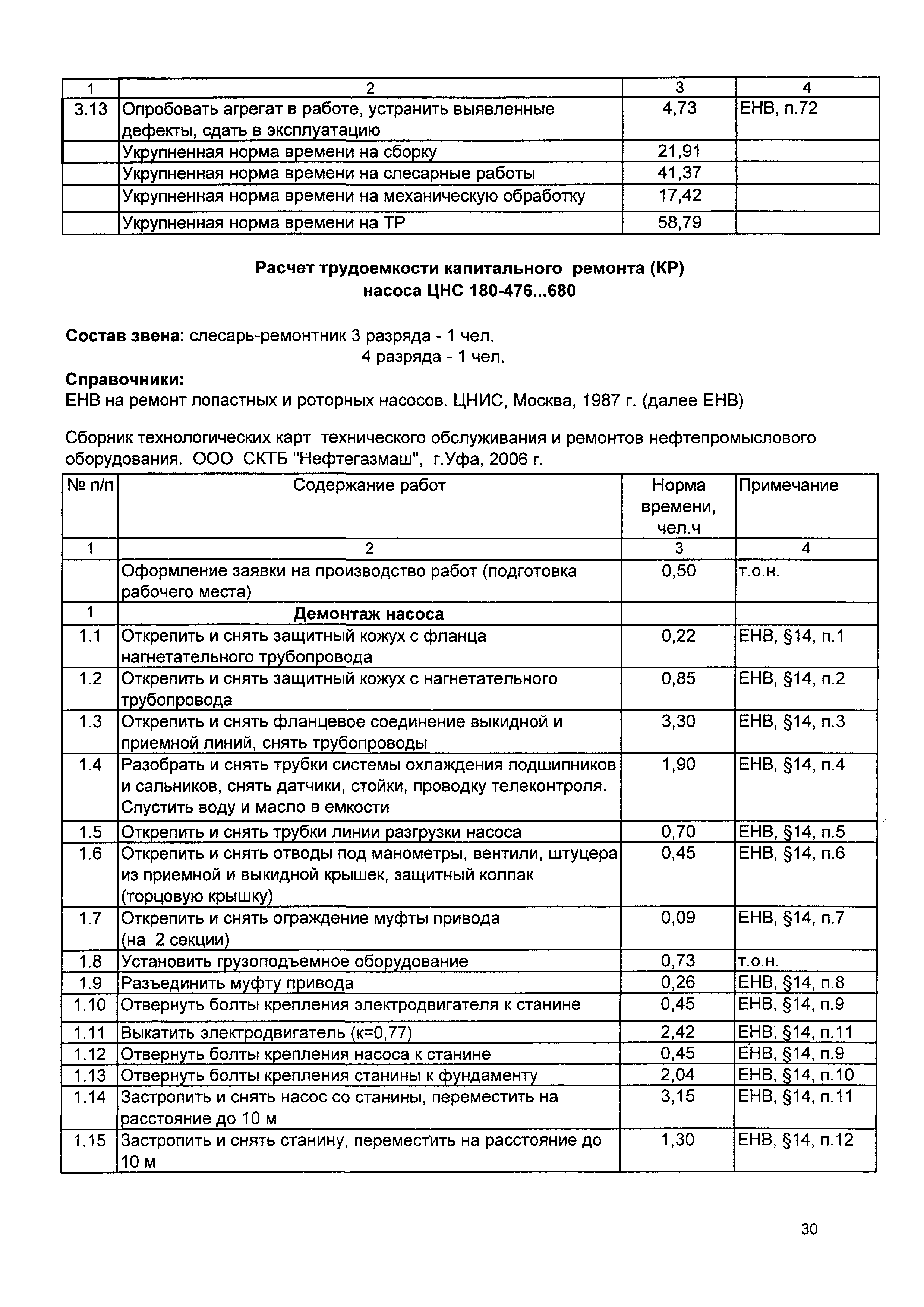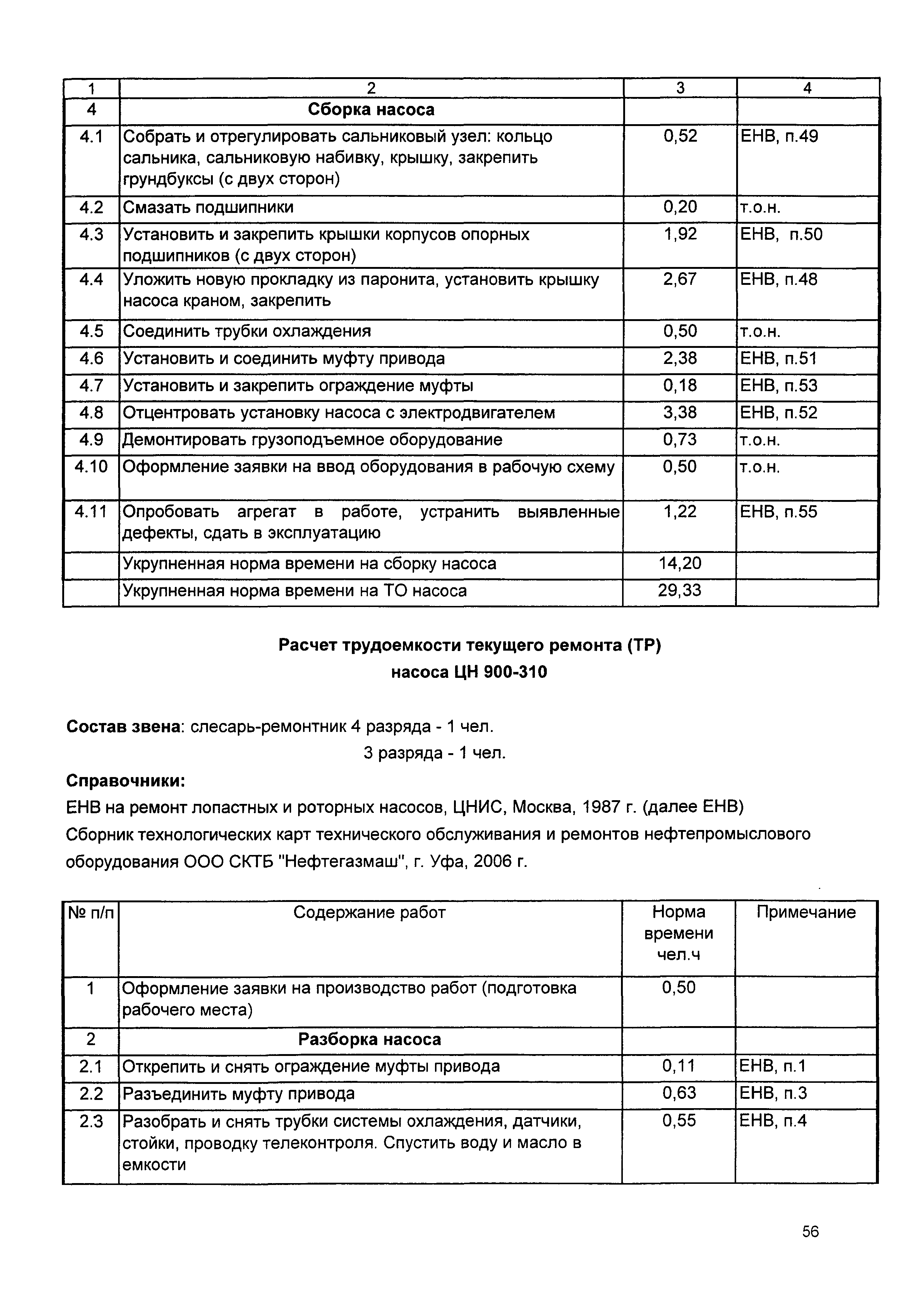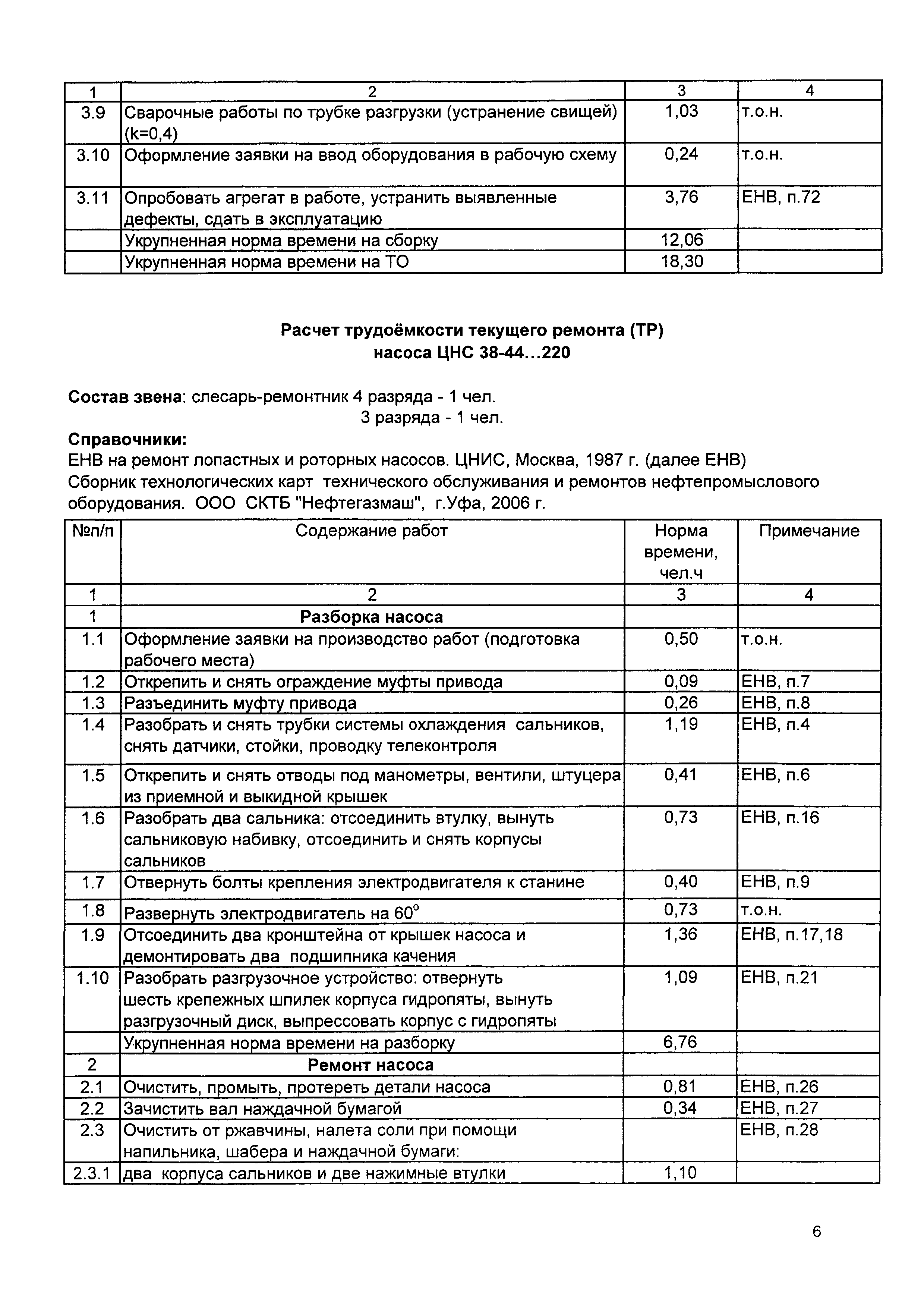 Сборник норм трудоемкости технического обслуживания и ремонтов насосов и станков-качалок. Часть 2| Статус: | действует | | Название рус.: | Сборник норм трудоемкости технического обслуживания и ремонтов насосов и станков-качалок. Часть 2 | | Дата добавления в базу: | 01.10.2014 | | Дата актуализации: | 01.01.2021 | | Область применения: | Сборник является нормативным документом по проведению технического обслуживания и ремонтов (ТО и Р) НПО и служит для: планирования ремонтных работ, определения их объема, составления сметной документации и организации подготовительных работ к ремонту; определения потребности в технических средствах (машинах, механизмах и т.д.) и материальных ресурсах, подбора ремонтного персонала и осуществления контроля за правильным расходованием средств на ремонтные работы. Сборник предназначен для работников структурных подразделений и производственных объектов, занятых планированием, организацией и проведением технического обслуживания и ремонтов (НПО). | | Оглавление: | Общие положения Насос ЦНС 38-44…220 Насос ЦНС 60-66…330 Насос ЦНС 105-98…490 Насосы ЦНС 180-1050. ЦНС 180-1422, ЦНС 180-1900 Насос ЦНС 300-120…600 Насос ЦН 900-310 Насос 12НА-9Х4 Насос 24А-18Х1-1 Насос АХП 45/31-А-СД-П Насос К20/30 Насос Ш5-25 Насос 6Ш8-2 Насос НБ-32 Насос НК 200/210А Станки-качалки СКД8-3-4000, СК8-3,5-4000, 7СК8-3,5-4000 Редукторы Ц2НШ-750А, Ц2НШ-750Б, R-35 ("Вулкан") | | Разработан: | ООО СПКТБ НЕФТЕГАЗМАШ