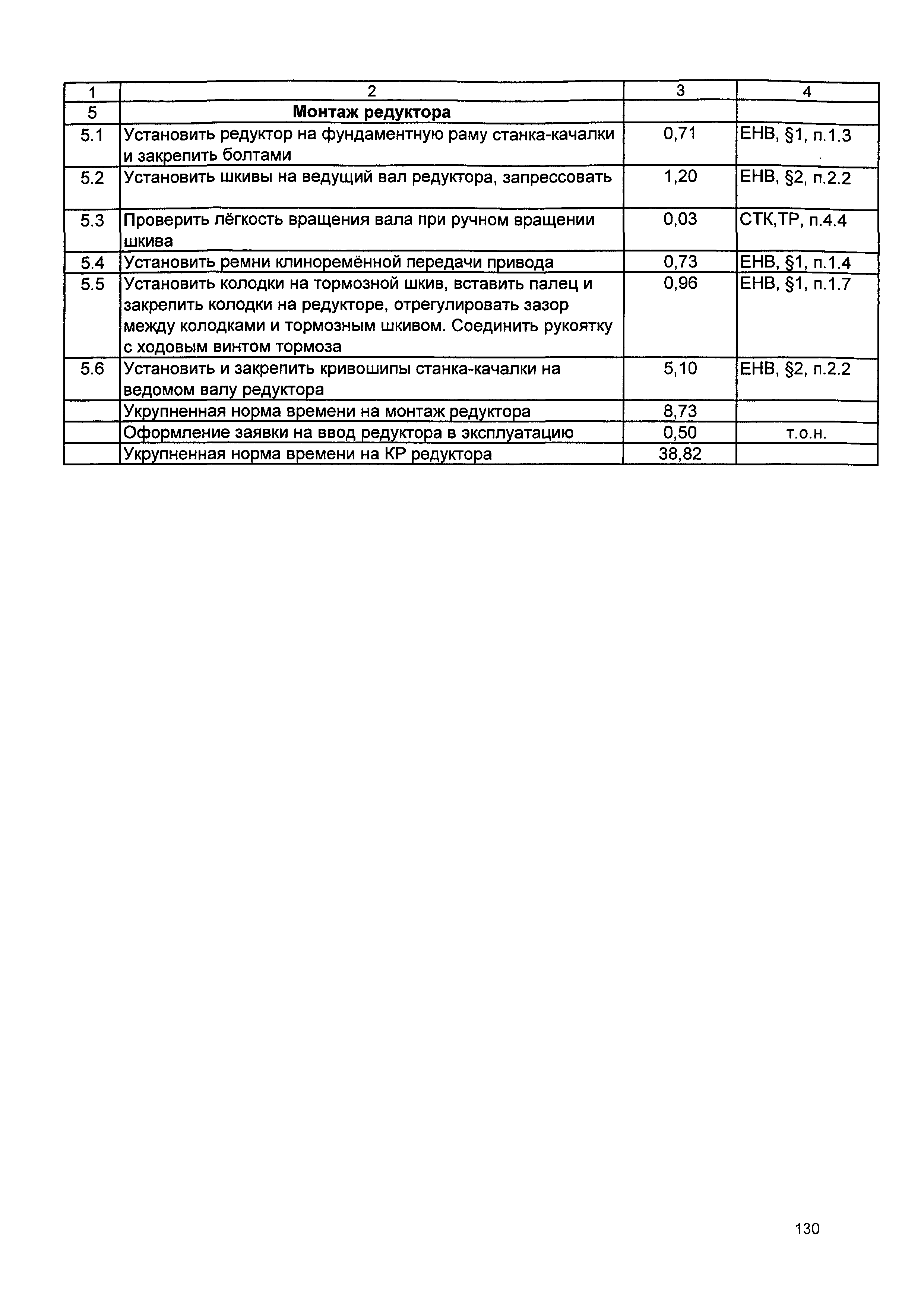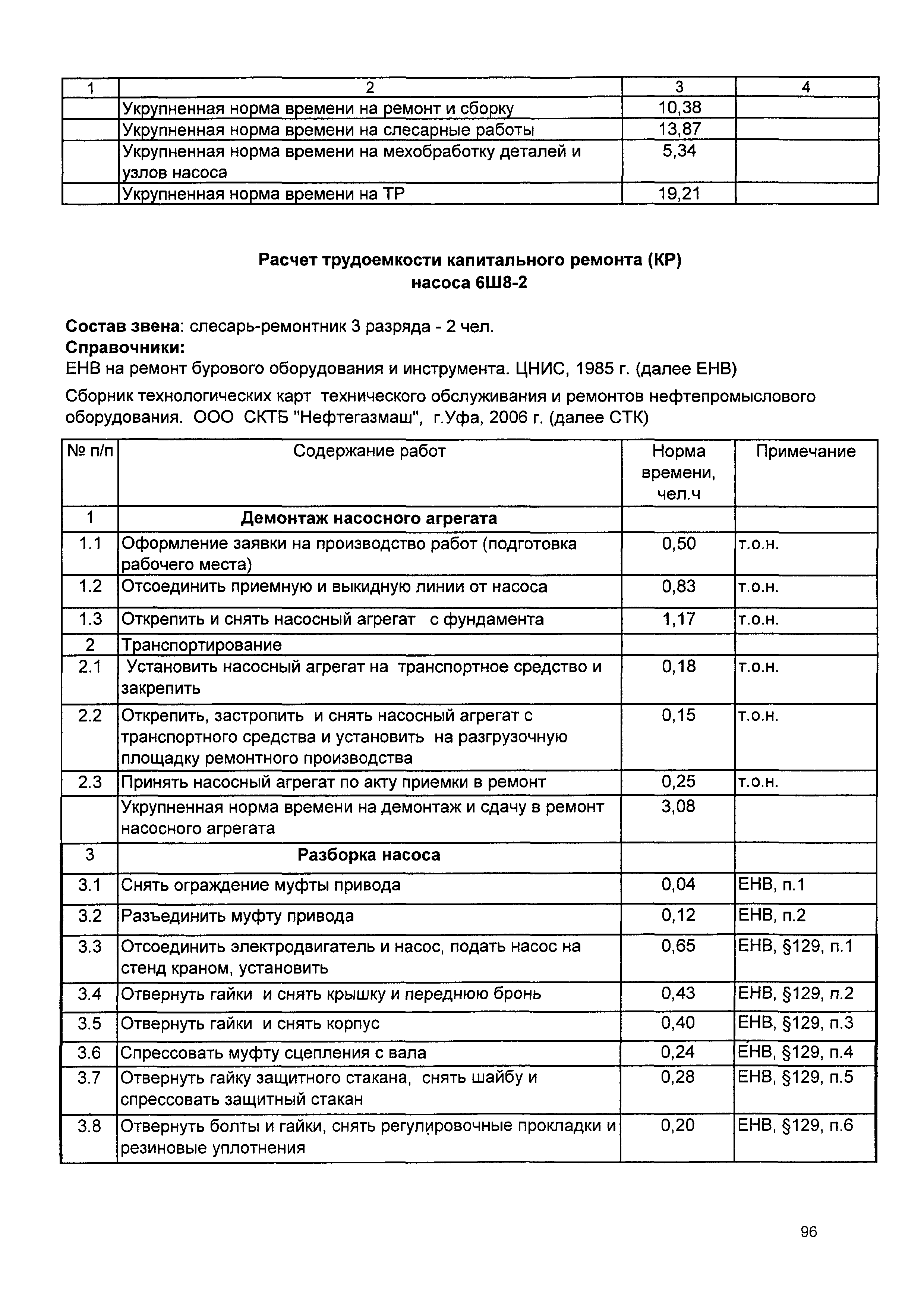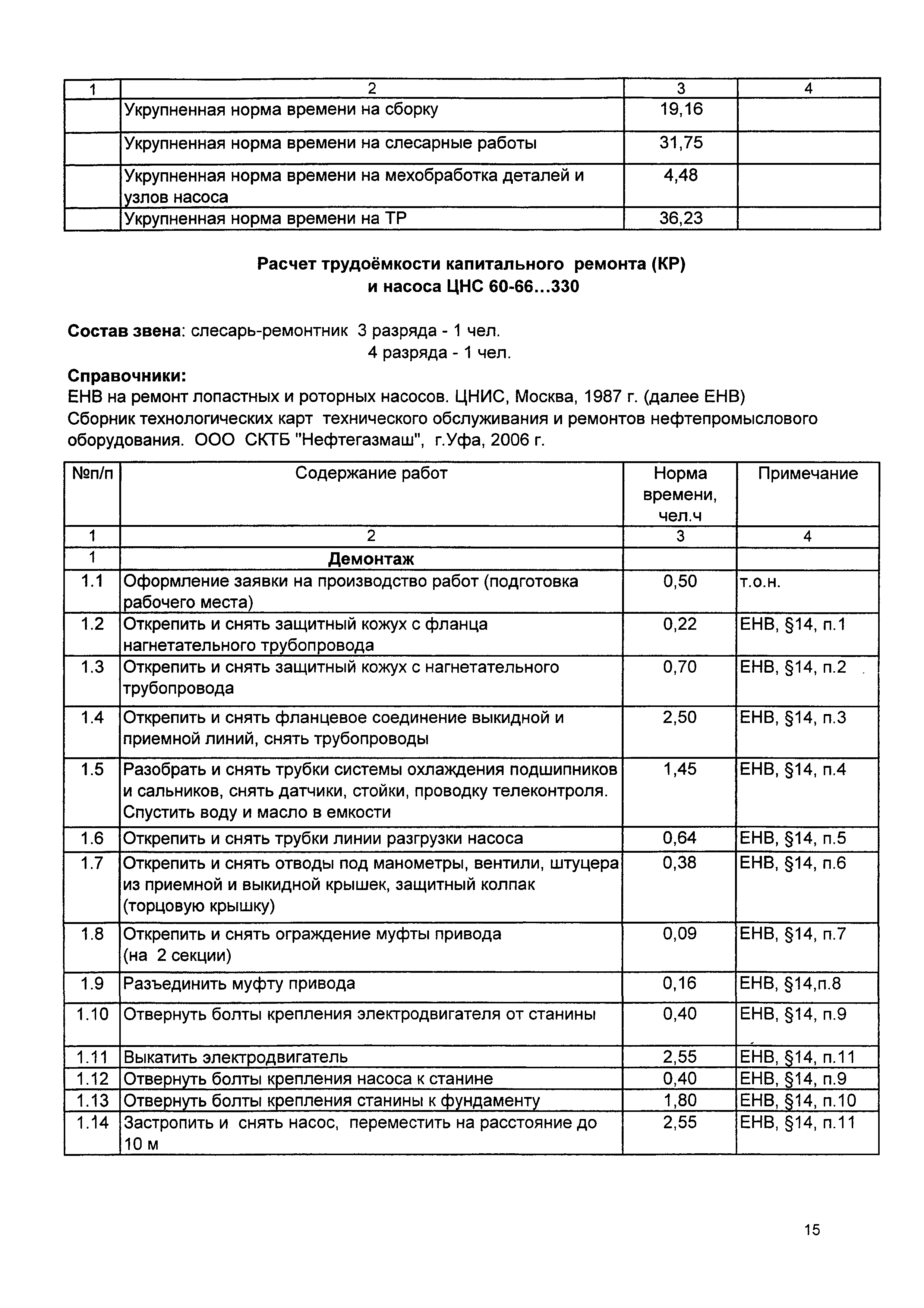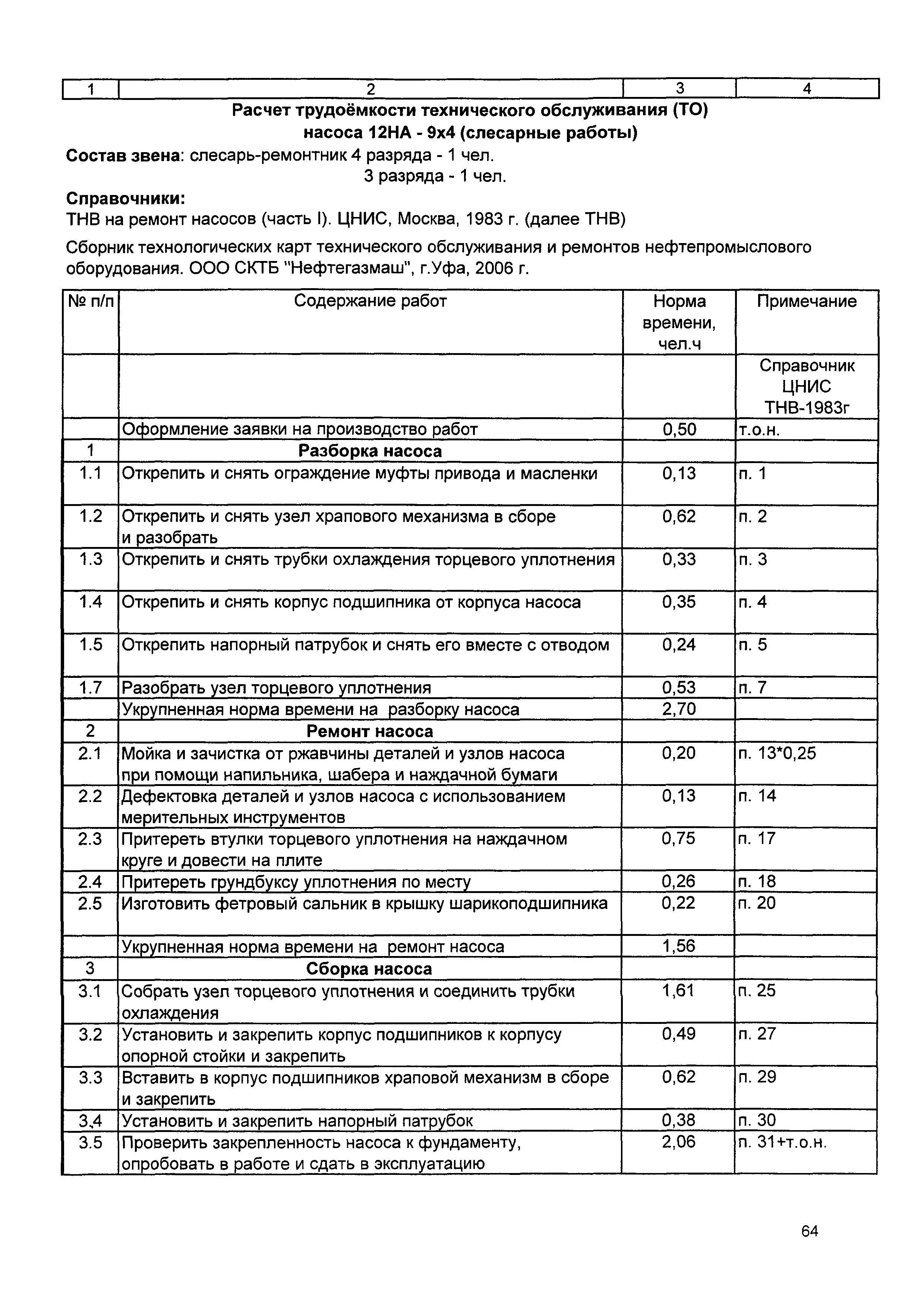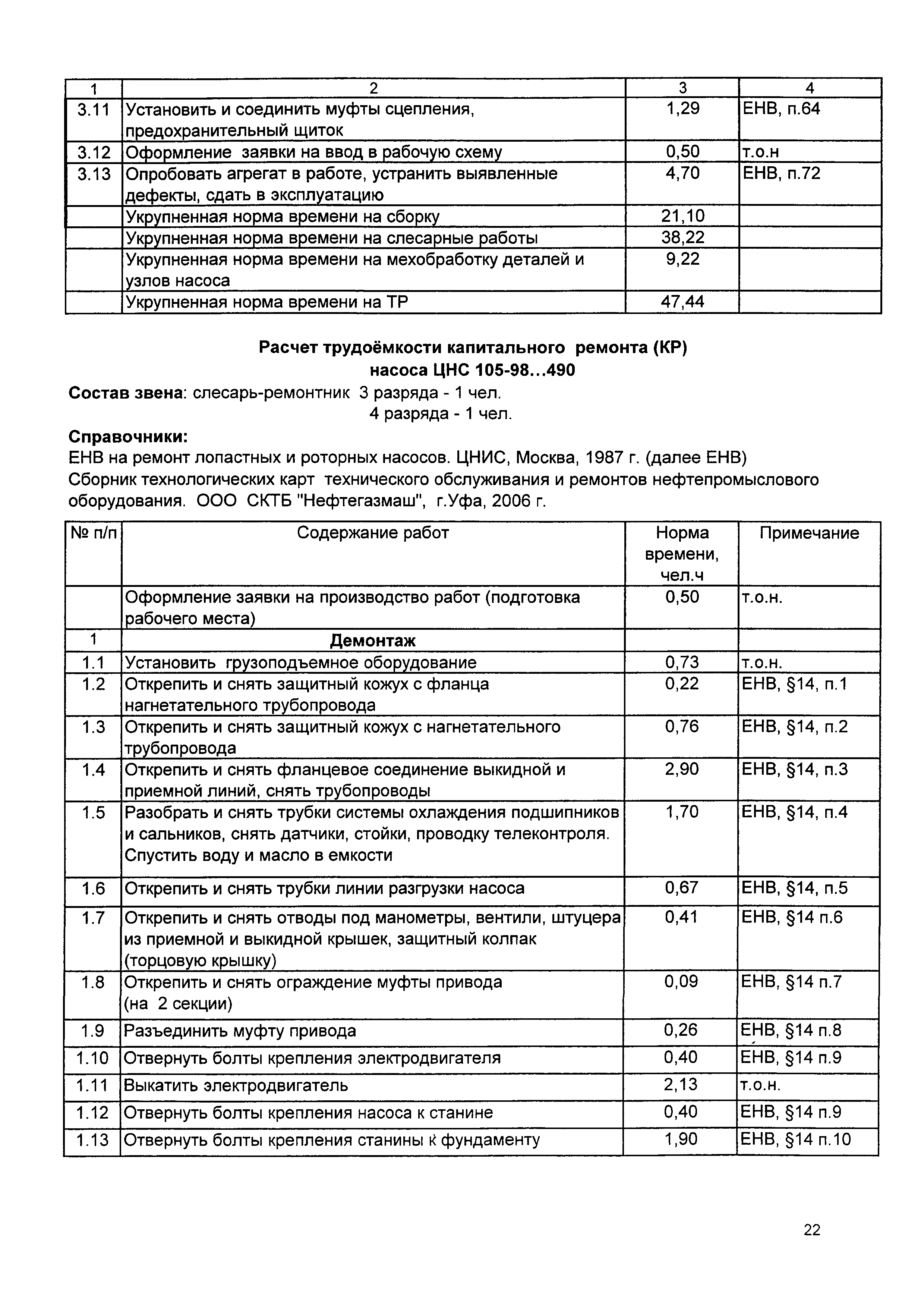 Сборник норм трудоемкости технического обслуживания и ремонтов насосов и станков-качалок. Часть 2| Статус: | действует | | Название рус.: | Сборник норм трудоемкости технического обслуживания и ремонтов насосов и станков-качалок. Часть 2 | | Дата добавления в базу: | 01.10.2014 | | Дата актуализации: | 01.01.2021 | | Область применения: | Сборник является нормативным документом по проведению технического обслуживания и ремонтов (ТО и Р) НПО и служит для: планирования ремонтных работ, определения их объема, составления сметной документации и организации подготовительных работ к ремонту; определения потребности в технических средствах (машинах, механизмах и т.д.) и материальных ресурсах, подбора ремонтного персонала и осуществления контроля за правильным расходованием средств на ремонтные работы. Сборник предназначен для работников структурных подразделений и производственных объектов, занятых планированием, организацией и проведением технического обслуживания и ремонтов (НПО). | | Оглавление: | Общие положения Насос ЦНС 38-44…220 Насос ЦНС 60-66…330 Насос ЦНС 105-98…490 Насосы ЦНС 180-1050. ЦНС 180-1422, ЦНС 180-1900 Насос ЦНС 300-120…600 Насос ЦН 900-310 Насос 12НА-9Х4 Насос 24А-18Х1-1 Насос АХП 45/31-А-СД-П Насос К20/30 Насос Ш5-25 Насос 6Ш8-2 Насос НБ-32 Насос НК 200/210А Станки-качалки СКД8-3-4000, СК8-3,5-4000, 7СК8-3,5-4000 Редукторы Ц2НШ-750А, Ц2НШ-750Б, R-35 ("Вулкан") | | Разработан: | ООО СПКТБ НЕФТЕГАЗМАШ
