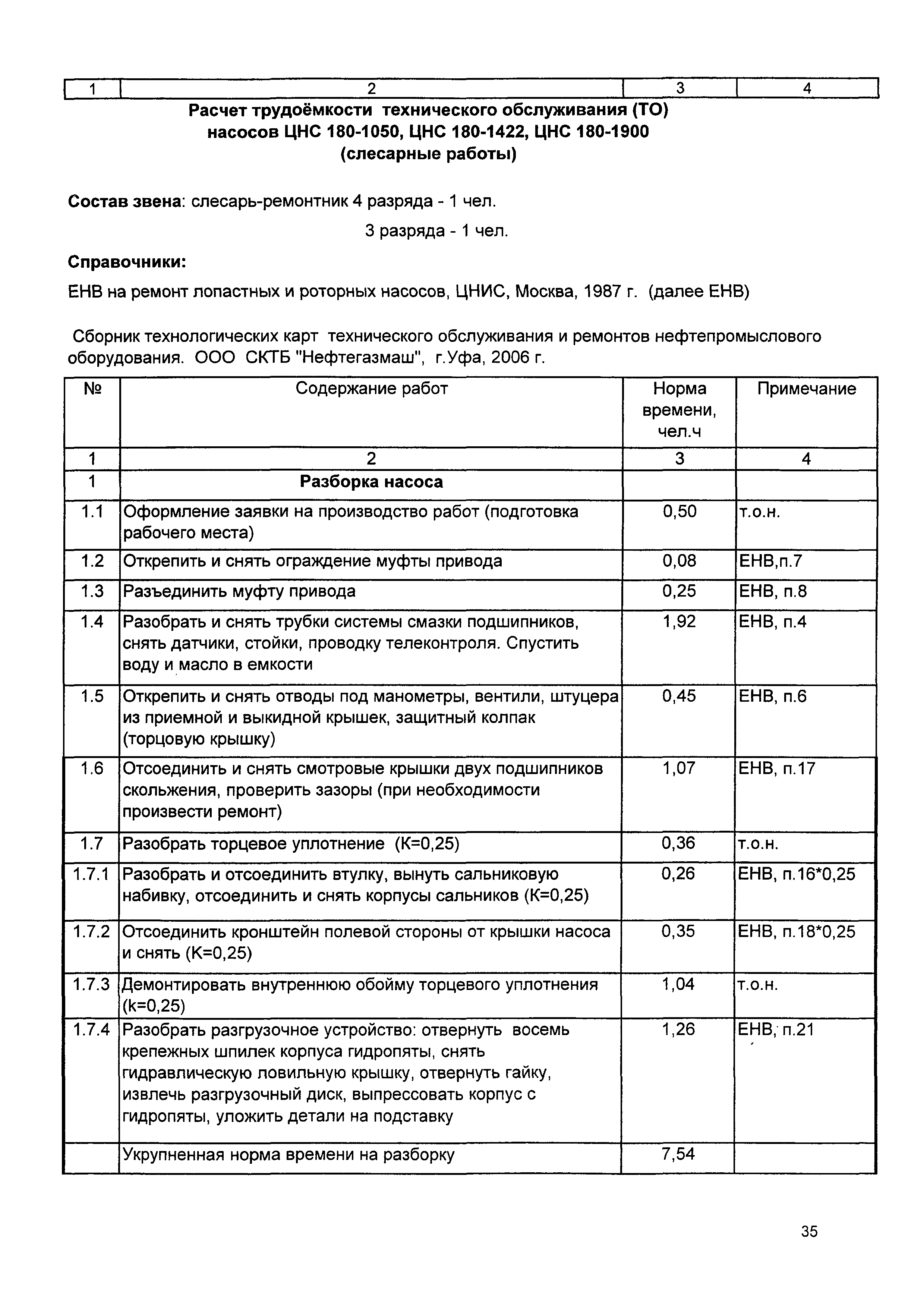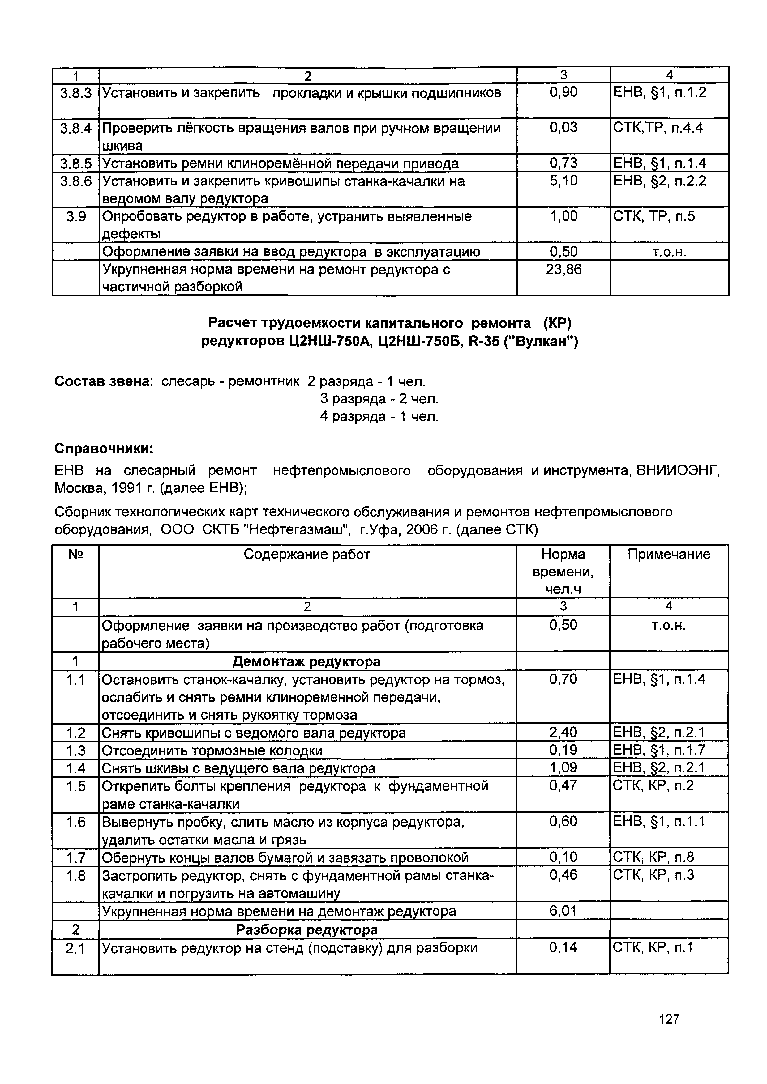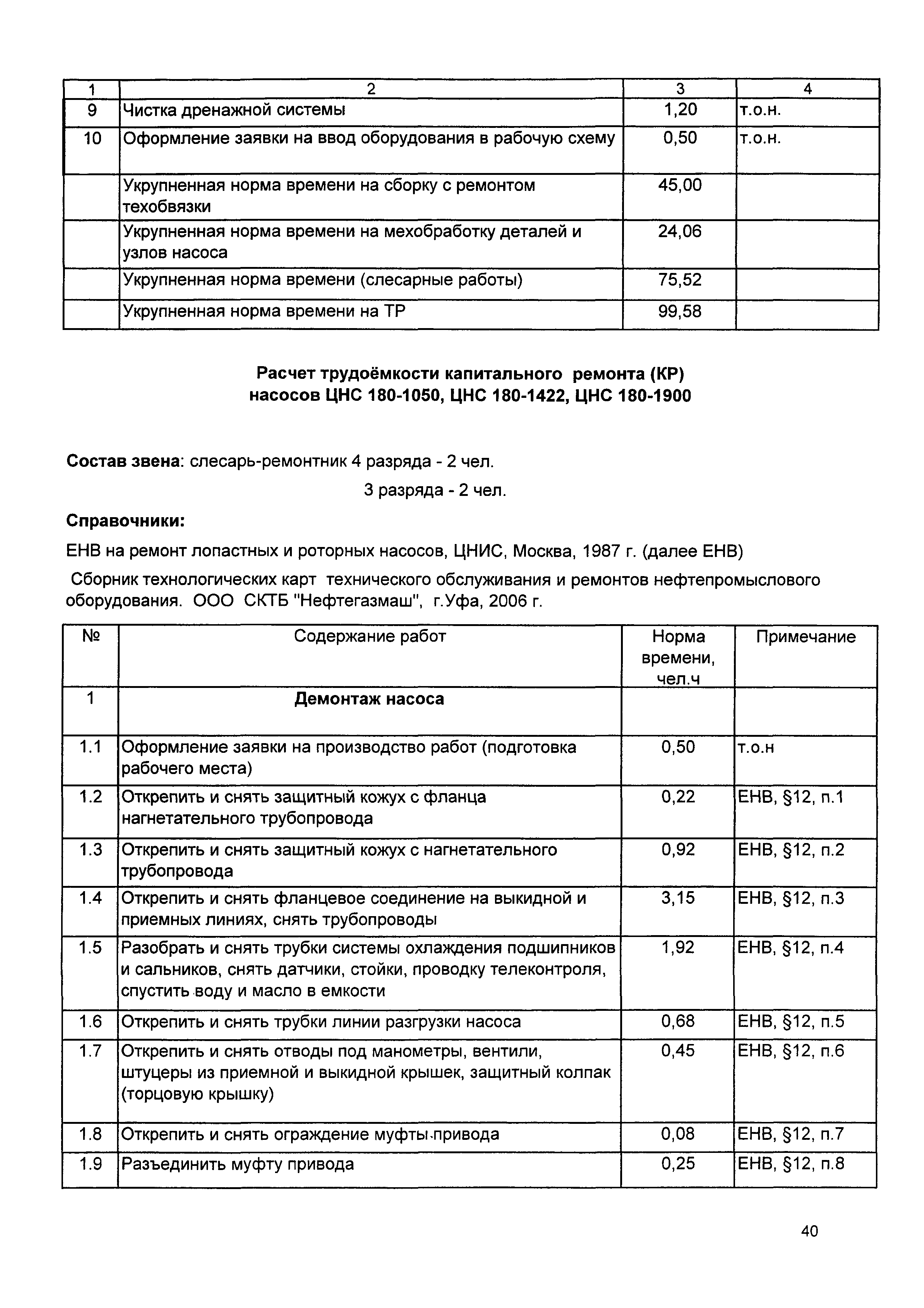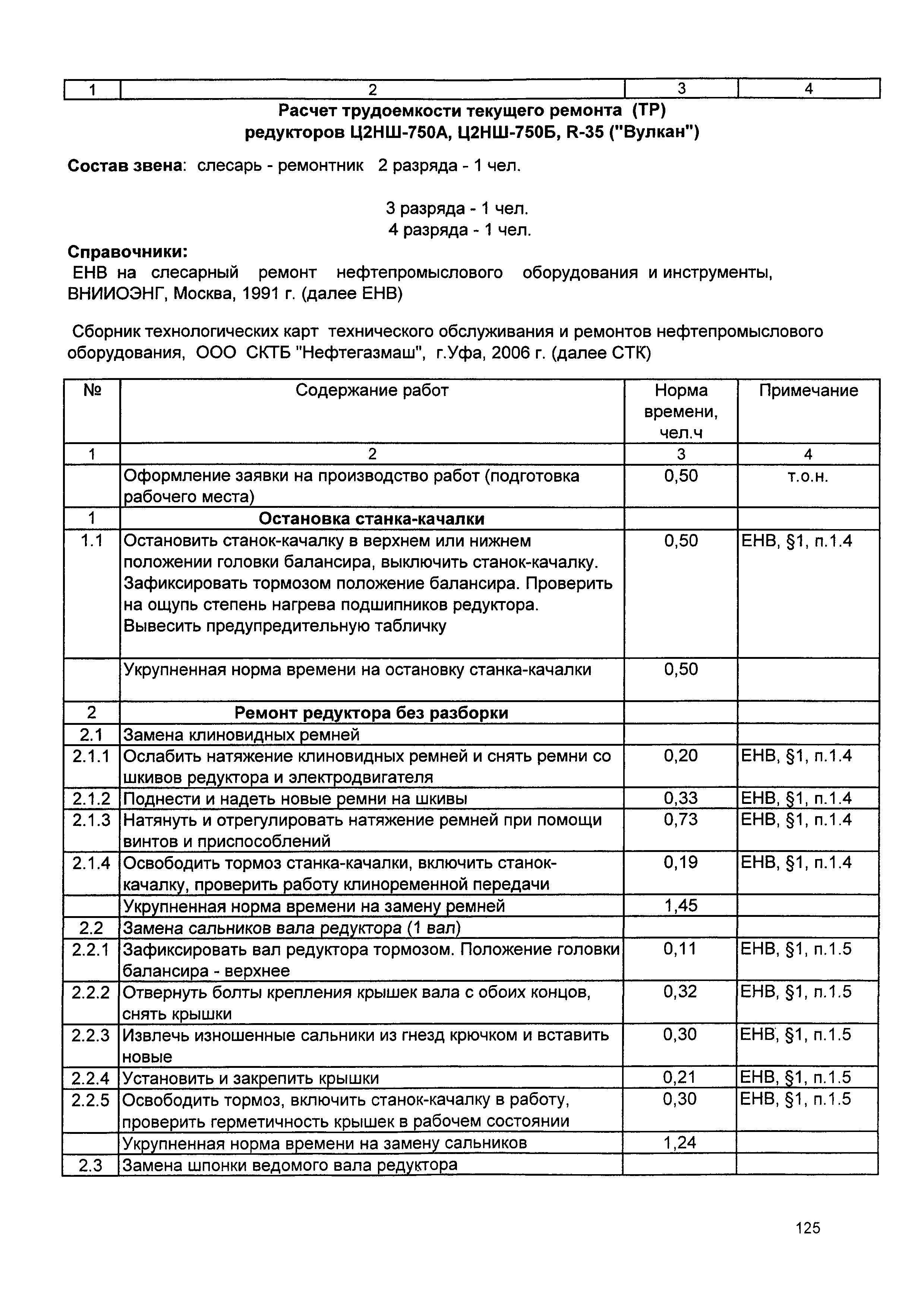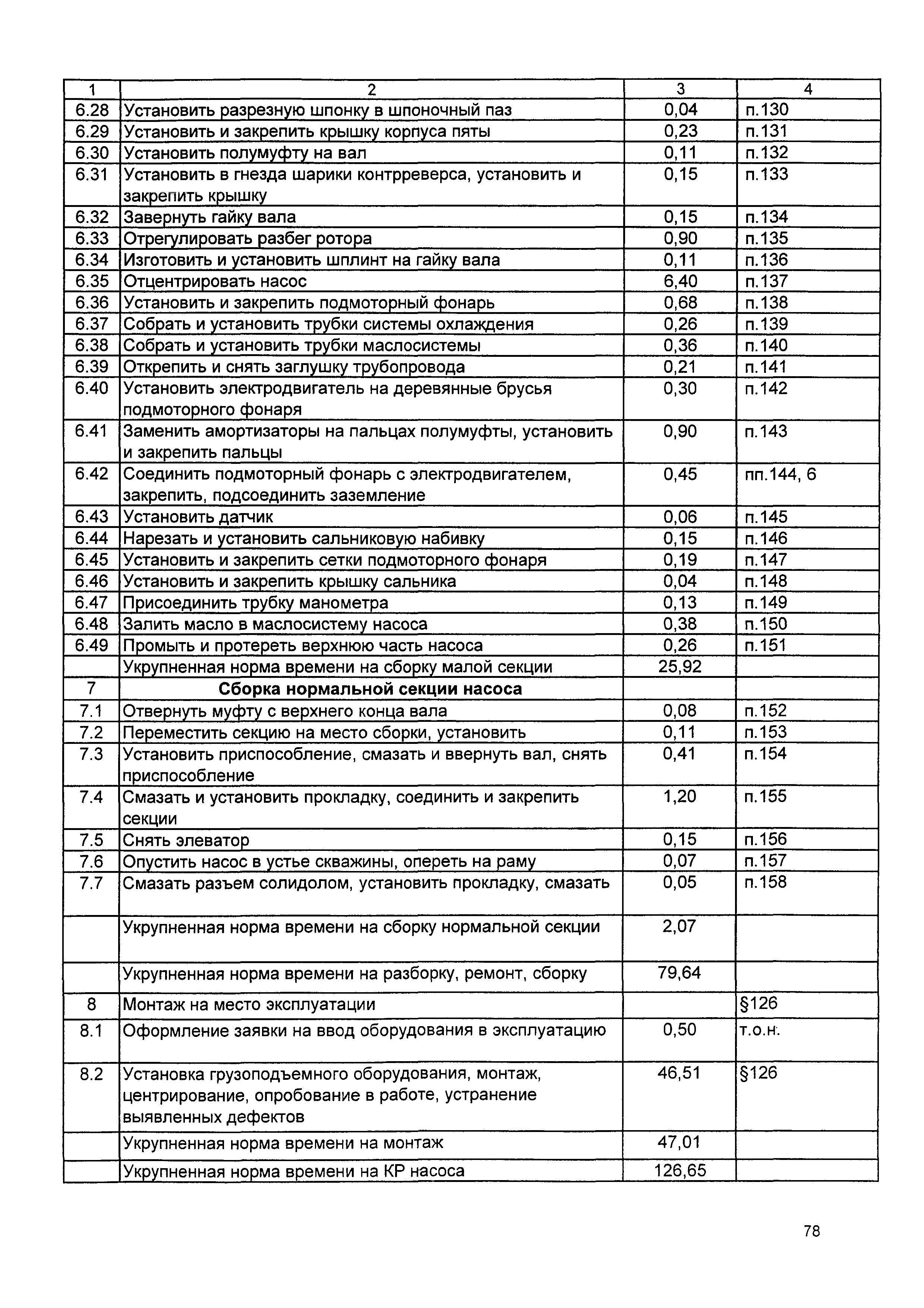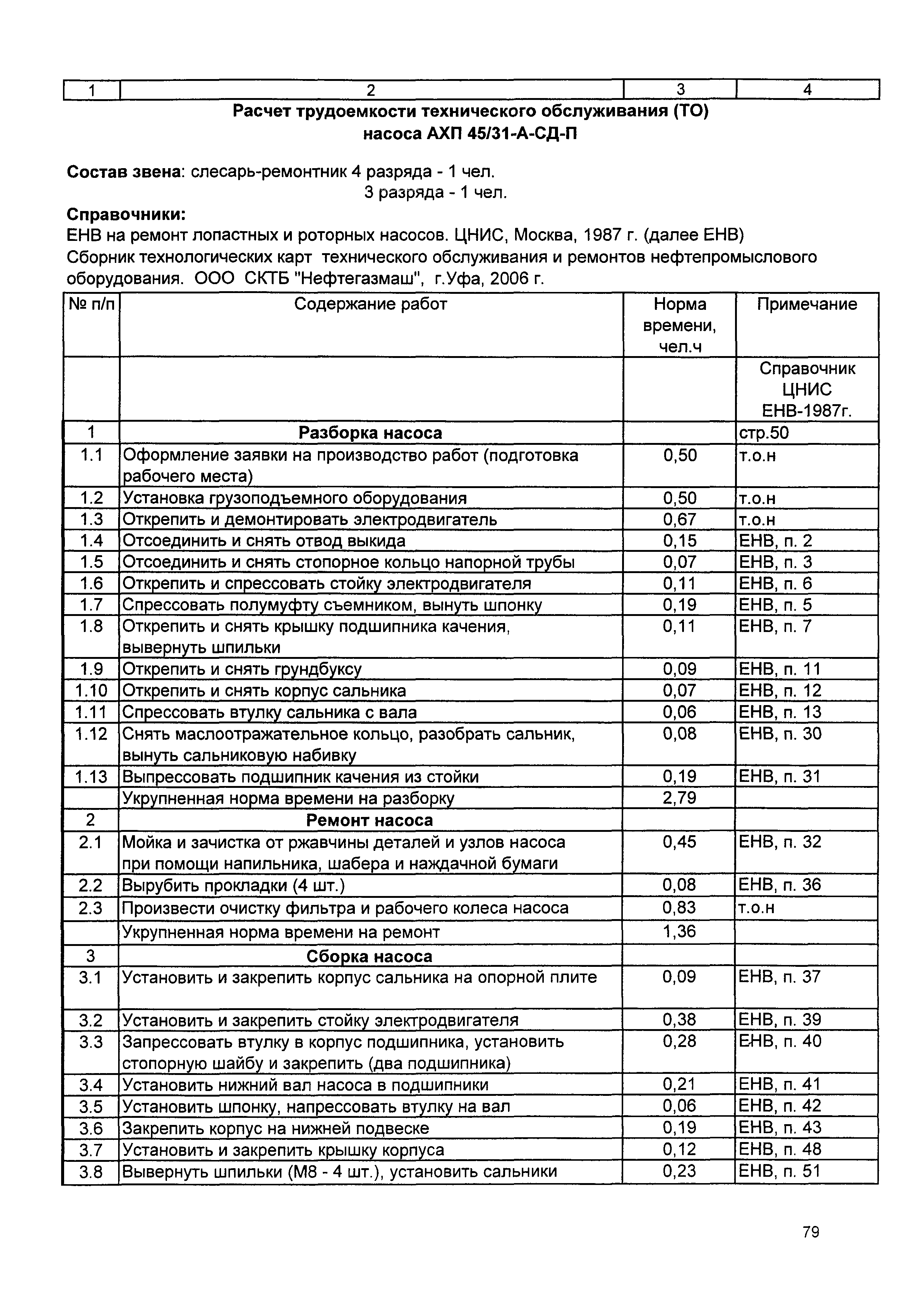 Сборник норм трудоемкости технического обслуживания и ремонтов насосов и станков-качалок. Часть 2| Статус: | действует | | Название рус.: | Сборник норм трудоемкости технического обслуживания и ремонтов насосов и станков-качалок. Часть 2 | | Дата добавления в базу: | 01.10.2014 | | Дата актуализации: | 01.01.2021 | | Область применения: | Сборник является нормативным документом по проведению технического обслуживания и ремонтов (ТО и Р) НПО и служит для: планирования ремонтных работ, определения их объема, составления сметной документации и организации подготовительных работ к ремонту; определения потребности в технических средствах (машинах, механизмах и т.д.) и материальных ресурсах, подбора ремонтного персонала и осуществления контроля за правильным расходованием средств на ремонтные работы. Сборник предназначен для работников структурных подразделений и производственных объектов, занятых планированием, организацией и проведением технического обслуживания и ремонтов (НПО). | | Оглавление: | Общие положения Насос ЦНС 38-44…220 Насос ЦНС 60-66…330 Насос ЦНС 105-98…490 Насосы ЦНС 180-1050. ЦНС 180-1422, ЦНС 180-1900 Насос ЦНС 300-120…600 Насос ЦН 900-310 Насос 12НА-9Х4 Насос 24А-18Х1-1 Насос АХП 45/31-А-СД-П Насос К20/30 Насос Ш5-25 Насос 6Ш8-2 Насос НБ-32 Насос НК 200/210А Станки-качалки СКД8-3-4000, СК8-3,5-4000, 7СК8-3,5-4000 Редукторы Ц2НШ-750А, Ц2НШ-750Б, R-35 ("Вулкан") | | Разработан: | ООО СПКТБ НЕФТЕГАЗМАШ