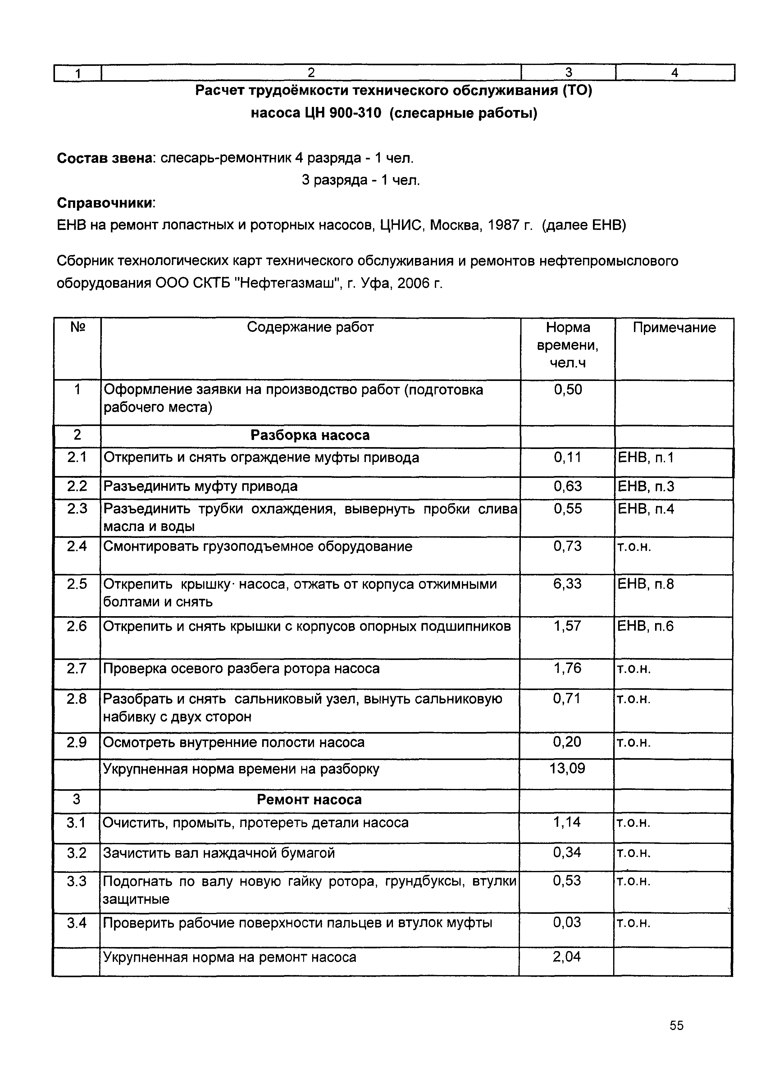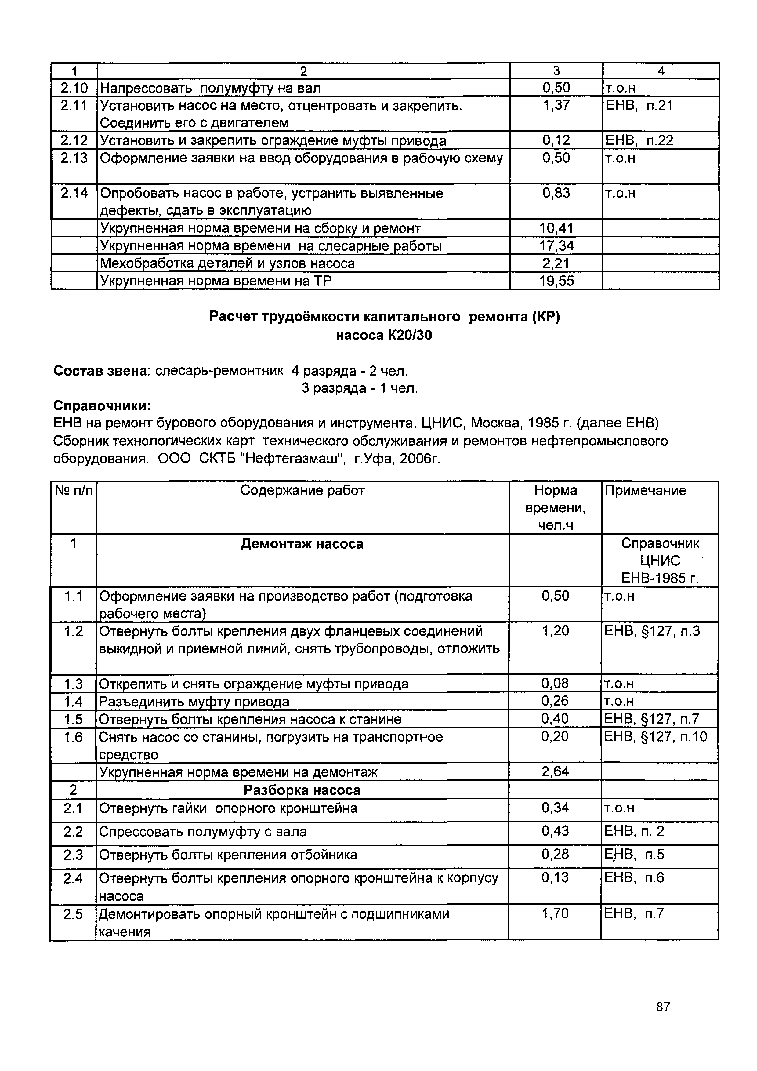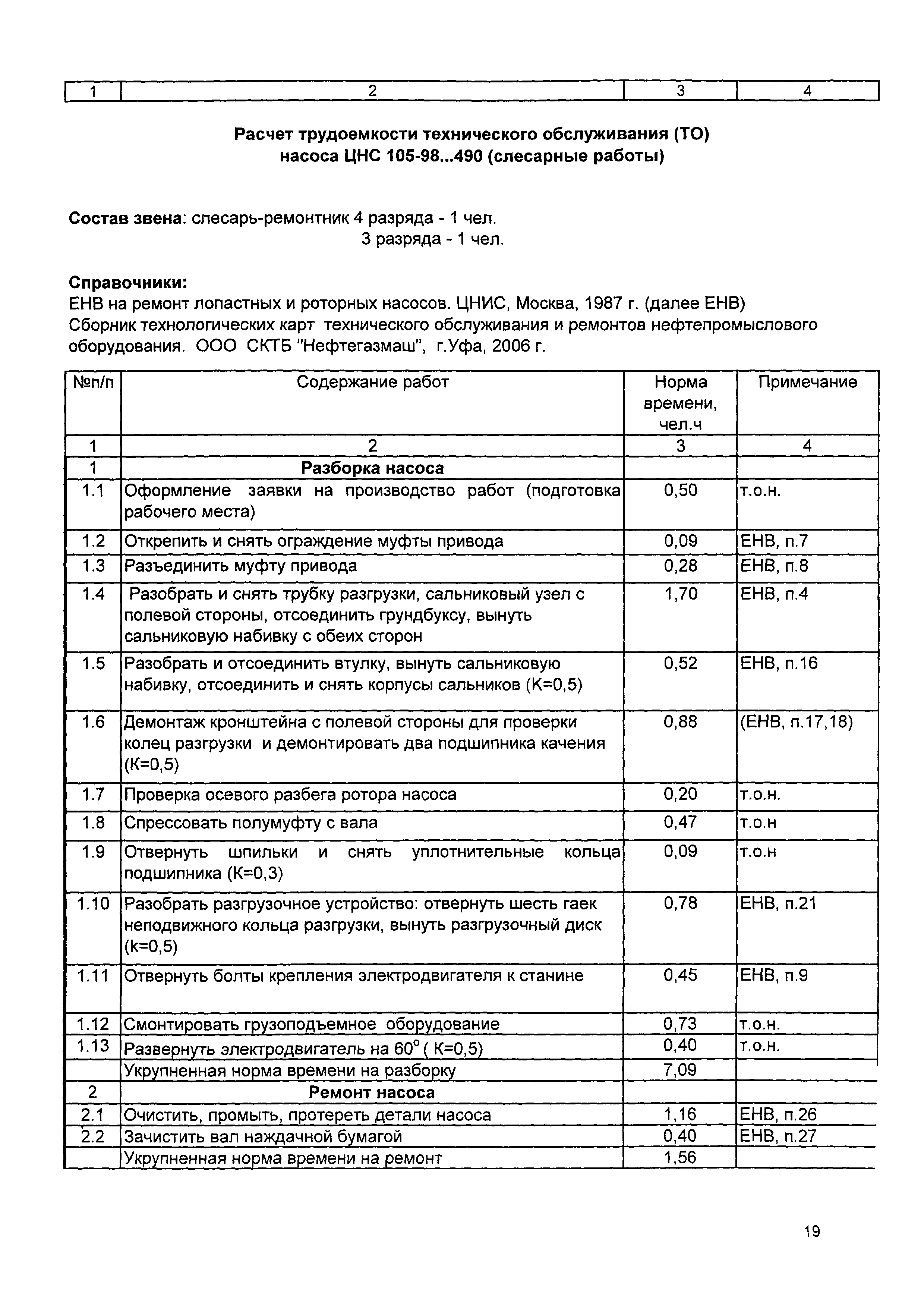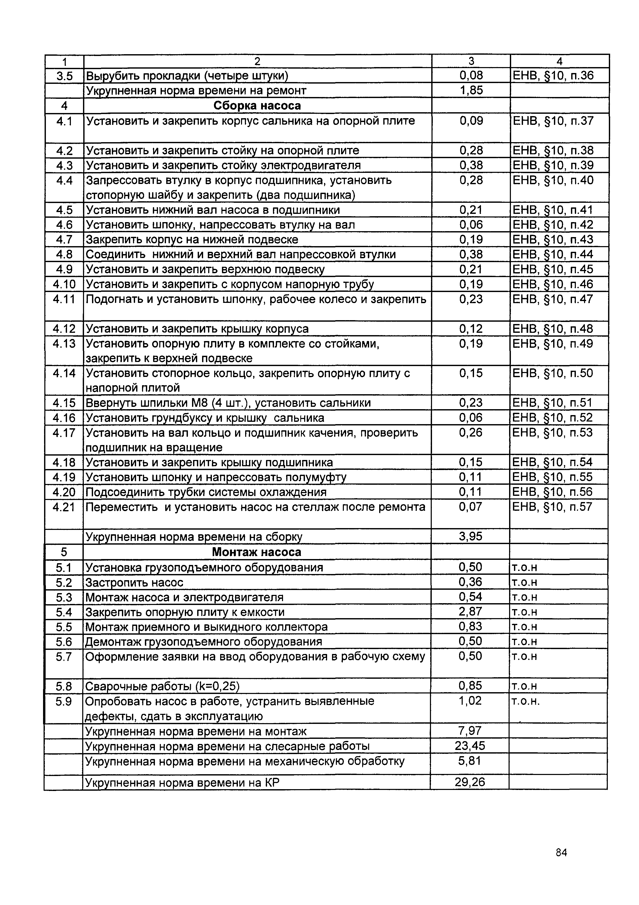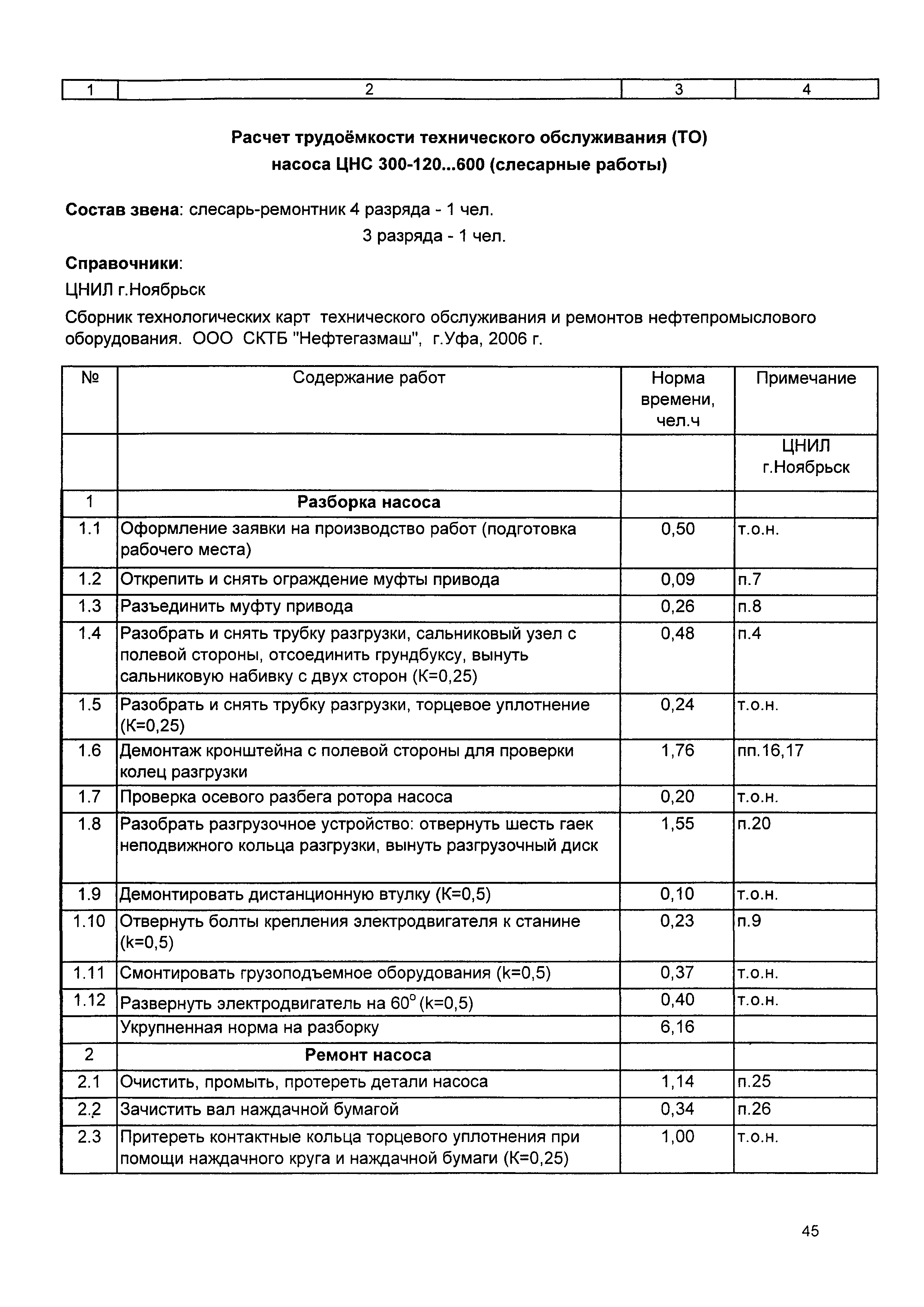 Сборник норм трудоемкости технического обслуживания и ремонтов насосов и станков-качалок. Часть 2| Статус: | действует | | Название рус.: | Сборник норм трудоемкости технического обслуживания и ремонтов насосов и станков-качалок. Часть 2 | | Дата добавления в базу: | 01.10.2014 | | Дата актуализации: | 01.01.2021 | | Область применения: | Сборник является нормативным документом по проведению технического обслуживания и ремонтов (ТО и Р) НПО и служит для: планирования ремонтных работ, определения их объема, составления сметной документации и организации подготовительных работ к ремонту; определения потребности в технических средствах (машинах, механизмах и т.д.) и материальных ресурсах, подбора ремонтного персонала и осуществления контроля за правильным расходованием средств на ремонтные работы. Сборник предназначен для работников структурных подразделений и производственных объектов, занятых планированием, организацией и проведением технического обслуживания и ремонтов (НПО). | | Оглавление: | Общие положения Насос ЦНС 38-44…220 Насос ЦНС 60-66…330 Насос ЦНС 105-98…490 Насосы ЦНС 180-1050. ЦНС 180-1422, ЦНС 180-1900 Насос ЦНС 300-120…600 Насос ЦН 900-310 Насос 12НА-9Х4 Насос 24А-18Х1-1 Насос АХП 45/31-А-СД-П Насос К20/30 Насос Ш5-25 Насос 6Ш8-2 Насос НБ-32 Насос НК 200/210А Станки-качалки СКД8-3-4000, СК8-3,5-4000, 7СК8-3,5-4000 Редукторы Ц2НШ-750А, Ц2НШ-750Б, R-35 ("Вулкан") | | Разработан: | ООО СПКТБ НЕФТЕГАЗМАШ