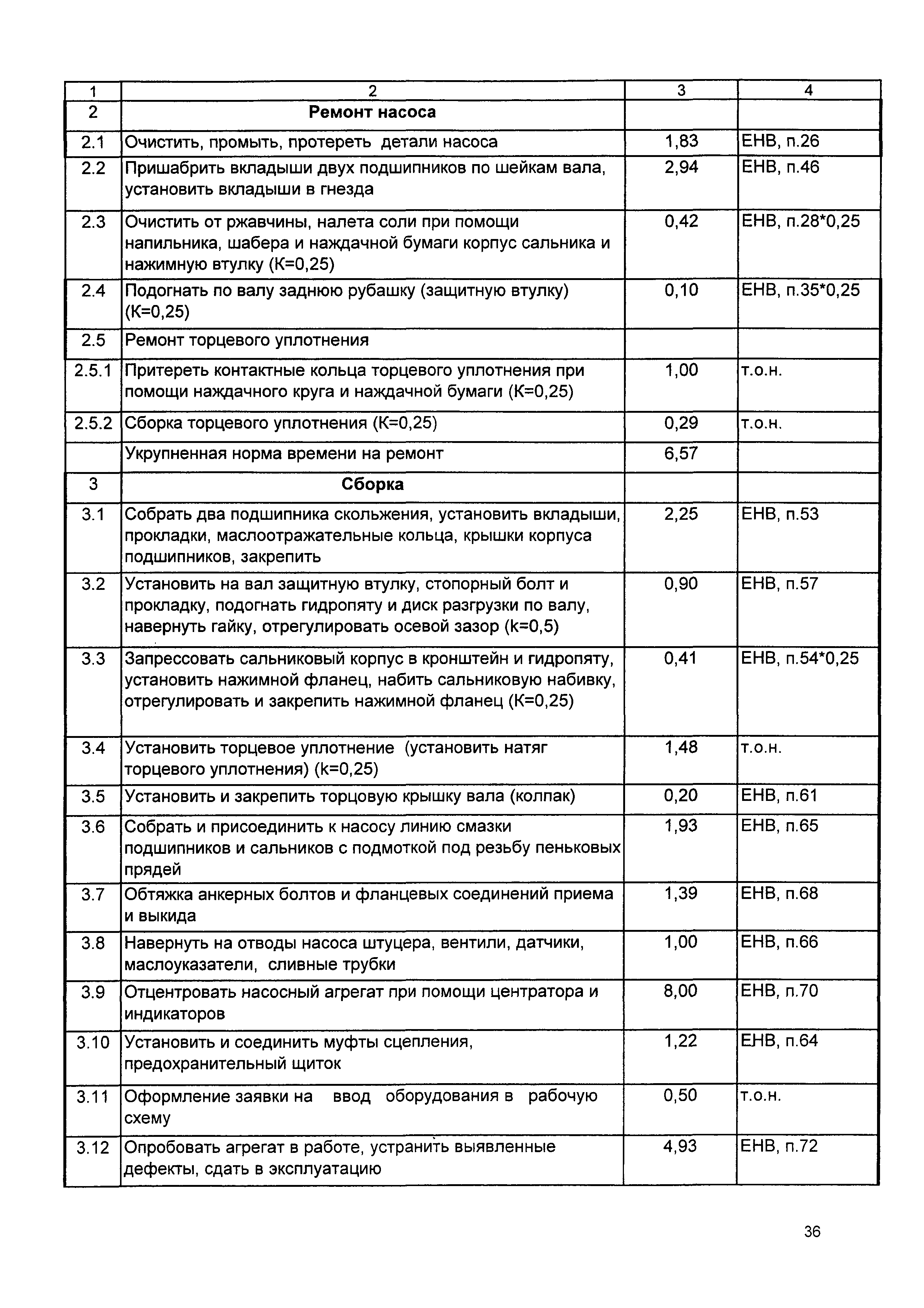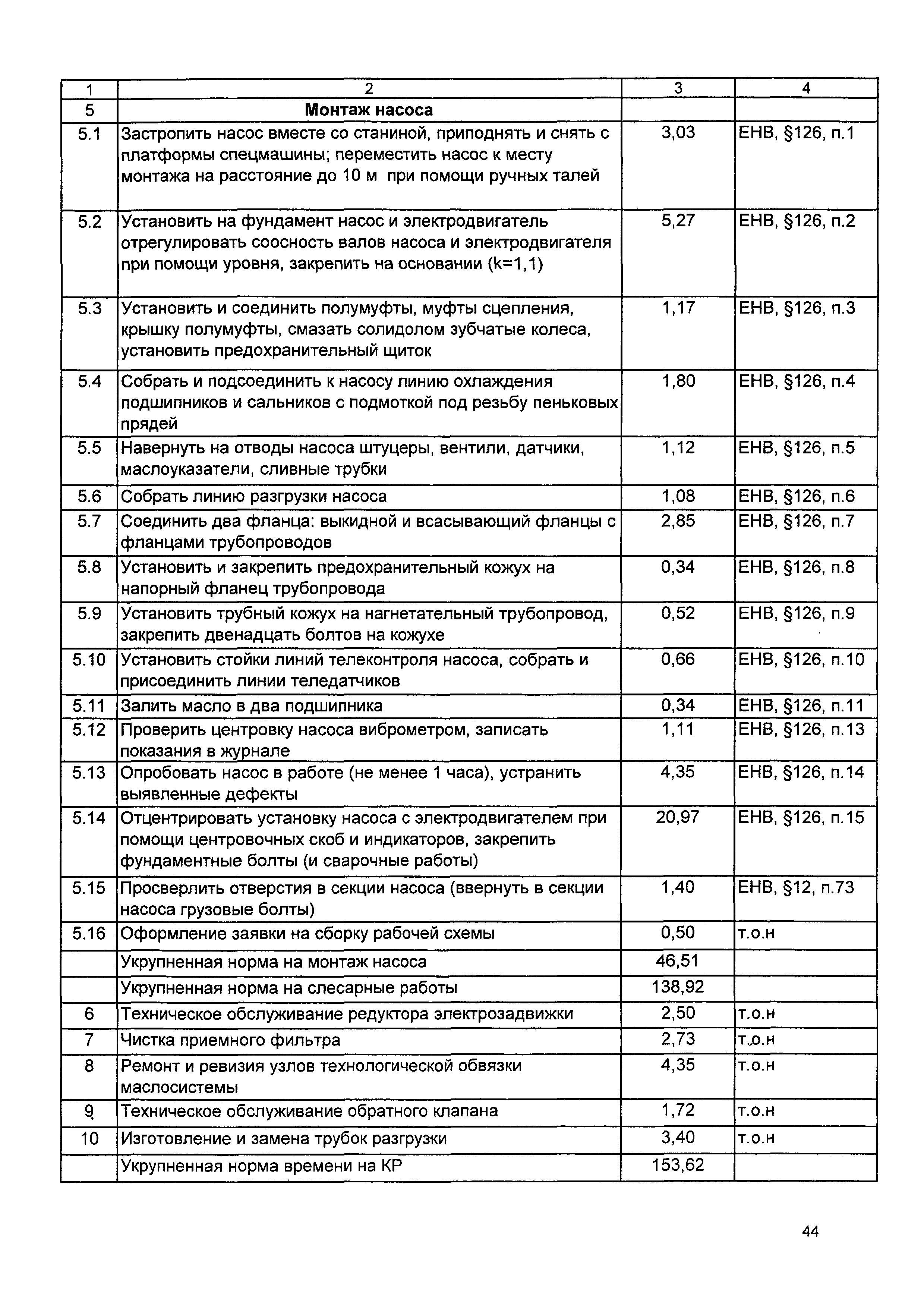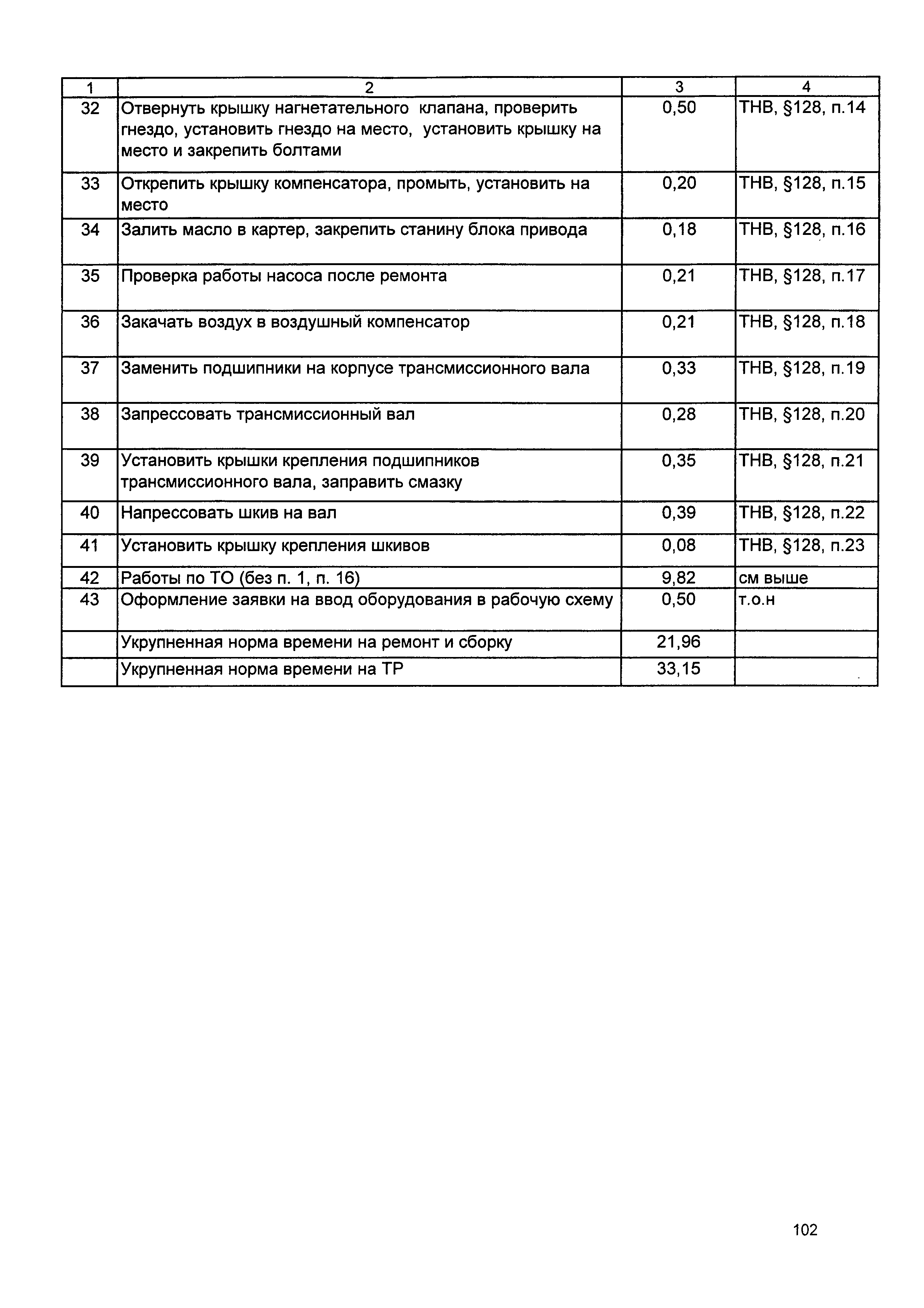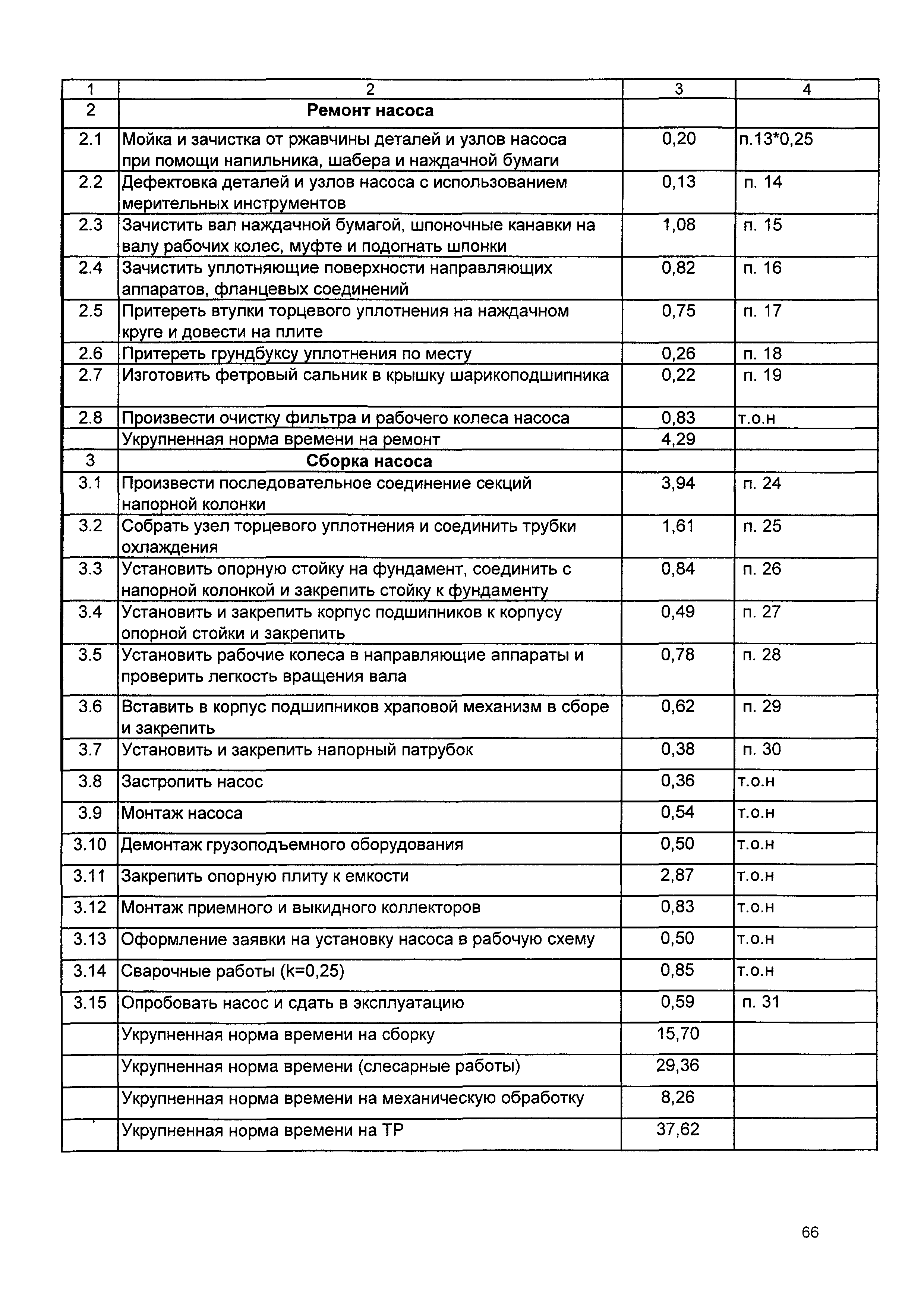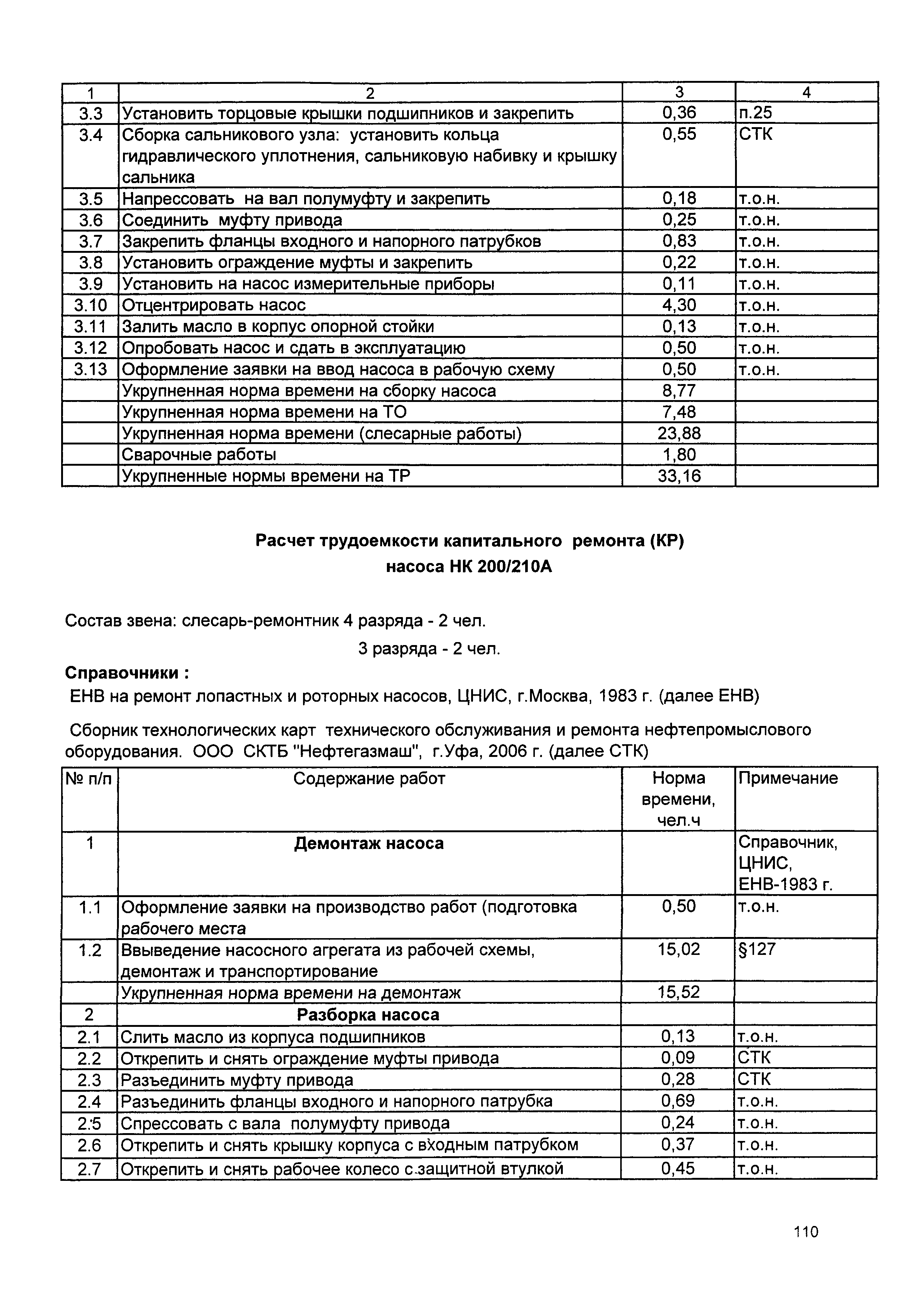 Сборник норм трудоемкости технического обслуживания и ремонтов насосов и станков-качалок. Часть 2| Статус: | действует | | Название рус.: | Сборник норм трудоемкости технического обслуживания и ремонтов насосов и станков-качалок. Часть 2 | | Дата добавления в базу: | 01.10.2014 | | Дата актуализации: | 01.01.2021 | | Область применения: | Сборник является нормативным документом по проведению технического обслуживания и ремонтов (ТО и Р) НПО и служит для: планирования ремонтных работ, определения их объема, составления сметной документации и организации подготовительных работ к ремонту; определения потребности в технических средствах (машинах, механизмах и т.д.) и материальных ресурсах, подбора ремонтного персонала и осуществления контроля за правильным расходованием средств на ремонтные работы. Сборник предназначен для работников структурных подразделений и производственных объектов, занятых планированием, организацией и проведением технического обслуживания и ремонтов (НПО). | | Оглавление: | Общие положения Насос ЦНС 38-44…220 Насос ЦНС 60-66…330 Насос ЦНС 105-98…490 Насосы ЦНС 180-1050. ЦНС 180-1422, ЦНС 180-1900 Насос ЦНС 300-120…600 Насос ЦН 900-310 Насос 12НА-9Х4 Насос 24А-18Х1-1 Насос АХП 45/31-А-СД-П Насос К20/30 Насос Ш5-25 Насос 6Ш8-2 Насос НБ-32 Насос НК 200/210А Станки-качалки СКД8-3-4000, СК8-3,5-4000, 7СК8-3,5-4000 Редукторы Ц2НШ-750А, Ц2НШ-750Б, R-35 ("Вулкан") | | Разработан: | ООО СПКТБ НЕФТЕГАЗМАШ