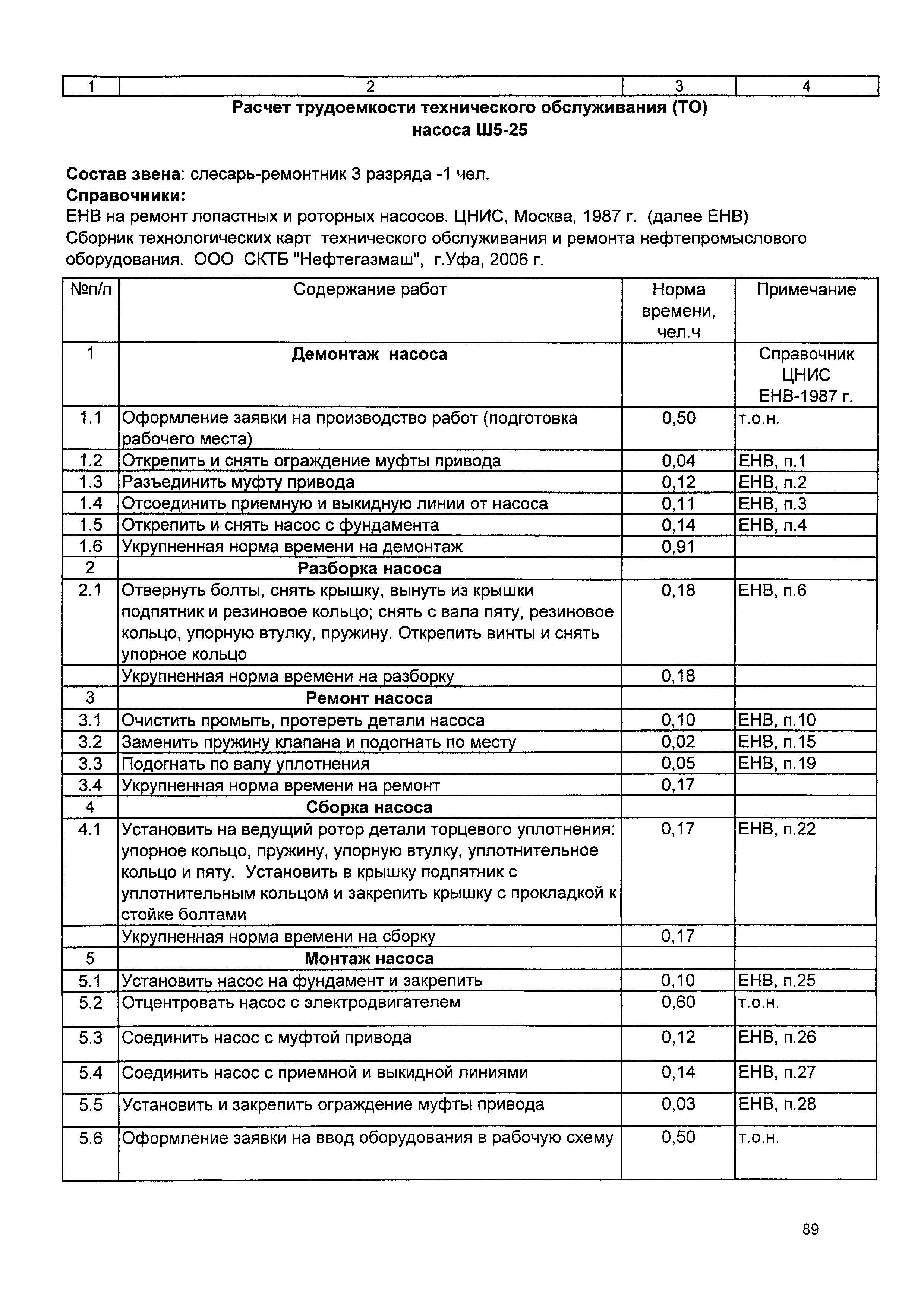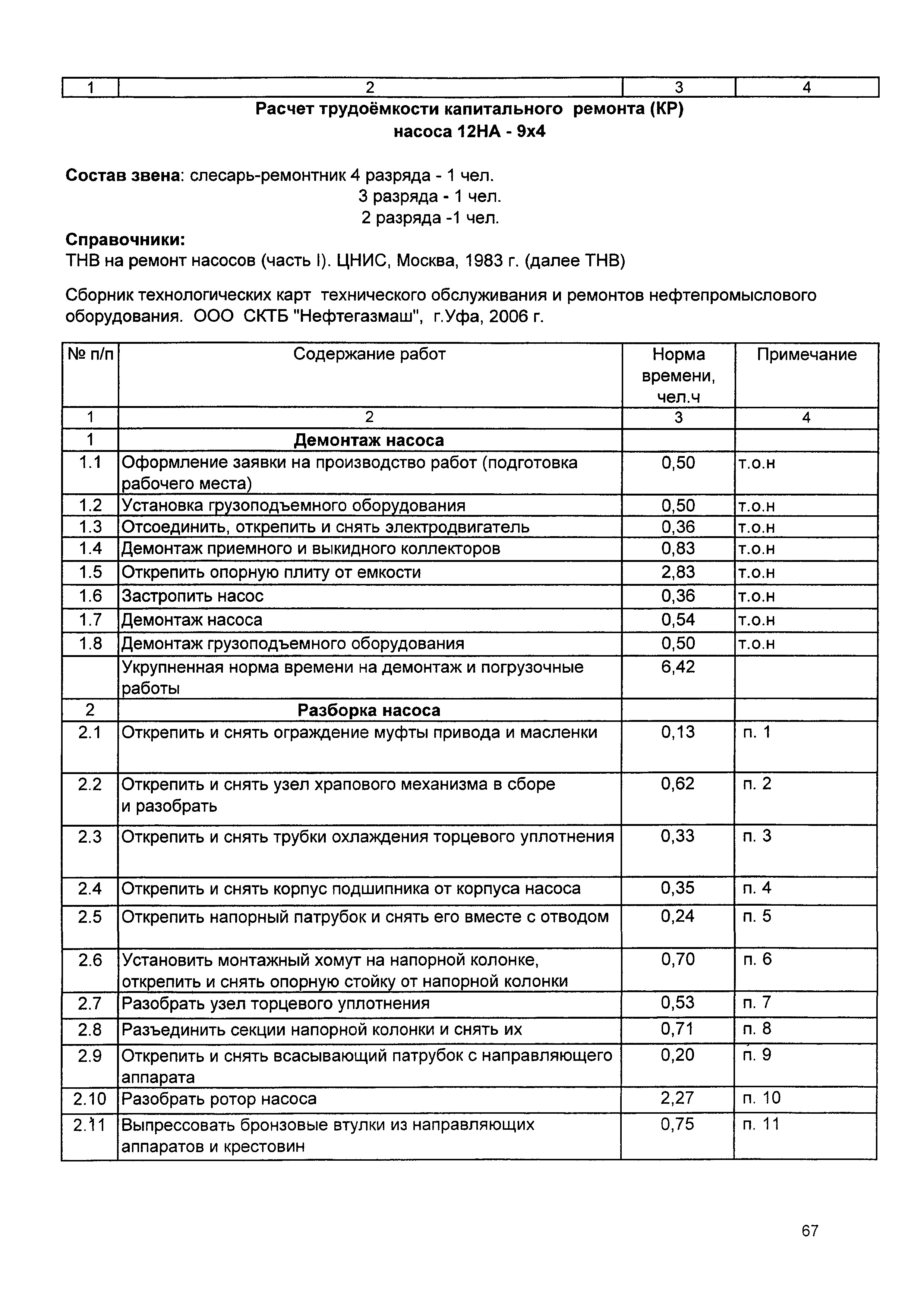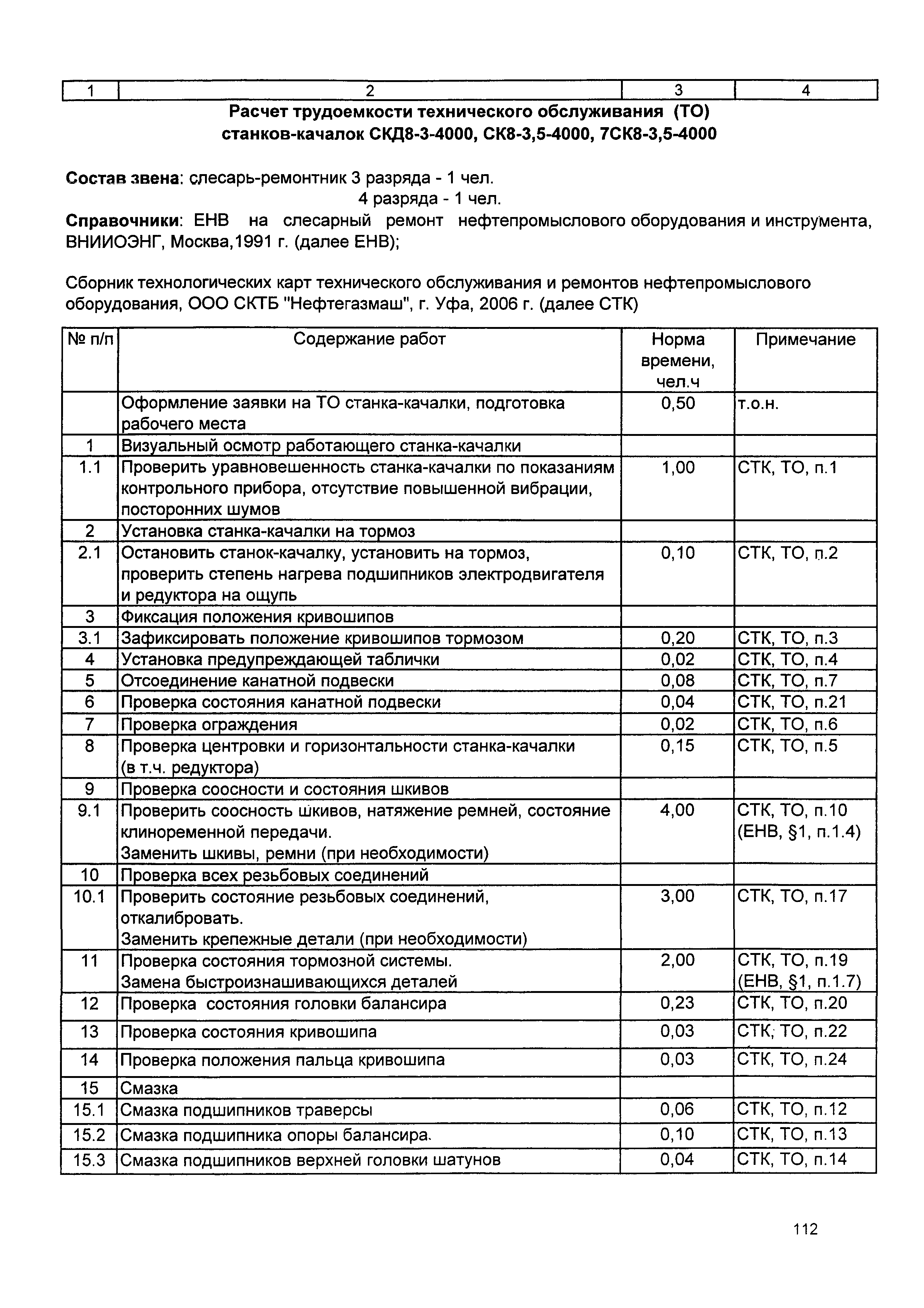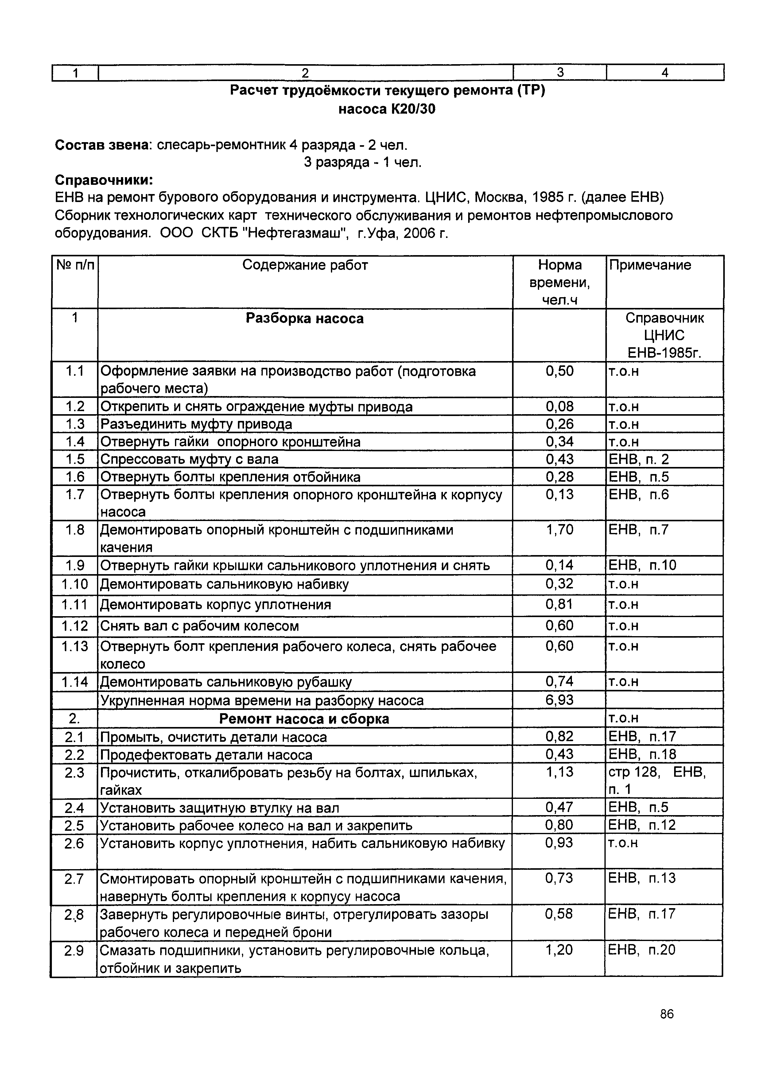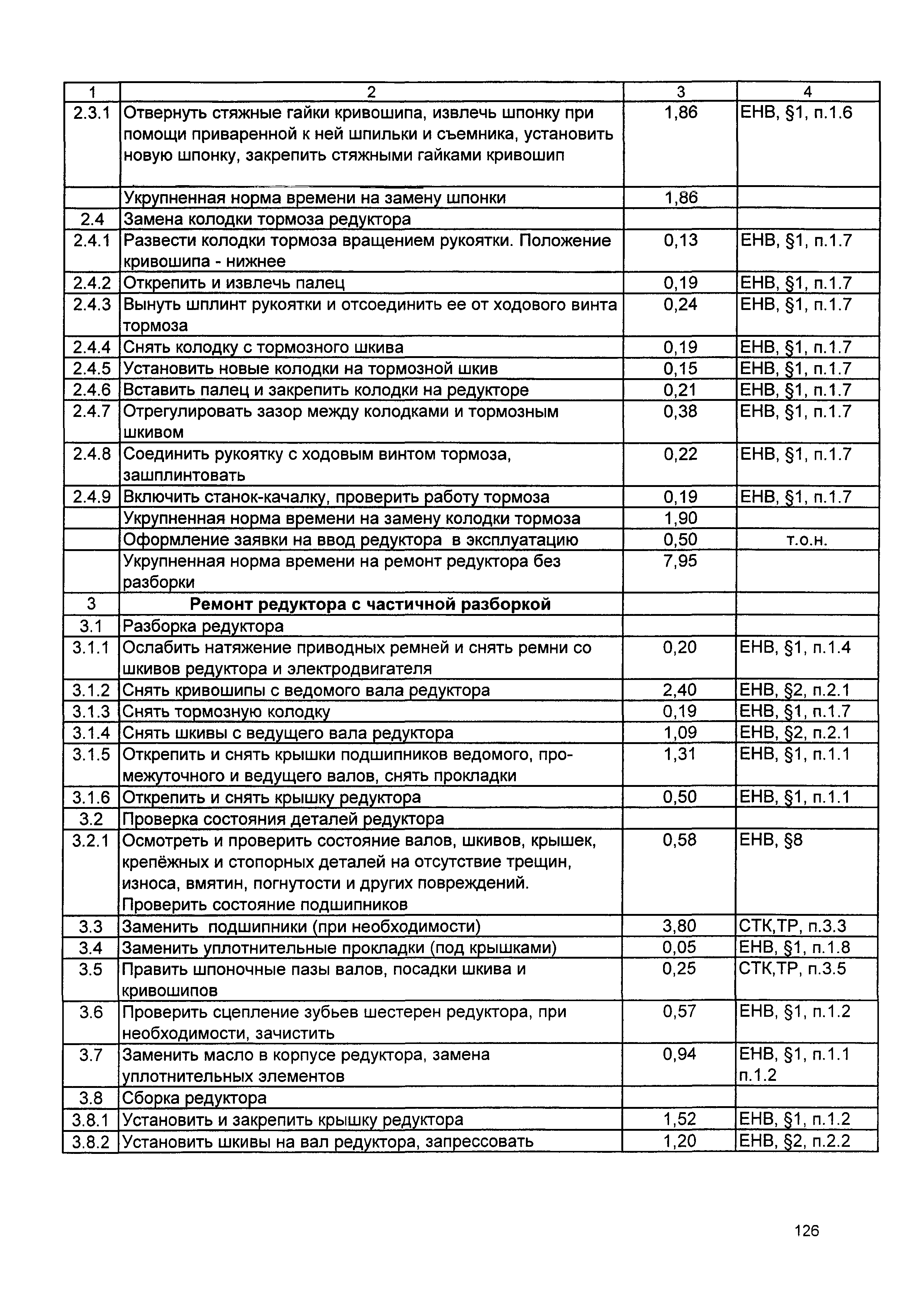 Сборник норм трудоемкости технического обслуживания и ремонтов насосов и станков-качалок. Часть 2| Статус: | действует | | Название рус.: | Сборник норм трудоемкости технического обслуживания и ремонтов насосов и станков-качалок. Часть 2 | | Дата добавления в базу: | 01.10.2014 | | Дата актуализации: | 01.01.2021 | | Область применения: | Сборник является нормативным документом по проведению технического обслуживания и ремонтов (ТО и Р) НПО и служит для: планирования ремонтных работ, определения их объема, составления сметной документации и организации подготовительных работ к ремонту; определения потребности в технических средствах (машинах, механизмах и т.д.) и материальных ресурсах, подбора ремонтного персонала и осуществления контроля за правильным расходованием средств на ремонтные работы. Сборник предназначен для работников структурных подразделений и производственных объектов, занятых планированием, организацией и проведением технического обслуживания и ремонтов (НПО). | | Оглавление: | Общие положения Насос ЦНС 38-44…220 Насос ЦНС 60-66…330 Насос ЦНС 105-98…490 Насосы ЦНС 180-1050. ЦНС 180-1422, ЦНС 180-1900 Насос ЦНС 300-120…600 Насос ЦН 900-310 Насос 12НА-9Х4 Насос 24А-18Х1-1 Насос АХП 45/31-А-СД-П Насос К20/30 Насос Ш5-25 Насос 6Ш8-2 Насос НБ-32 Насос НК 200/210А Станки-качалки СКД8-3-4000, СК8-3,5-4000, 7СК8-3,5-4000 Редукторы Ц2НШ-750А, Ц2НШ-750Б, R-35 ("Вулкан") | | Разработан: | ООО СПКТБ НЕФТЕГАЗМАШ