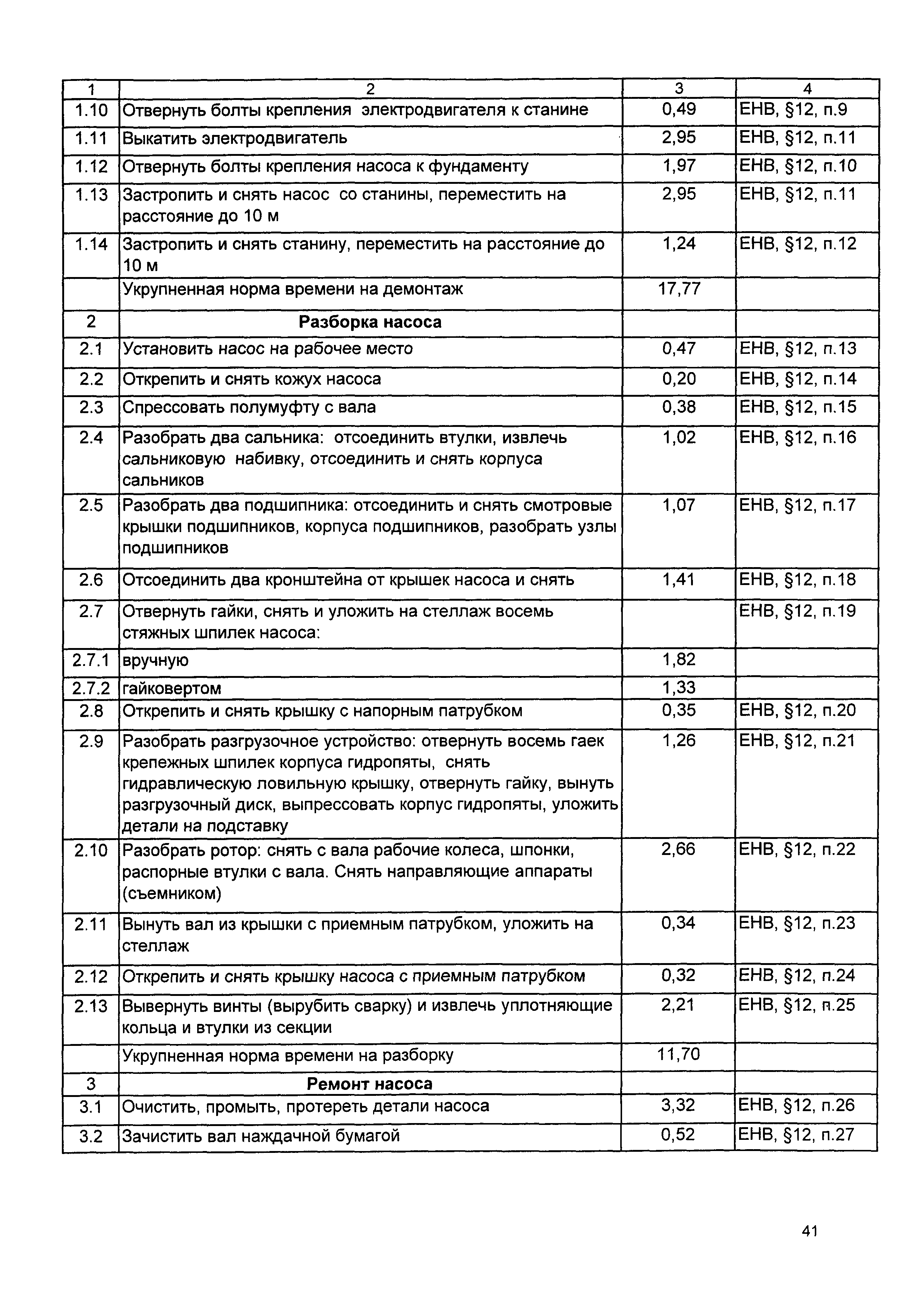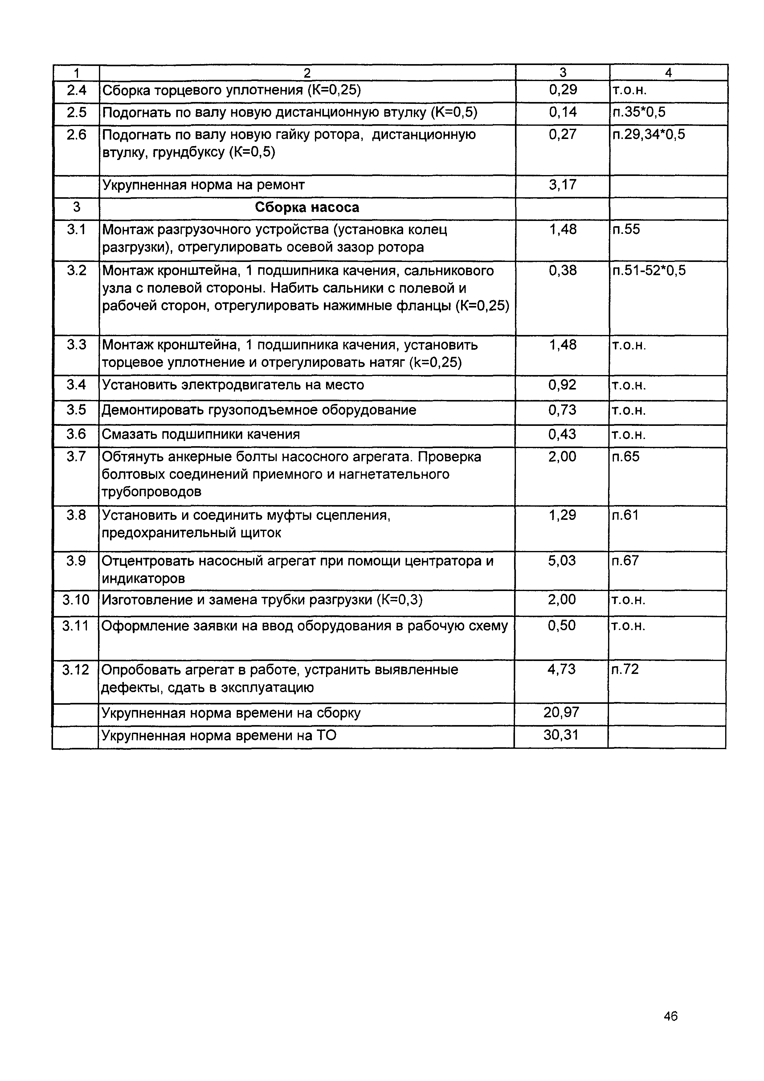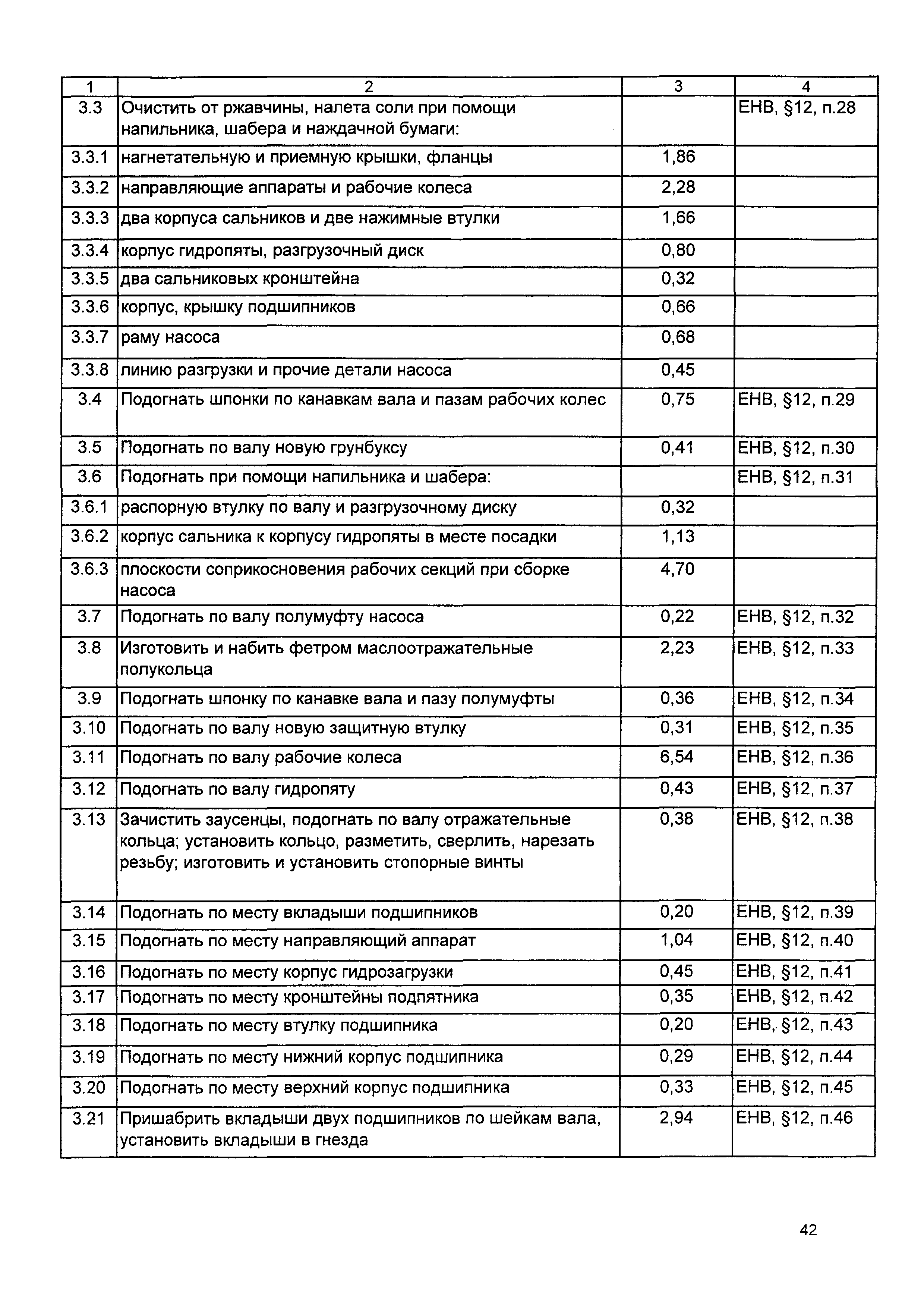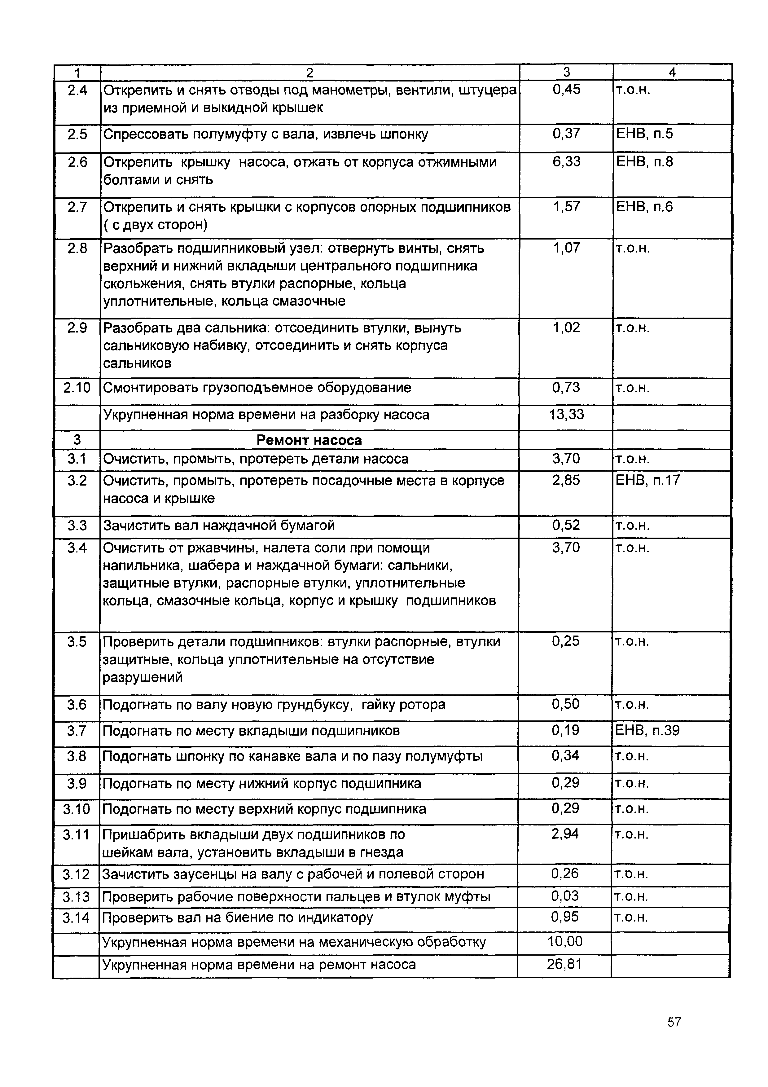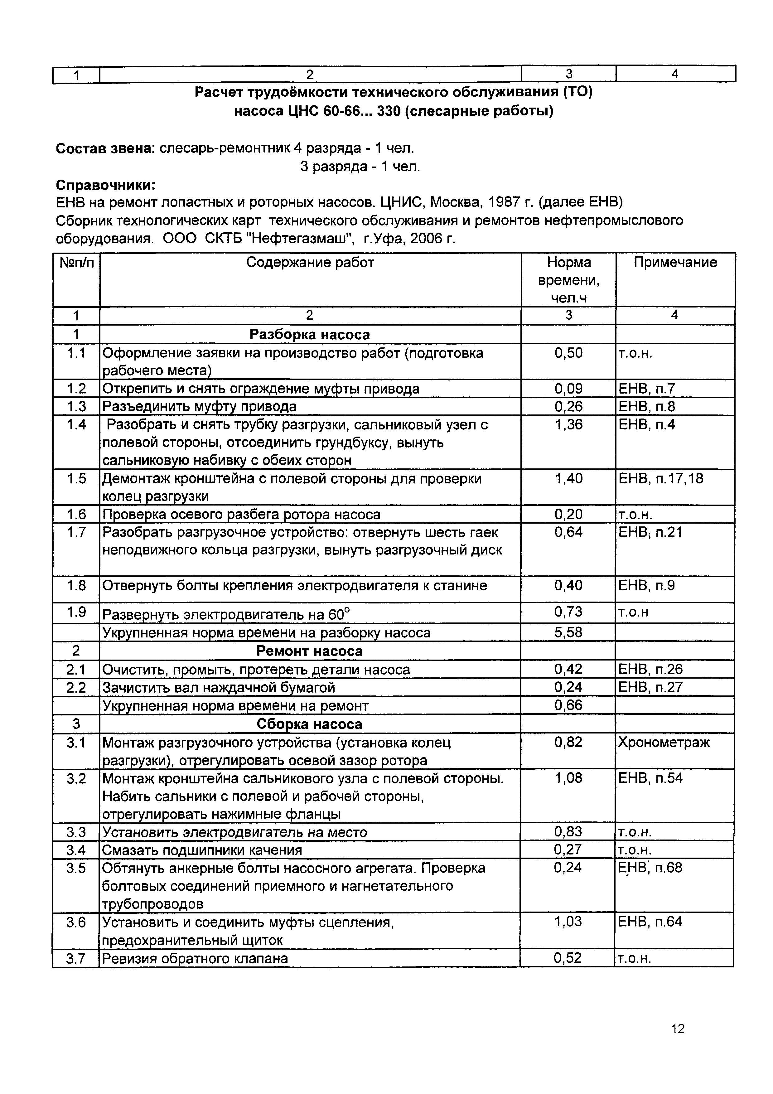 Сборник норм трудоемкости технического обслуживания и ремонтов насосов и станков-качалок. Часть 2| Статус: | действует | | Название рус.: | Сборник норм трудоемкости технического обслуживания и ремонтов насосов и станков-качалок. Часть 2 | | Дата добавления в базу: | 01.10.2014 | | Дата актуализации: | 01.01.2021 | | Область применения: | Сборник является нормативным документом по проведению технического обслуживания и ремонтов (ТО и Р) НПО и служит для: планирования ремонтных работ, определения их объема, составления сметной документации и организации подготовительных работ к ремонту; определения потребности в технических средствах (машинах, механизмах и т.д.) и материальных ресурсах, подбора ремонтного персонала и осуществления контроля за правильным расходованием средств на ремонтные работы. Сборник предназначен для работников структурных подразделений и производственных объектов, занятых планированием, организацией и проведением технического обслуживания и ремонтов (НПО). | | Оглавление: | Общие положения Насос ЦНС 38-44…220 Насос ЦНС 60-66…330 Насос ЦНС 105-98…490 Насосы ЦНС 180-1050. ЦНС 180-1422, ЦНС 180-1900 Насос ЦНС 300-120…600 Насос ЦН 900-310 Насос 12НА-9Х4 Насос 24А-18Х1-1 Насос АХП 45/31-А-СД-П Насос К20/30 Насос Ш5-25 Насос 6Ш8-2 Насос НБ-32 Насос НК 200/210А Станки-качалки СКД8-3-4000, СК8-3,5-4000, 7СК8-3,5-4000 Редукторы Ц2НШ-750А, Ц2НШ-750Б, R-35 ("Вулкан") | | Разработан: | ООО СПКТБ НЕФТЕГАЗМАШ