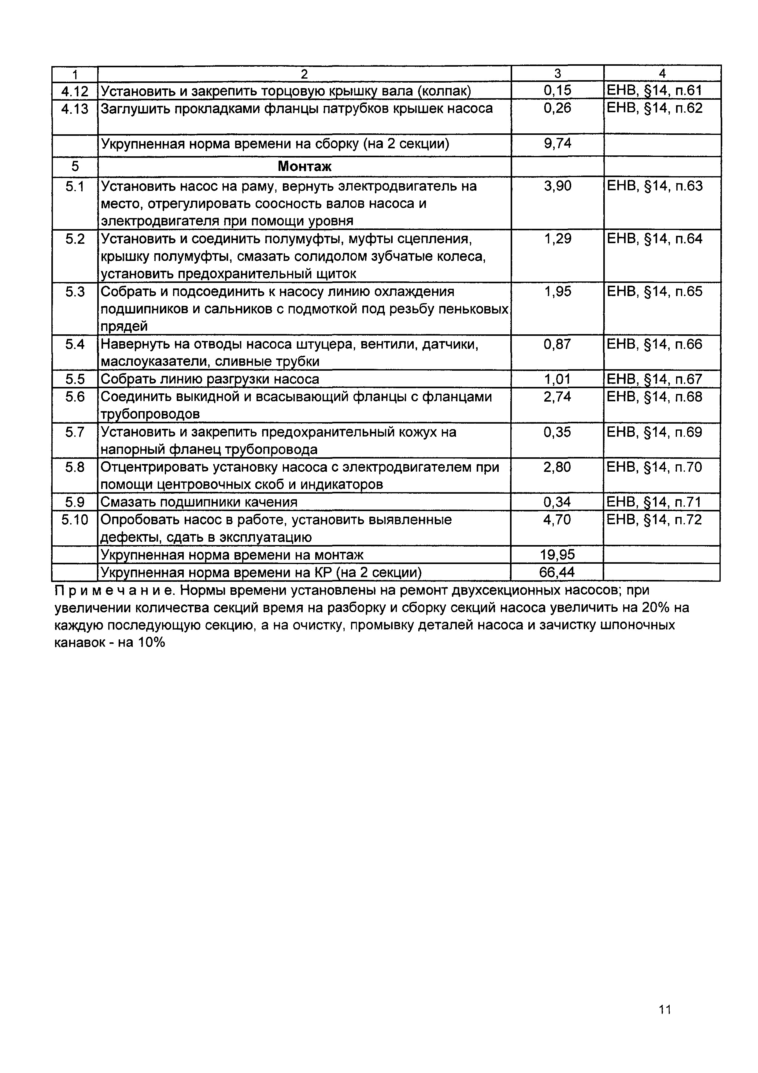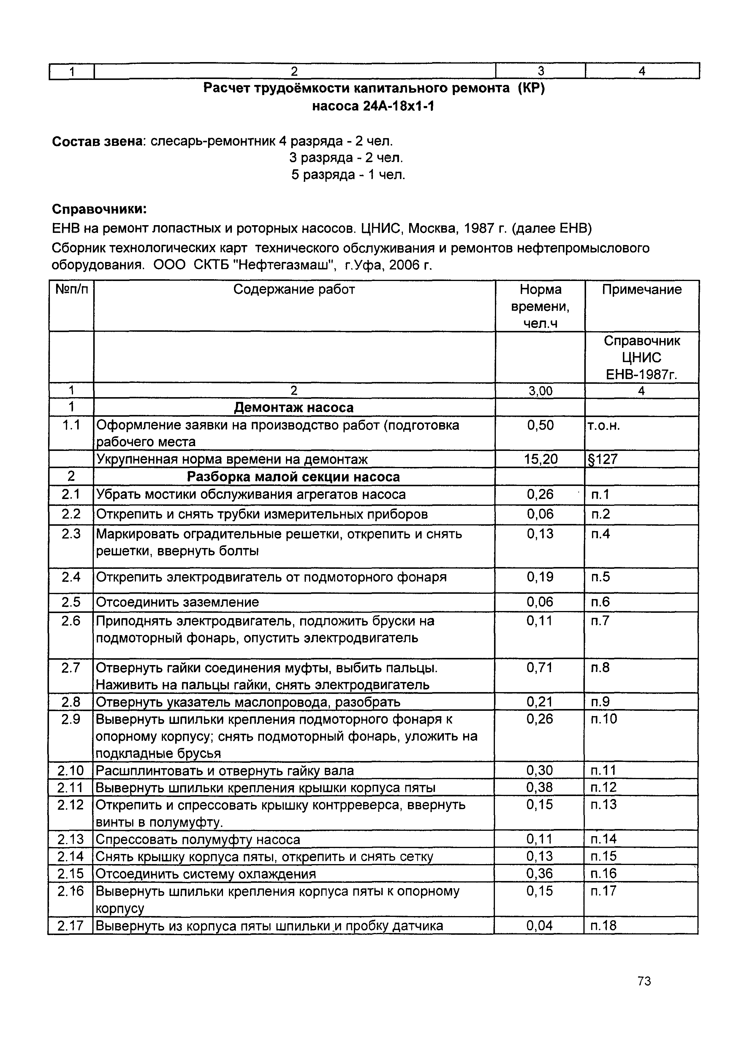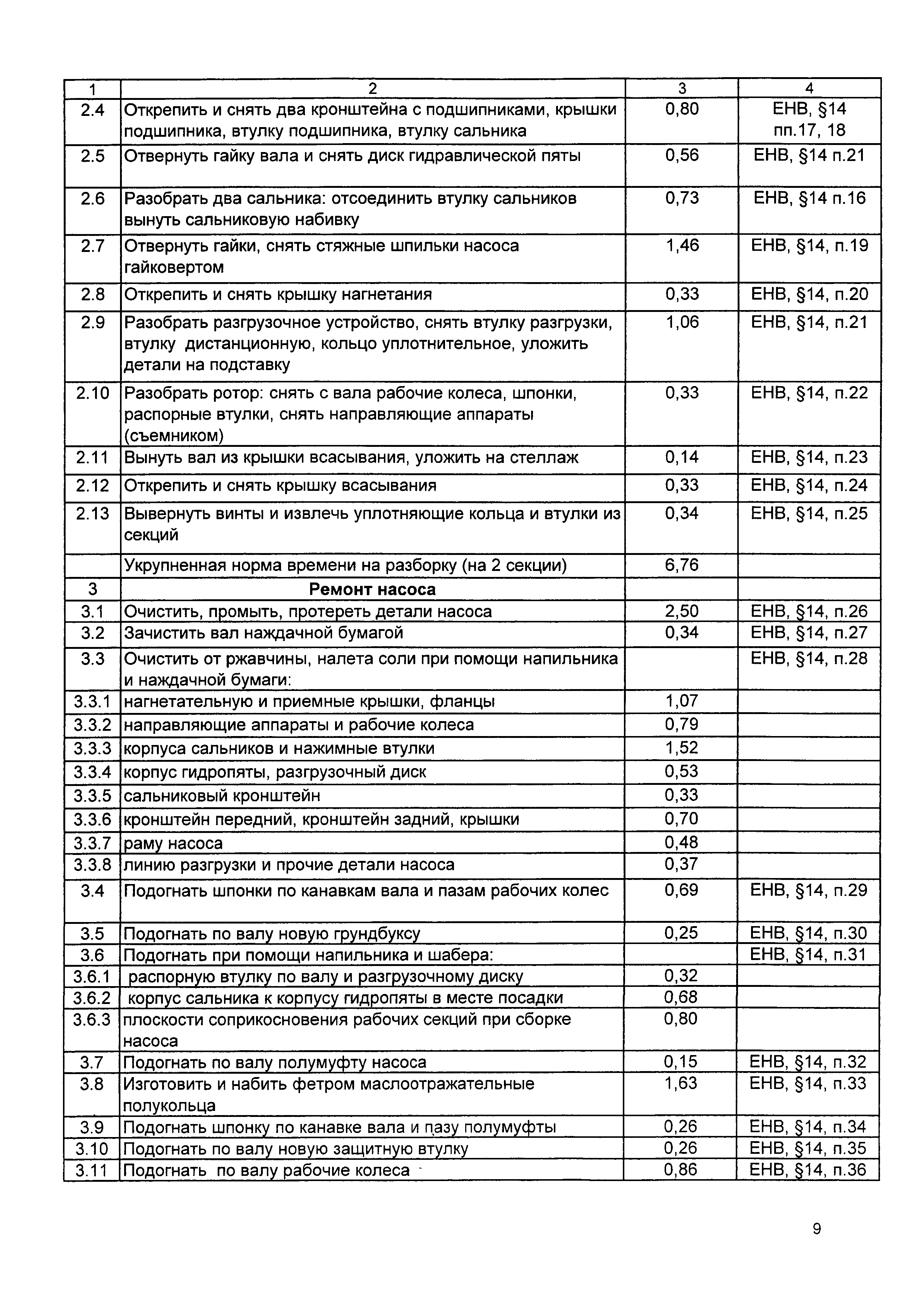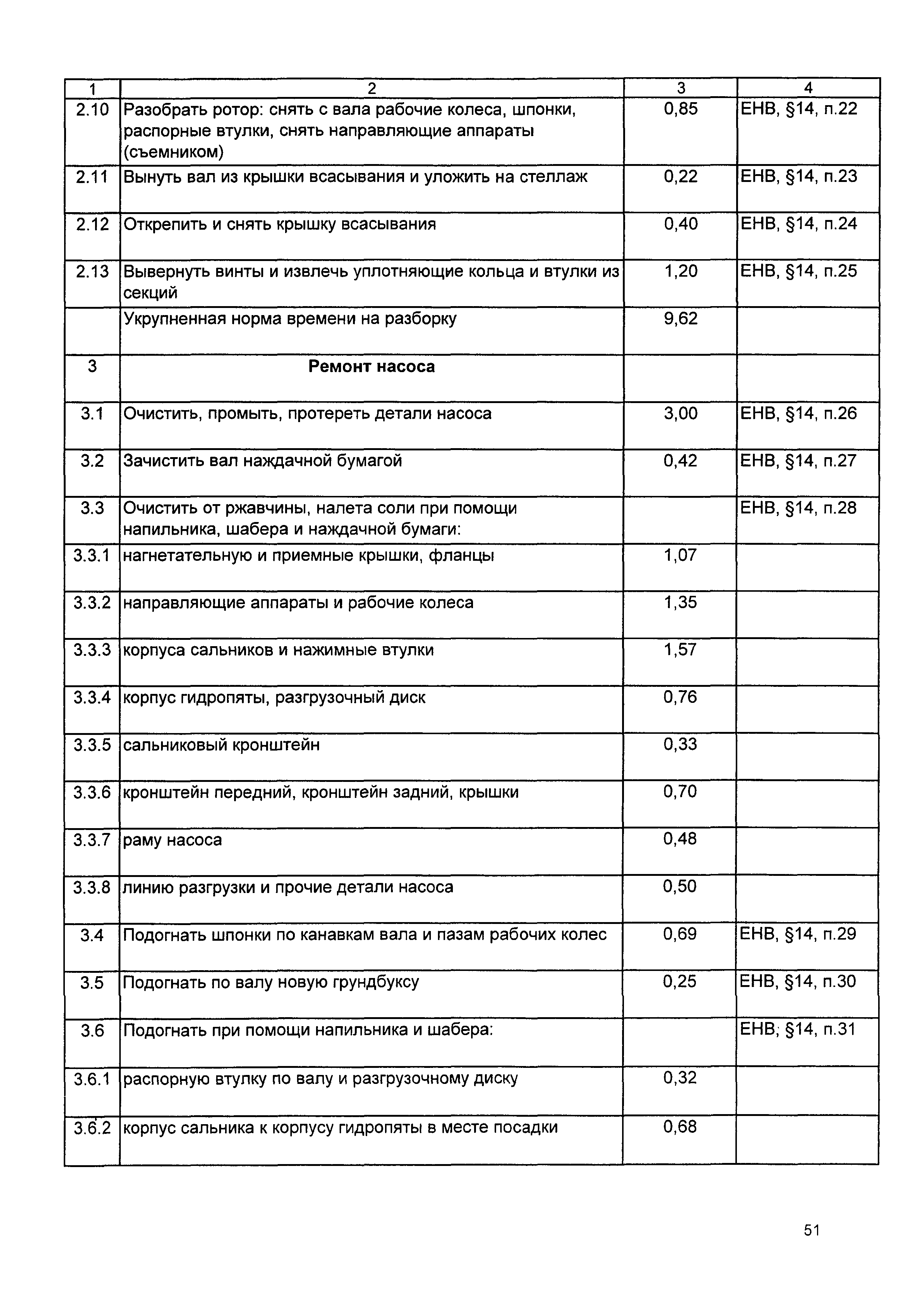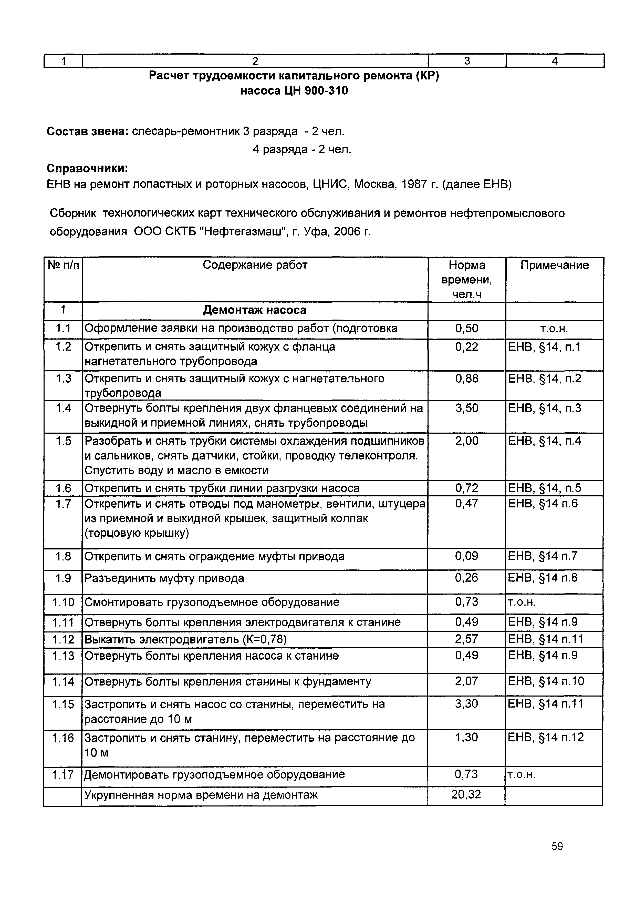 Сборник норм трудоемкости технического обслуживания и ремонтов насосов и станков-качалок. Часть 2| Статус: | действует | | Название рус.: | Сборник норм трудоемкости технического обслуживания и ремонтов насосов и станков-качалок. Часть 2 | | Дата добавления в базу: | 01.10.2014 | | Дата актуализации: | 01.01.2021 | | Область применения: | Сборник является нормативным документом по проведению технического обслуживания и ремонтов (ТО и Р) НПО и служит для: планирования ремонтных работ, определения их объема, составления сметной документации и организации подготовительных работ к ремонту; определения потребности в технических средствах (машинах, механизмах и т.д.) и материальных ресурсах, подбора ремонтного персонала и осуществления контроля за правильным расходованием средств на ремонтные работы. Сборник предназначен для работников структурных подразделений и производственных объектов, занятых планированием, организацией и проведением технического обслуживания и ремонтов (НПО). | | Оглавление: | Общие положения Насос ЦНС 38-44…220 Насос ЦНС 60-66…330 Насос ЦНС 105-98…490 Насосы ЦНС 180-1050. ЦНС 180-1422, ЦНС 180-1900 Насос ЦНС 300-120…600 Насос ЦН 900-310 Насос 12НА-9Х4 Насос 24А-18Х1-1 Насос АХП 45/31-А-СД-П Насос К20/30 Насос Ш5-25 Насос 6Ш8-2 Насос НБ-32 Насос НК 200/210А Станки-качалки СКД8-3-4000, СК8-3,5-4000, 7СК8-3,5-4000 Редукторы Ц2НШ-750А, Ц2НШ-750Б, R-35 ("Вулкан") | | Разработан: | ООО СПКТБ НЕФТЕГАЗМАШ