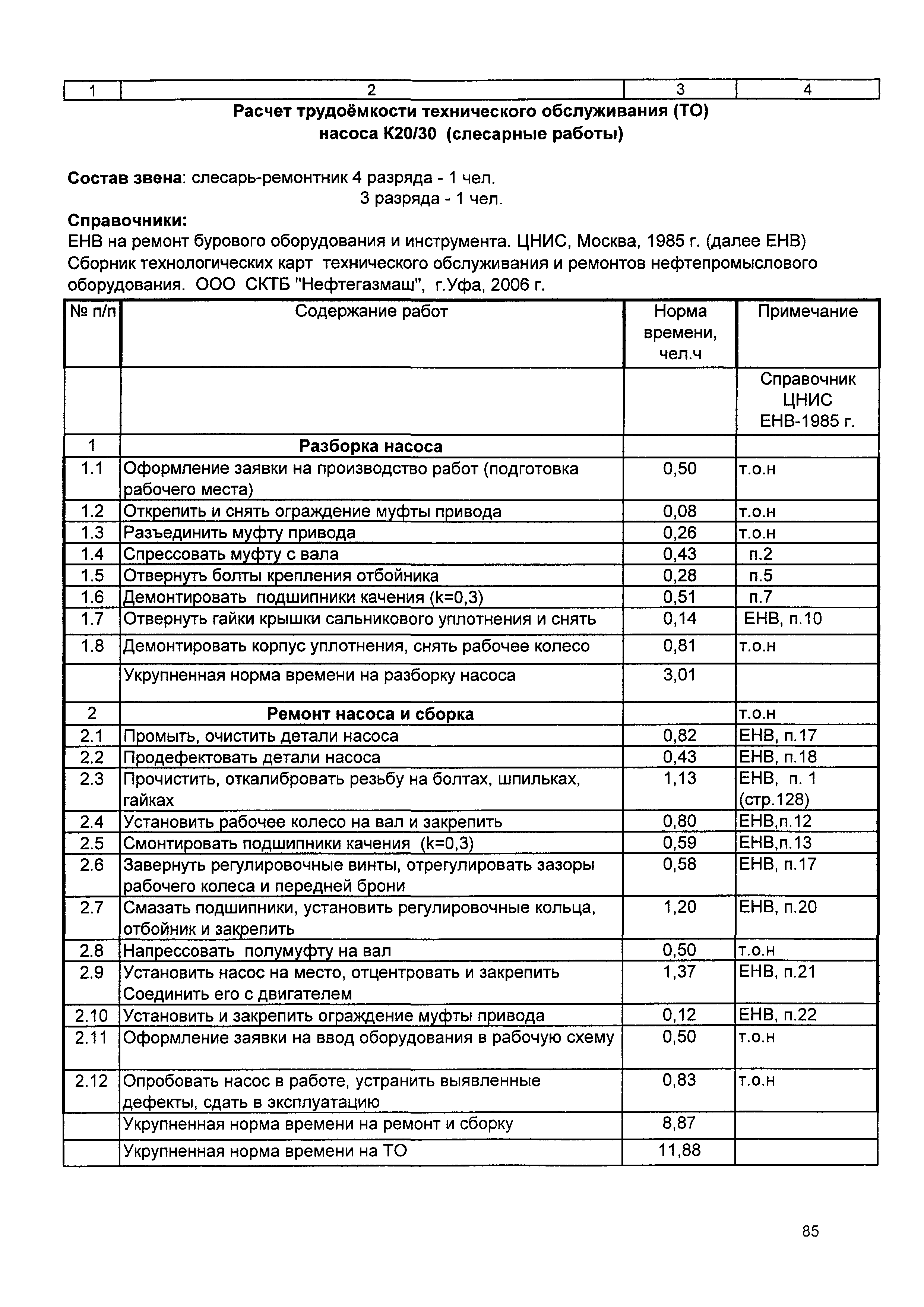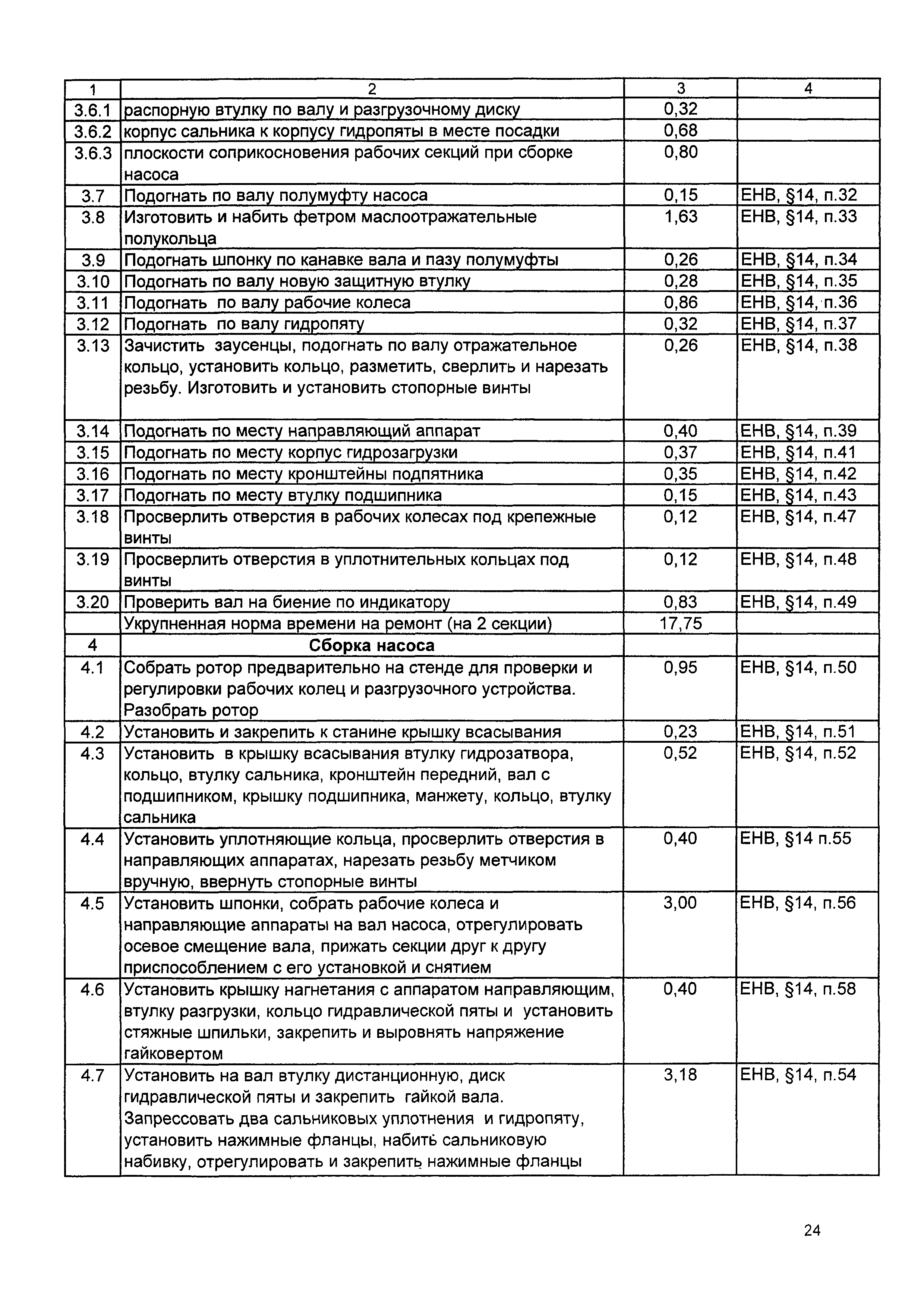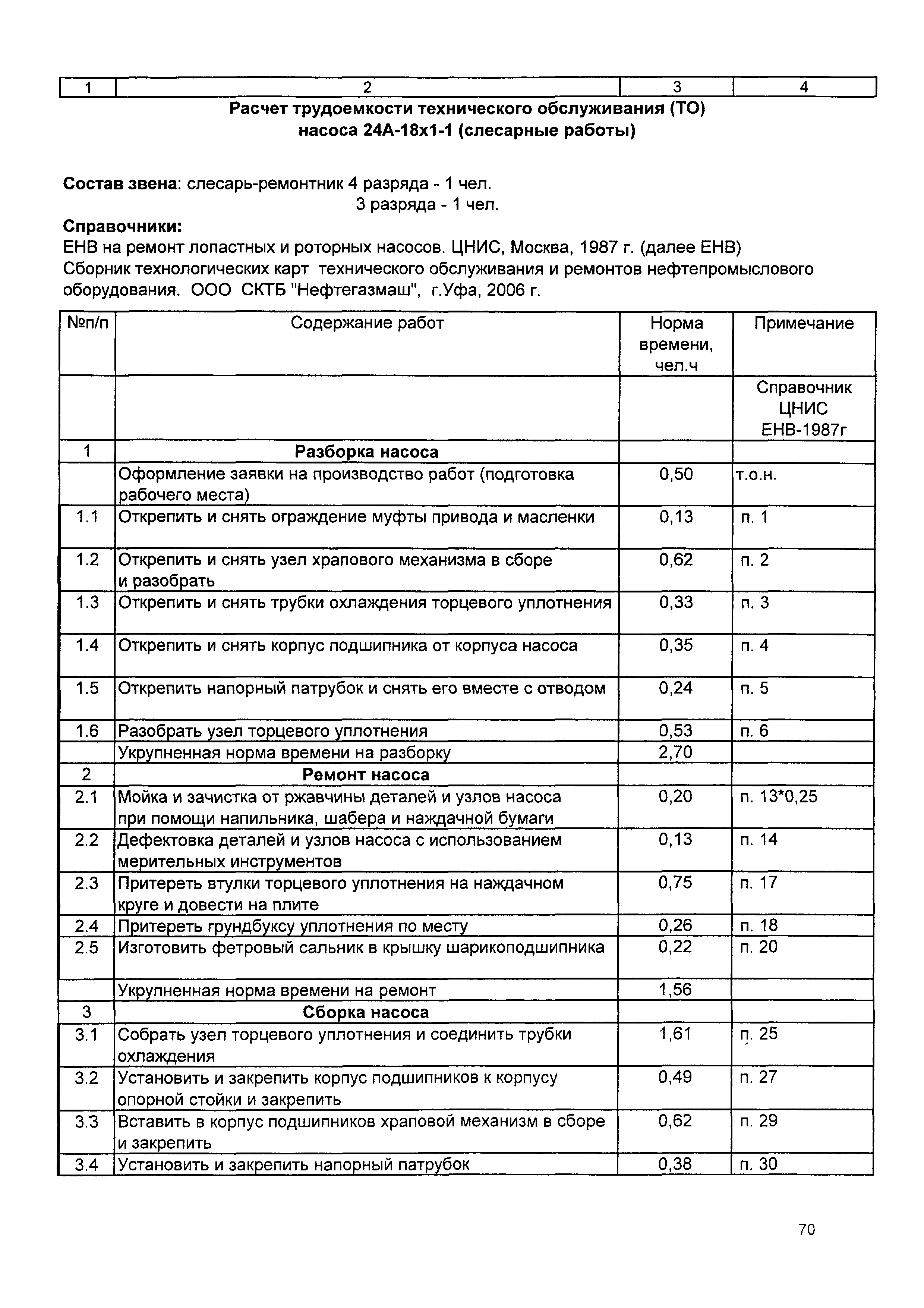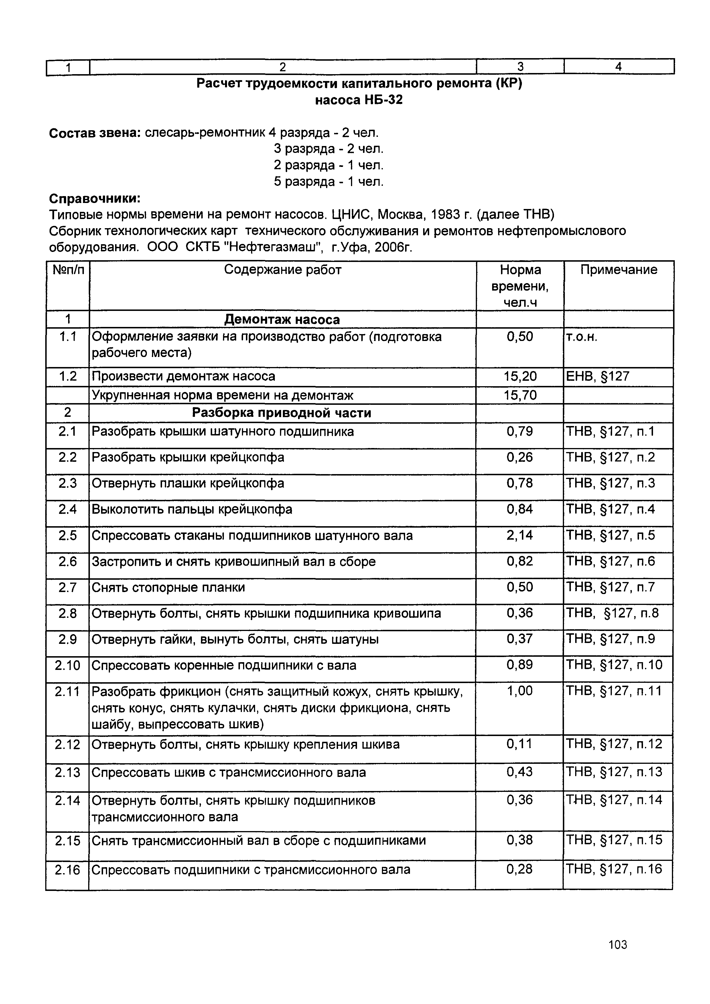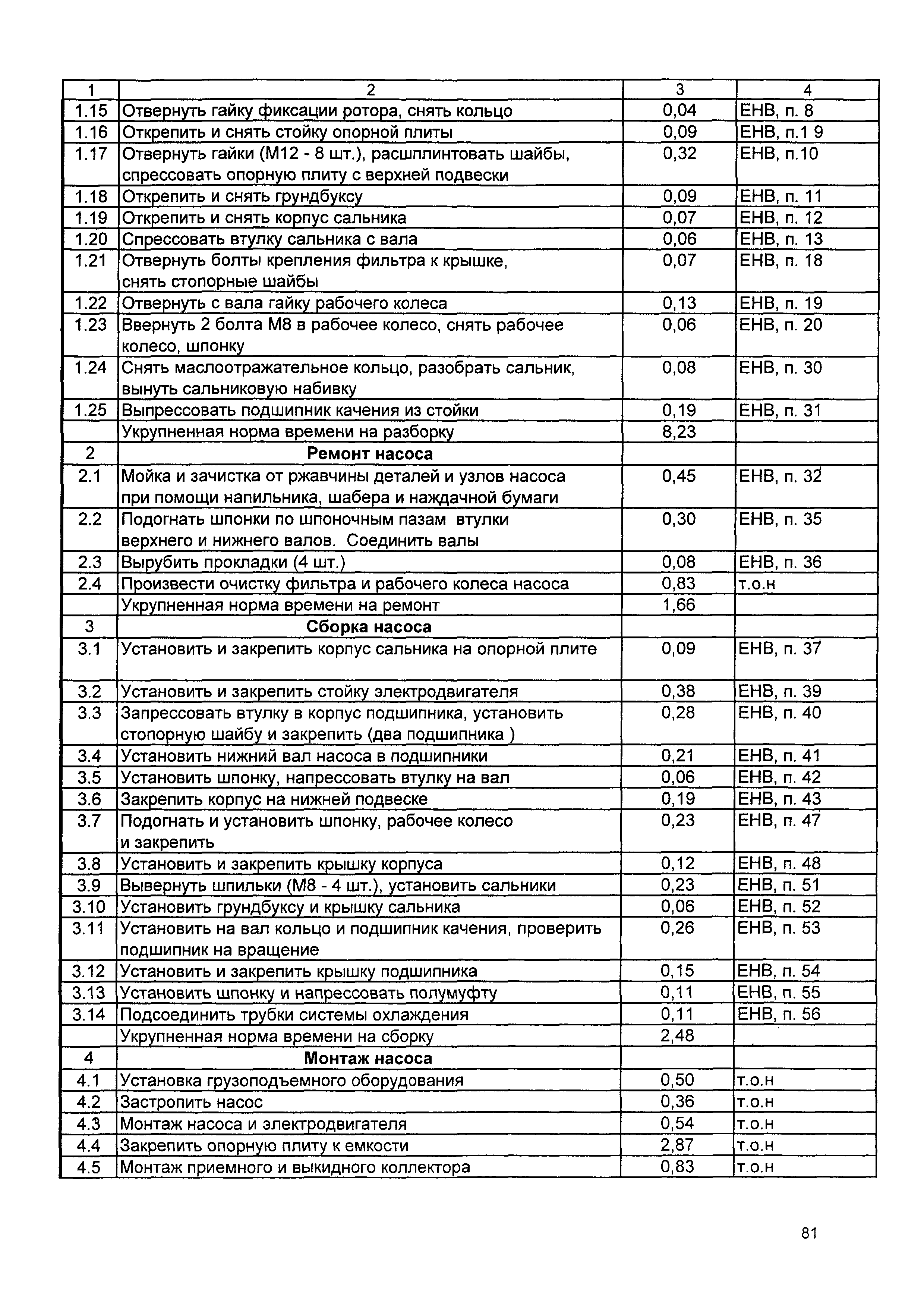 Сборник норм трудоемкости технического обслуживания и ремонтов насосов и станков-качалок. Часть 2| Статус: | действует | | Название рус.: | Сборник норм трудоемкости технического обслуживания и ремонтов насосов и станков-качалок. Часть 2 | | Дата добавления в базу: | 01.10.2014 | | Дата актуализации: | 01.01.2021 | | Область применения: | Сборник является нормативным документом по проведению технического обслуживания и ремонтов (ТО и Р) НПО и служит для: планирования ремонтных работ, определения их объема, составления сметной документации и организации подготовительных работ к ремонту; определения потребности в технических средствах (машинах, механизмах и т.д.) и материальных ресурсах, подбора ремонтного персонала и осуществления контроля за правильным расходованием средств на ремонтные работы. Сборник предназначен для работников структурных подразделений и производственных объектов, занятых планированием, организацией и проведением технического обслуживания и ремонтов (НПО). | | Оглавление: | Общие положения Насос ЦНС 38-44…220 Насос ЦНС 60-66…330 Насос ЦНС 105-98…490 Насосы ЦНС 180-1050. ЦНС 180-1422, ЦНС 180-1900 Насос ЦНС 300-120…600 Насос ЦН 900-310 Насос 12НА-9Х4 Насос 24А-18Х1-1 Насос АХП 45/31-А-СД-П Насос К20/30 Насос Ш5-25 Насос 6Ш8-2 Насос НБ-32 Насос НК 200/210А Станки-качалки СКД8-3-4000, СК8-3,5-4000, 7СК8-3,5-4000 Редукторы Ц2НШ-750А, Ц2НШ-750Б, R-35 ("Вулкан") | | Разработан: | ООО СПКТБ НЕФТЕГАЗМАШ