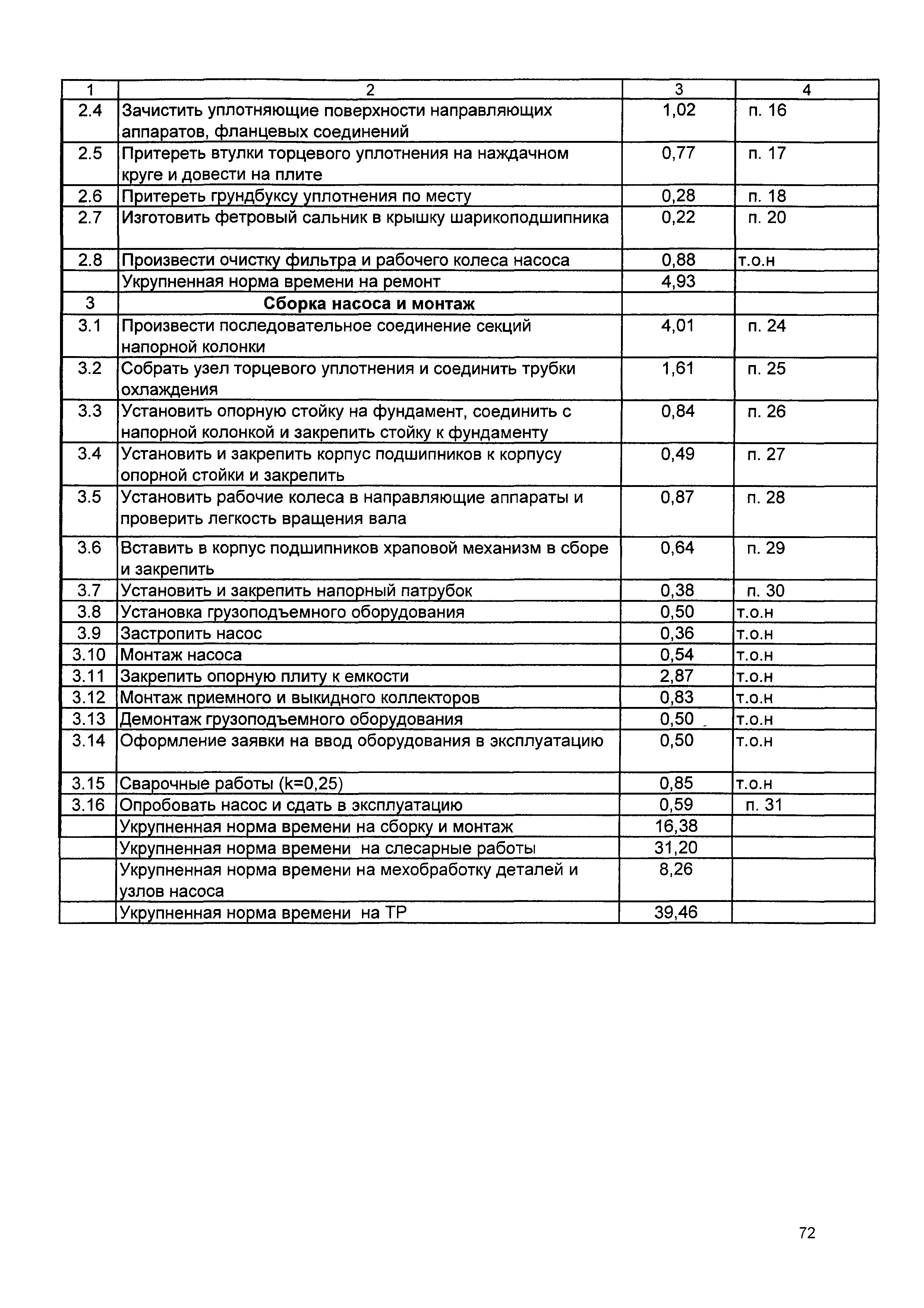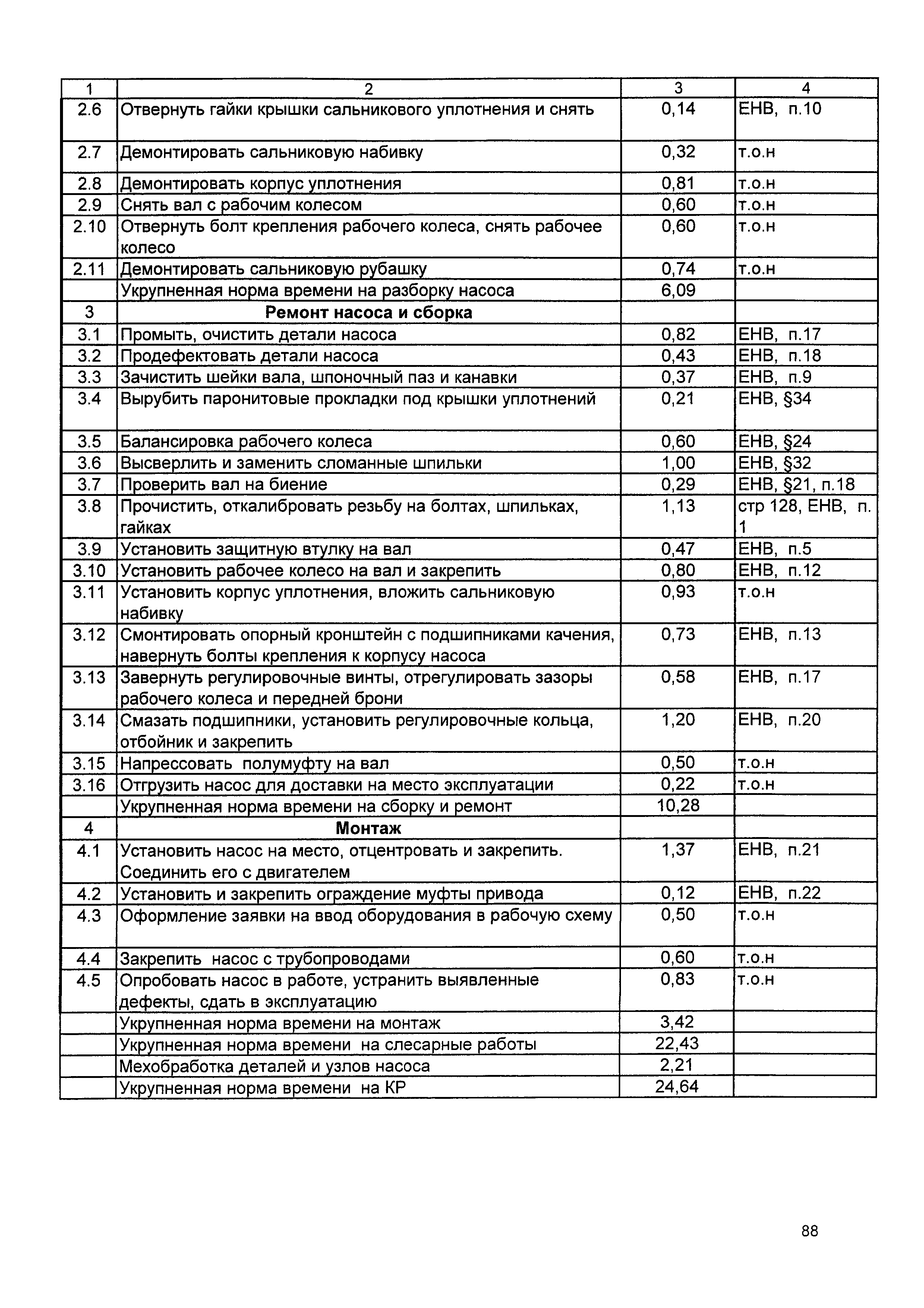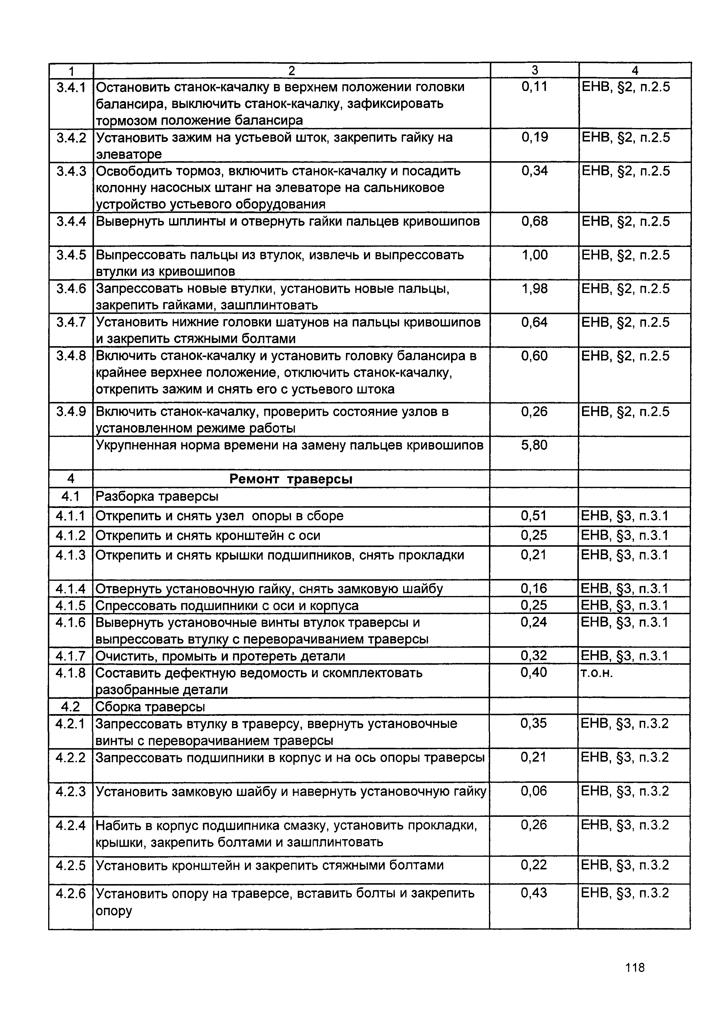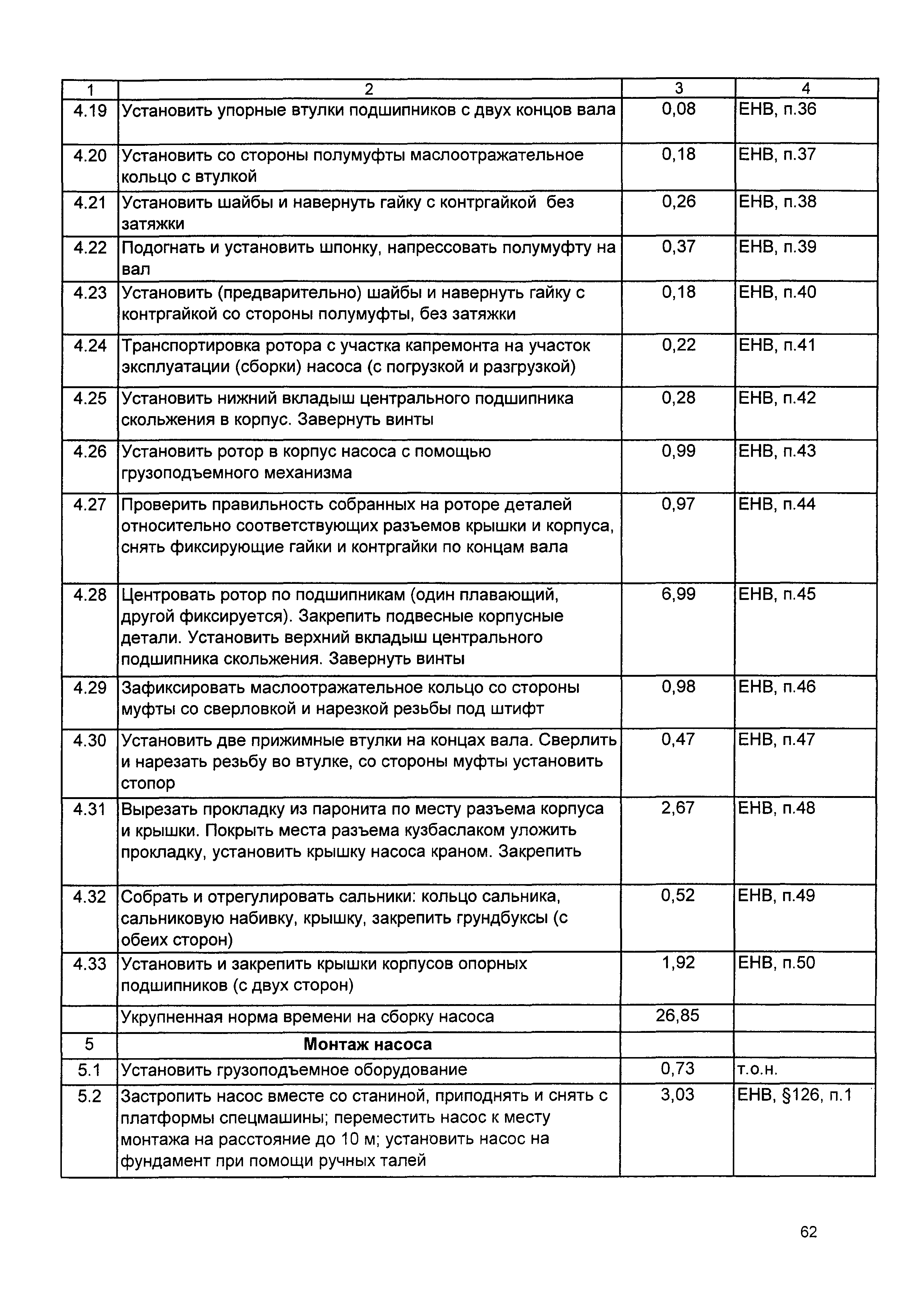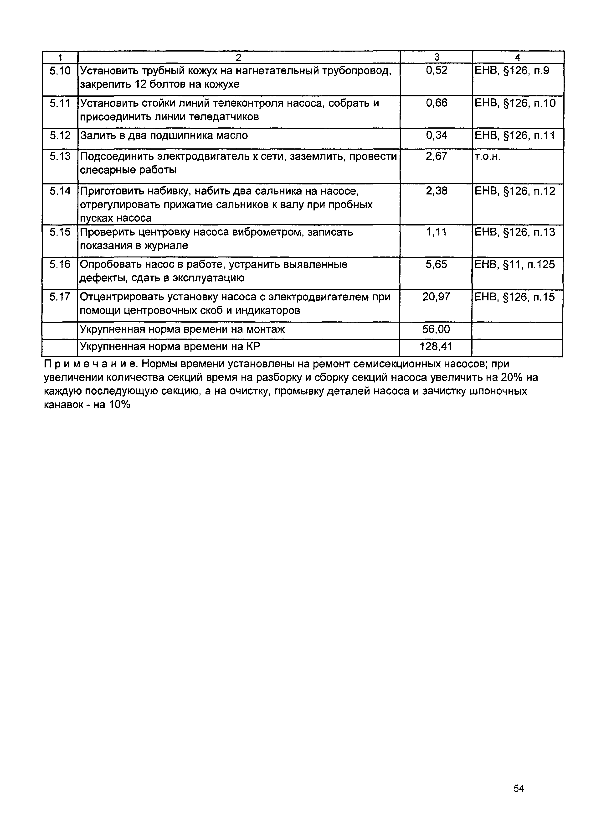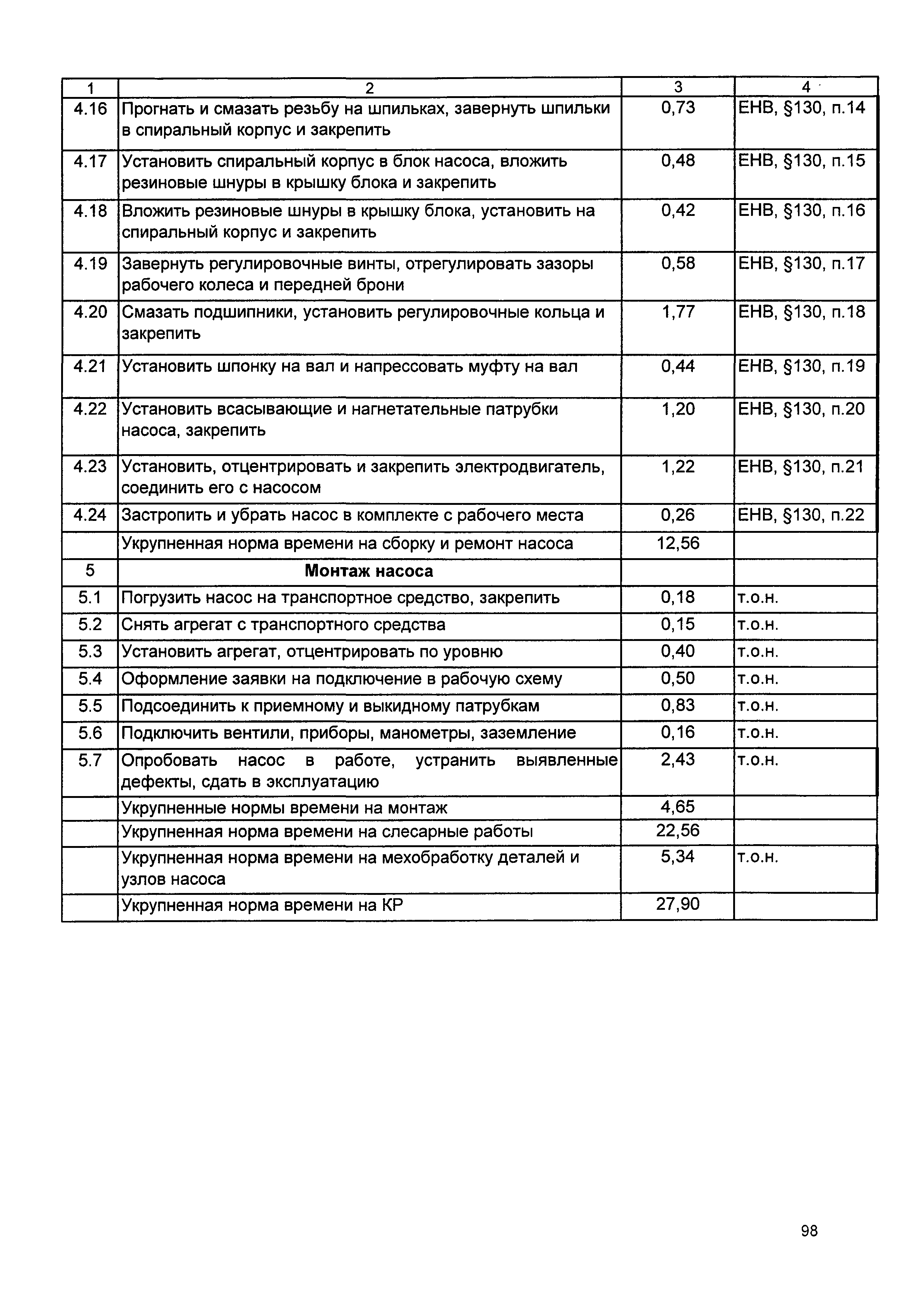 Сборник норм трудоемкости технического обслуживания и ремонтов насосов и станков-качалок. Часть 2| Статус: | действует | | Название рус.: | Сборник норм трудоемкости технического обслуживания и ремонтов насосов и станков-качалок. Часть 2 | | Дата добавления в базу: | 01.10.2014 | | Дата актуализации: | 01.01.2021 | | Область применения: | Сборник является нормативным документом по проведению технического обслуживания и ремонтов (ТО и Р) НПО и служит для: планирования ремонтных работ, определения их объема, составления сметной документации и организации подготовительных работ к ремонту; определения потребности в технических средствах (машинах, механизмах и т.д.) и материальных ресурсах, подбора ремонтного персонала и осуществления контроля за правильным расходованием средств на ремонтные работы. Сборник предназначен для работников структурных подразделений и производственных объектов, занятых планированием, организацией и проведением технического обслуживания и ремонтов (НПО). | | Оглавление: | Общие положения Насос ЦНС 38-44…220 Насос ЦНС 60-66…330 Насос ЦНС 105-98…490 Насосы ЦНС 180-1050. ЦНС 180-1422, ЦНС 180-1900 Насос ЦНС 300-120…600 Насос ЦН 900-310 Насос 12НА-9Х4 Насос 24А-18Х1-1 Насос АХП 45/31-А-СД-П Насос К20/30 Насос Ш5-25 Насос 6Ш8-2 Насос НБ-32 Насос НК 200/210А Станки-качалки СКД8-3-4000, СК8-3,5-4000, 7СК8-3,5-4000 Редукторы Ц2НШ-750А, Ц2НШ-750Б, R-35 ("Вулкан") | | Разработан: | ООО СПКТБ НЕФТЕГАЗМАШ