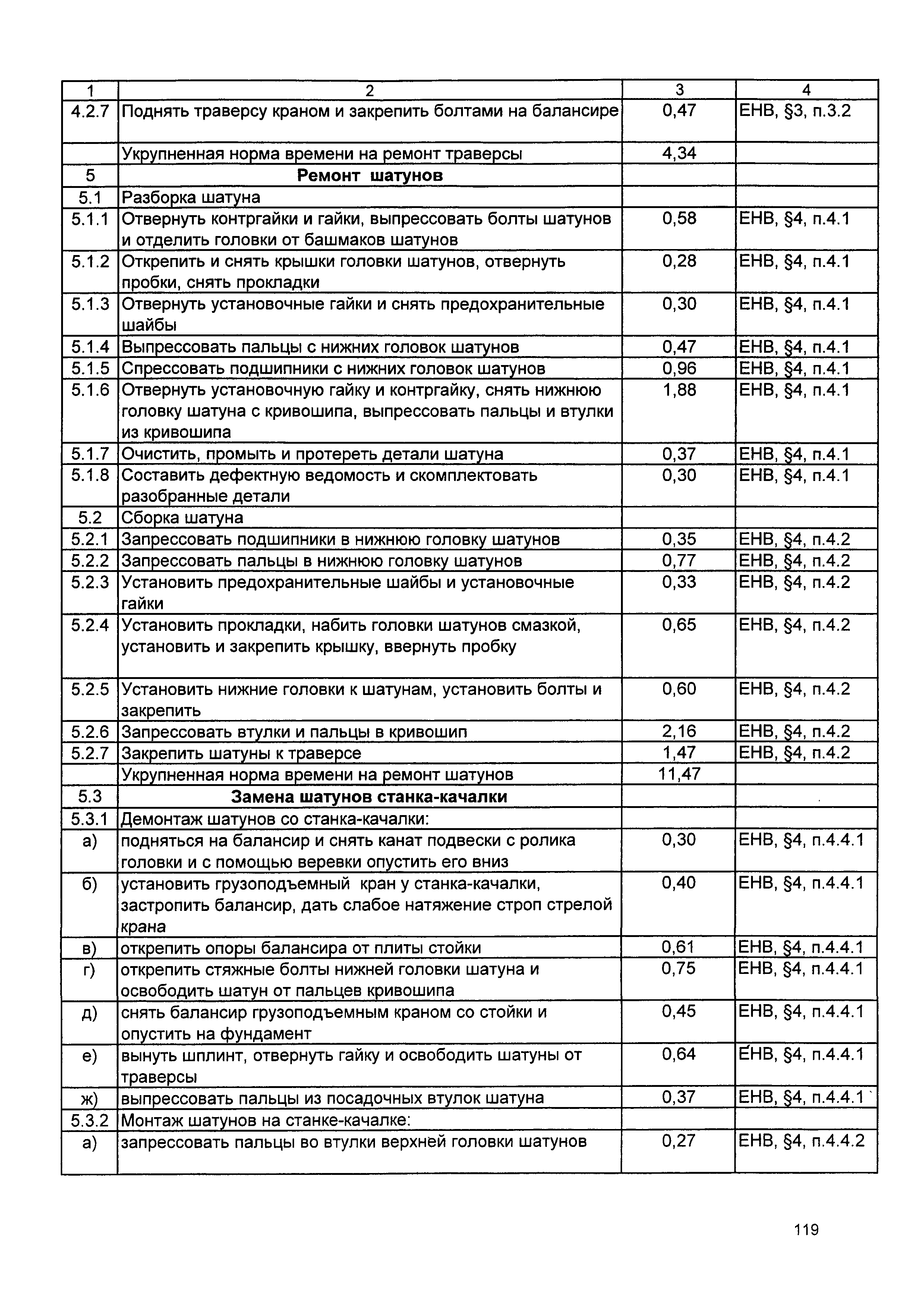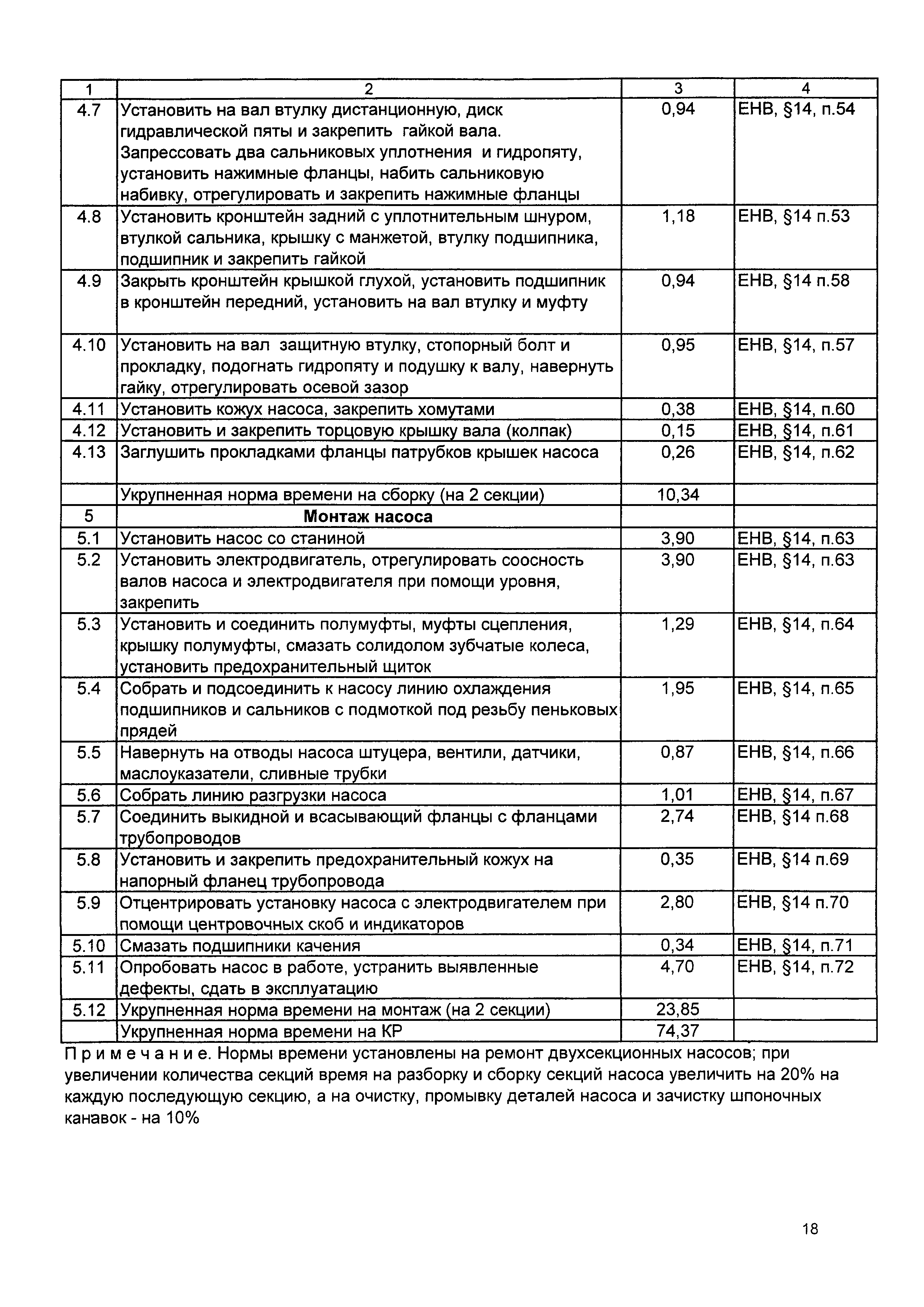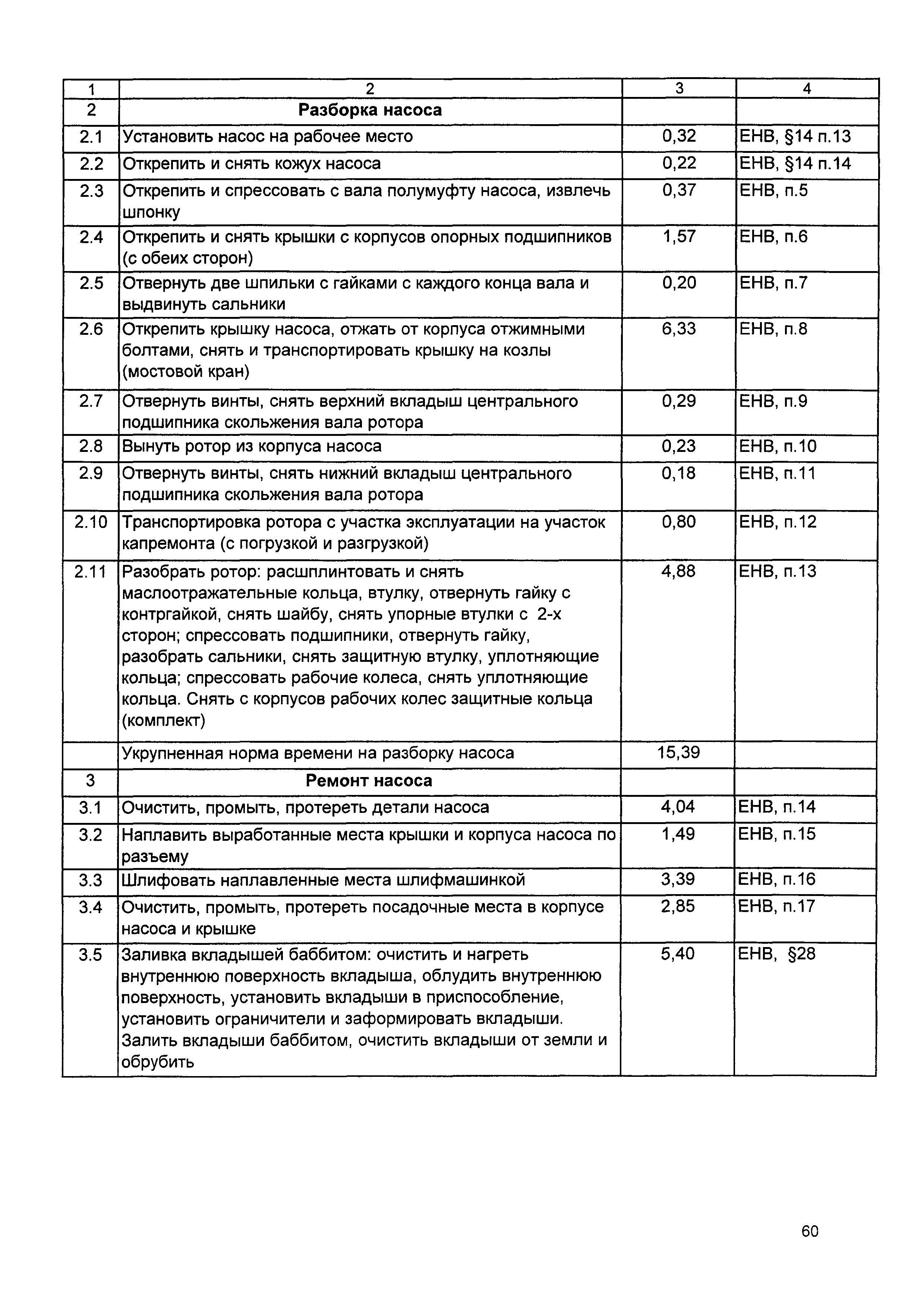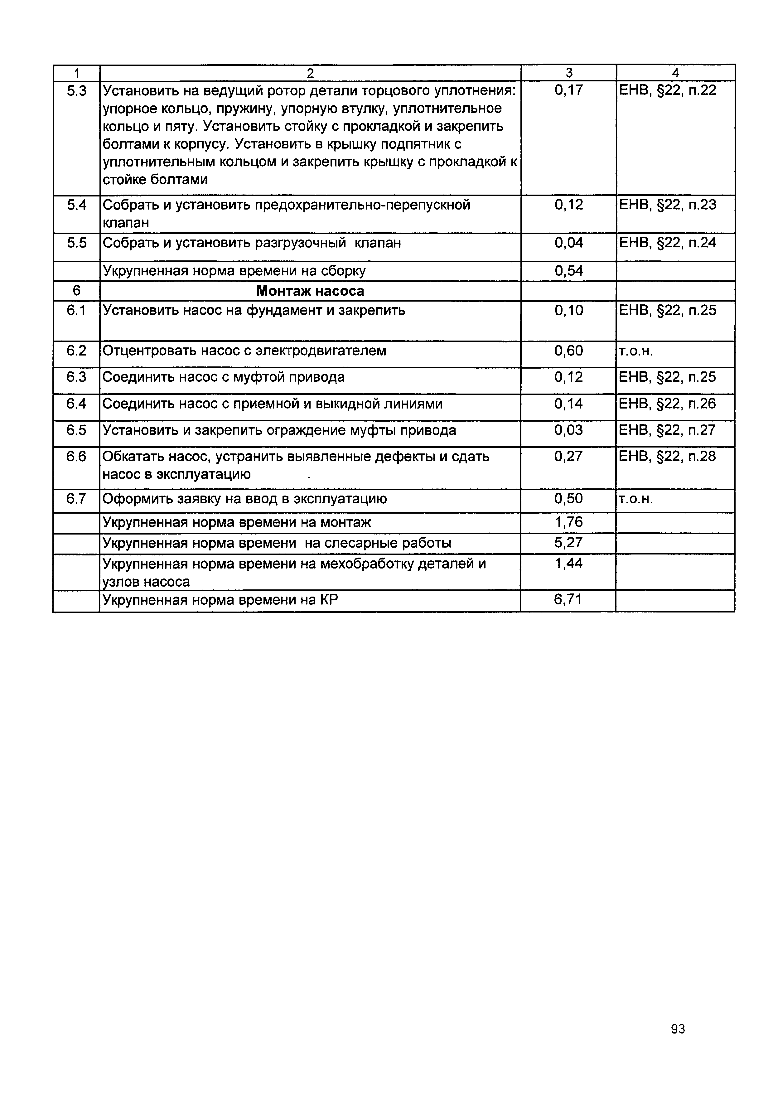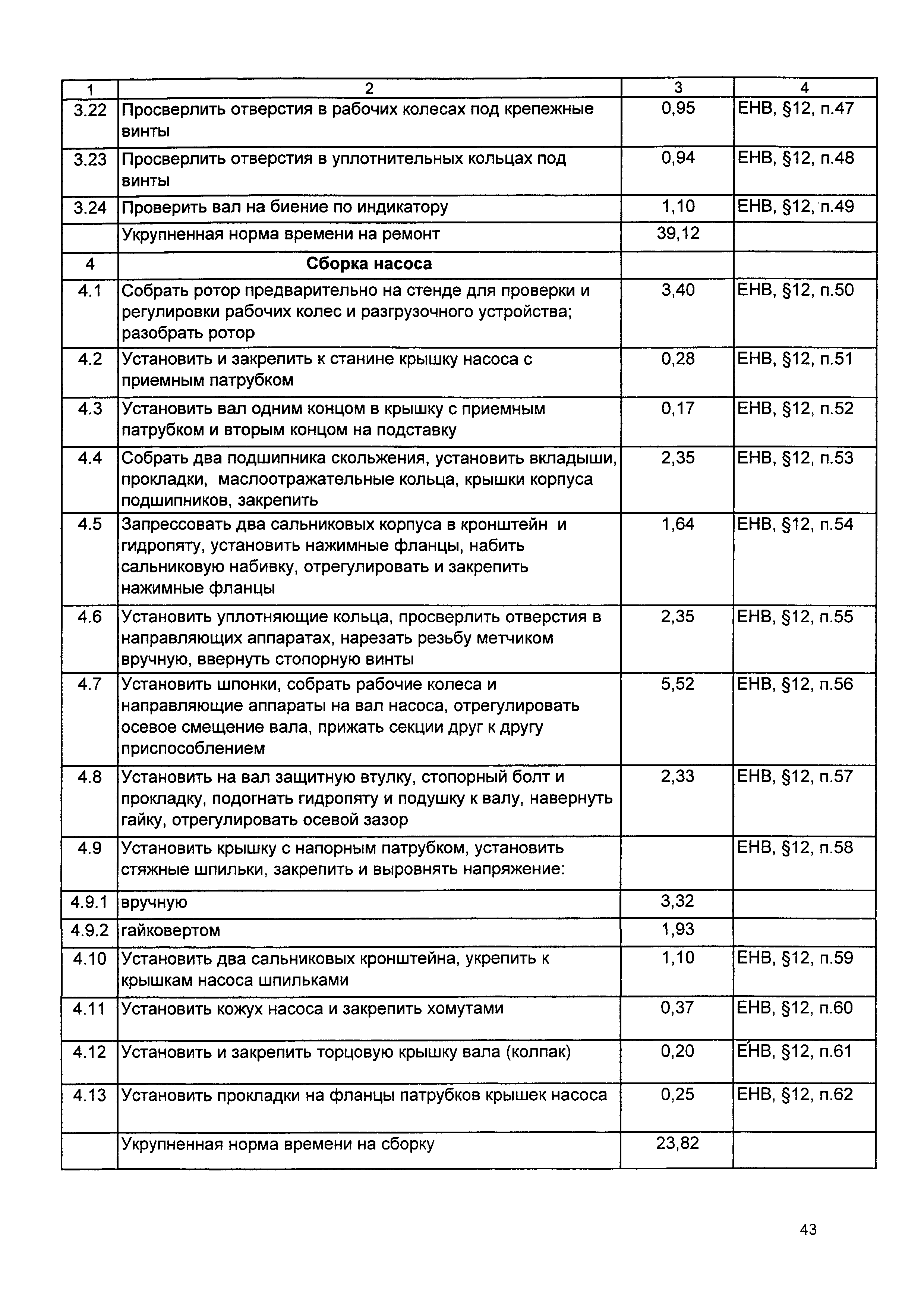 Сборник норм трудоемкости технического обслуживания и ремонтов насосов и станков-качалок. Часть 2| Статус: | действует | | Название рус.: | Сборник норм трудоемкости технического обслуживания и ремонтов насосов и станков-качалок. Часть 2 | | Дата добавления в базу: | 01.10.2014 | | Дата актуализации: | 01.01.2021 | | Область применения: | Сборник является нормативным документом по проведению технического обслуживания и ремонтов (ТО и Р) НПО и служит для: планирования ремонтных работ, определения их объема, составления сметной документации и организации подготовительных работ к ремонту; определения потребности в технических средствах (машинах, механизмах и т.д.) и материальных ресурсах, подбора ремонтного персонала и осуществления контроля за правильным расходованием средств на ремонтные работы. Сборник предназначен для работников структурных подразделений и производственных объектов, занятых планированием, организацией и проведением технического обслуживания и ремонтов (НПО). | | Оглавление: | Общие положения Насос ЦНС 38-44…220 Насос ЦНС 60-66…330 Насос ЦНС 105-98…490 Насосы ЦНС 180-1050. ЦНС 180-1422, ЦНС 180-1900 Насос ЦНС 300-120…600 Насос ЦН 900-310 Насос 12НА-9Х4 Насос 24А-18Х1-1 Насос АХП 45/31-А-СД-П Насос К20/30 Насос Ш5-25 Насос 6Ш8-2 Насос НБ-32 Насос НК 200/210А Станки-качалки СКД8-3-4000, СК8-3,5-4000, 7СК8-3,5-4000 Редукторы Ц2НШ-750А, Ц2НШ-750Б, R-35 ("Вулкан") | | Разработан: | ООО СПКТБ НЕФТЕГАЗМАШ