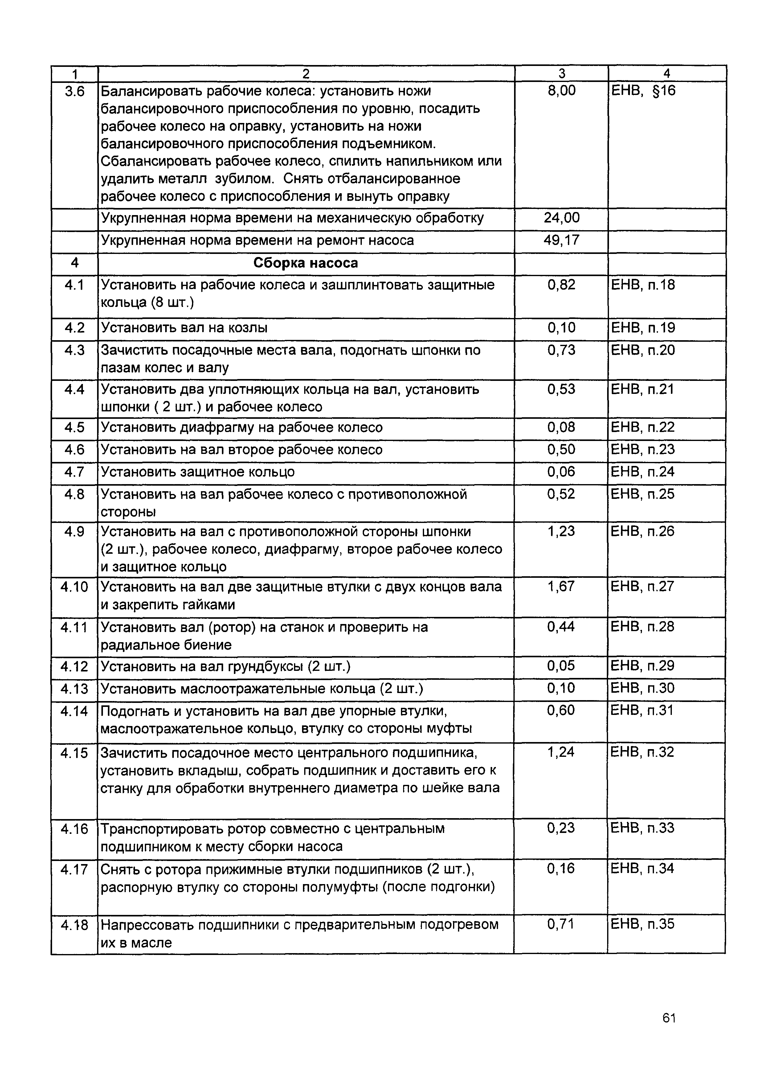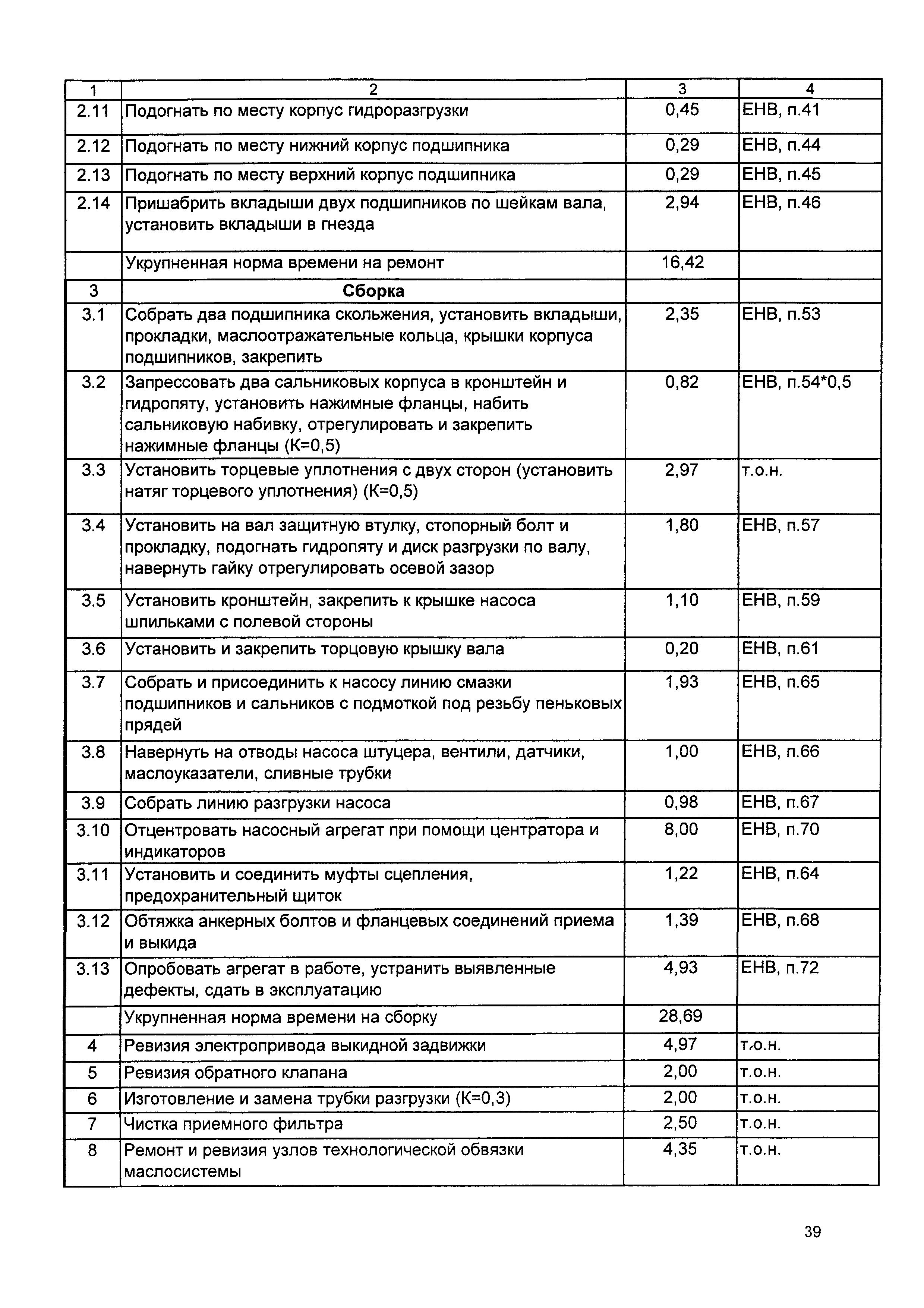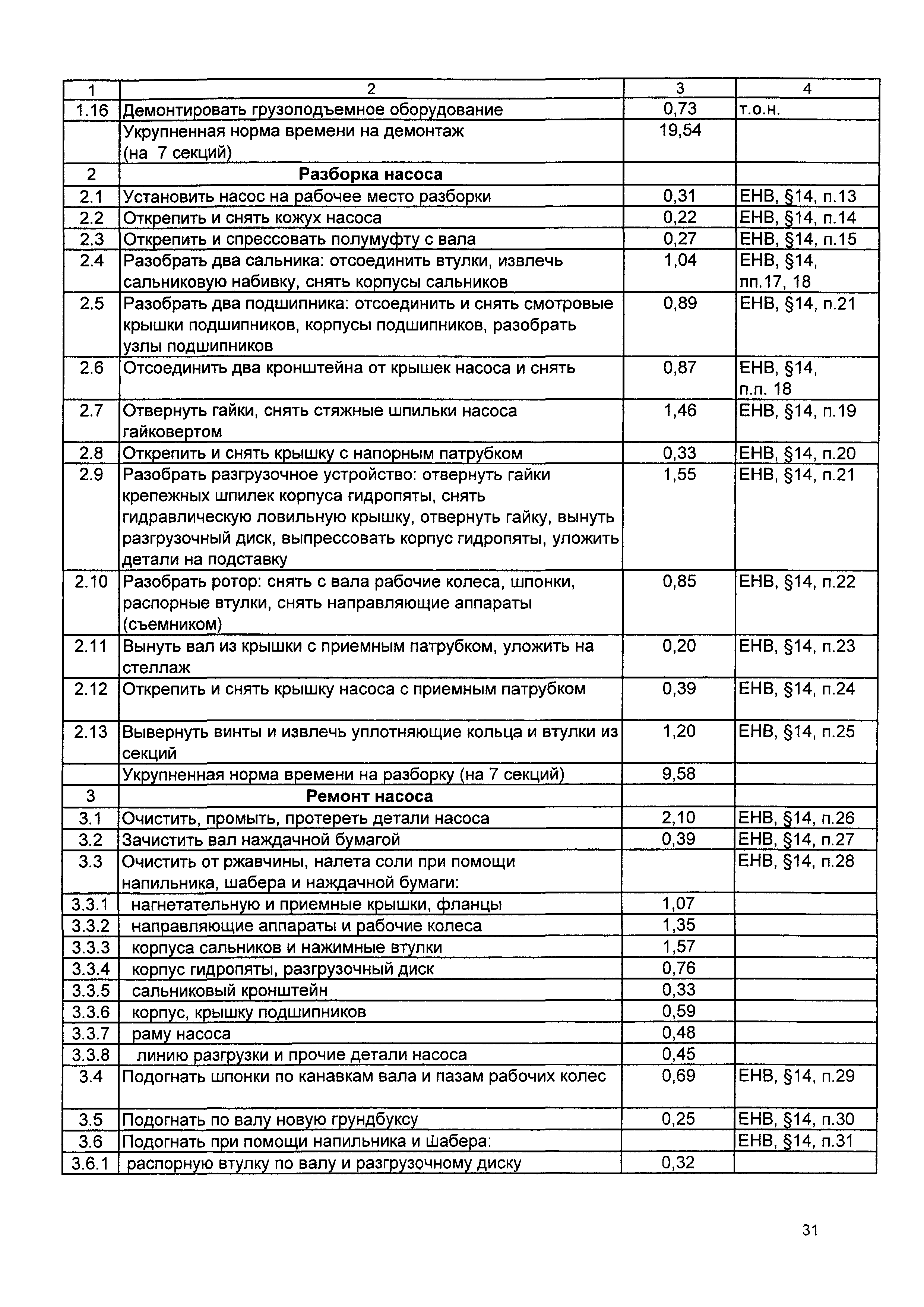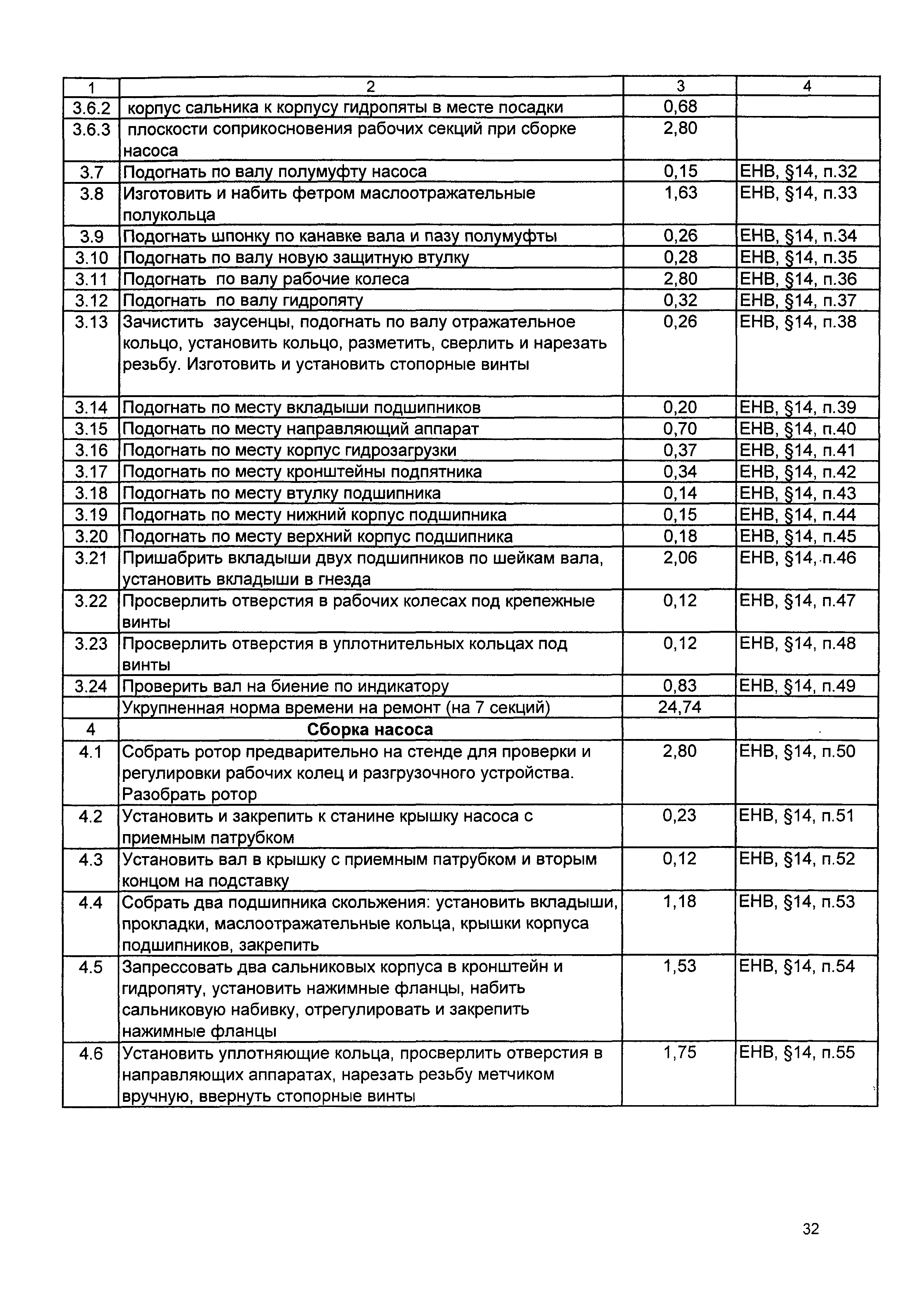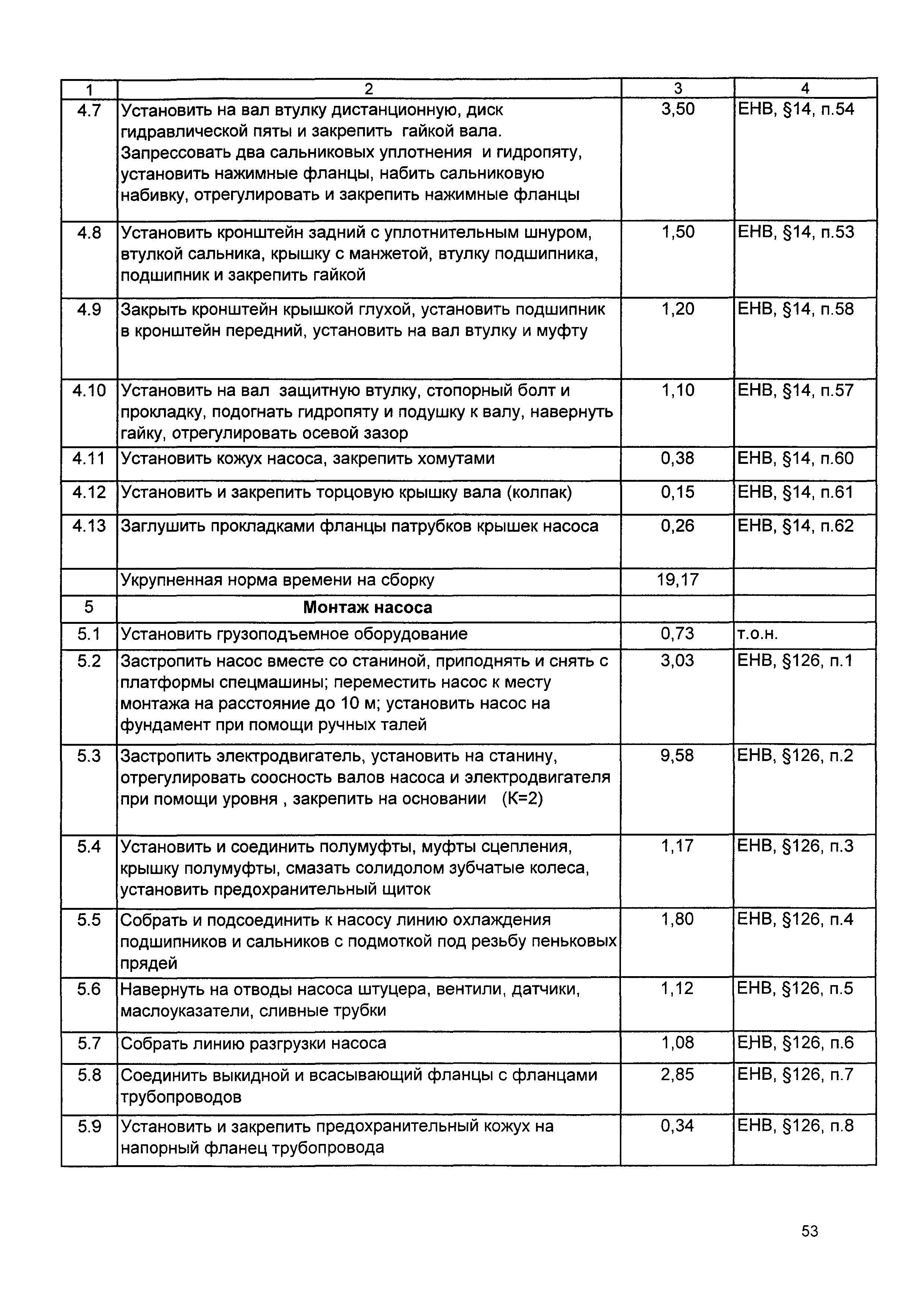 Сборник норм трудоемкости технического обслуживания и ремонтов насосов и станков-качалок. Часть 2| Статус: | действует | | Название рус.: | Сборник норм трудоемкости технического обслуживания и ремонтов насосов и станков-качалок. Часть 2 | | Дата добавления в базу: | 01.10.2014 | | Дата актуализации: | 01.01.2021 | | Область применения: | Сборник является нормативным документом по проведению технического обслуживания и ремонтов (ТО и Р) НПО и служит для: планирования ремонтных работ, определения их объема, составления сметной документации и организации подготовительных работ к ремонту; определения потребности в технических средствах (машинах, механизмах и т.д.) и материальных ресурсах, подбора ремонтного персонала и осуществления контроля за правильным расходованием средств на ремонтные работы. Сборник предназначен для работников структурных подразделений и производственных объектов, занятых планированием, организацией и проведением технического обслуживания и ремонтов (НПО). | | Оглавление: | Общие положения Насос ЦНС 38-44…220 Насос ЦНС 60-66…330 Насос ЦНС 105-98…490 Насосы ЦНС 180-1050. ЦНС 180-1422, ЦНС 180-1900 Насос ЦНС 300-120…600 Насос ЦН 900-310 Насос 12НА-9Х4 Насос 24А-18Х1-1 Насос АХП 45/31-А-СД-П Насос К20/30 Насос Ш5-25 Насос 6Ш8-2 Насос НБ-32 Насос НК 200/210А Станки-качалки СКД8-3-4000, СК8-3,5-4000, 7СК8-3,5-4000 Редукторы Ц2НШ-750А, Ц2НШ-750Б, R-35 ("Вулкан") | | Разработан: | ООО СПКТБ НЕФТЕГАЗМАШ