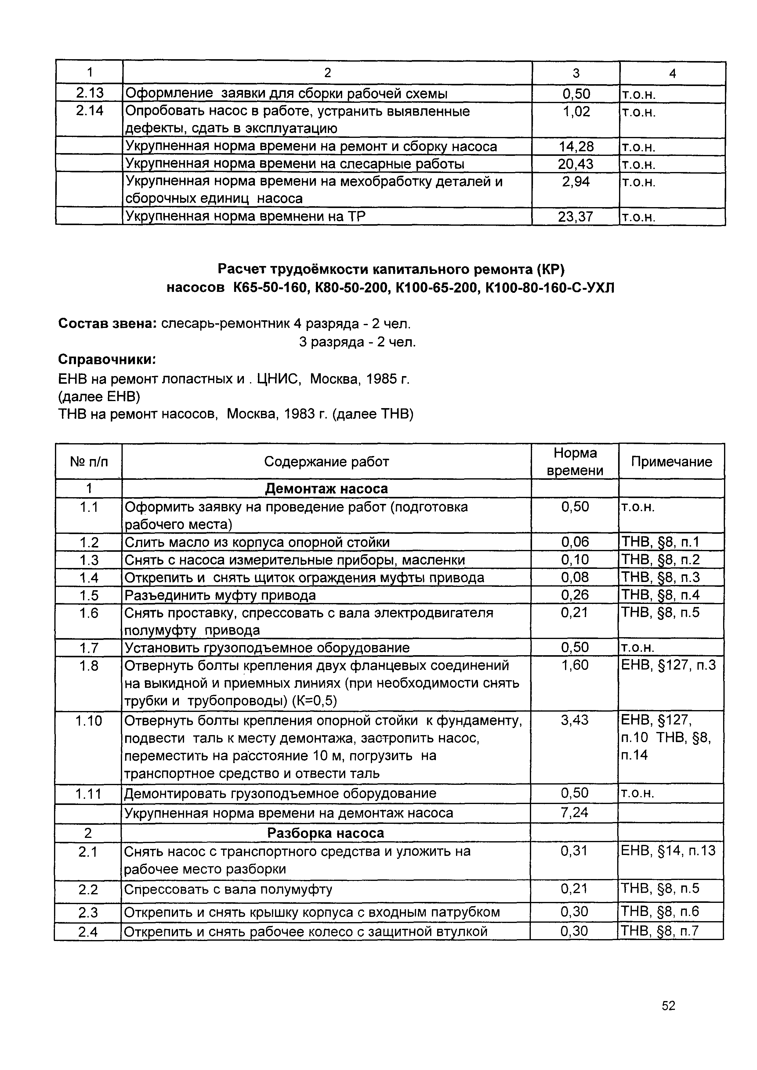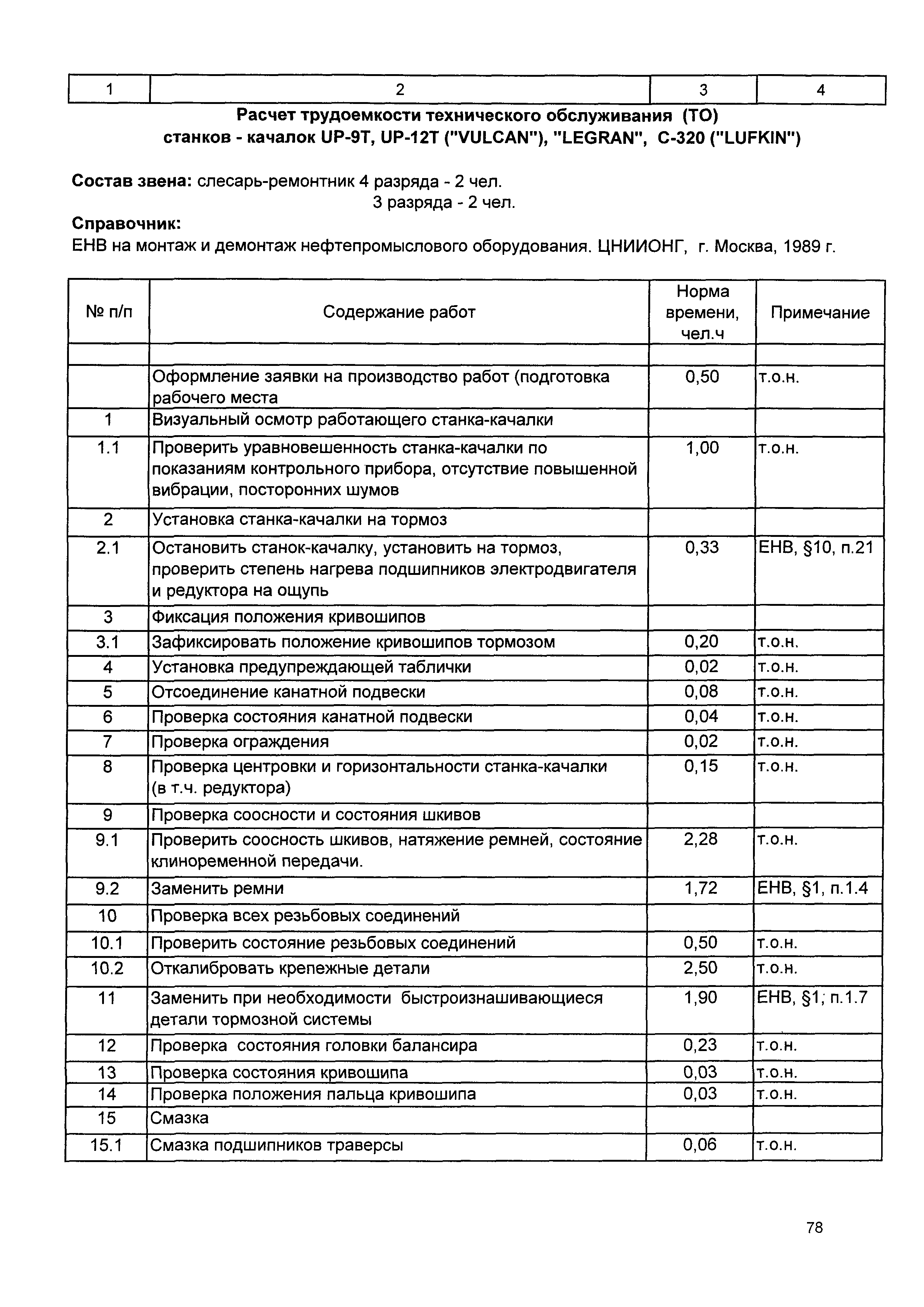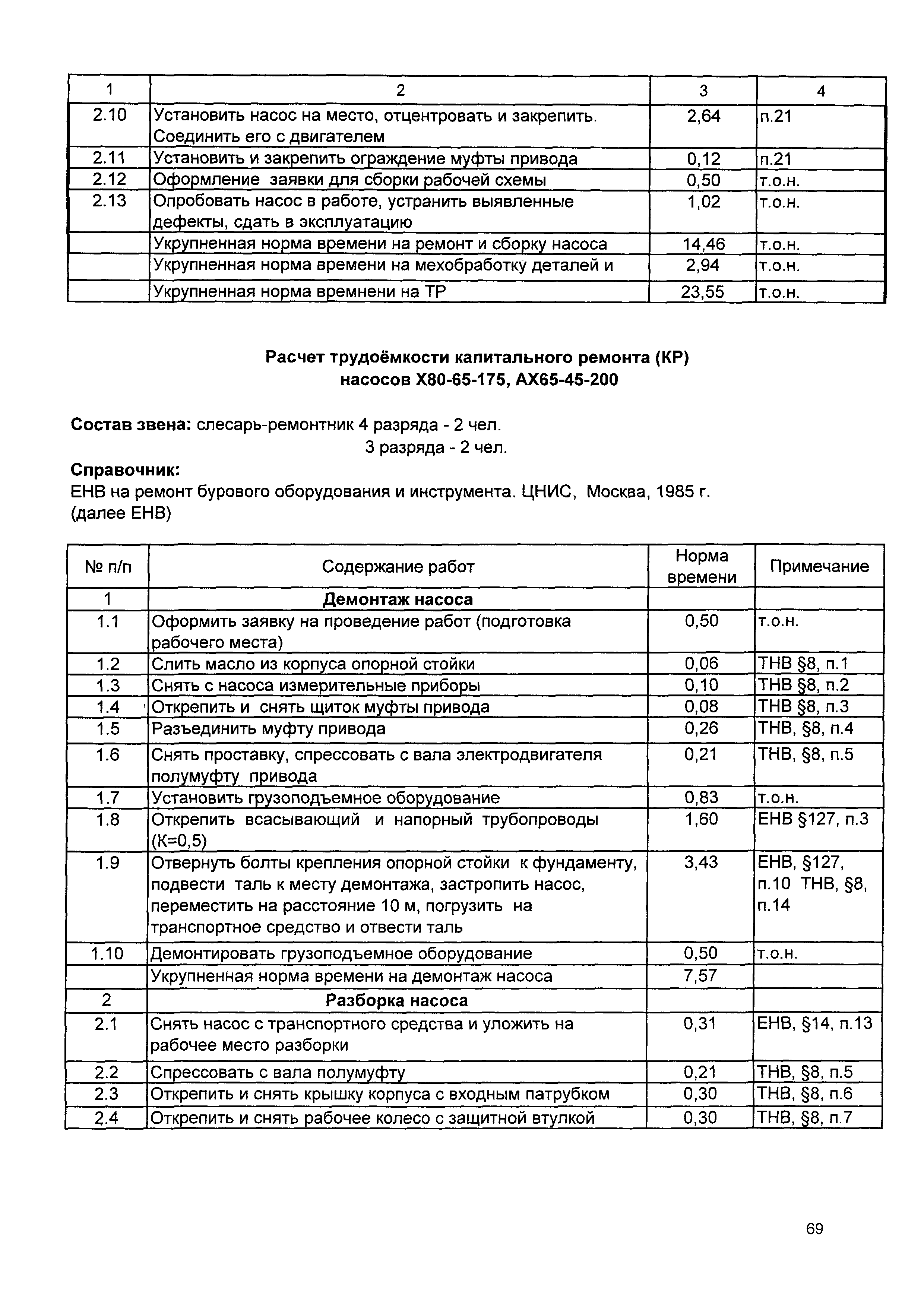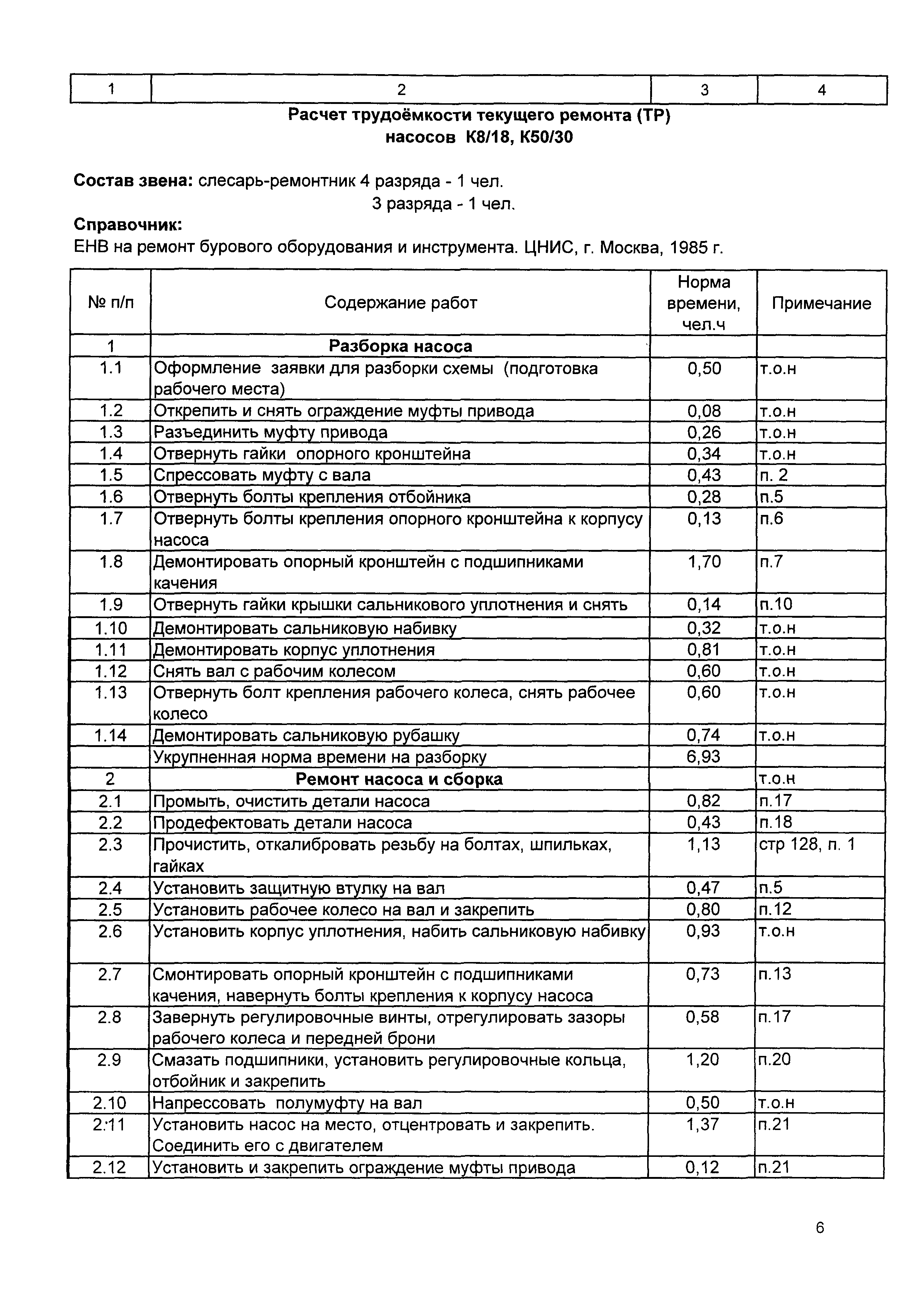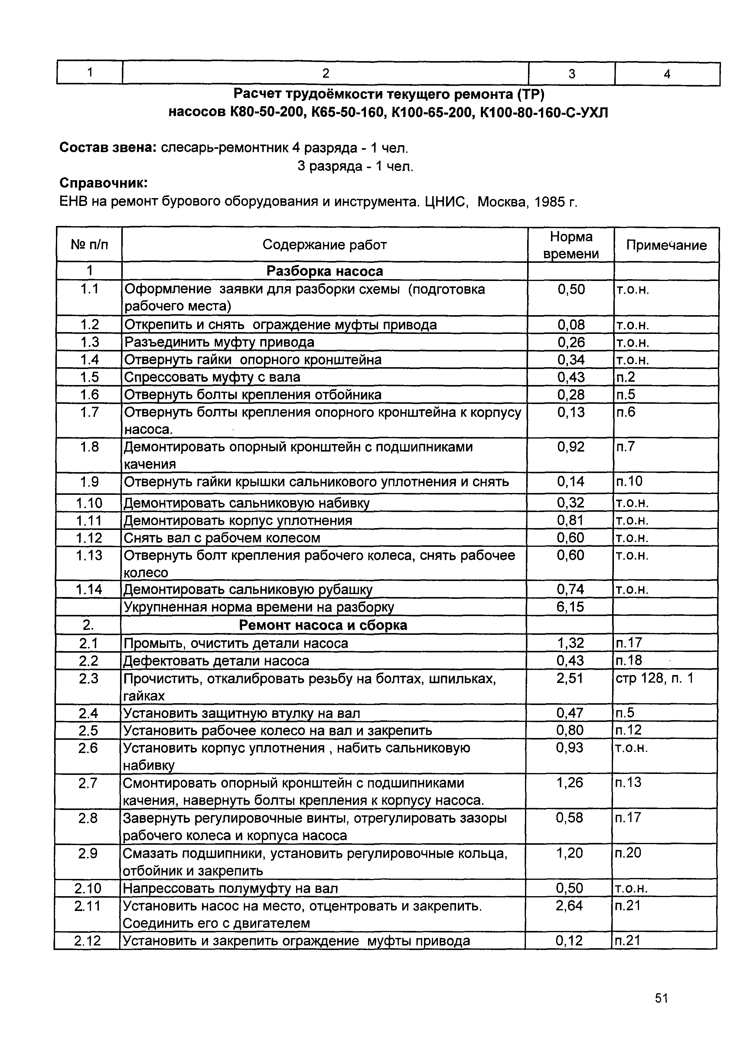 Нормы времени разработаны с учетом ранее действующих единых норм времени (ЕНВ), единого тарифно-квалификационного справочника по нефтяной промышленности и разработанных технологических карт технического обслуживания и ремонтов НПО. | | Оглавление: | Общие положения Насосы К8/18, К50/30 Насосы 1Д315-71, 1Д630-90…125, 1Д250-90…125 Насос НВ 50/50-СД Насосы Н8-25, НМШ5-25, НМШ8-25 Насос НС 160-45 Насос НПВ 1250/60 Насос ЦНС 240-1900 ЗТМ Насосы К80-50-200. К65-50-60, К100-65-200, К100-80-160-С-УХЛ Насос ЦНС 850 Насосы КМН 100-80-160, КМН 80-65-175 Насосы Х80-65-175, АХ65-45-200 Насос НК 210/200 Станки-качалки UP-9T, UP-12T ("VULCAN"), "LEGRAN", C-320 ("LUFKIN") | | Разработан: | ООО СПКТБ НЕФТЕГАЗМАШ