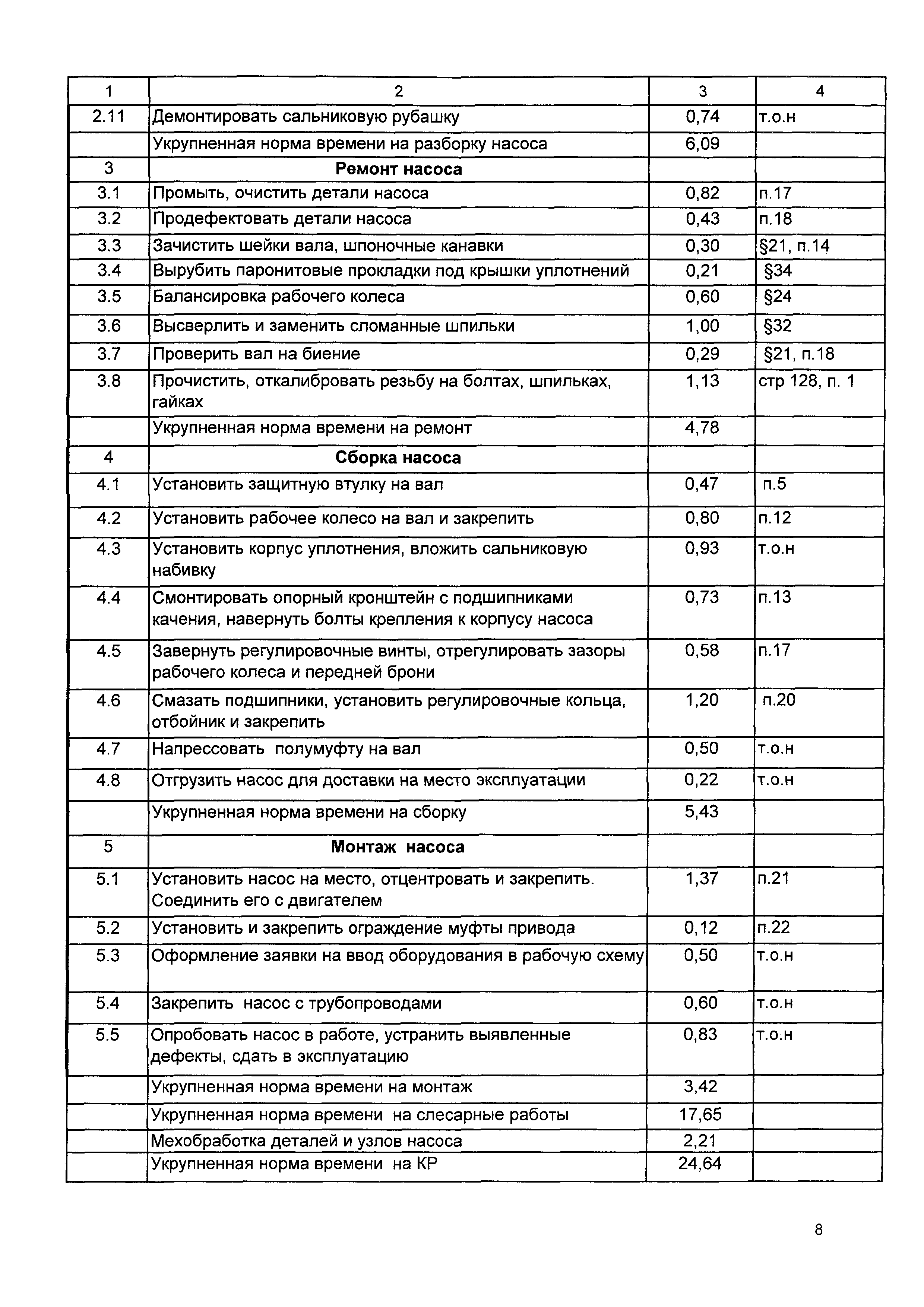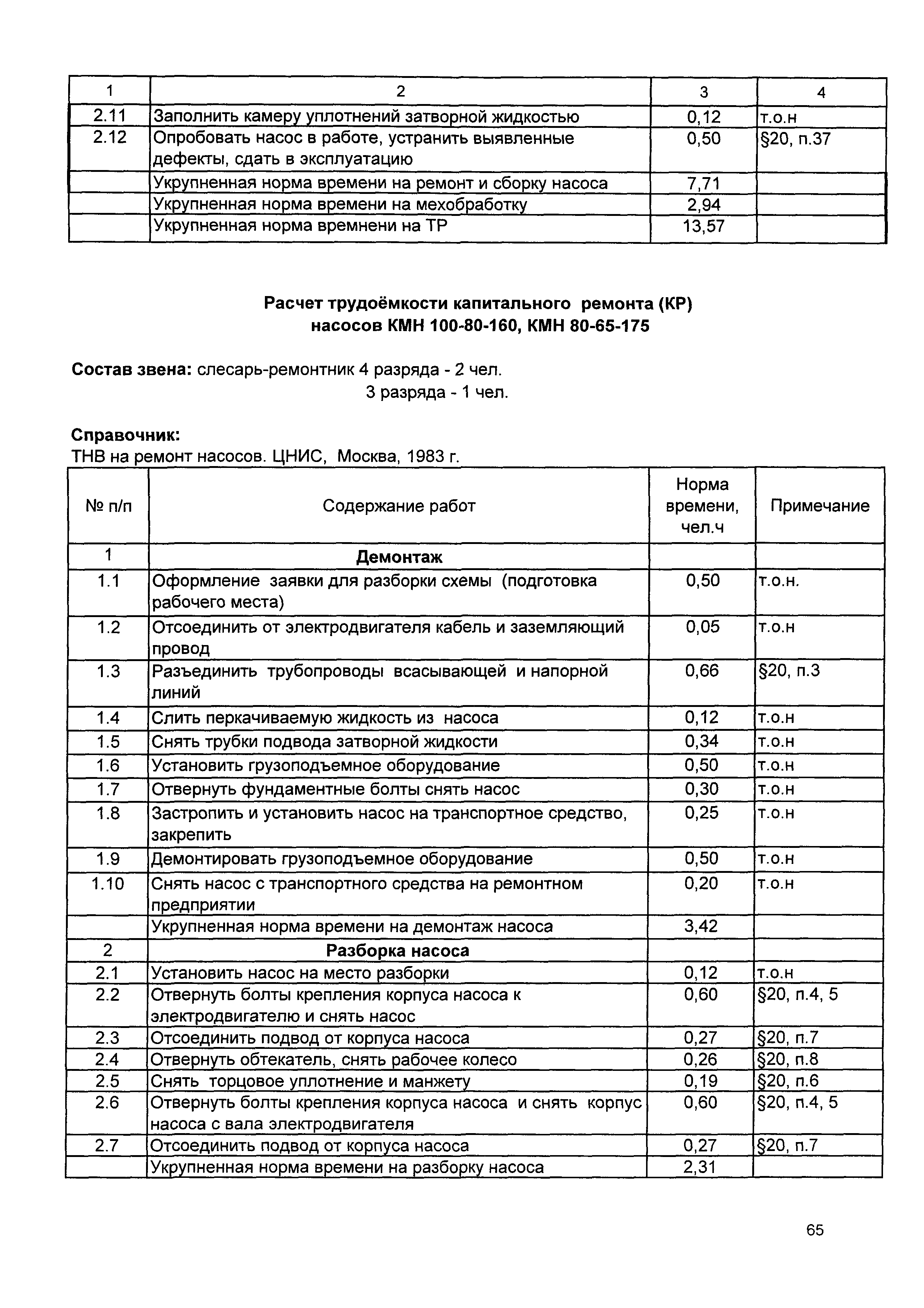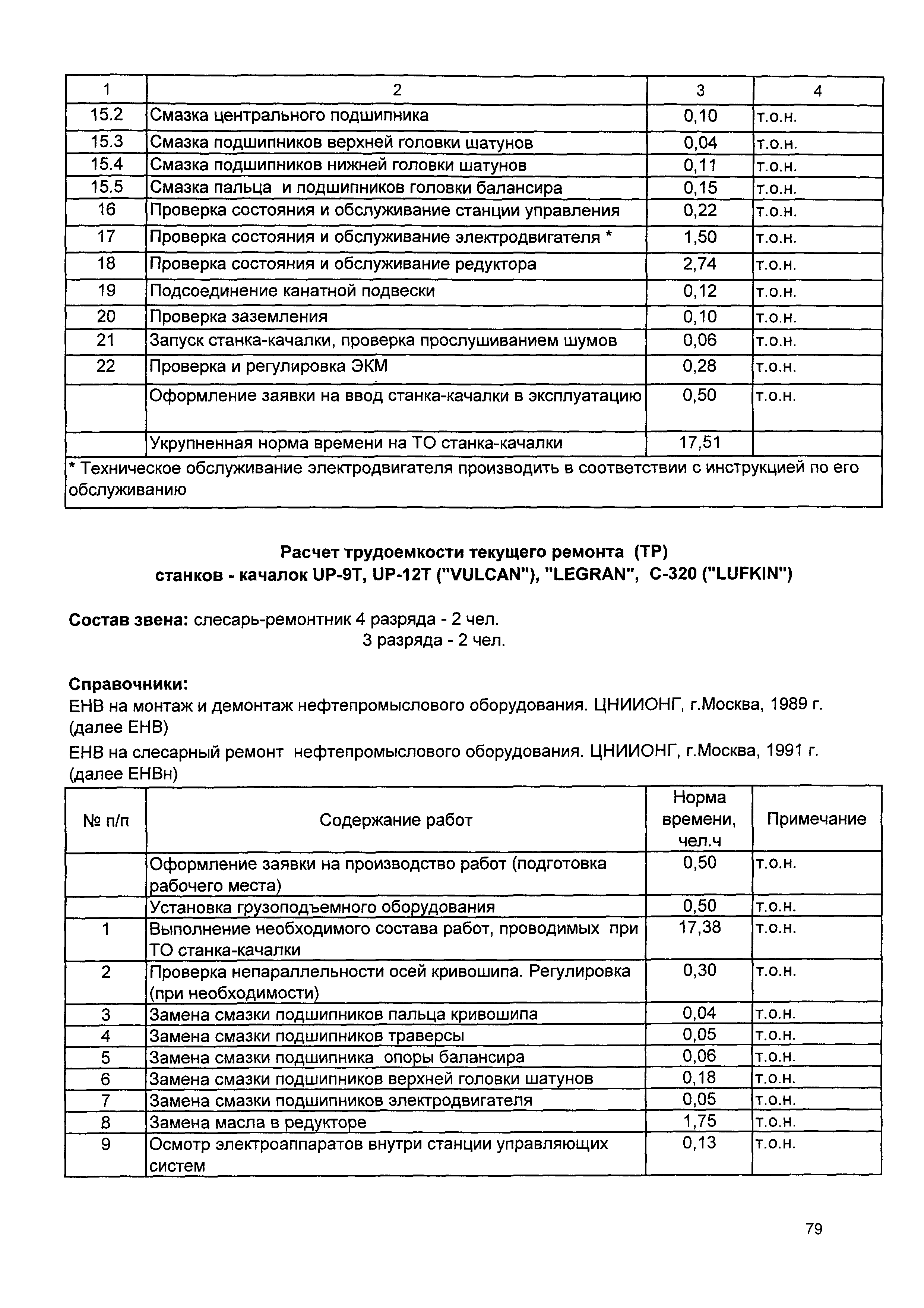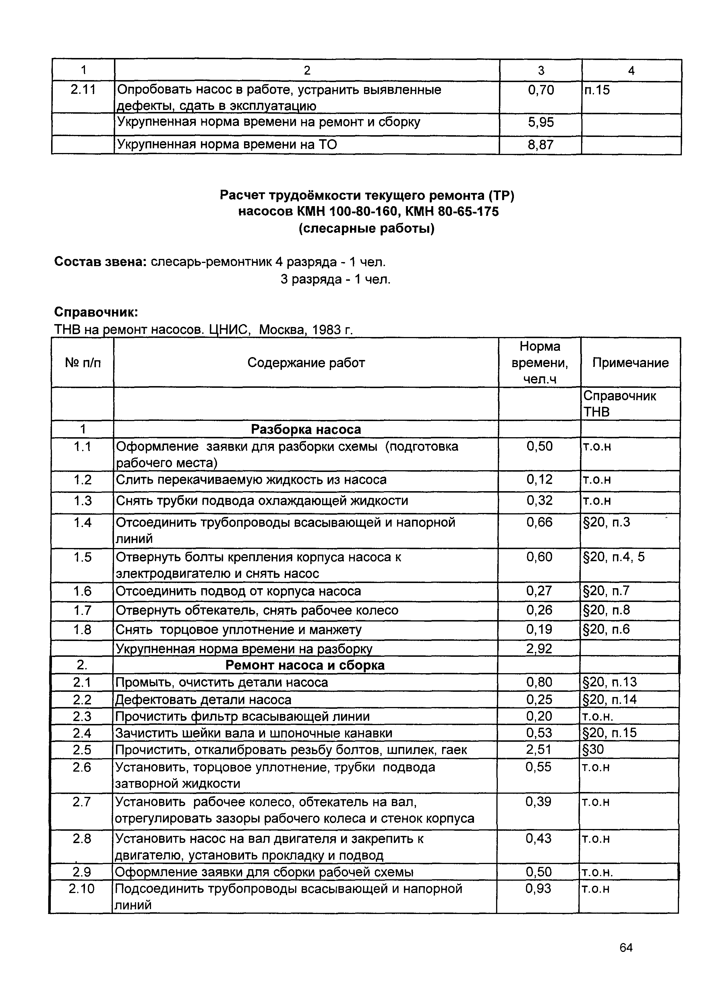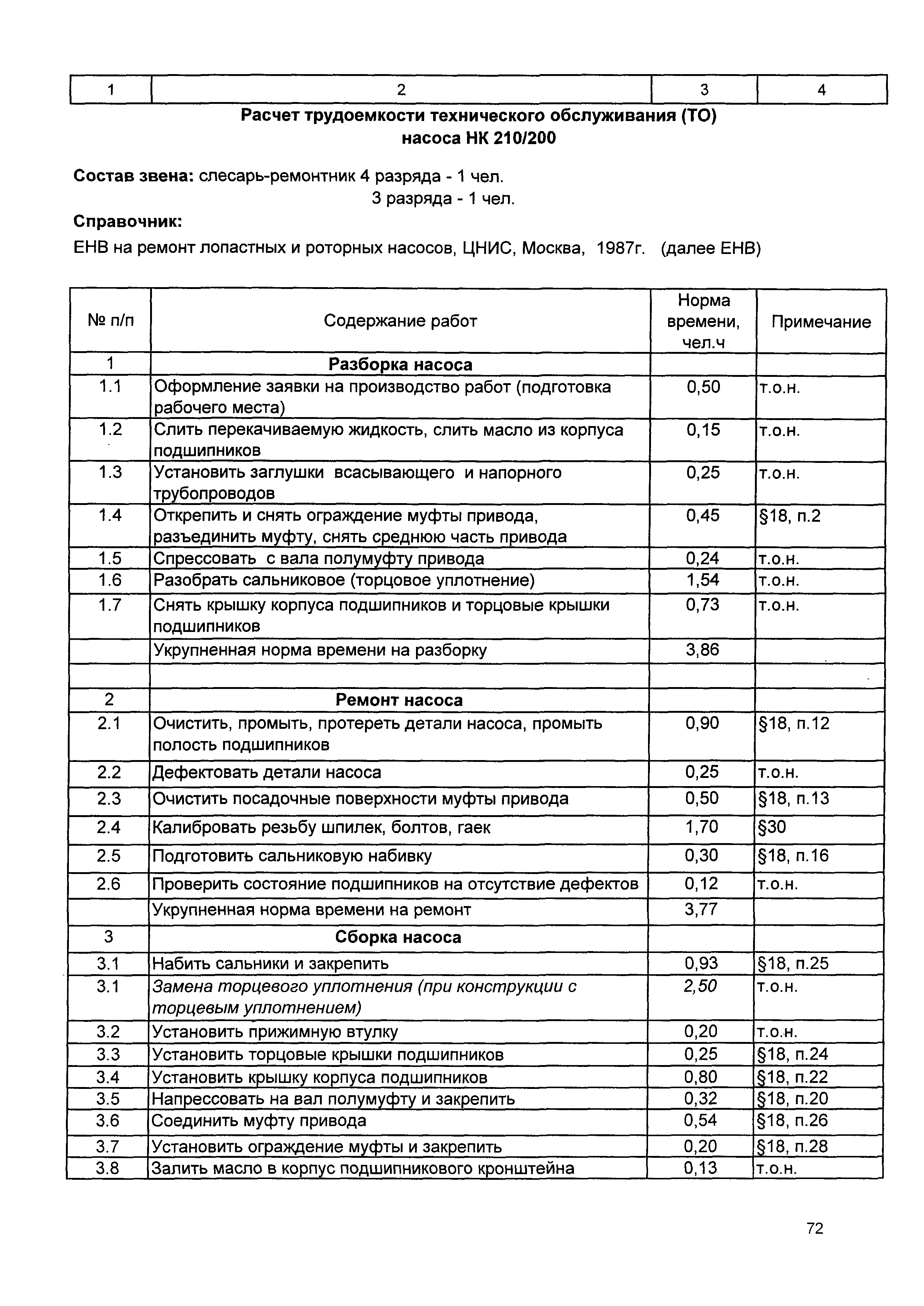 Нормы времени разработаны с учетом ранее действующих единых норм времени (ЕНВ), единого тарифно-квалификационного справочника по нефтяной промышленности и разработанных технологических карт технического обслуживания и ремонтов НПО. | | Оглавление: | Общие положения Насосы К8/18, К50/30 Насосы 1Д315-71, 1Д630-90…125, 1Д250-90…125 Насос НВ 50/50-СД Насосы Н8-25, НМШ5-25, НМШ8-25 Насос НС 160-45 Насос НПВ 1250/60 Насос ЦНС 240-1900 ЗТМ Насосы К80-50-200. К65-50-60, К100-65-200, К100-80-160-С-УХЛ Насос ЦНС 850 Насосы КМН 100-80-160, КМН 80-65-175 Насосы Х80-65-175, АХ65-45-200 Насос НК 210/200 Станки-качалки UP-9T, UP-12T ("VULCAN"), "LEGRAN", C-320 ("LUFKIN") | | Разработан: | ООО СПКТБ НЕФТЕГАЗМАШ