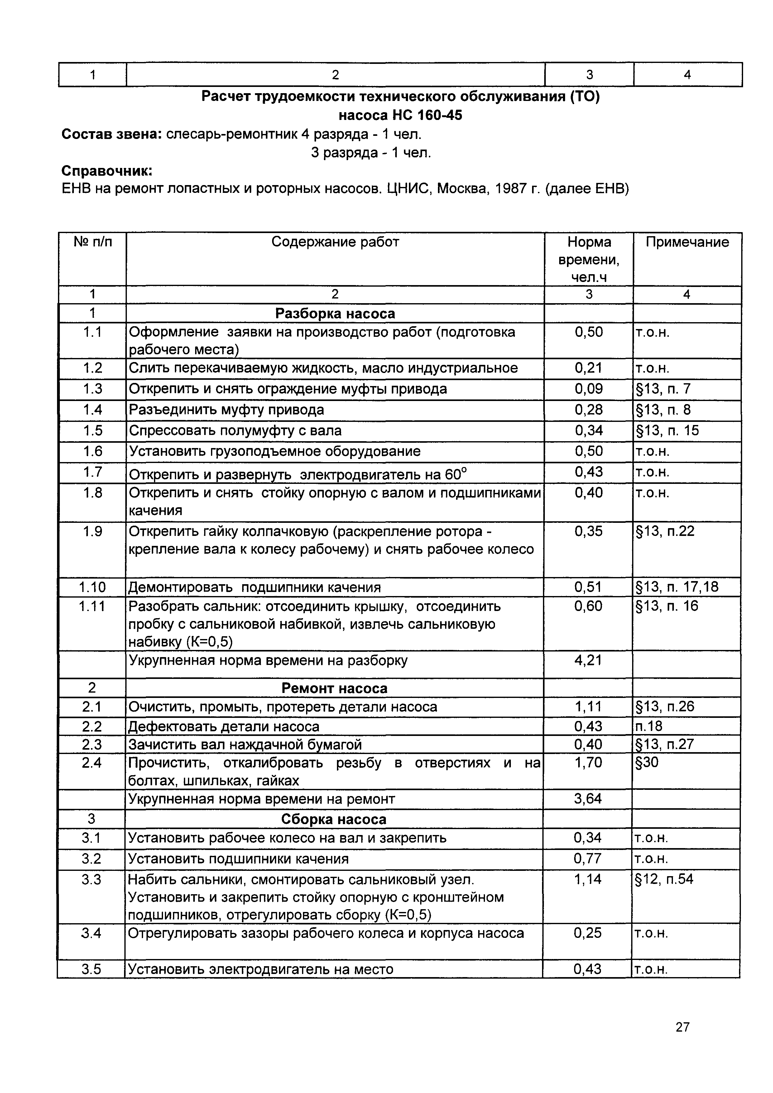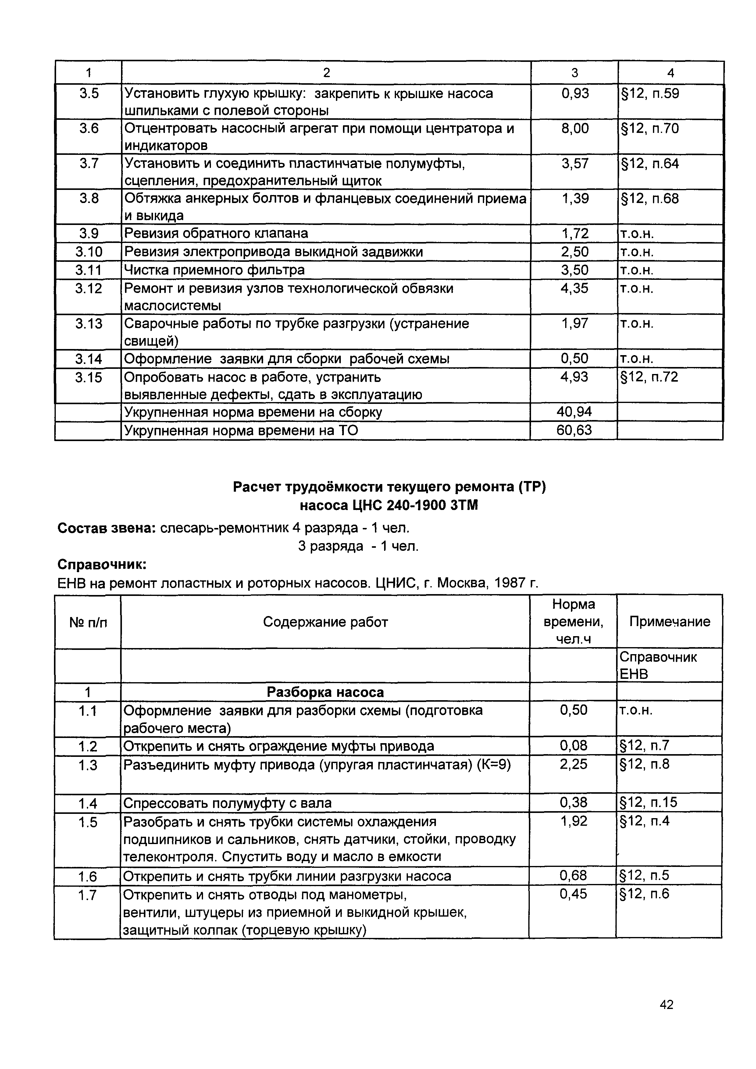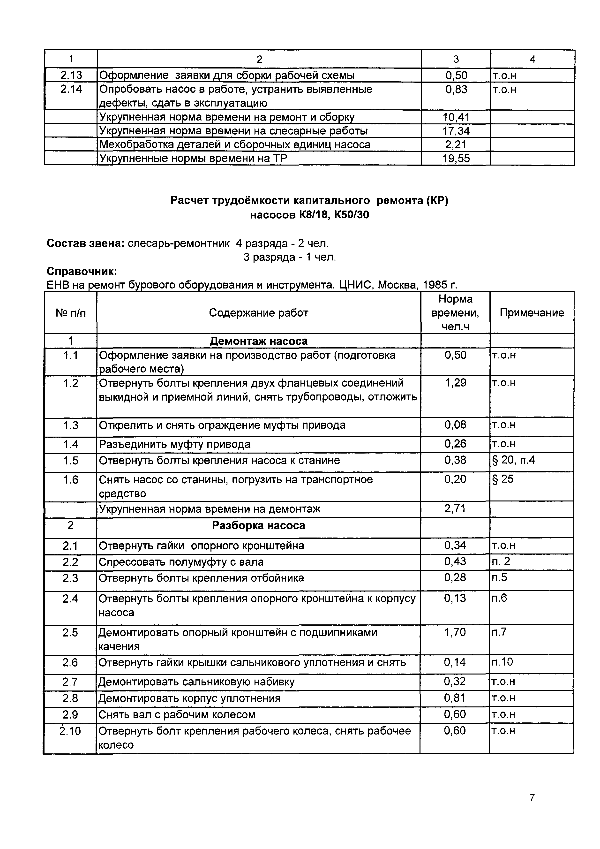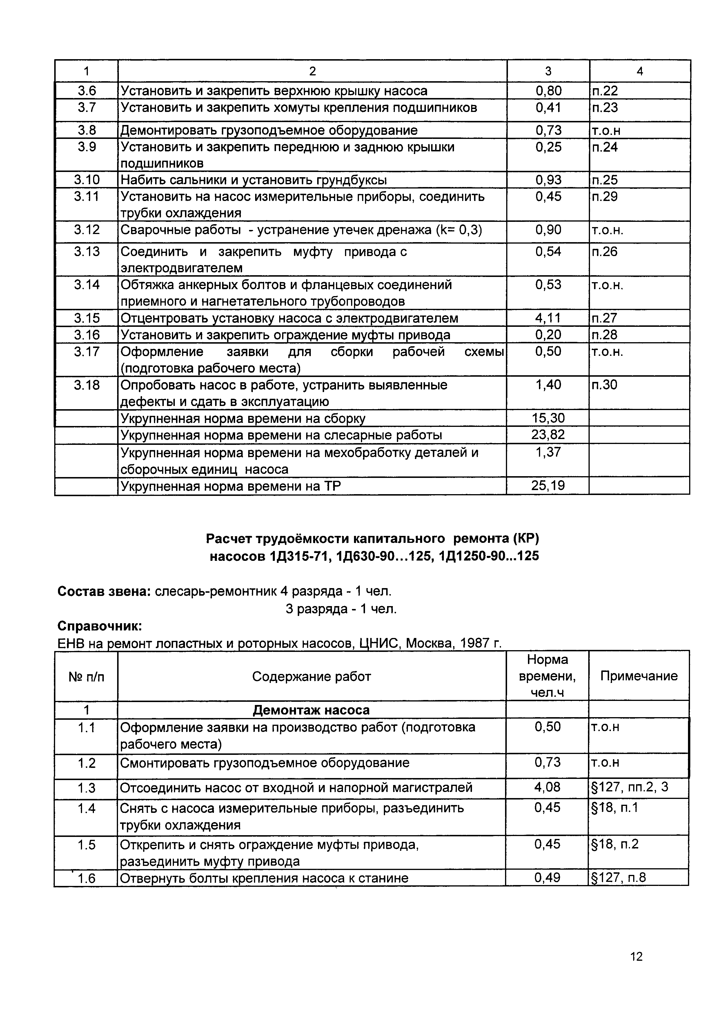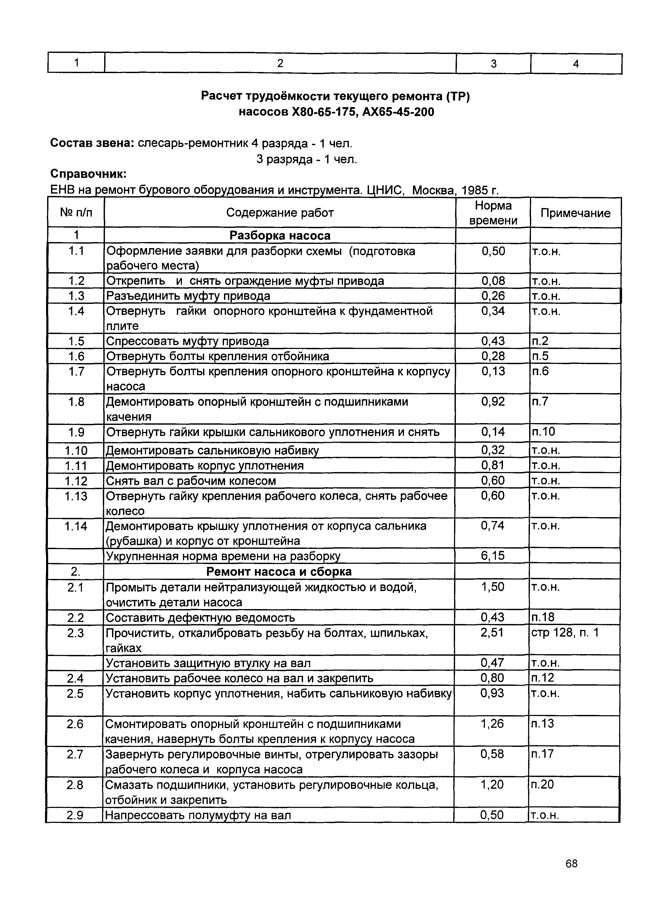 Нормы времени разработаны с учетом ранее действующих единых норм времени (ЕНВ), единого тарифно-квалификационного справочника по нефтяной промышленности и разработанных технологических карт технического обслуживания и ремонтов НПО. | | Оглавление: | Общие положения Насосы К8/18, К50/30 Насосы 1Д315-71, 1Д630-90…125, 1Д250-90…125 Насос НВ 50/50-СД Насосы Н8-25, НМШ5-25, НМШ8-25 Насос НС 160-45 Насос НПВ 1250/60 Насос ЦНС 240-1900 ЗТМ Насосы К80-50-200. К65-50-60, К100-65-200, К100-80-160-С-УХЛ Насос ЦНС 850 Насосы КМН 100-80-160, КМН 80-65-175 Насосы Х80-65-175, АХ65-45-200 Насос НК 210/200 Станки-качалки UP-9T, UP-12T ("VULCAN"), "LEGRAN", C-320 ("LUFKIN") | | Разработан: | ООО СПКТБ НЕФТЕГАЗМАШ