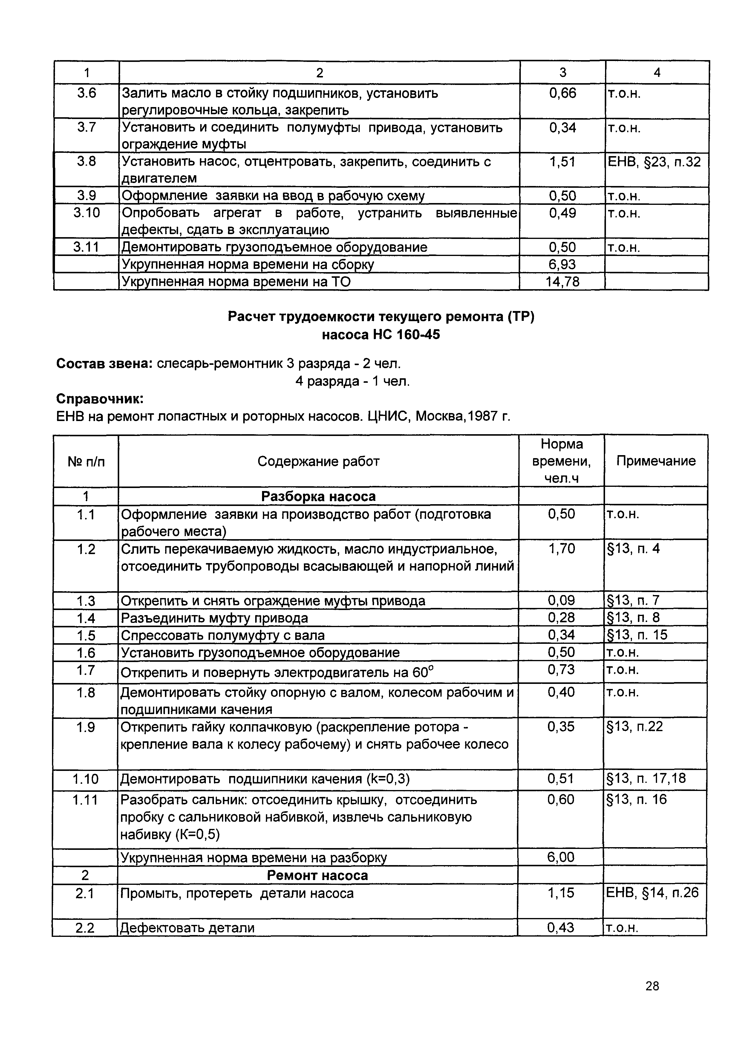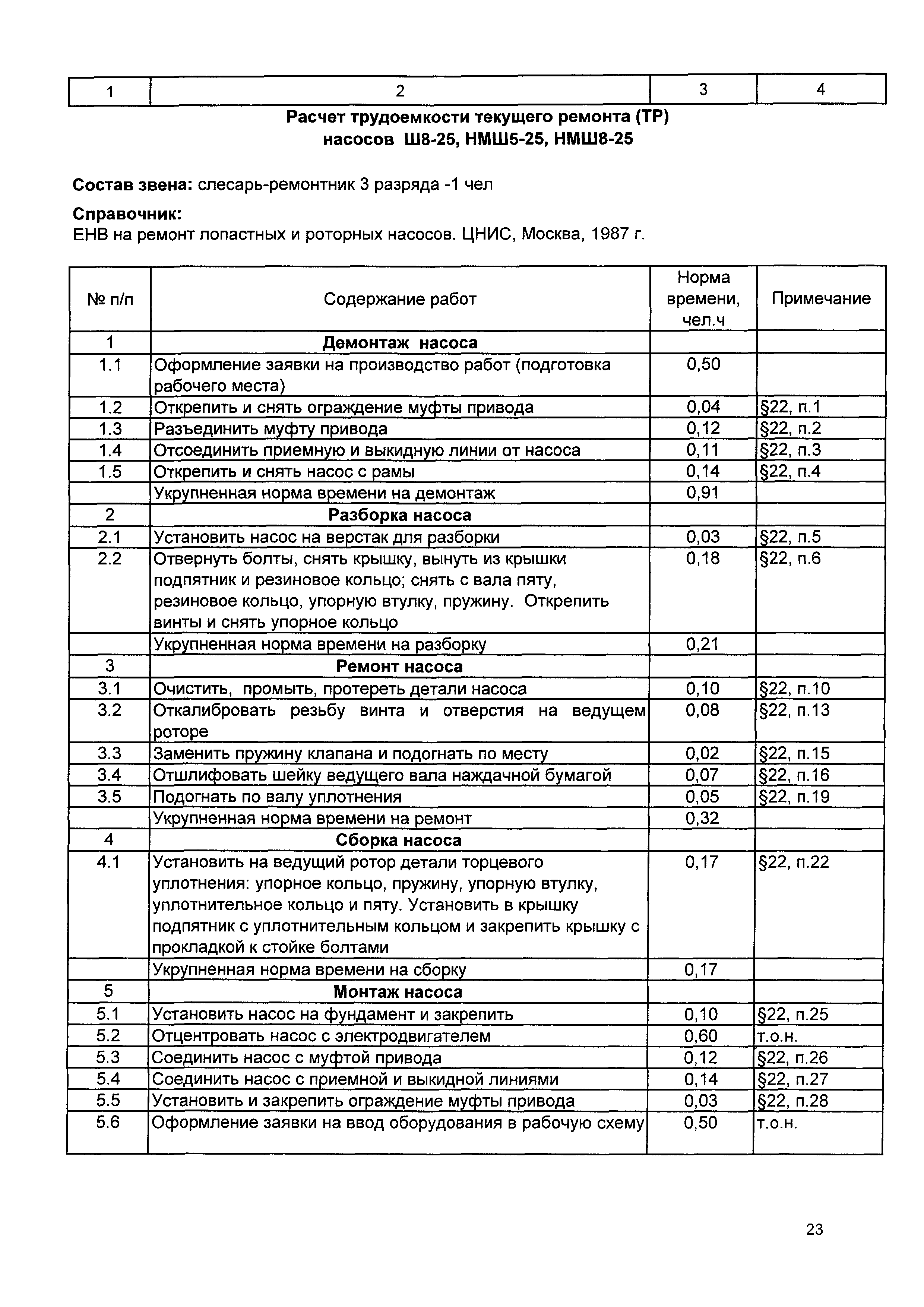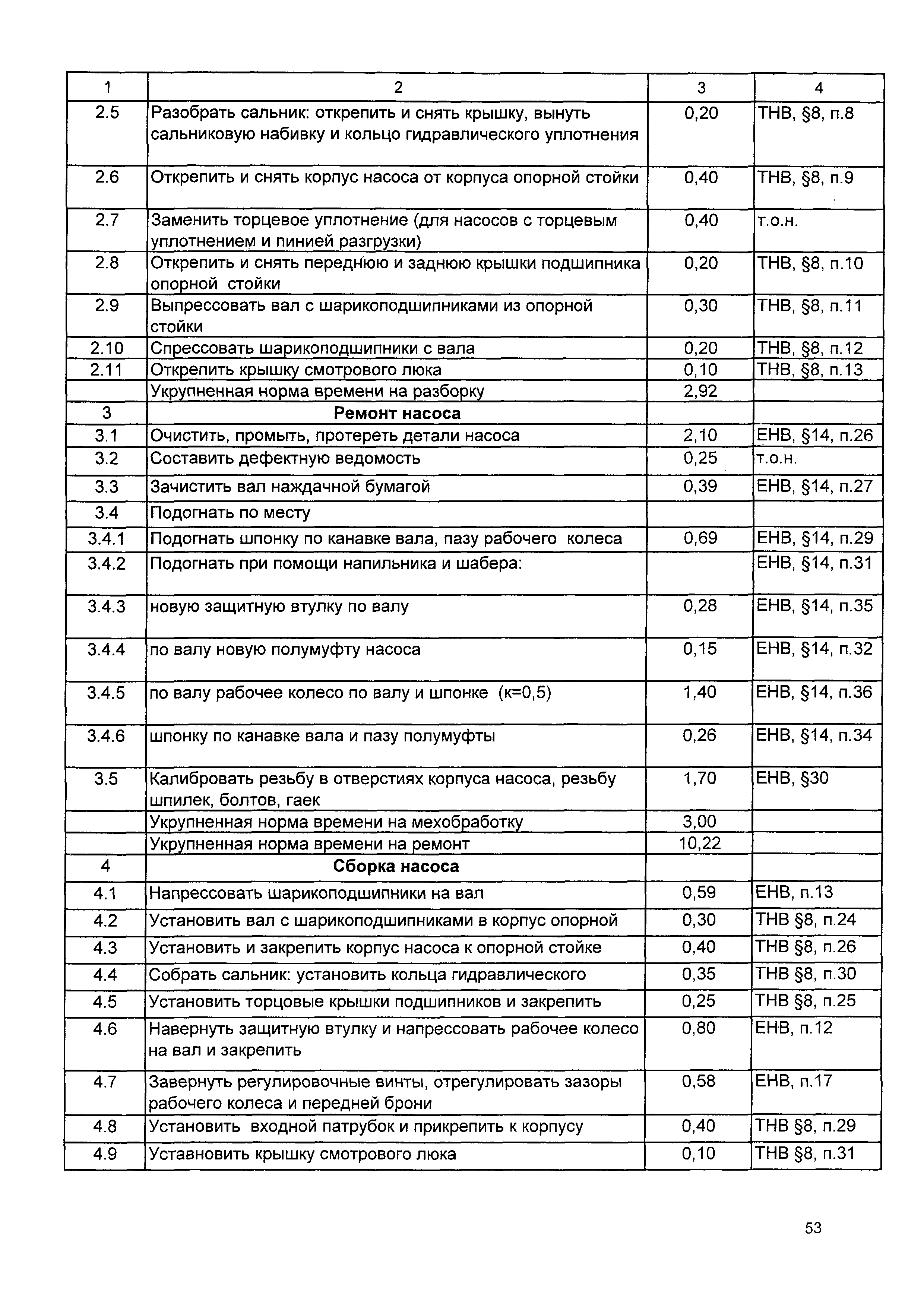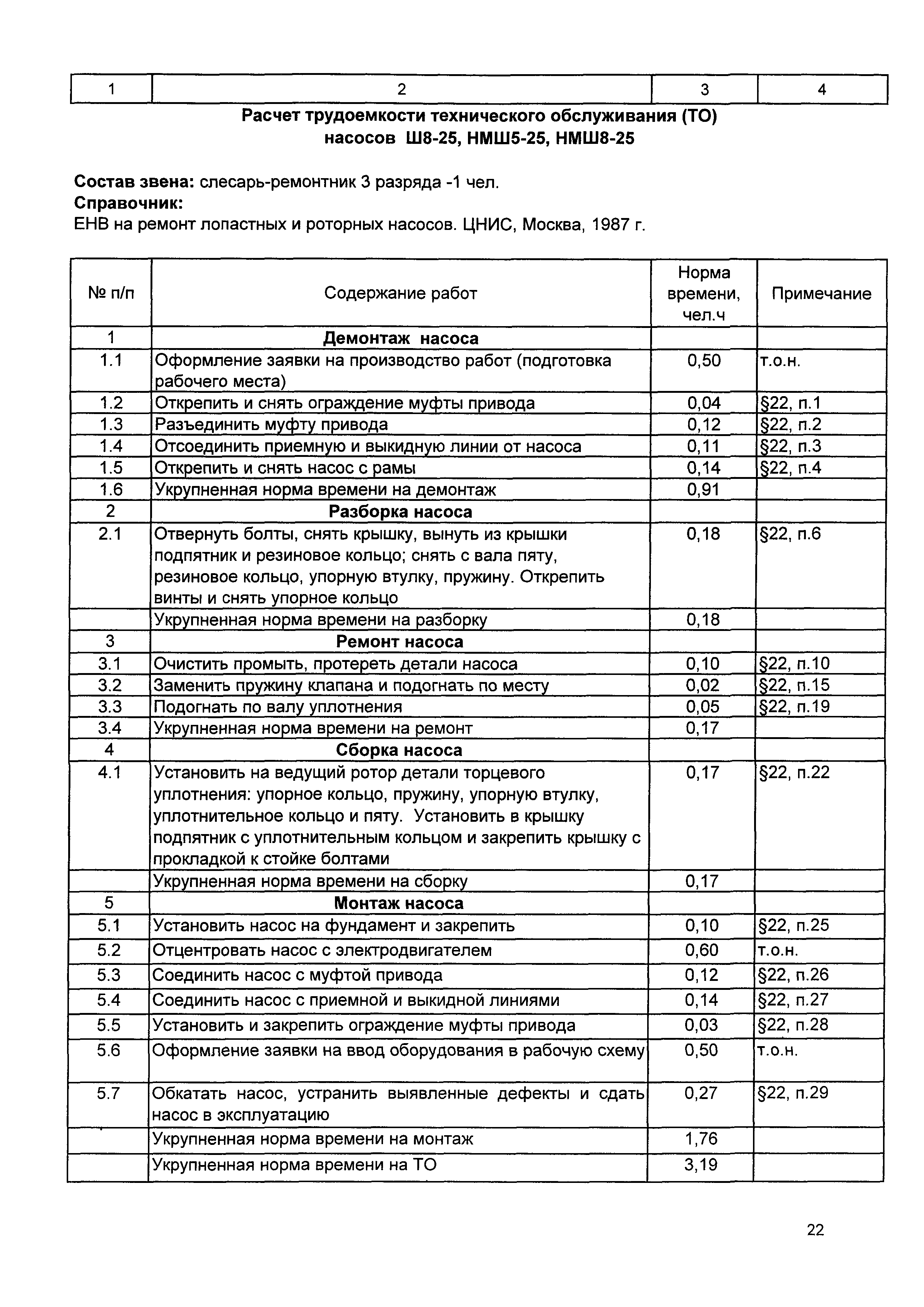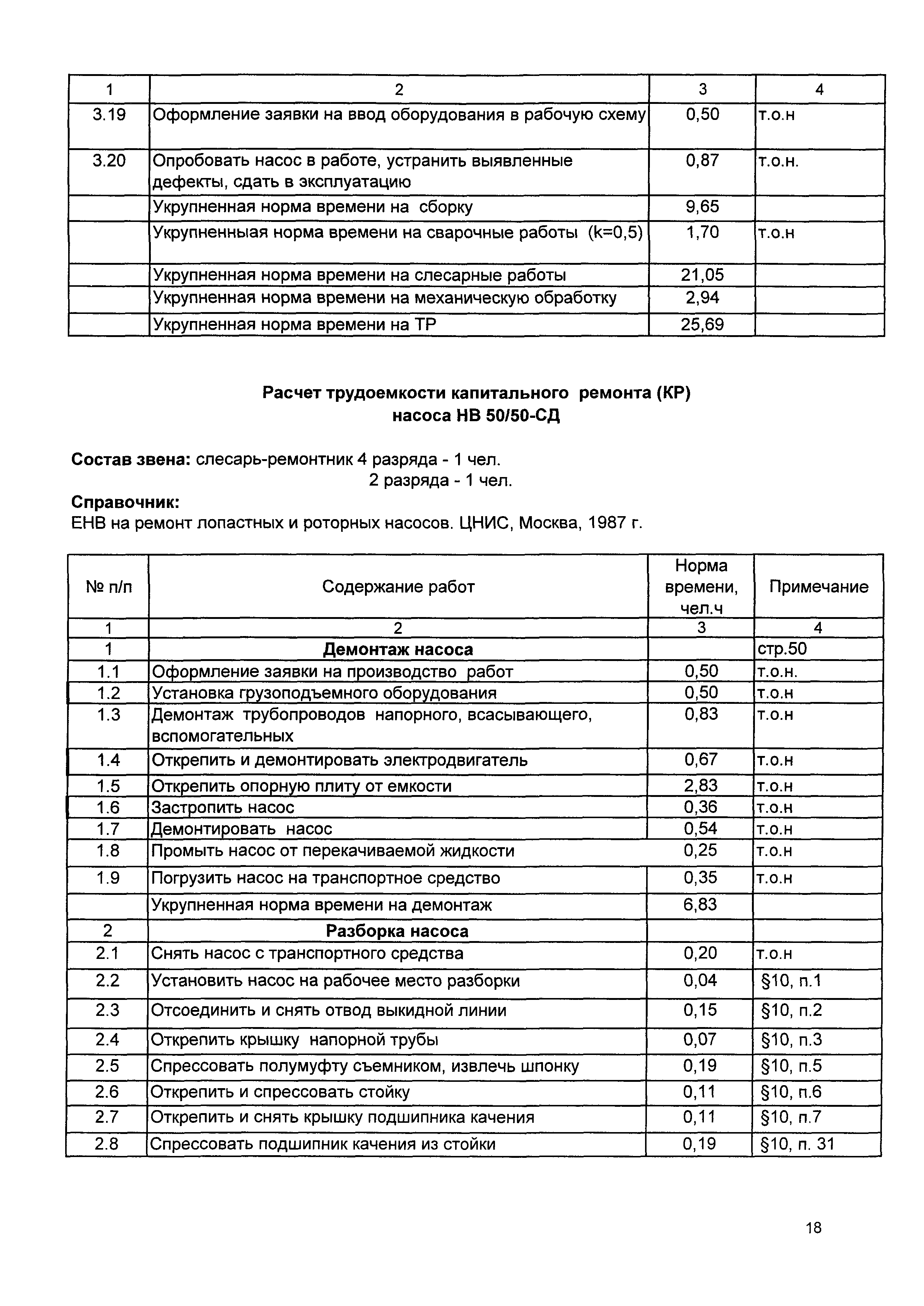 Нормы времени разработаны с учетом ранее действующих единых норм времени (ЕНВ), единого тарифно-квалификационного справочника по нефтяной промышленности и разработанных технологических карт технического обслуживания и ремонтов НПО. | | Оглавление: | Общие положения Насосы К8/18, К50/30 Насосы 1Д315-71, 1Д630-90…125, 1Д250-90…125 Насос НВ 50/50-СД Насосы Н8-25, НМШ5-25, НМШ8-25 Насос НС 160-45 Насос НПВ 1250/60 Насос ЦНС 240-1900 ЗТМ Насосы К80-50-200. К65-50-60, К100-65-200, К100-80-160-С-УХЛ Насос ЦНС 850 Насосы КМН 100-80-160, КМН 80-65-175 Насосы Х80-65-175, АХ65-45-200 Насос НК 210/200 Станки-качалки UP-9T, UP-12T ("VULCAN"), "LEGRAN", C-320 ("LUFKIN") | | Разработан: | ООО СПКТБ НЕФТЕГАЗМАШ