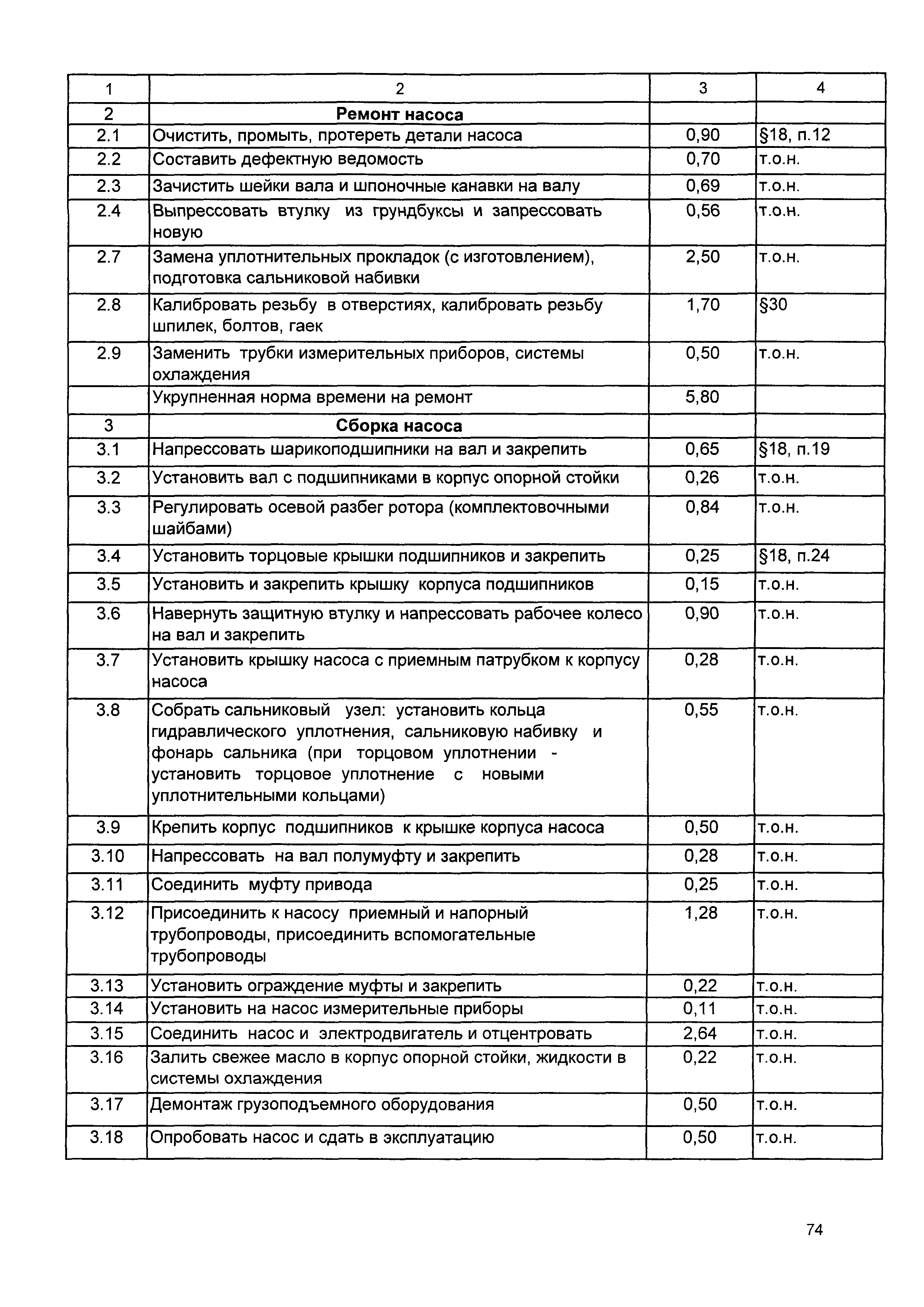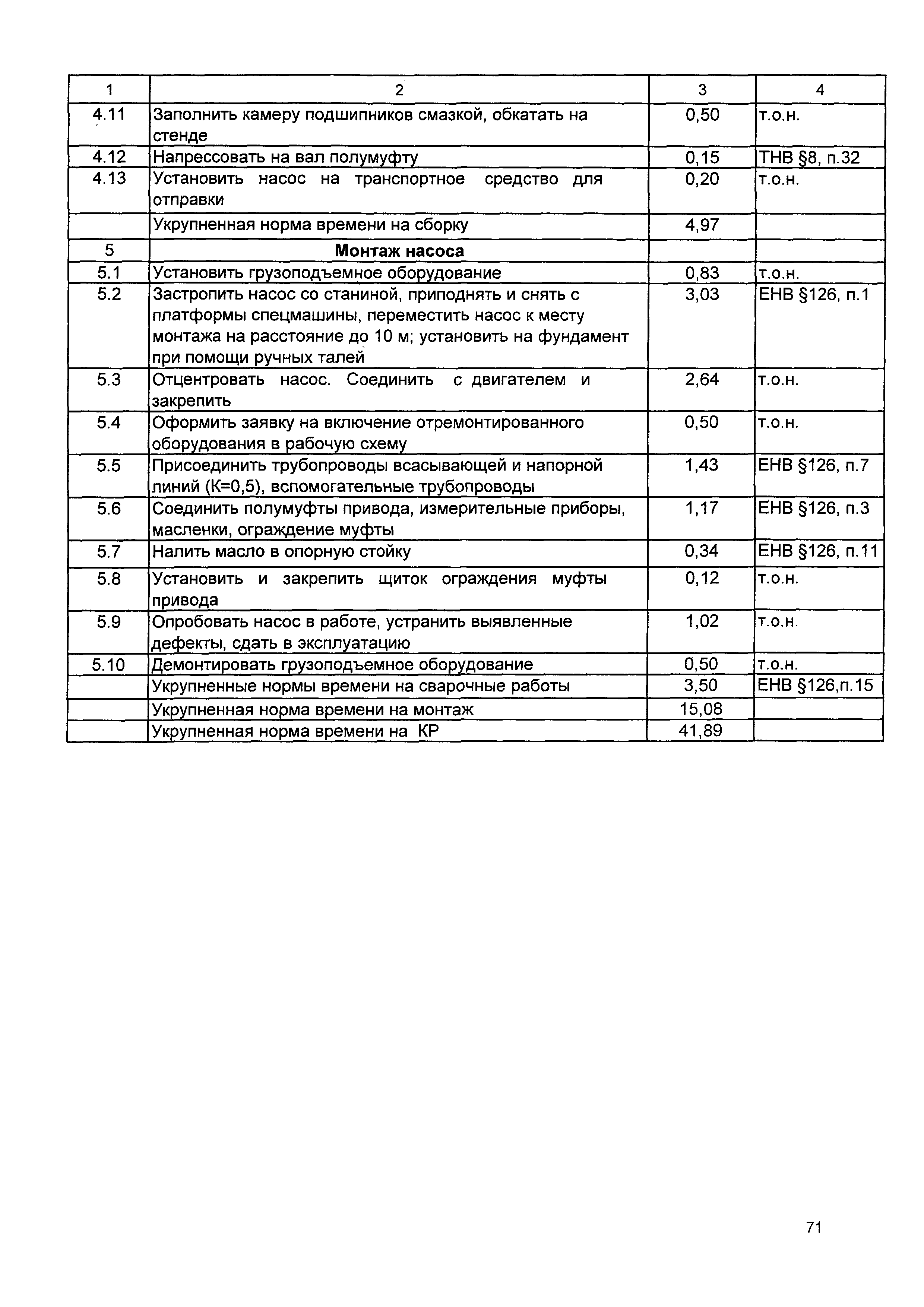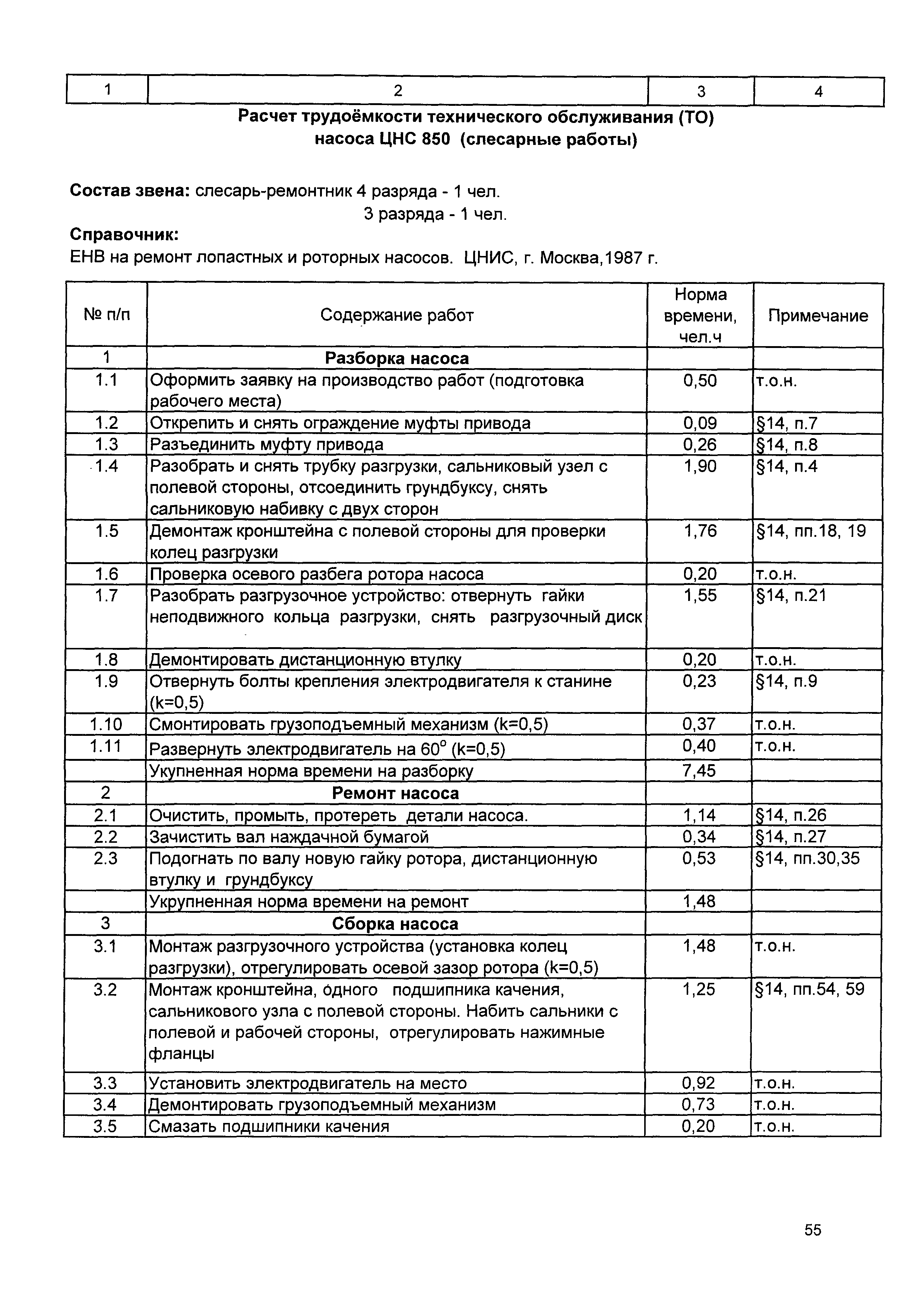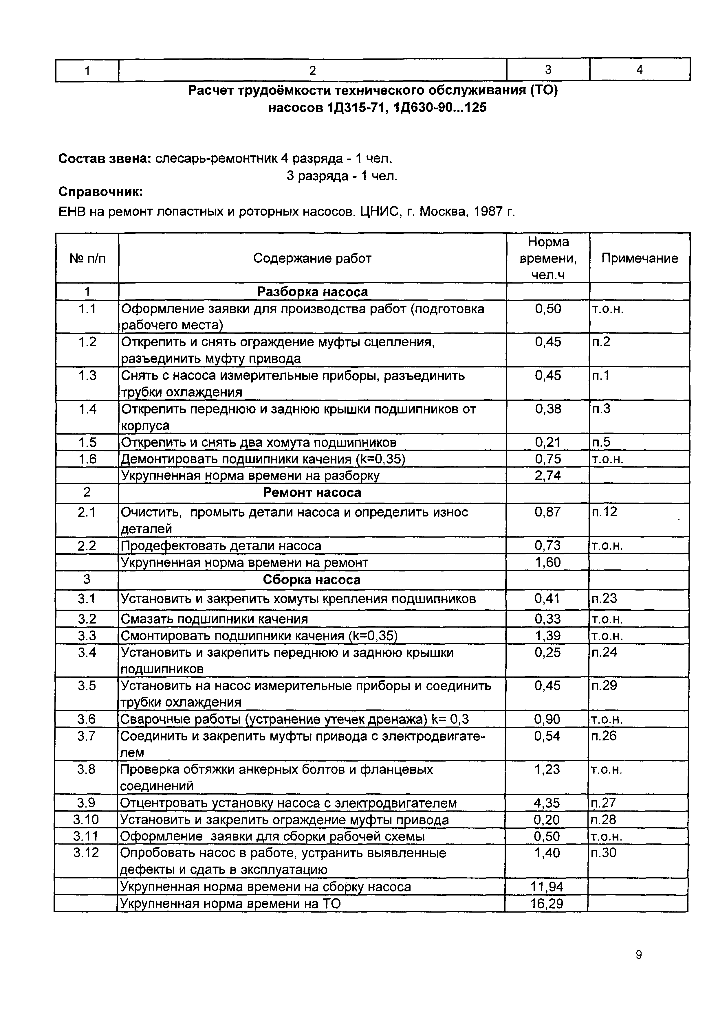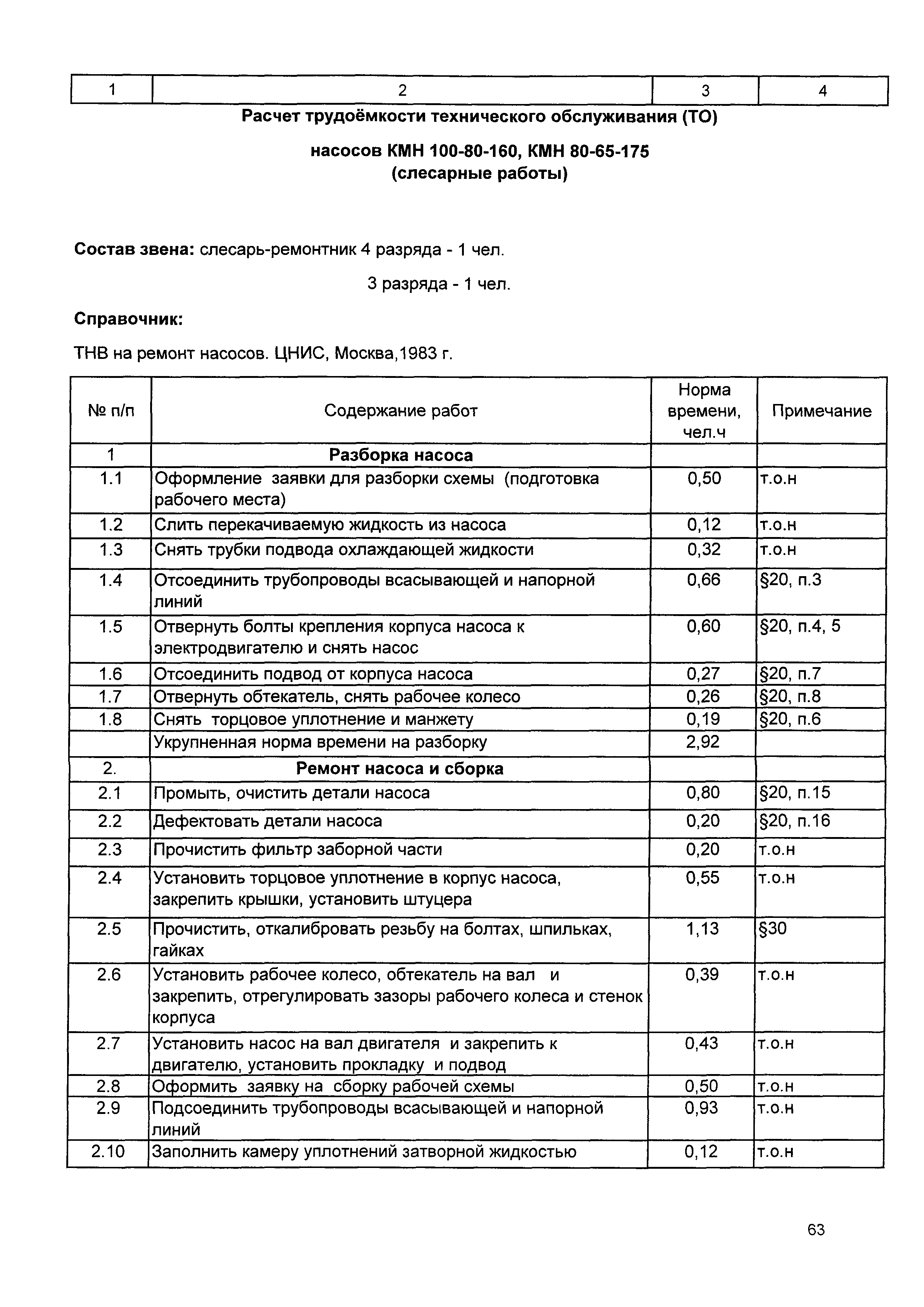 Нормы времени разработаны с учетом ранее действующих единых норм времени (ЕНВ), единого тарифно-квалификационного справочника по нефтяной промышленности и разработанных технологических карт технического обслуживания и ремонтов НПО. | | Оглавление: | Общие положения Насосы К8/18, К50/30 Насосы 1Д315-71, 1Д630-90…125, 1Д250-90…125 Насос НВ 50/50-СД Насосы Н8-25, НМШ5-25, НМШ8-25 Насос НС 160-45 Насос НПВ 1250/60 Насос ЦНС 240-1900 ЗТМ Насосы К80-50-200. К65-50-60, К100-65-200, К100-80-160-С-УХЛ Насос ЦНС 850 Насосы КМН 100-80-160, КМН 80-65-175 Насосы Х80-65-175, АХ65-45-200 Насос НК 210/200 Станки-качалки UP-9T, UP-12T ("VULCAN"), "LEGRAN", C-320 ("LUFKIN") | | Разработан: | ООО СПКТБ НЕФТЕГАЗМАШ