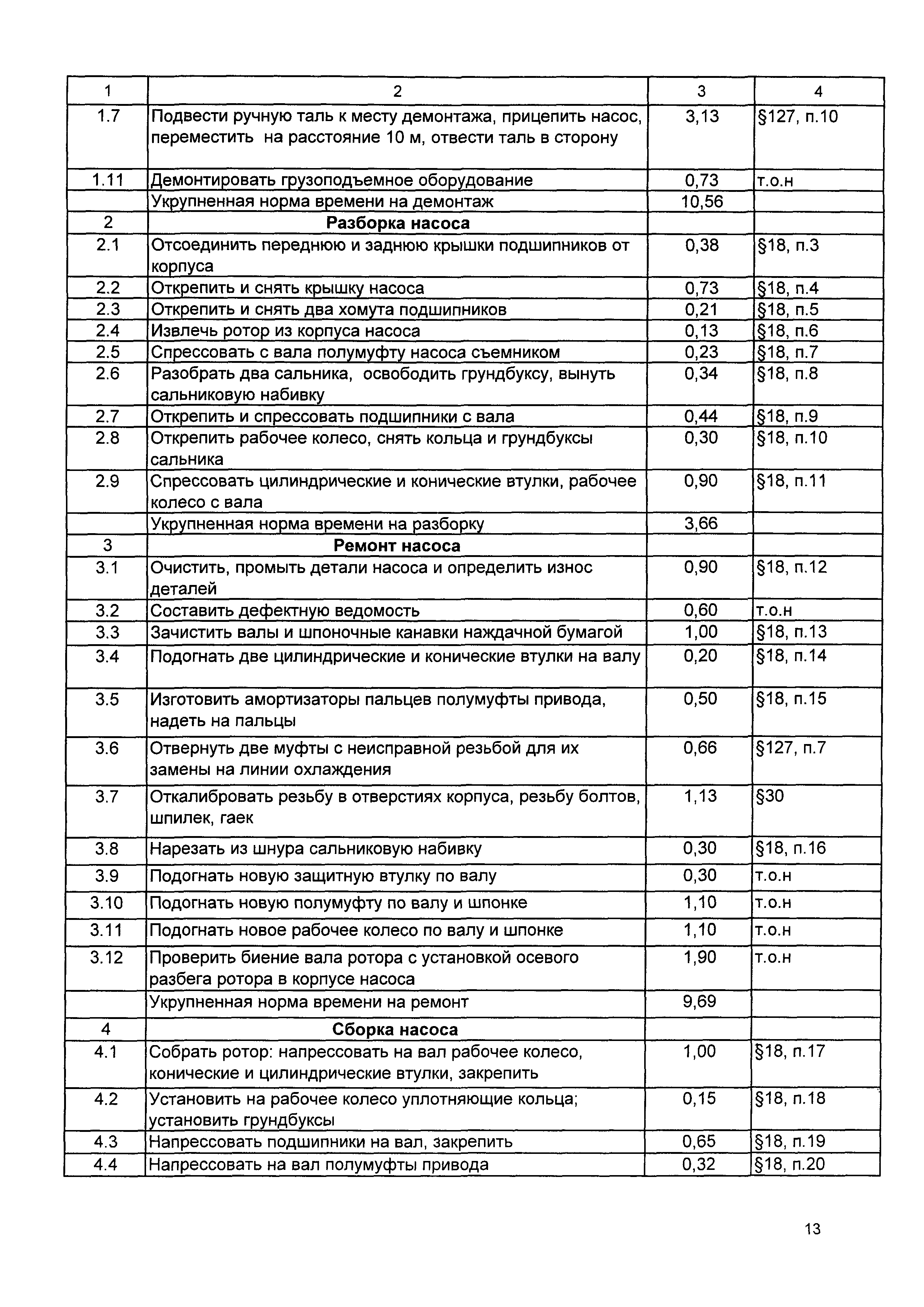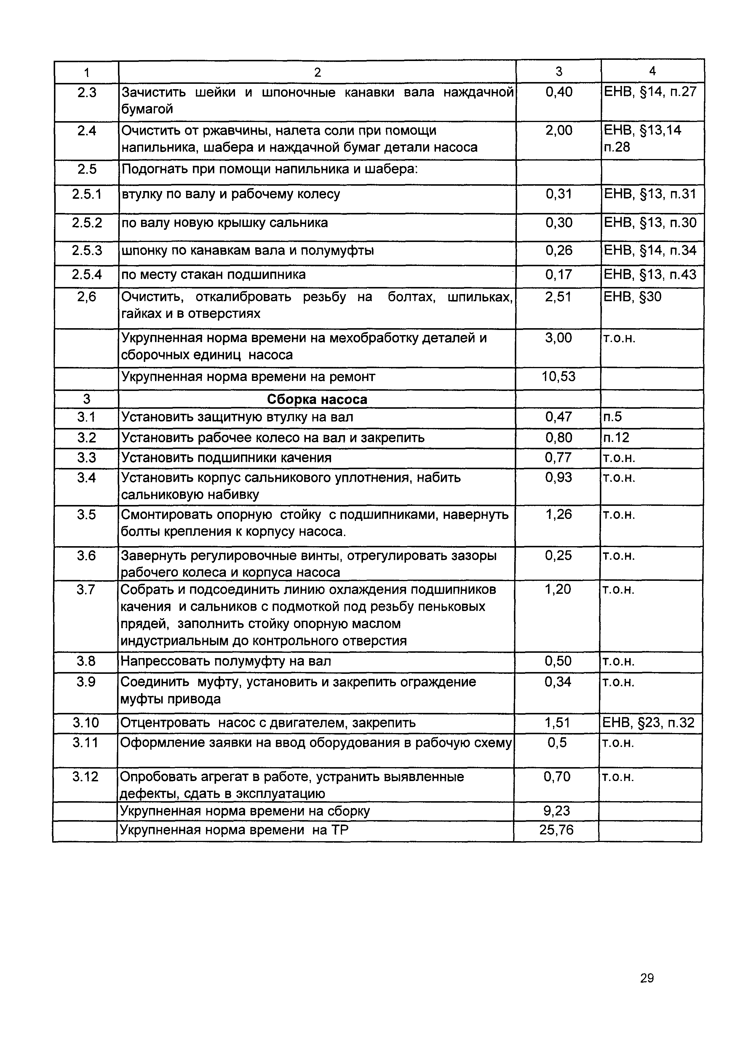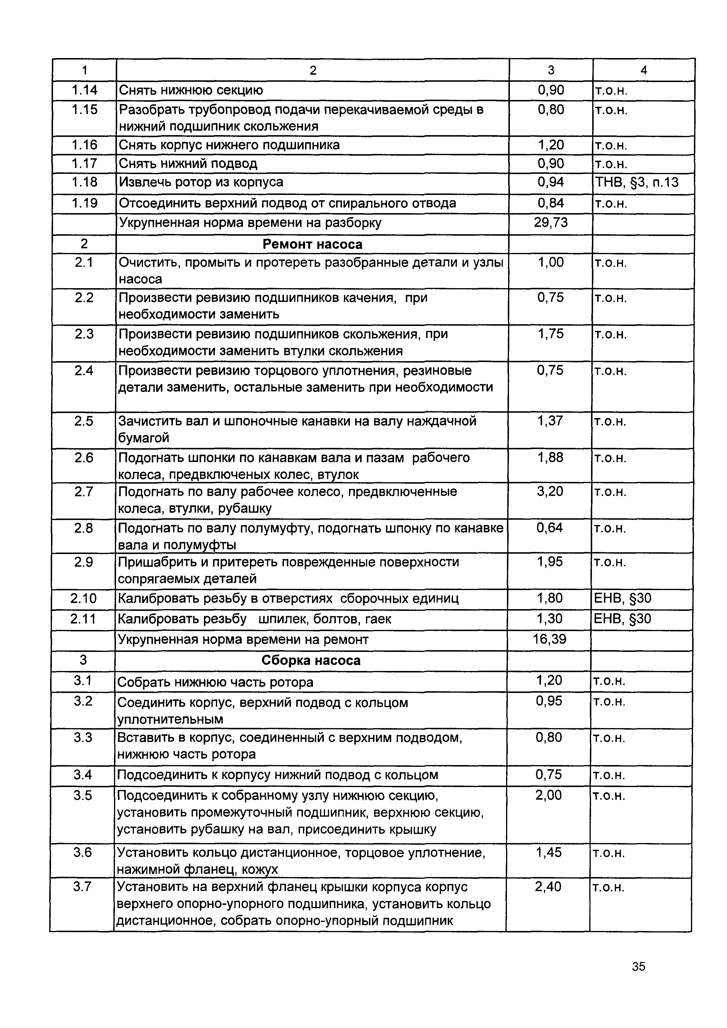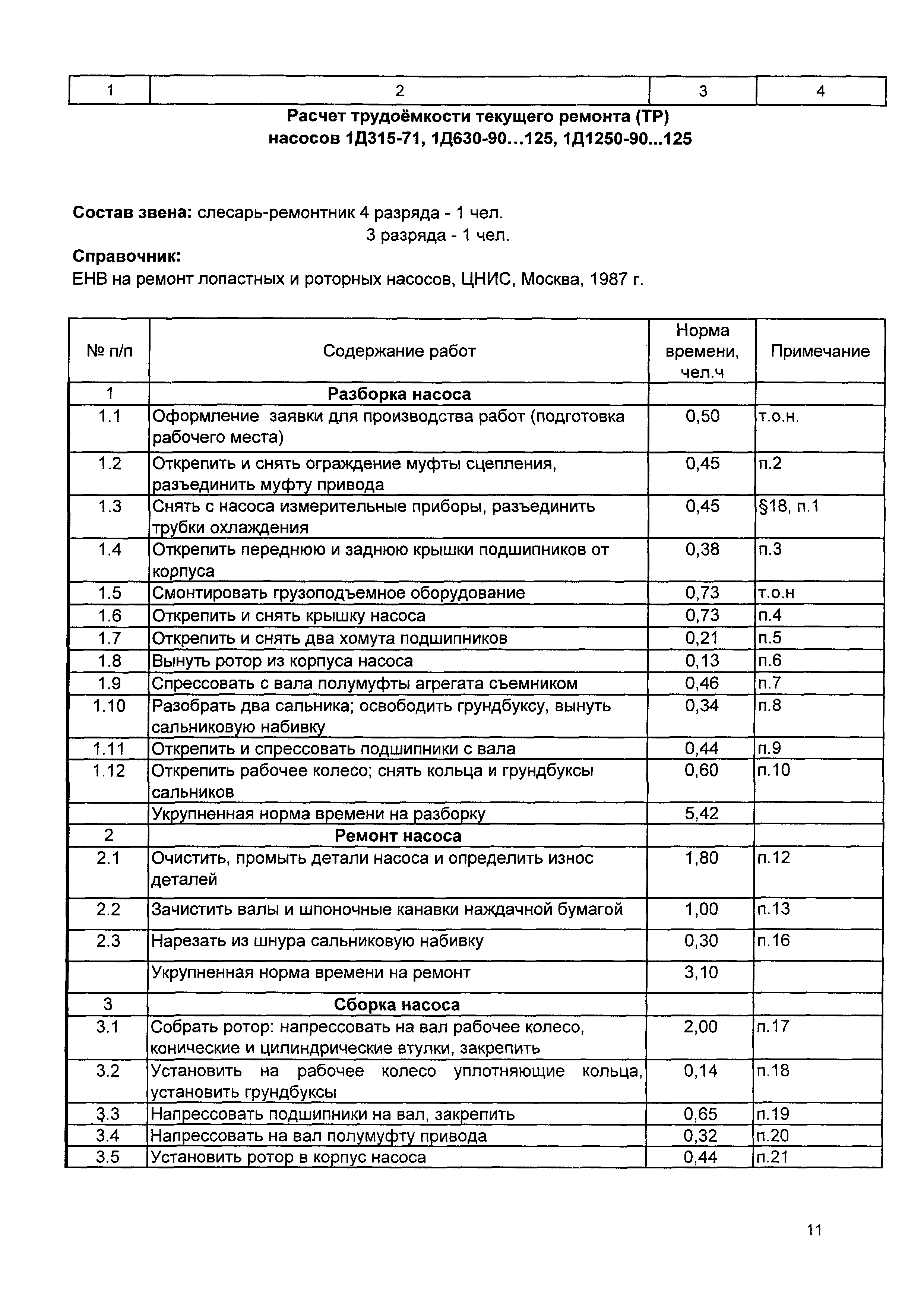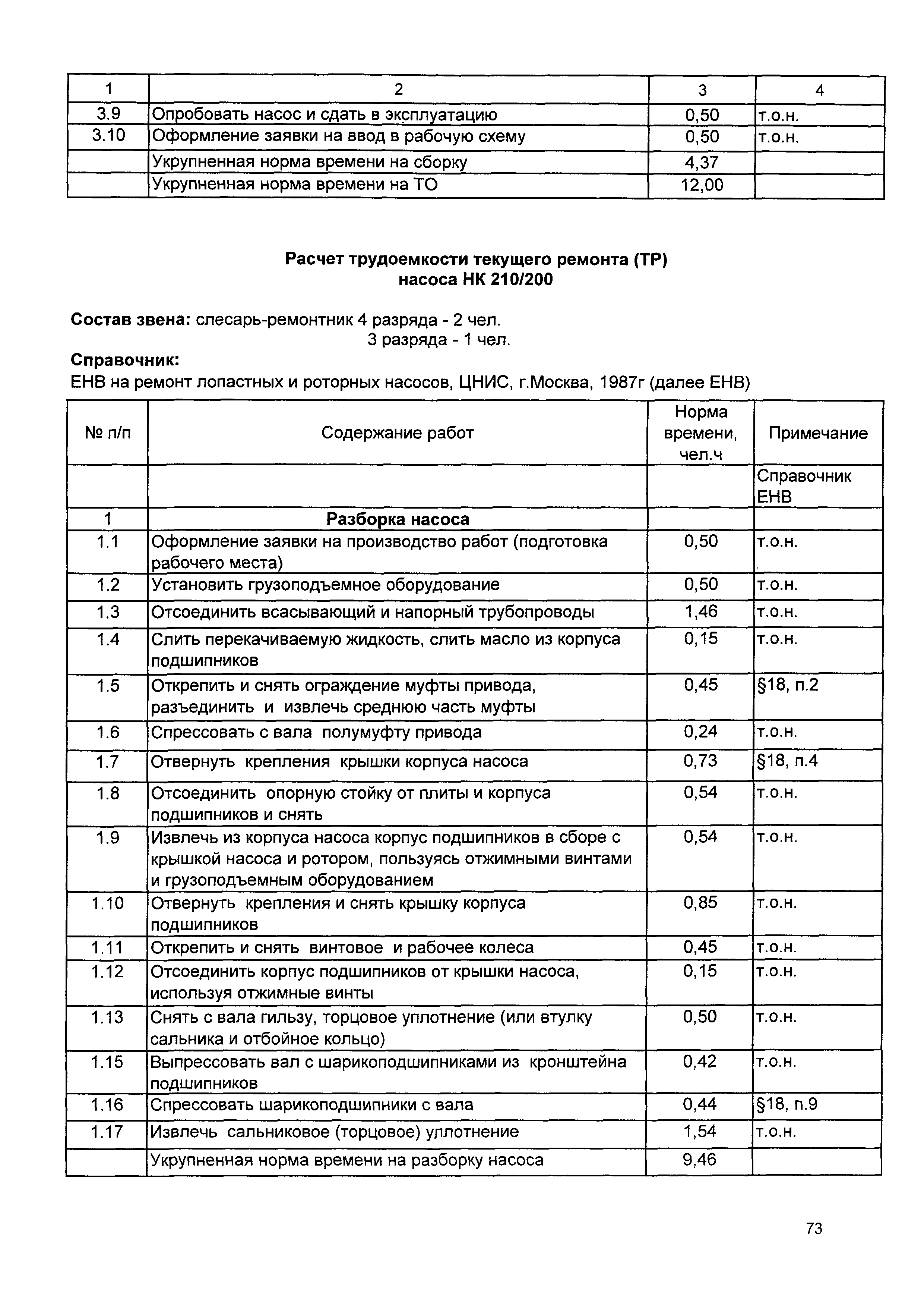 Нормы времени разработаны с учетом ранее действующих единых норм времени (ЕНВ), единого тарифно-квалификационного справочника по нефтяной промышленности и разработанных технологических карт технического обслуживания и ремонтов НПО. | | Оглавление: | Общие положения Насосы К8/18, К50/30 Насосы 1Д315-71, 1Д630-90…125, 1Д250-90…125 Насос НВ 50/50-СД Насосы Н8-25, НМШ5-25, НМШ8-25 Насос НС 160-45 Насос НПВ 1250/60 Насос ЦНС 240-1900 ЗТМ Насосы К80-50-200. К65-50-60, К100-65-200, К100-80-160-С-УХЛ Насос ЦНС 850 Насосы КМН 100-80-160, КМН 80-65-175 Насосы Х80-65-175, АХ65-45-200 Насос НК 210/200 Станки-качалки UP-9T, UP-12T ("VULCAN"), "LEGRAN", C-320 ("LUFKIN") | | Разработан: | ООО СПКТБ НЕФТЕГАЗМАШ