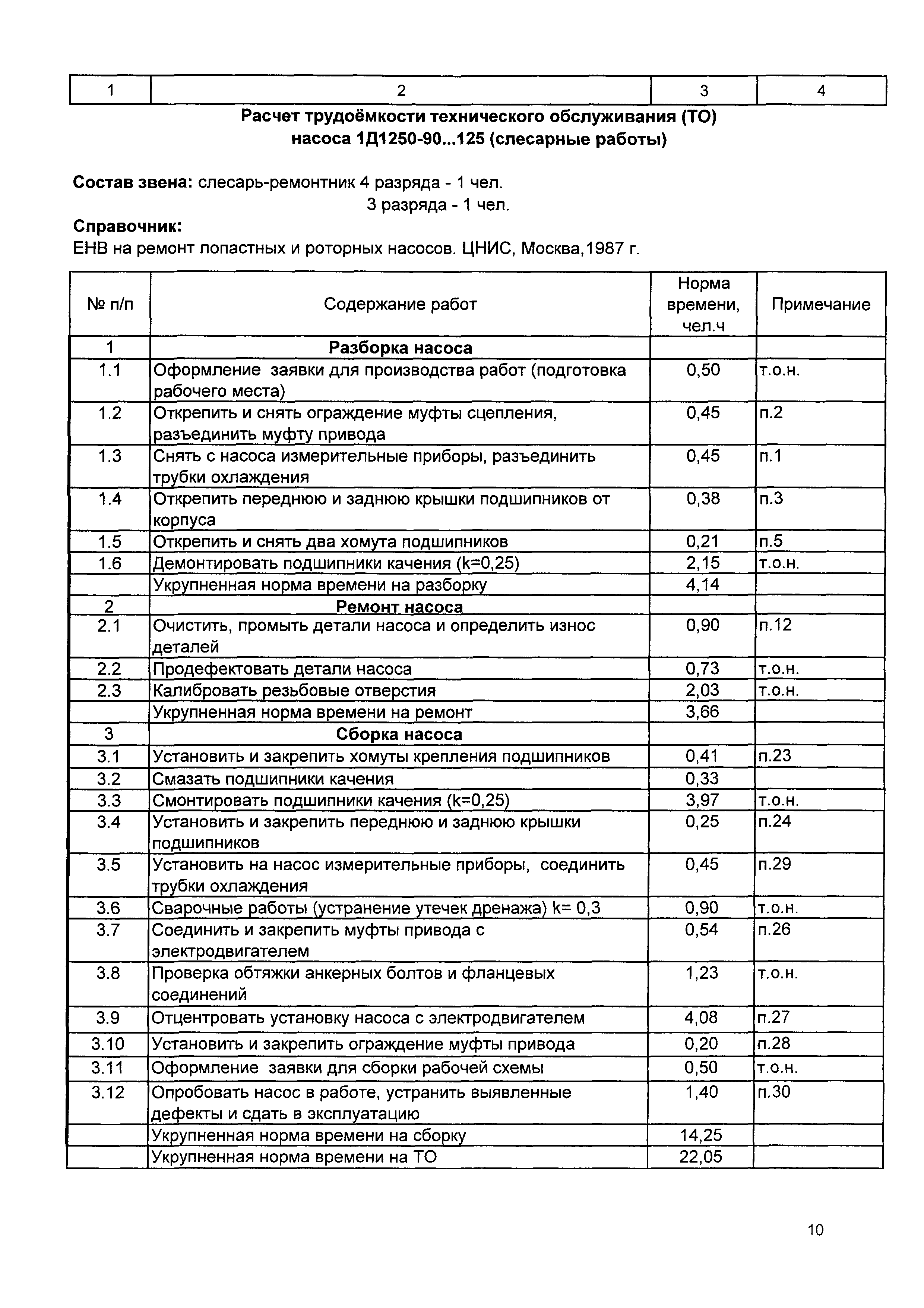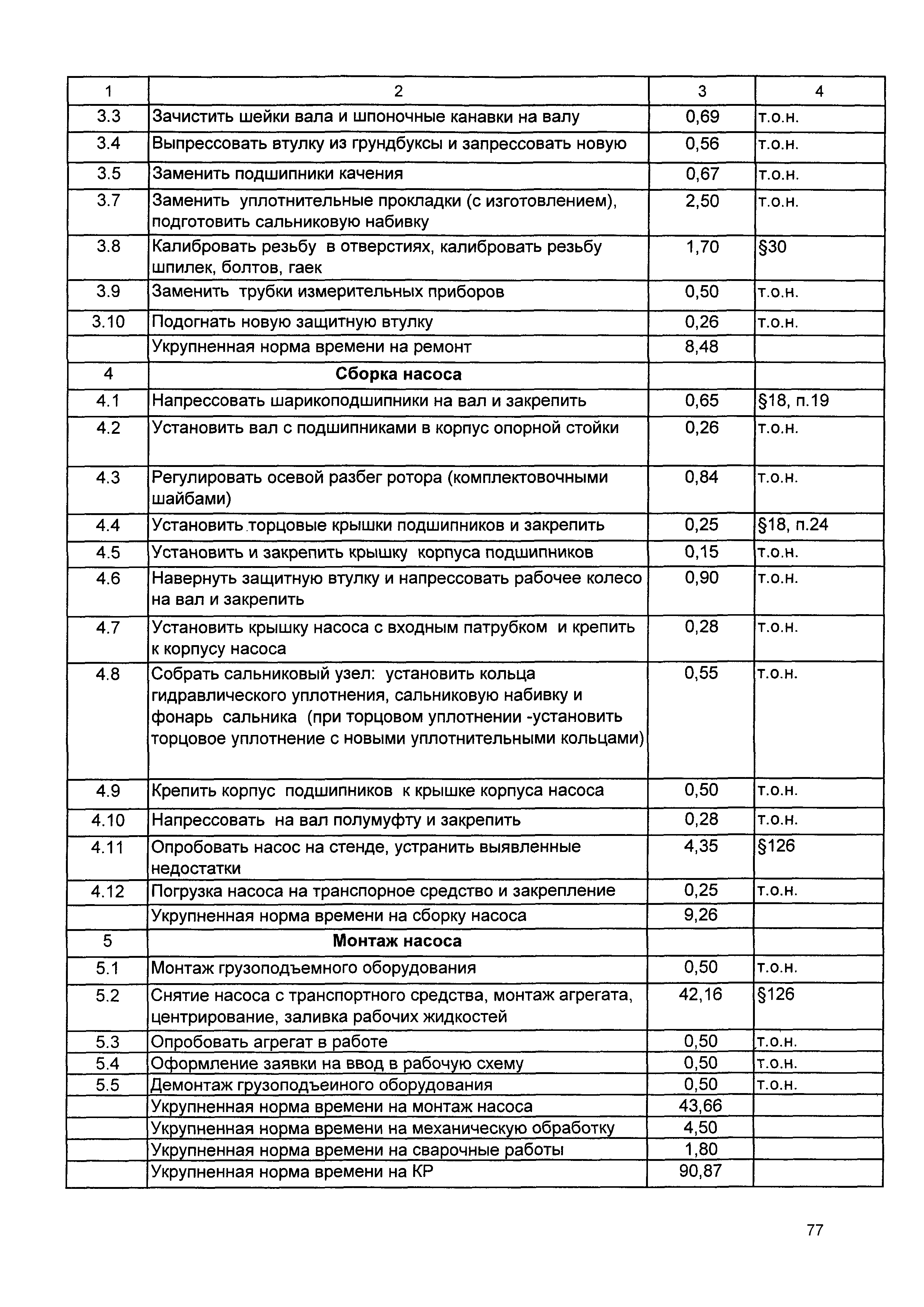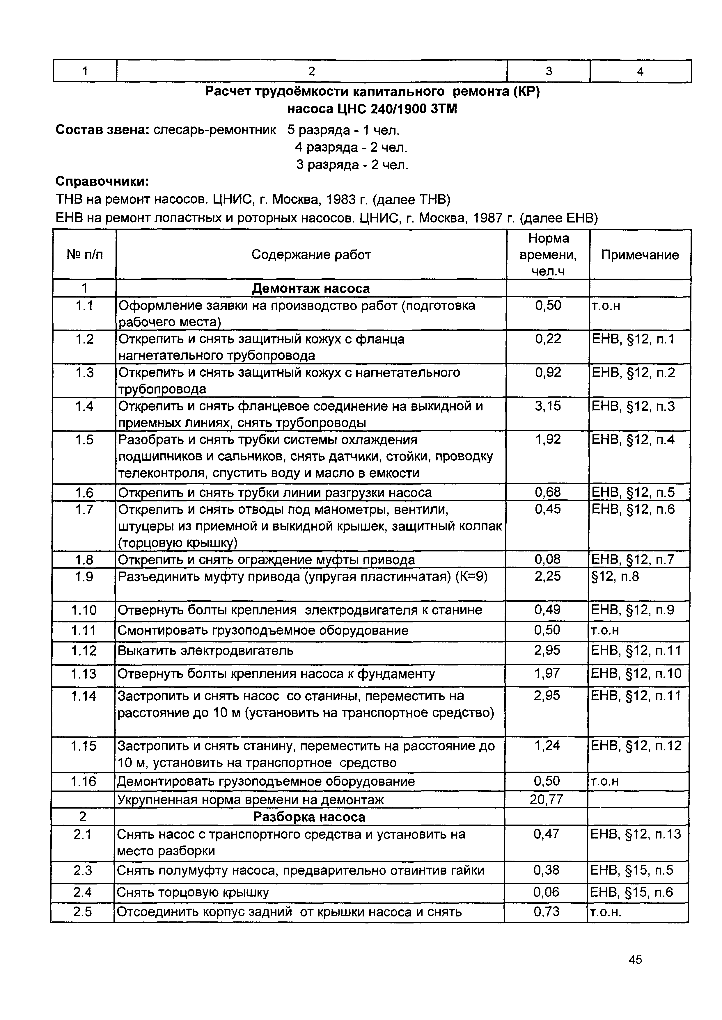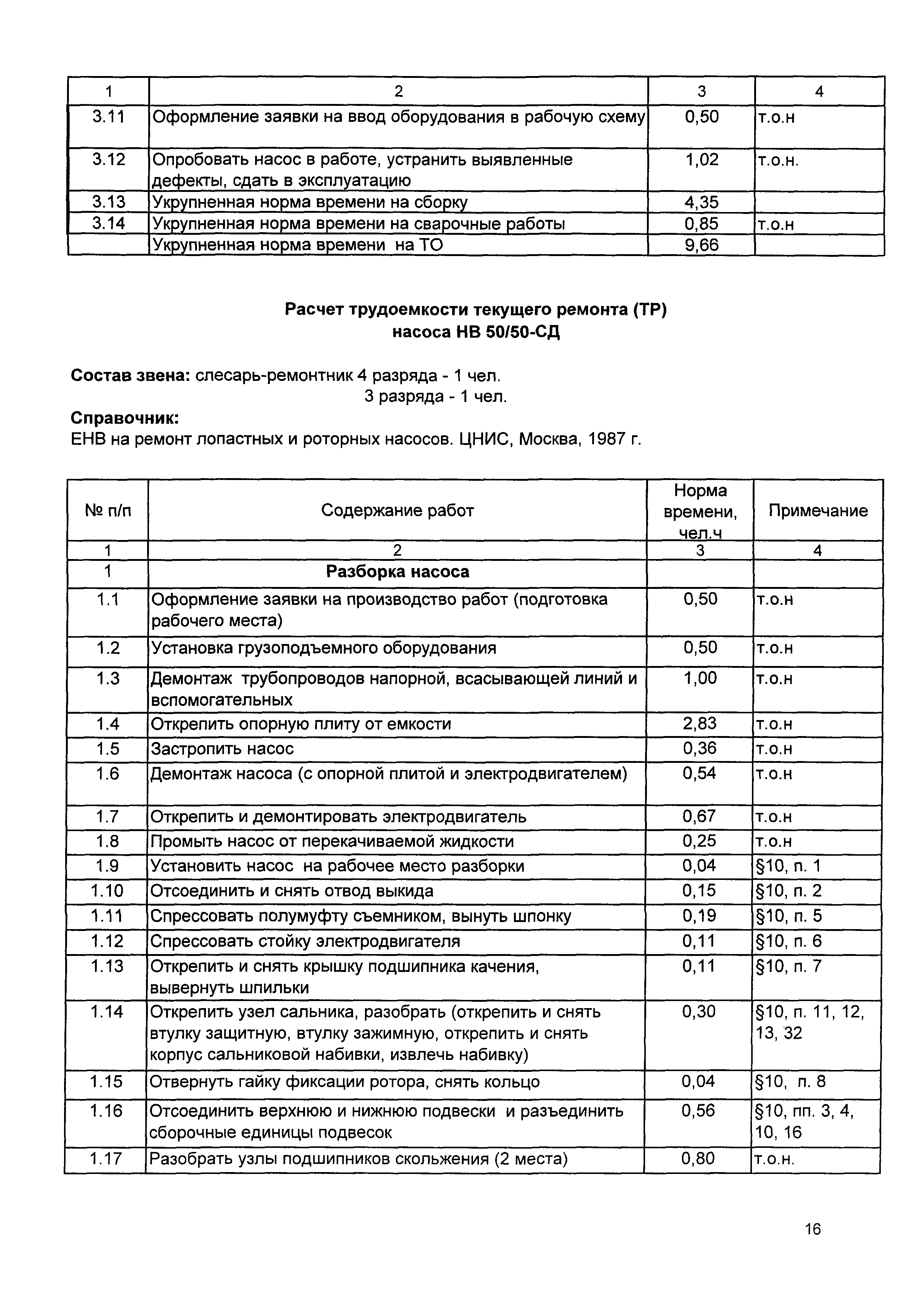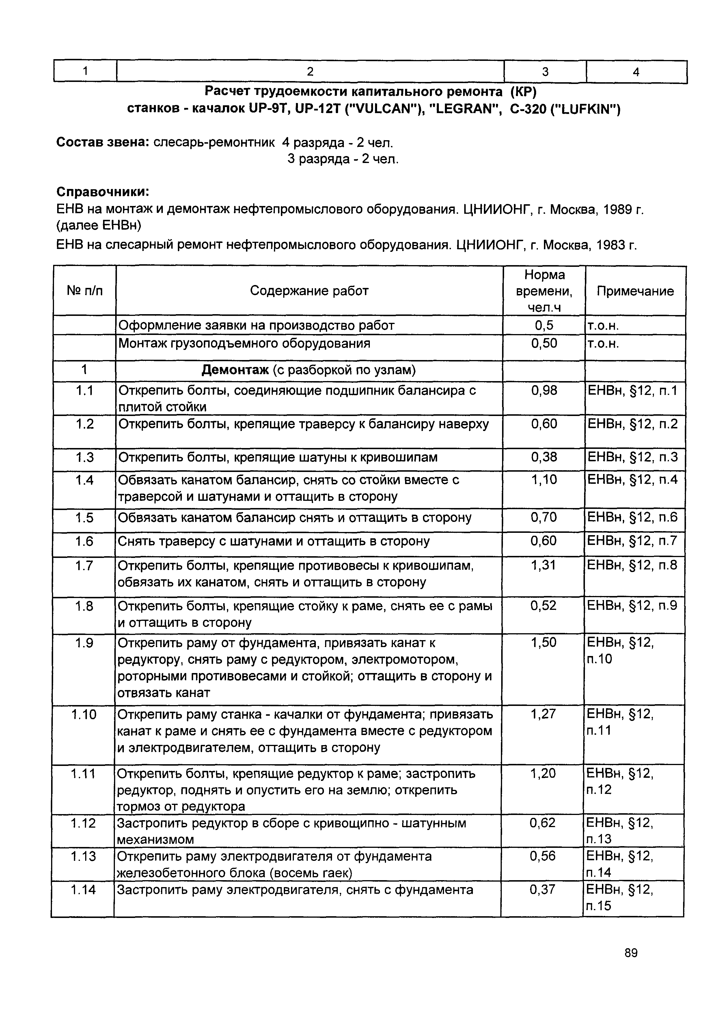 Нормы времени разработаны с учетом ранее действующих единых норм времени (ЕНВ), единого тарифно-квалификационного справочника по нефтяной промышленности и разработанных технологических карт технического обслуживания и ремонтов НПО. | | Оглавление: | Общие положения Насосы К8/18, К50/30 Насосы 1Д315-71, 1Д630-90…125, 1Д250-90…125 Насос НВ 50/50-СД Насосы Н8-25, НМШ5-25, НМШ8-25 Насос НС 160-45 Насос НПВ 1250/60 Насос ЦНС 240-1900 ЗТМ Насосы К80-50-200. К65-50-60, К100-65-200, К100-80-160-С-УХЛ Насос ЦНС 850 Насосы КМН 100-80-160, КМН 80-65-175 Насосы Х80-65-175, АХ65-45-200 Насос НК 210/200 Станки-качалки UP-9T, UP-12T ("VULCAN"), "LEGRAN", C-320 ("LUFKIN") | | Разработан: | ООО СПКТБ НЕФТЕГАЗМАШ