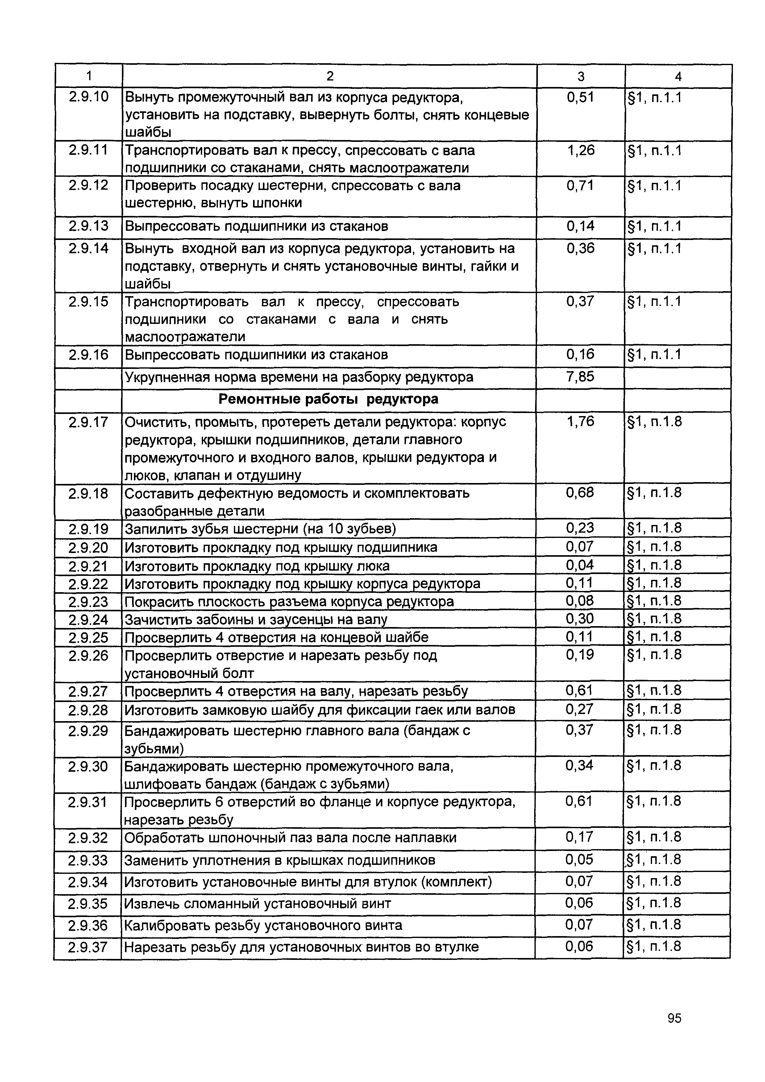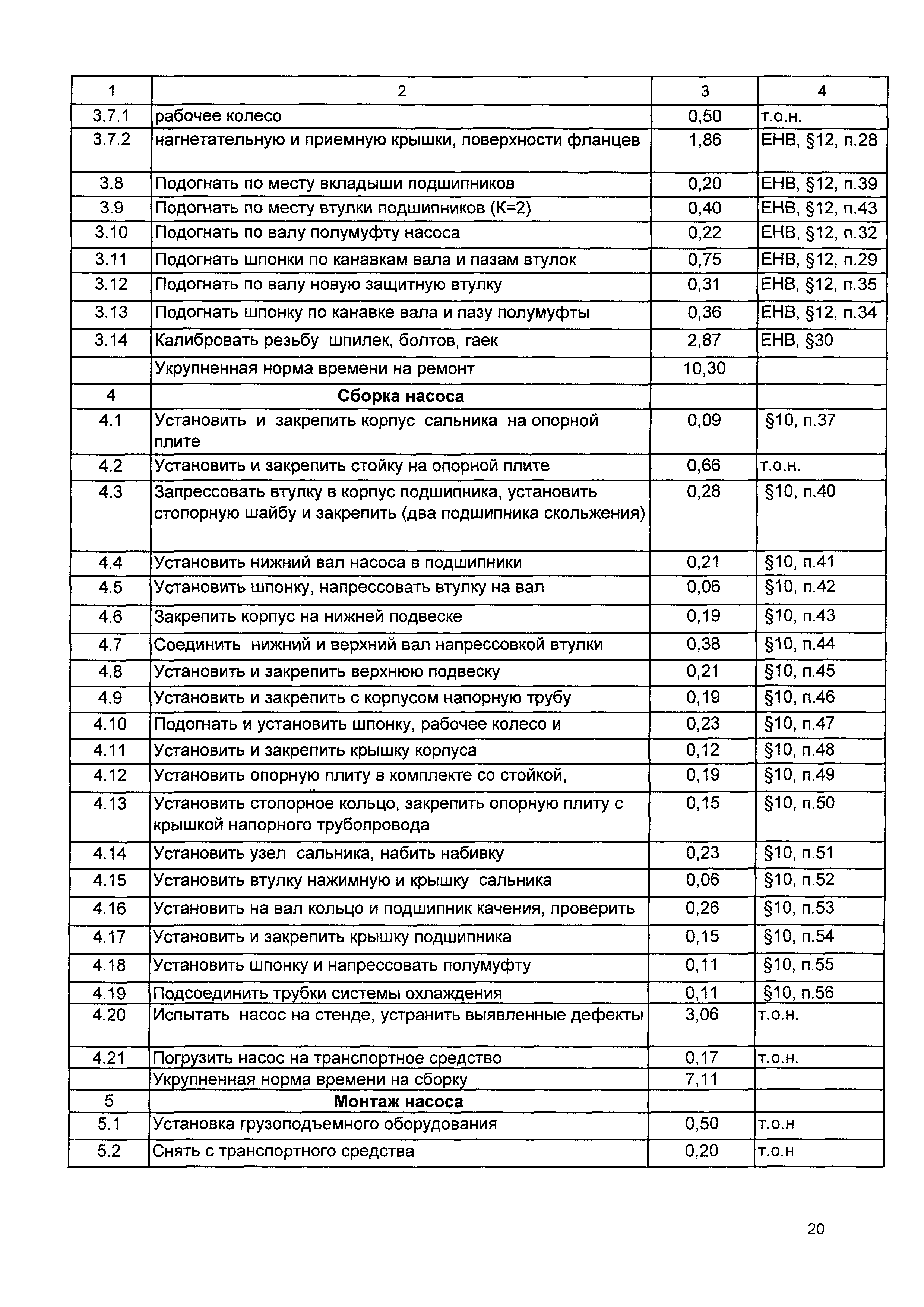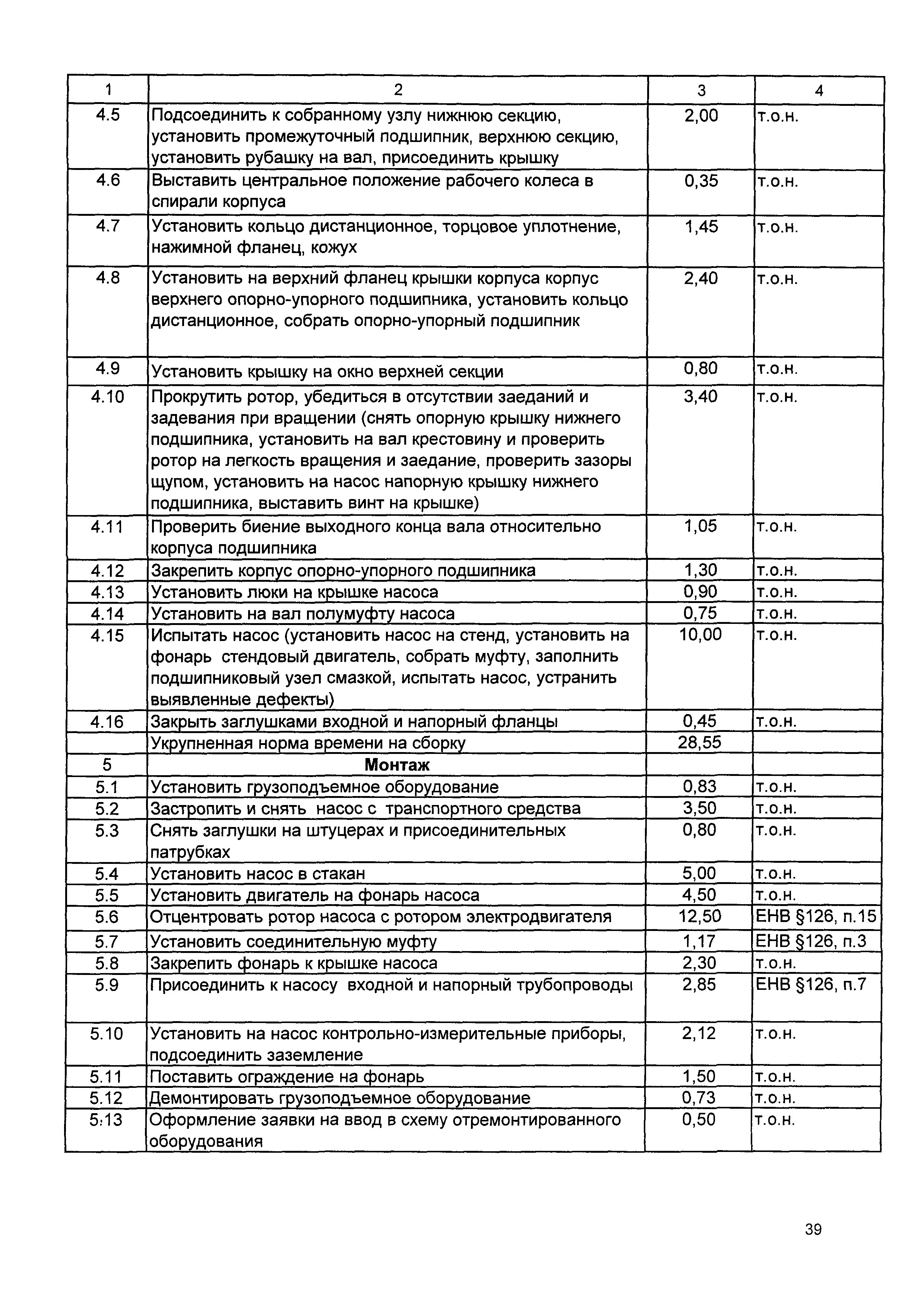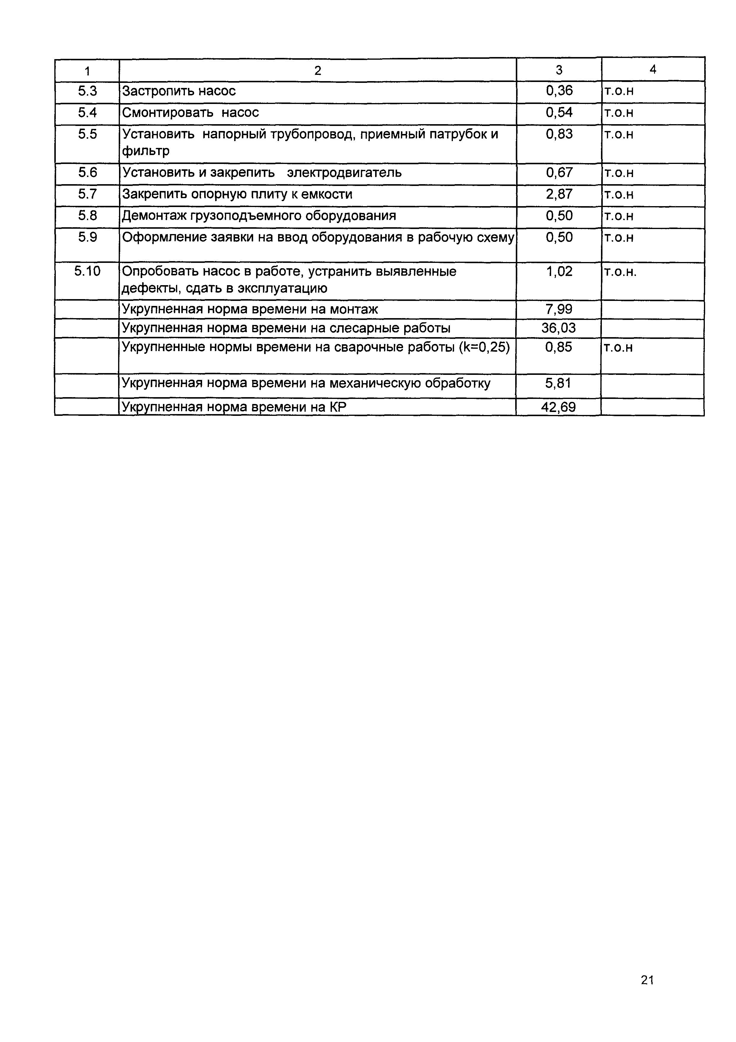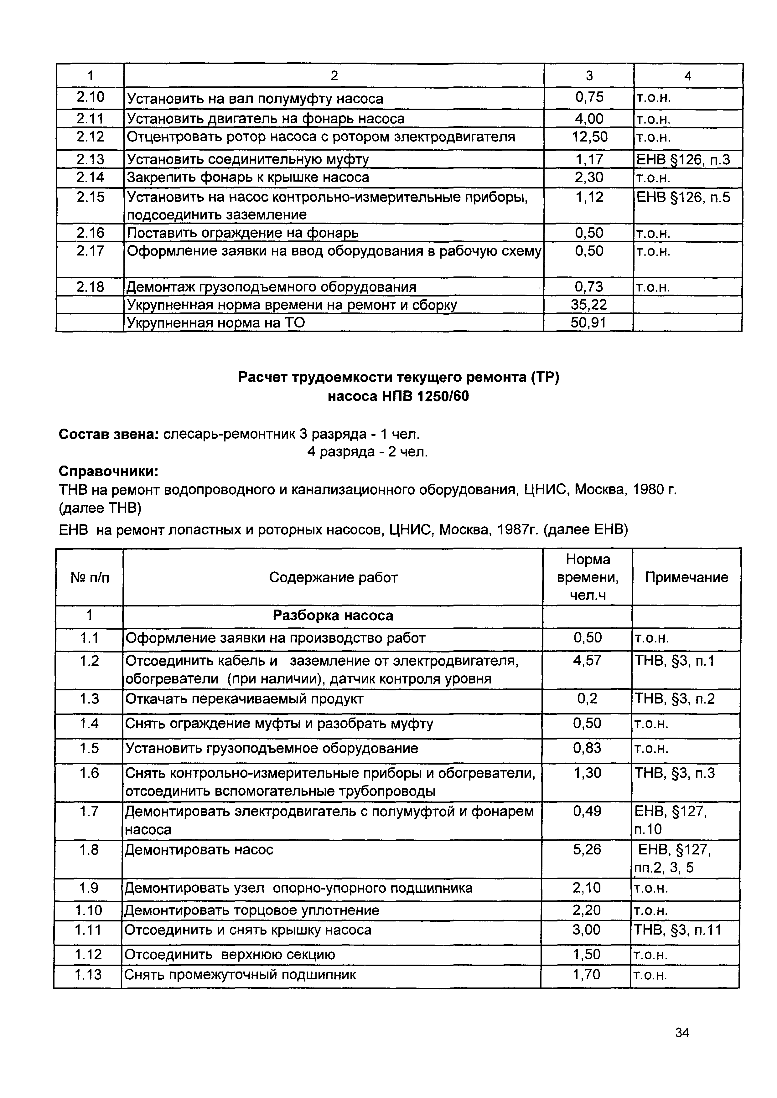 Нормы времени разработаны с учетом ранее действующих единых норм времени (ЕНВ), единого тарифно-квалификационного справочника по нефтяной промышленности и разработанных технологических карт технического обслуживания и ремонтов НПО. | | Оглавление: | Общие положения Насосы К8/18, К50/30 Насосы 1Д315-71, 1Д630-90…125, 1Д250-90…125 Насос НВ 50/50-СД Насосы Н8-25, НМШ5-25, НМШ8-25 Насос НС 160-45 Насос НПВ 1250/60 Насос ЦНС 240-1900 ЗТМ Насосы К80-50-200. К65-50-60, К100-65-200, К100-80-160-С-УХЛ Насос ЦНС 850 Насосы КМН 100-80-160, КМН 80-65-175 Насосы Х80-65-175, АХ65-45-200 Насос НК 210/200 Станки-качалки UP-9T, UP-12T ("VULCAN"), "LEGRAN", C-320 ("LUFKIN") | | Разработан: | ООО СПКТБ НЕФТЕГАЗМАШ